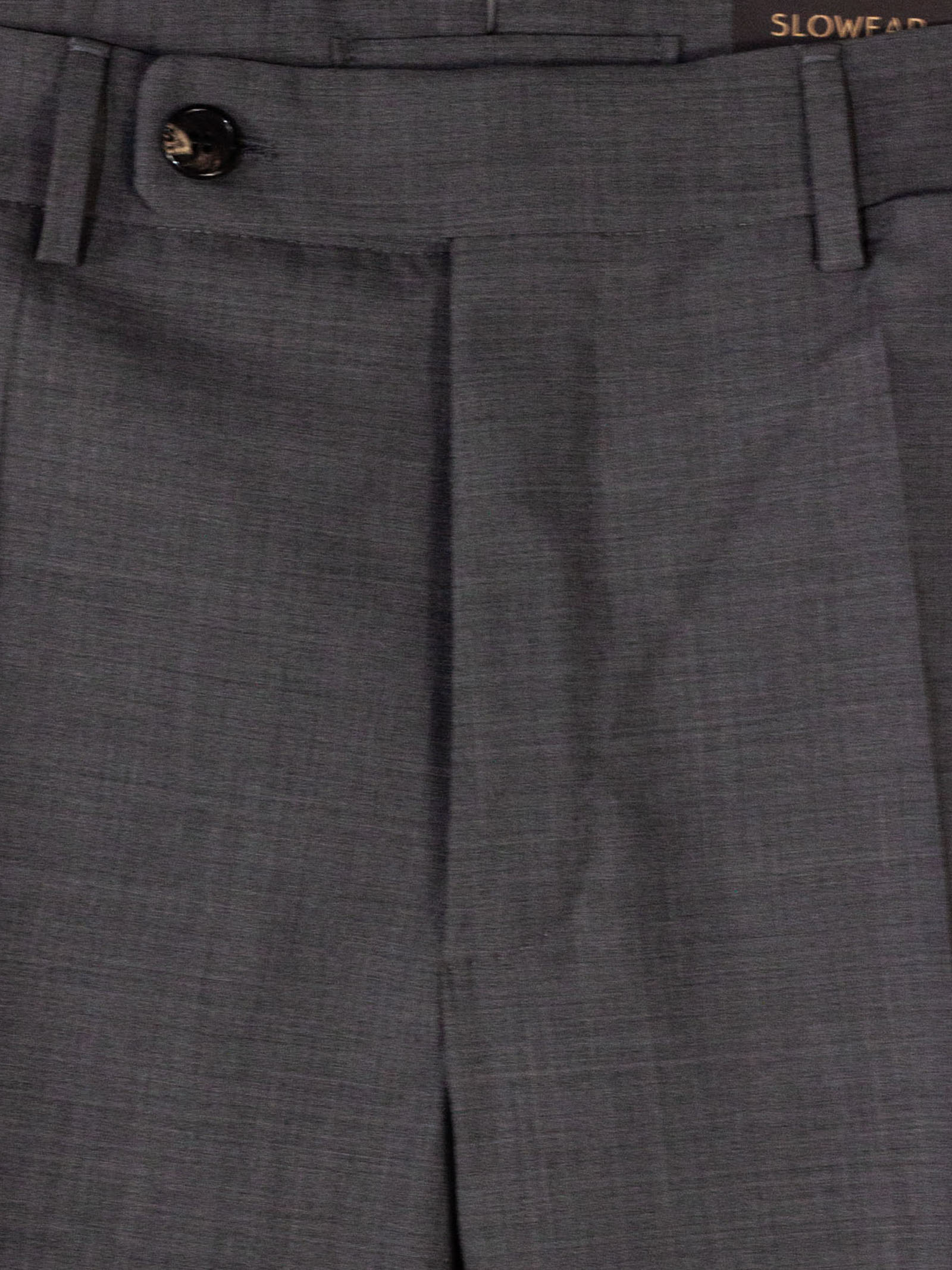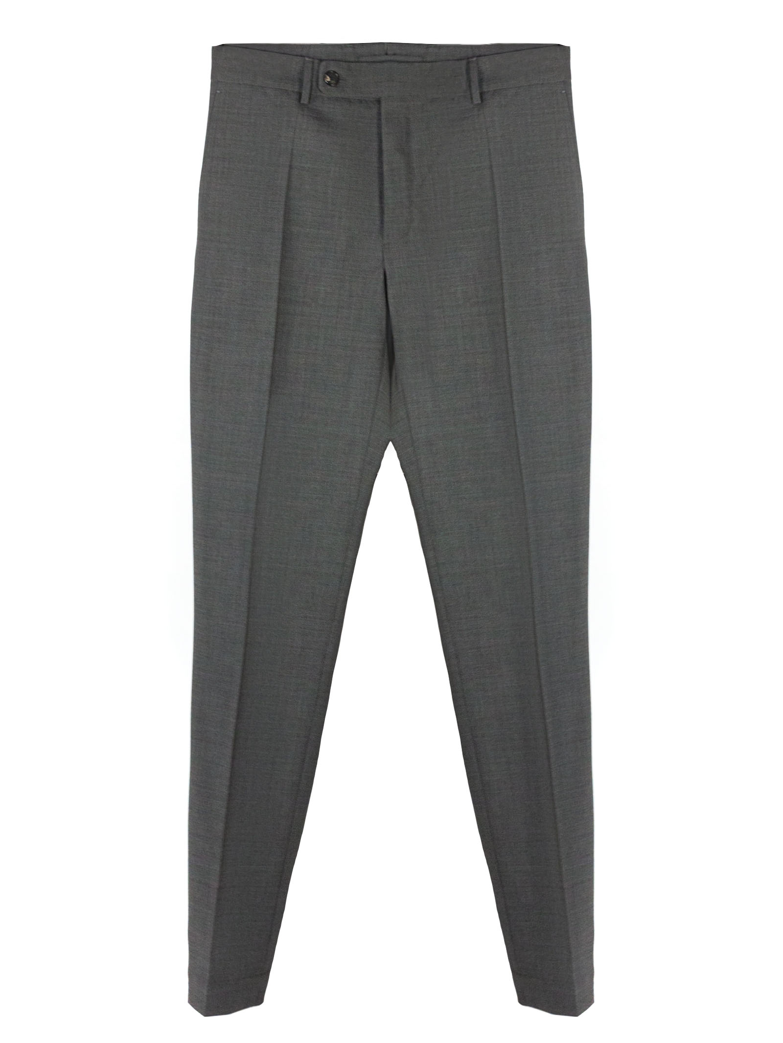 Grey virgin wool blend trousers, tapared fit, front zip and button closure, belt loops, side welt pockets, back pockets with buttons