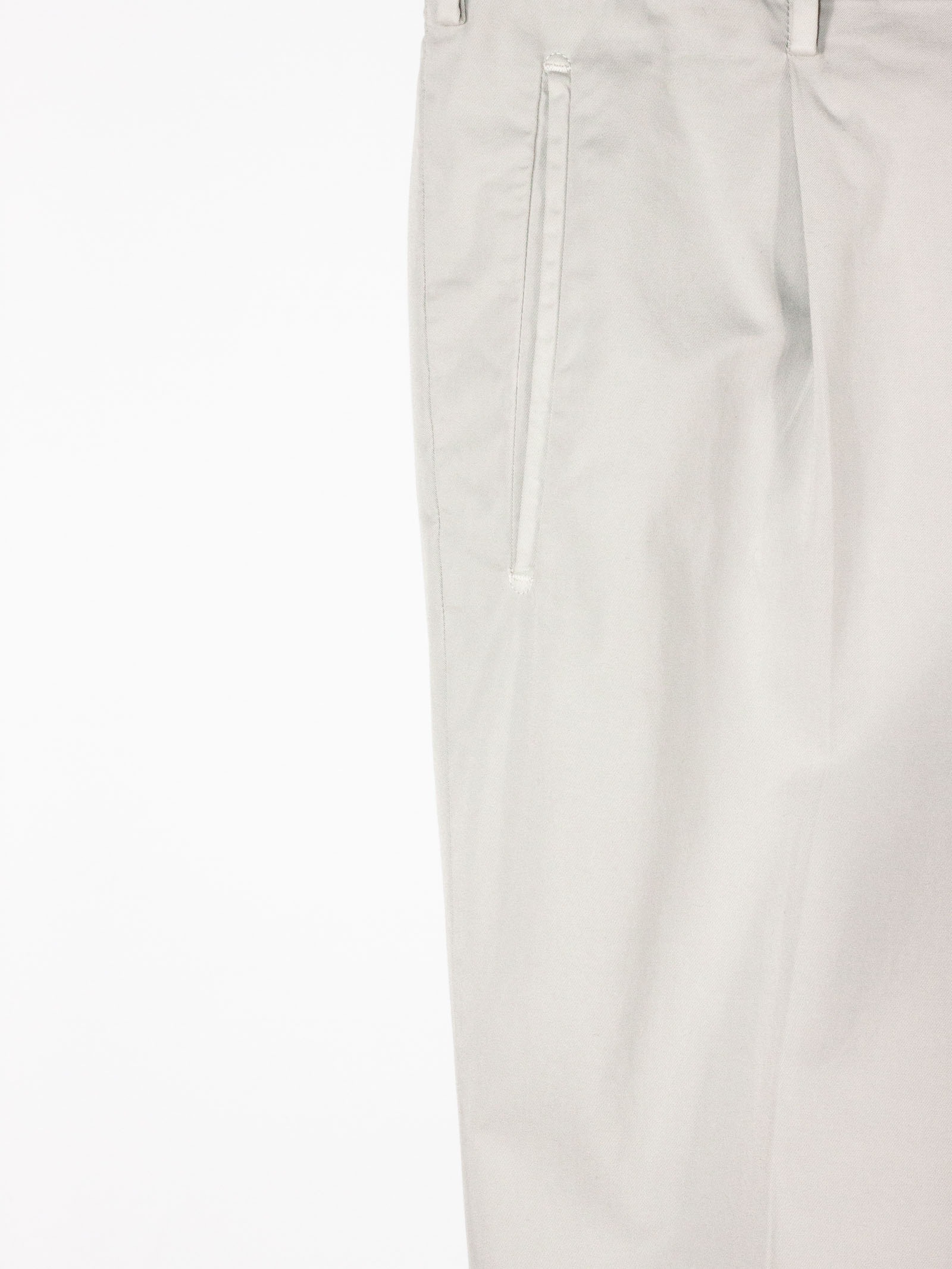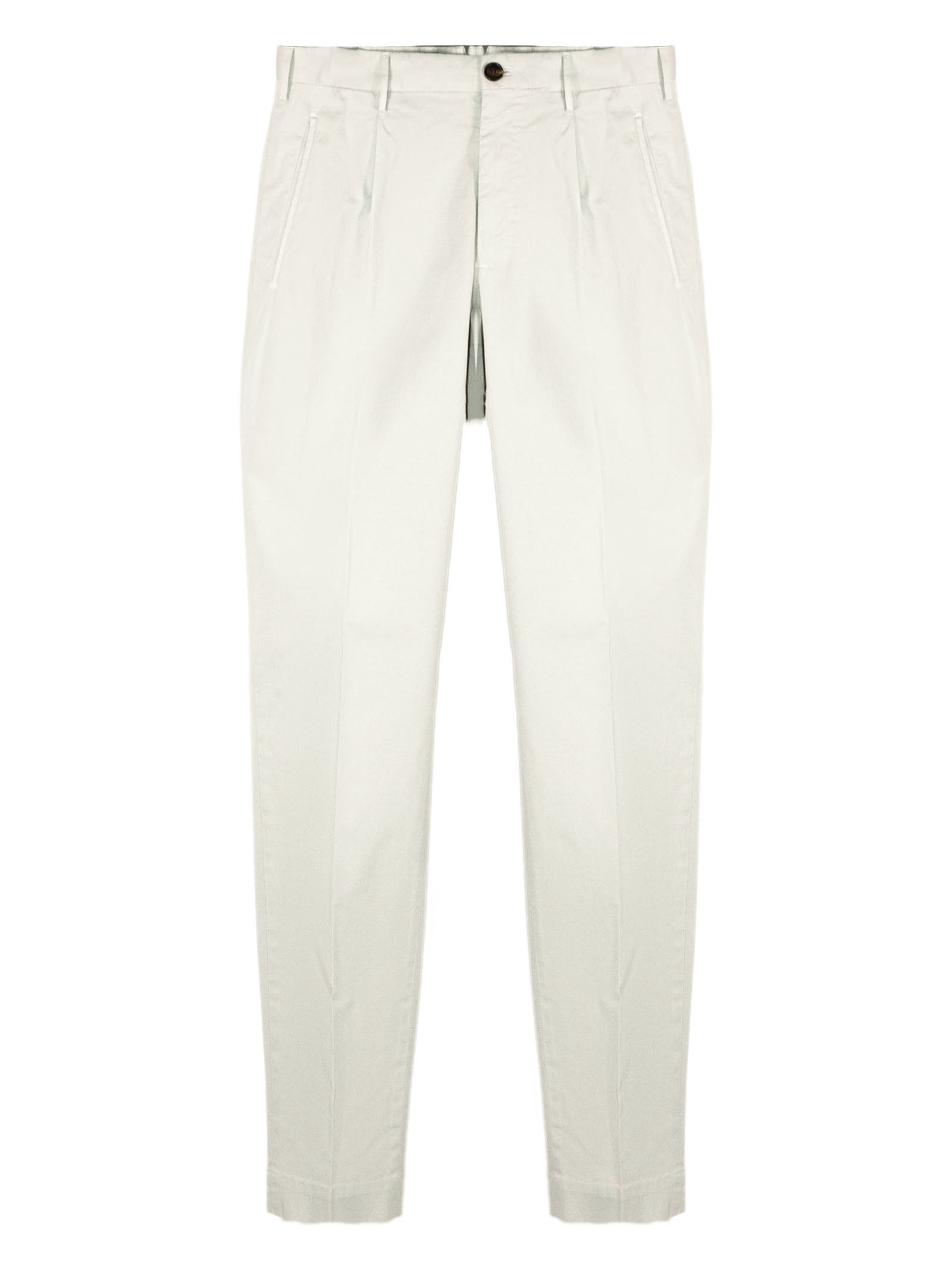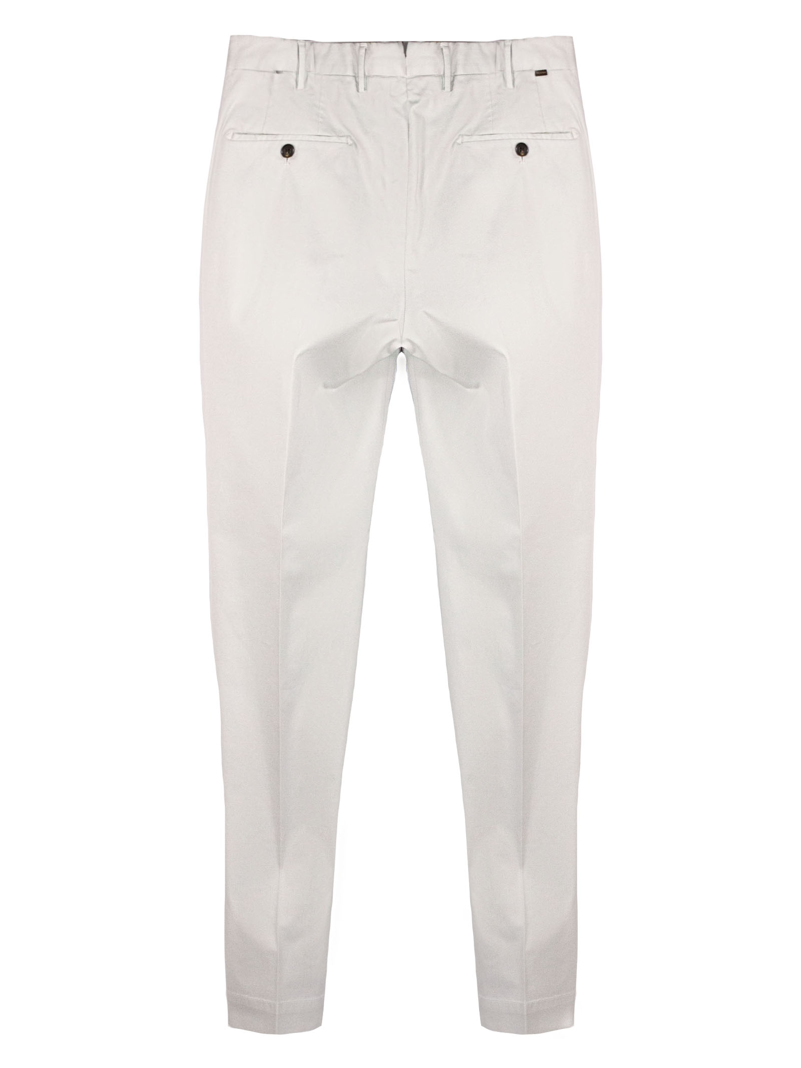 Light beige cotton blend trousers, Tapared fit, belt loops, front zip and button closure, side welt pockets, back pockets with buttons