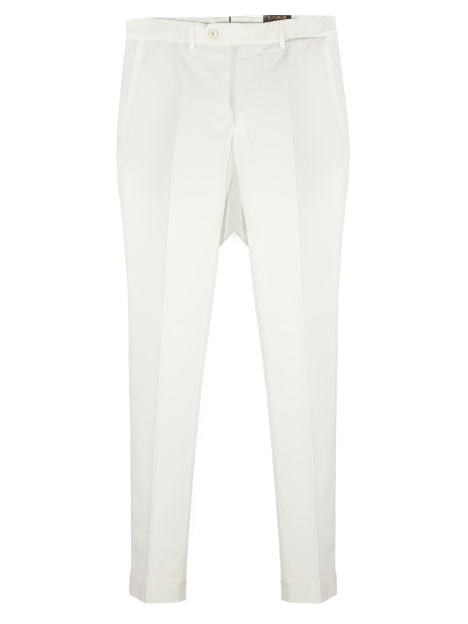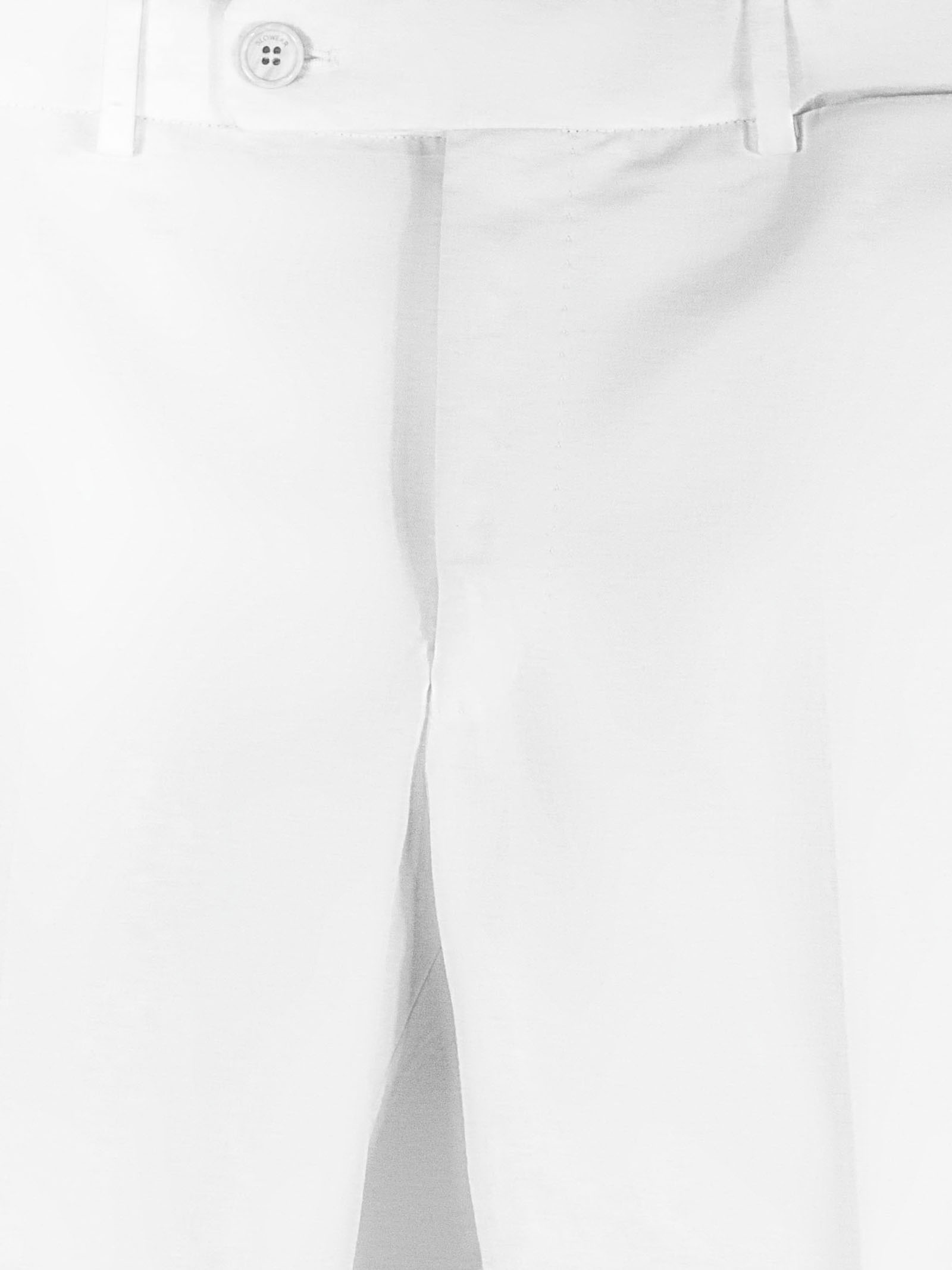 White cotton blend trousers, tapared fit, front zip and button closure, belt loops, side welt pockets, back pockets with buttons
