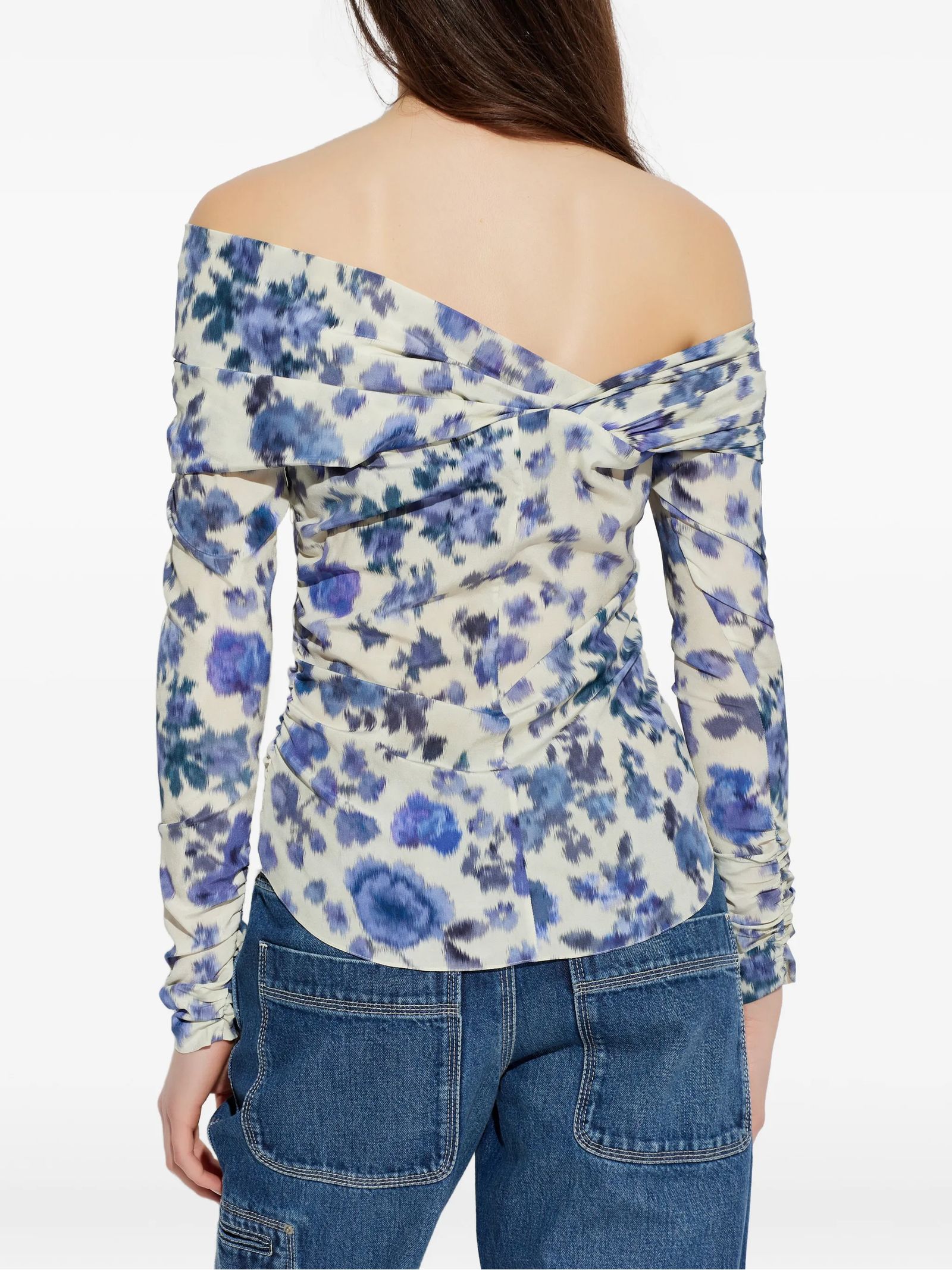 Draped stretch silk rose print top, Asymmetrical low-cut neckline, Long gathered sleeves, Gathered body, Fitted