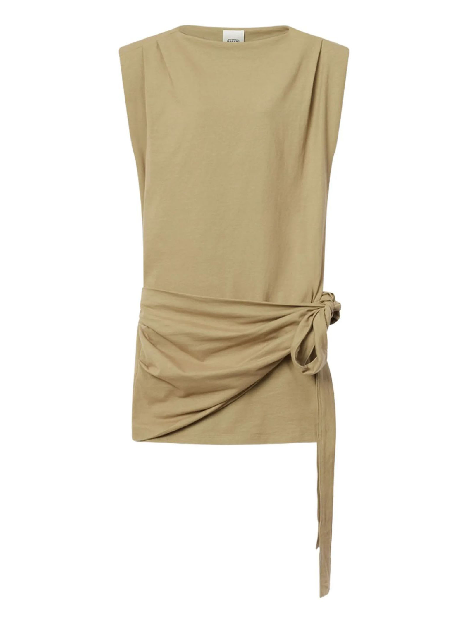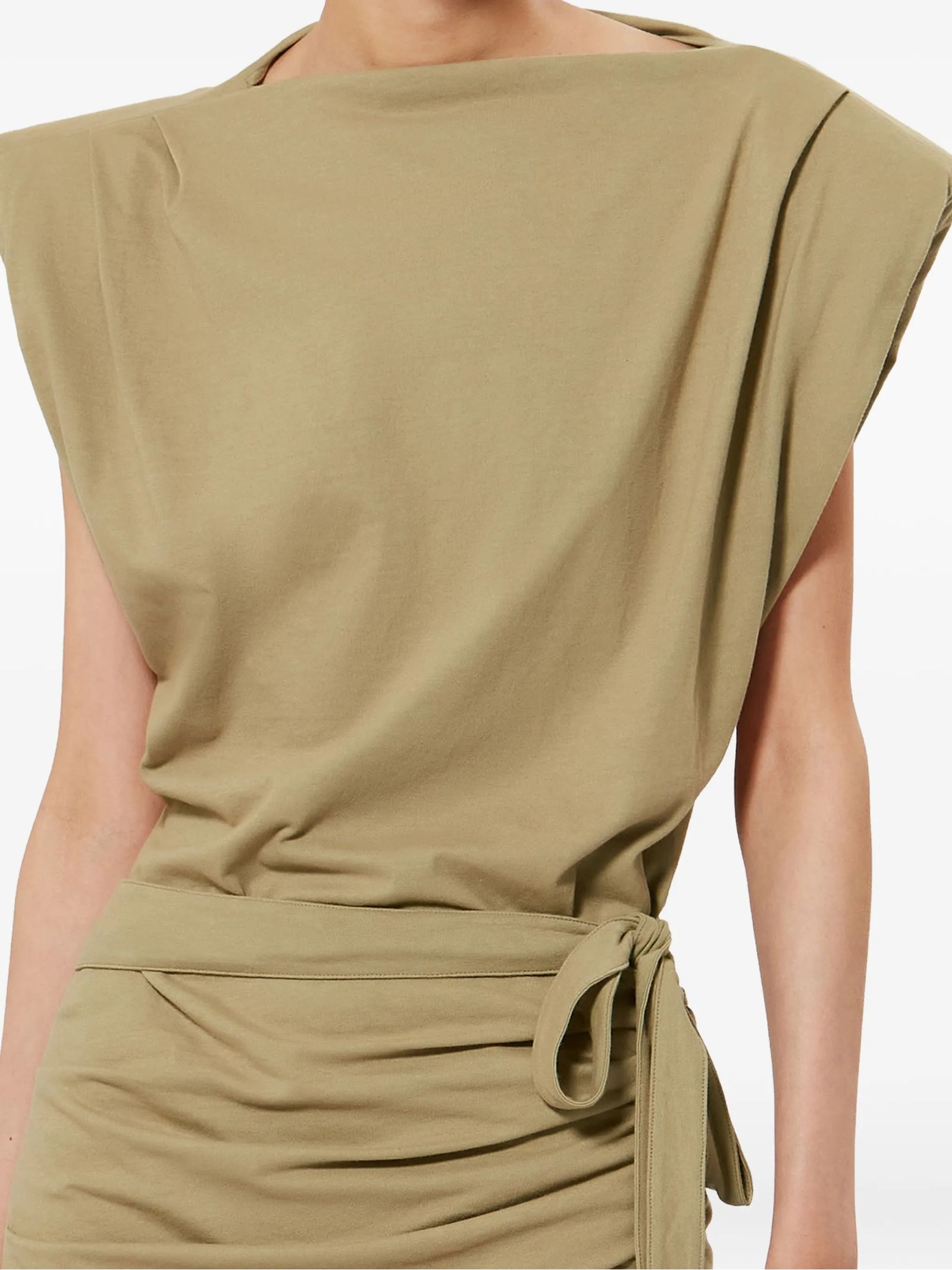 Draped cotton jersey dress, Boat neck, Structured shoulders with pads and pleats, Short sleeves, Draped tied tail on the side, Short and fitted