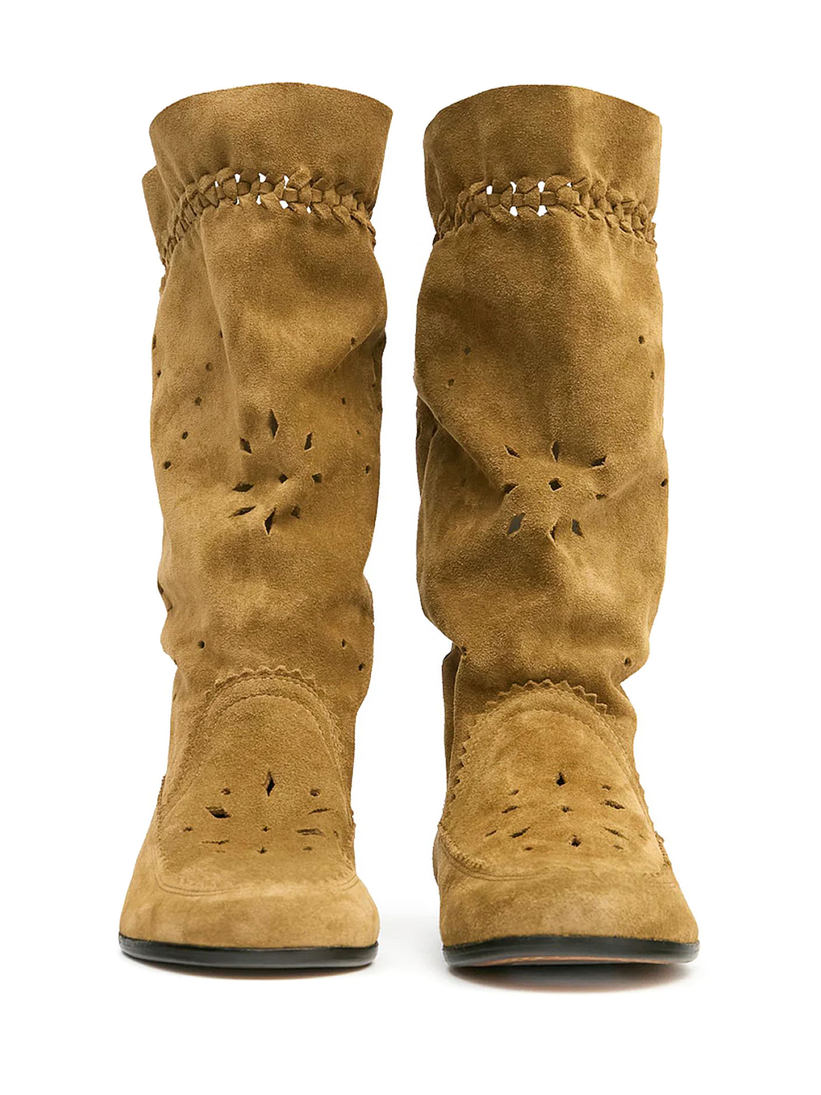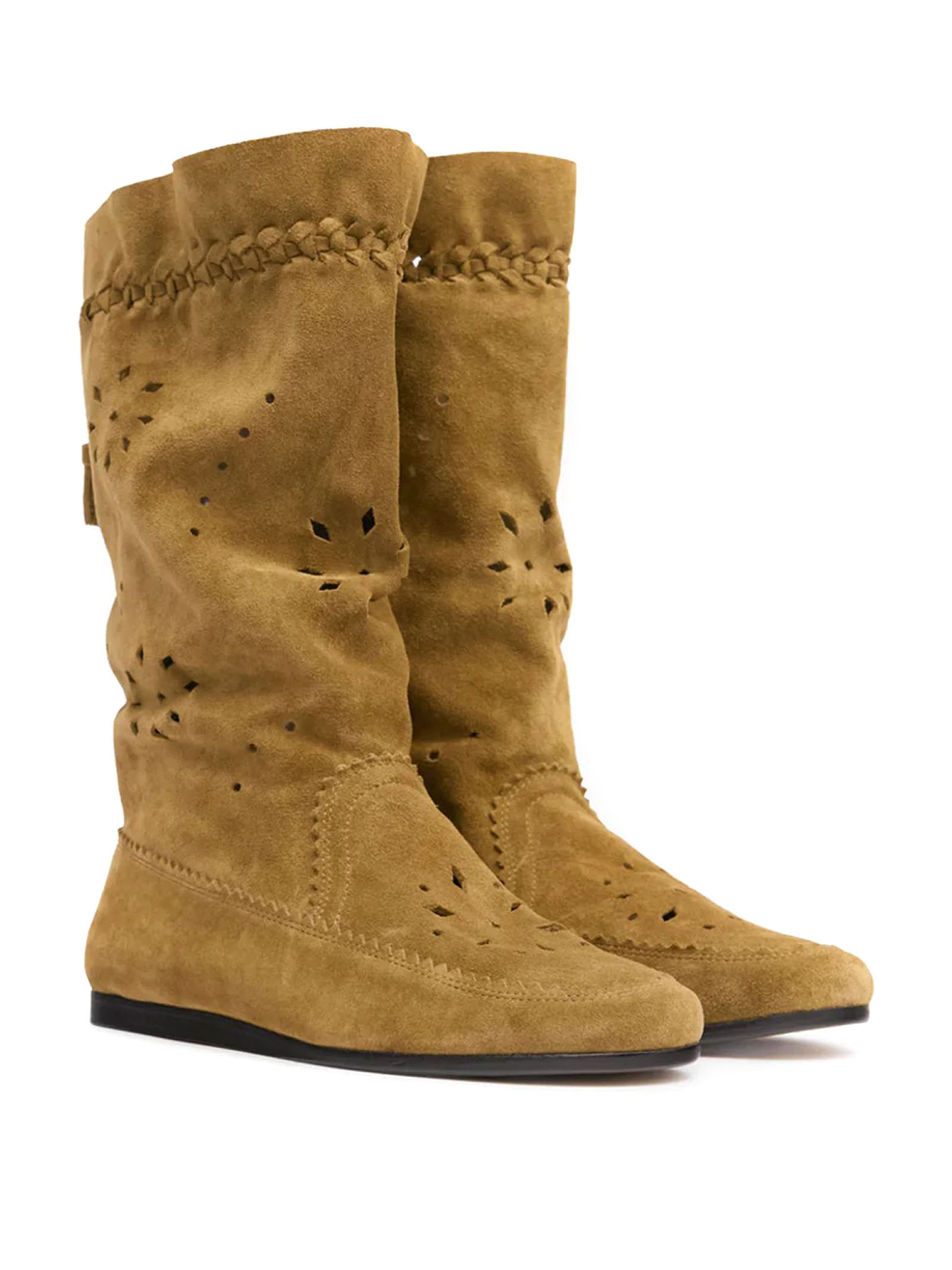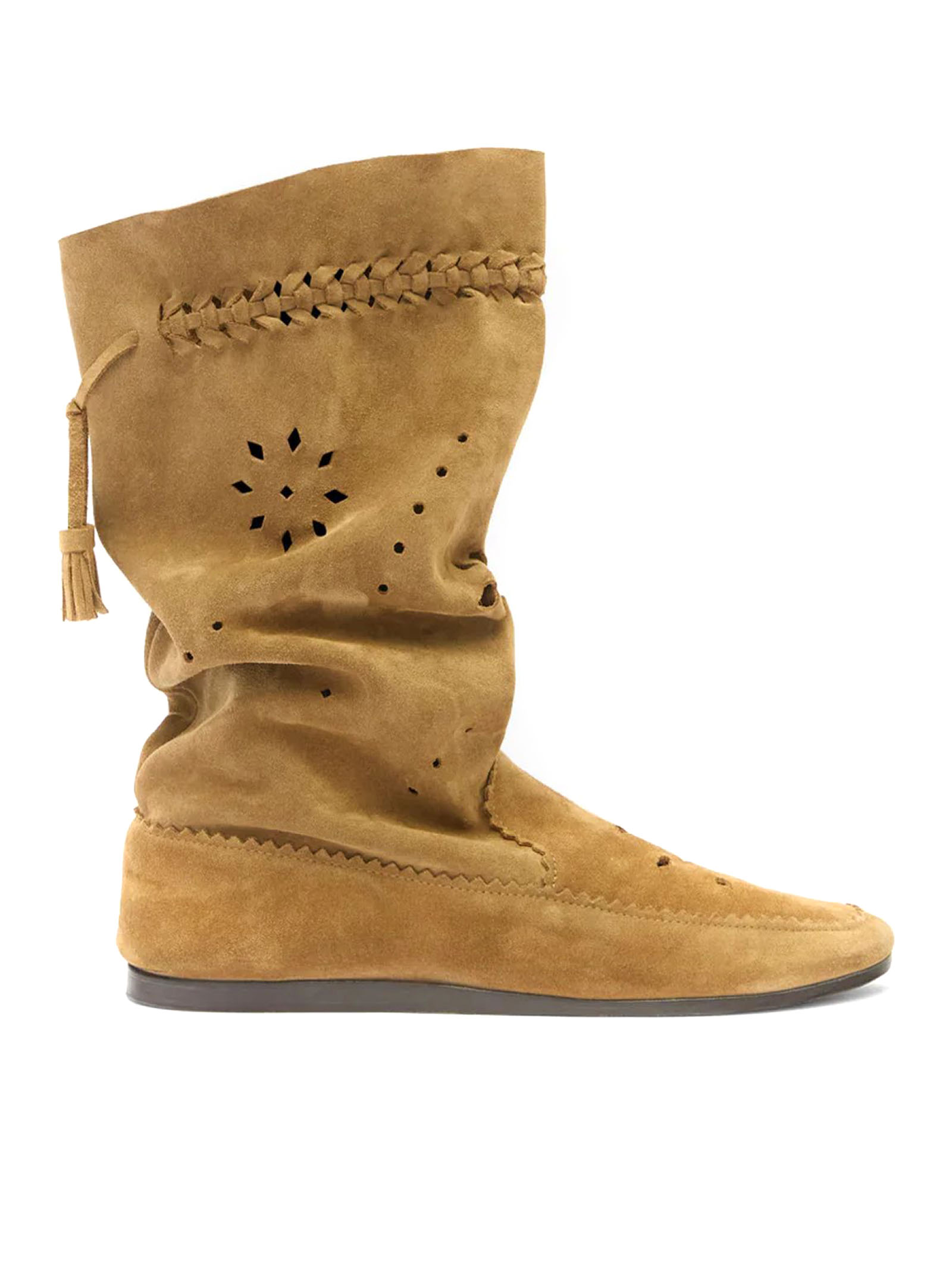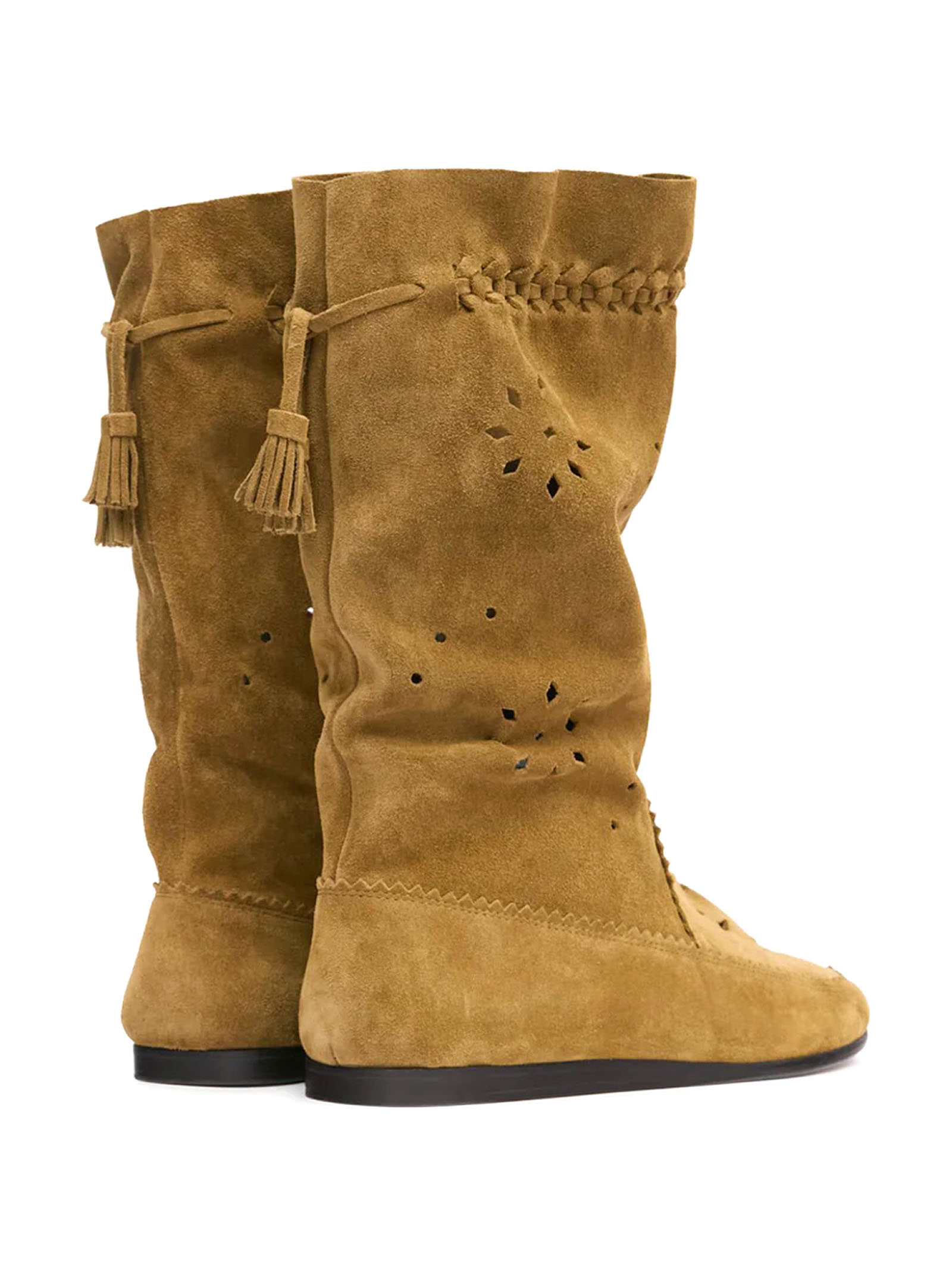 Welky suede leather boots, perforated suede calfskin leather, soft high uppers, braided trim with pompoms, round toes, soft leather insoles and outsoles, soft leather lining