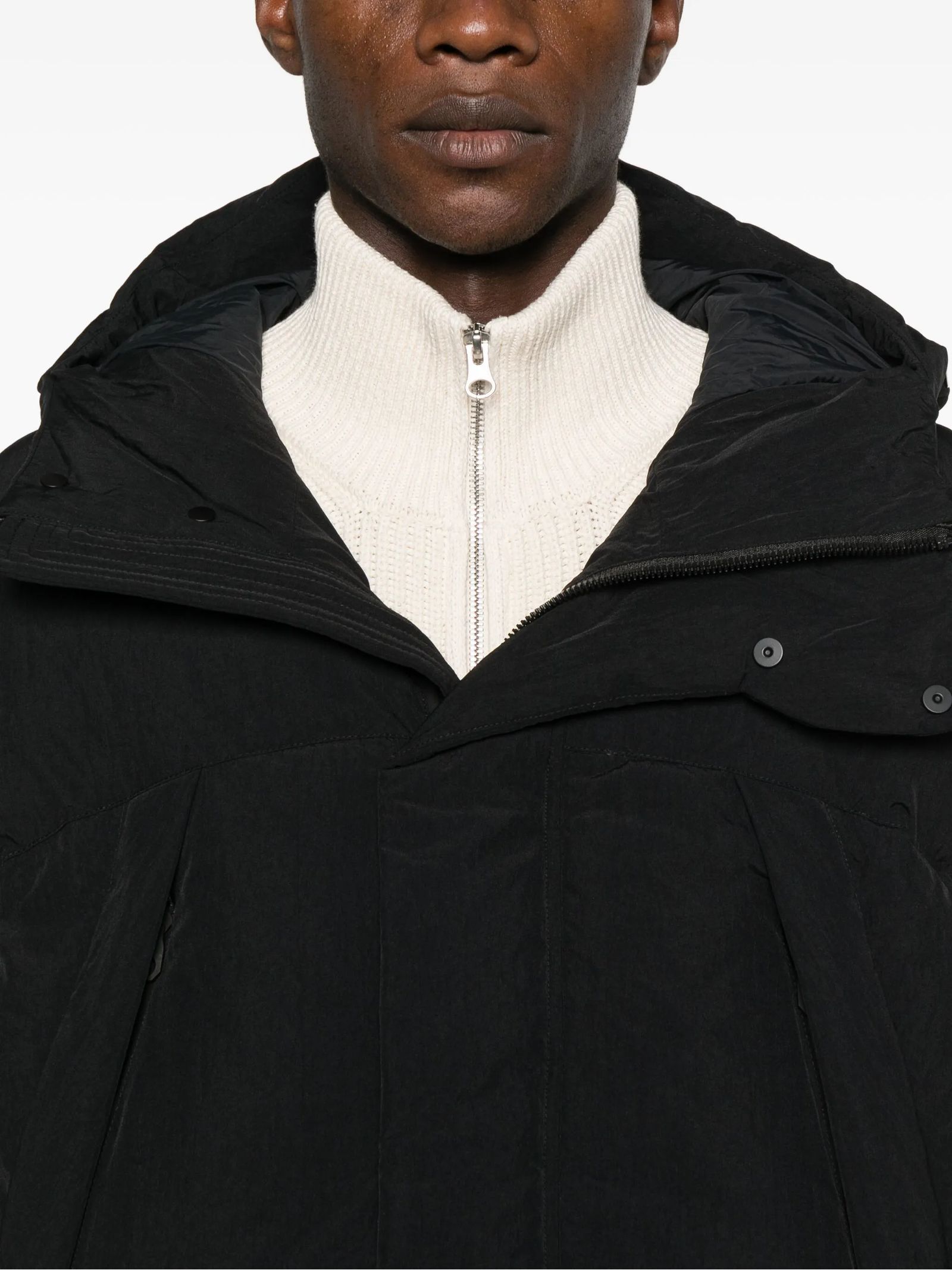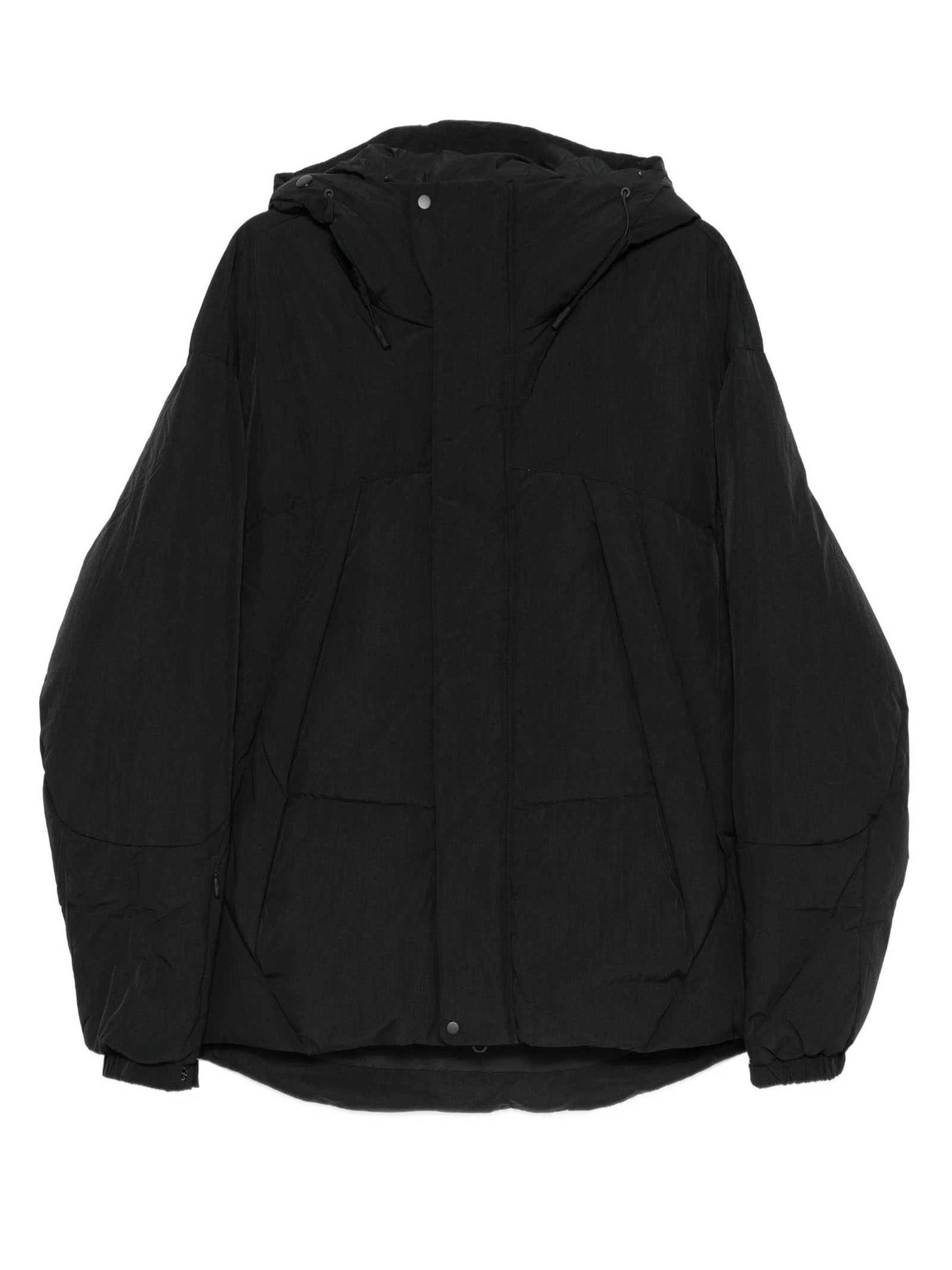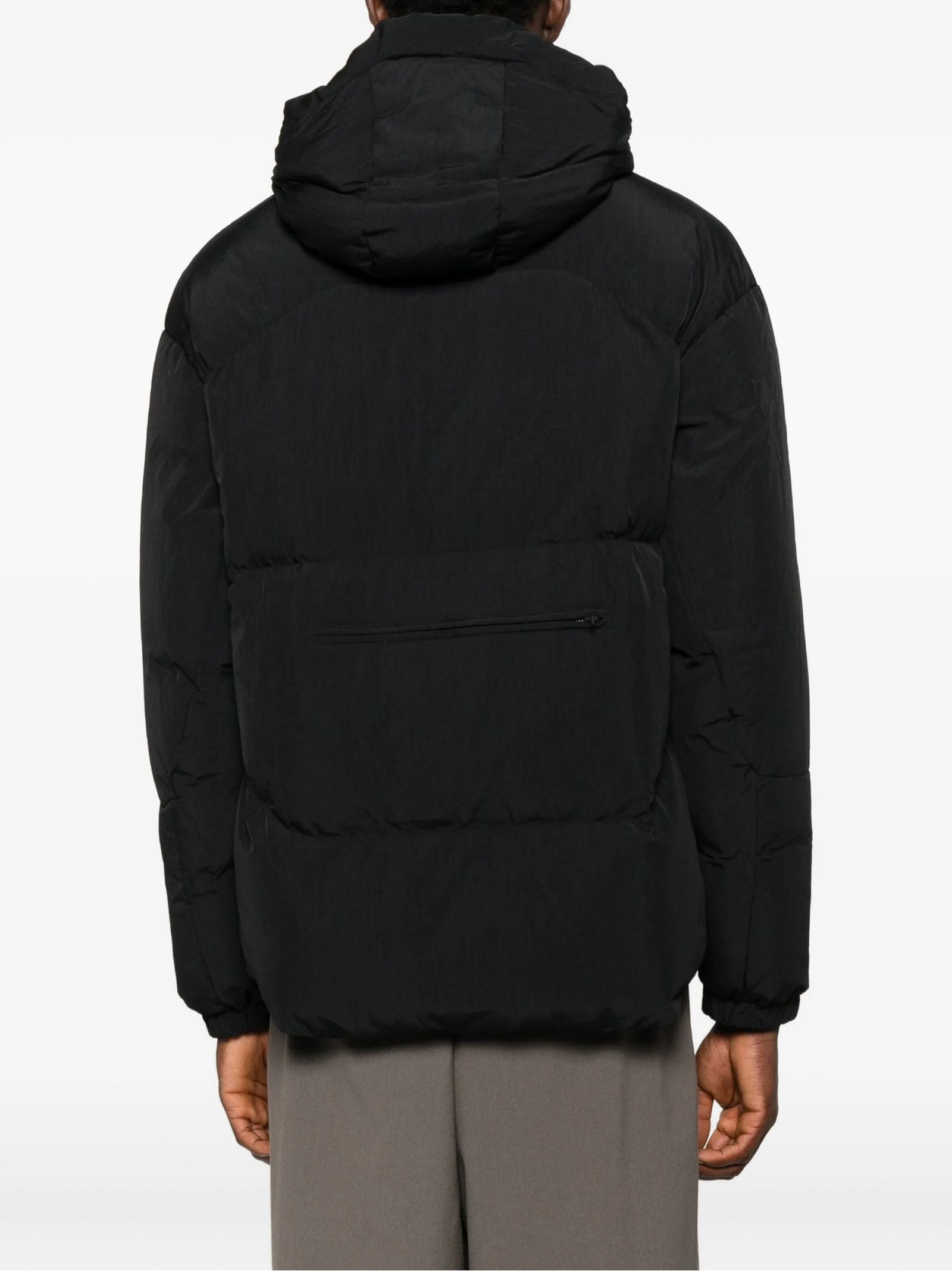 Black hooded padded jacket, classic hood, concealed front fastening, cuff zips, long sleeves, elasticated cuffs