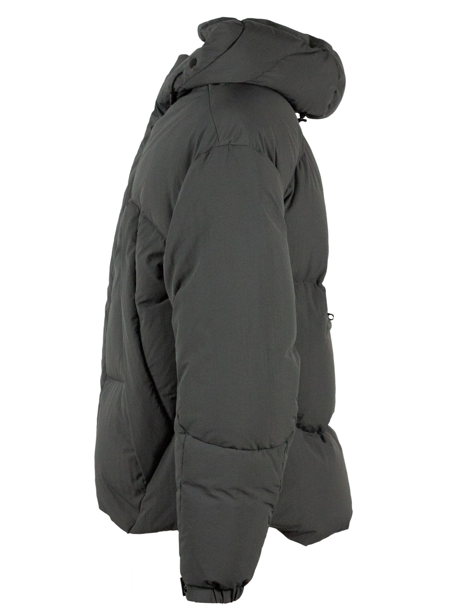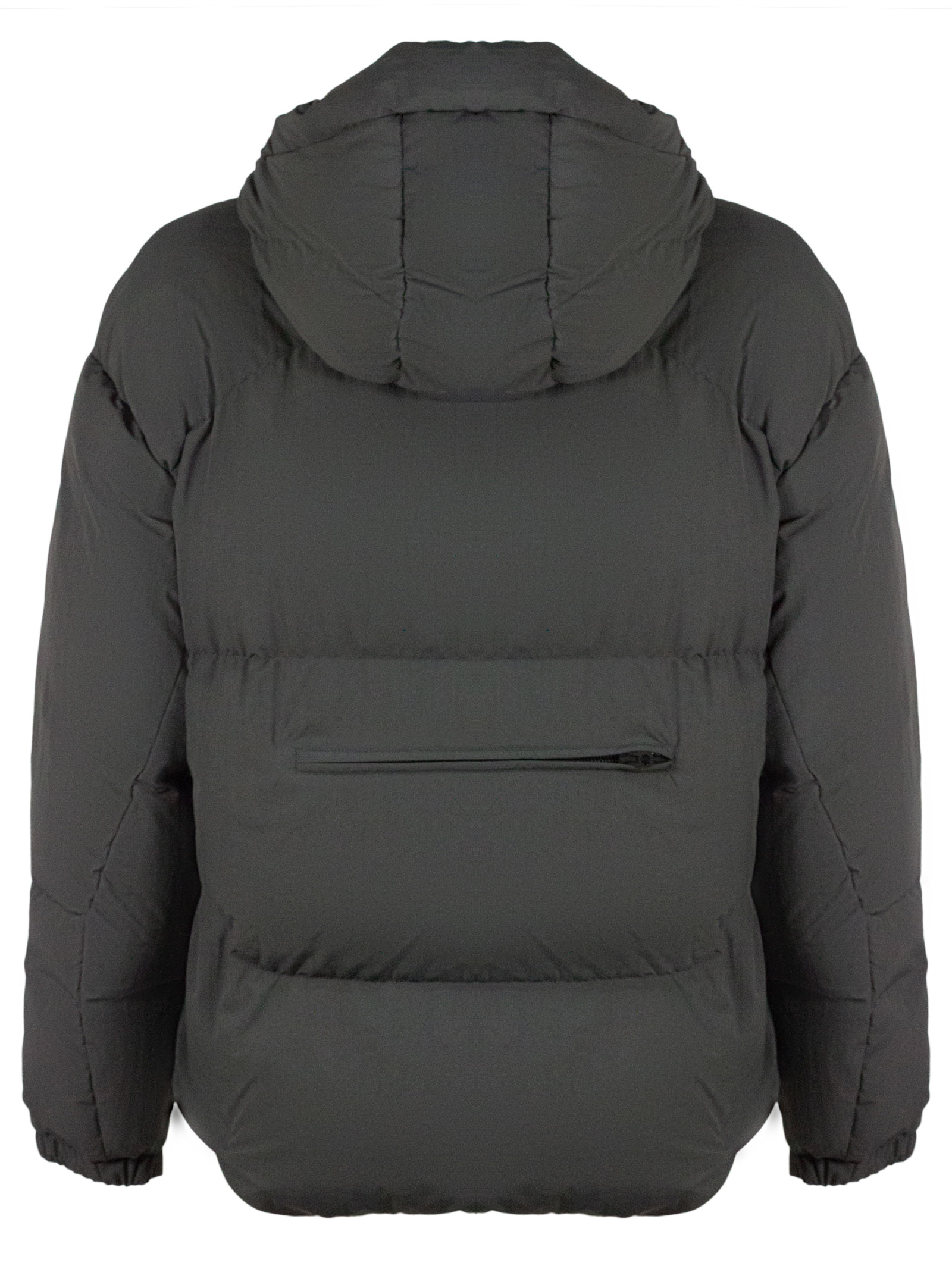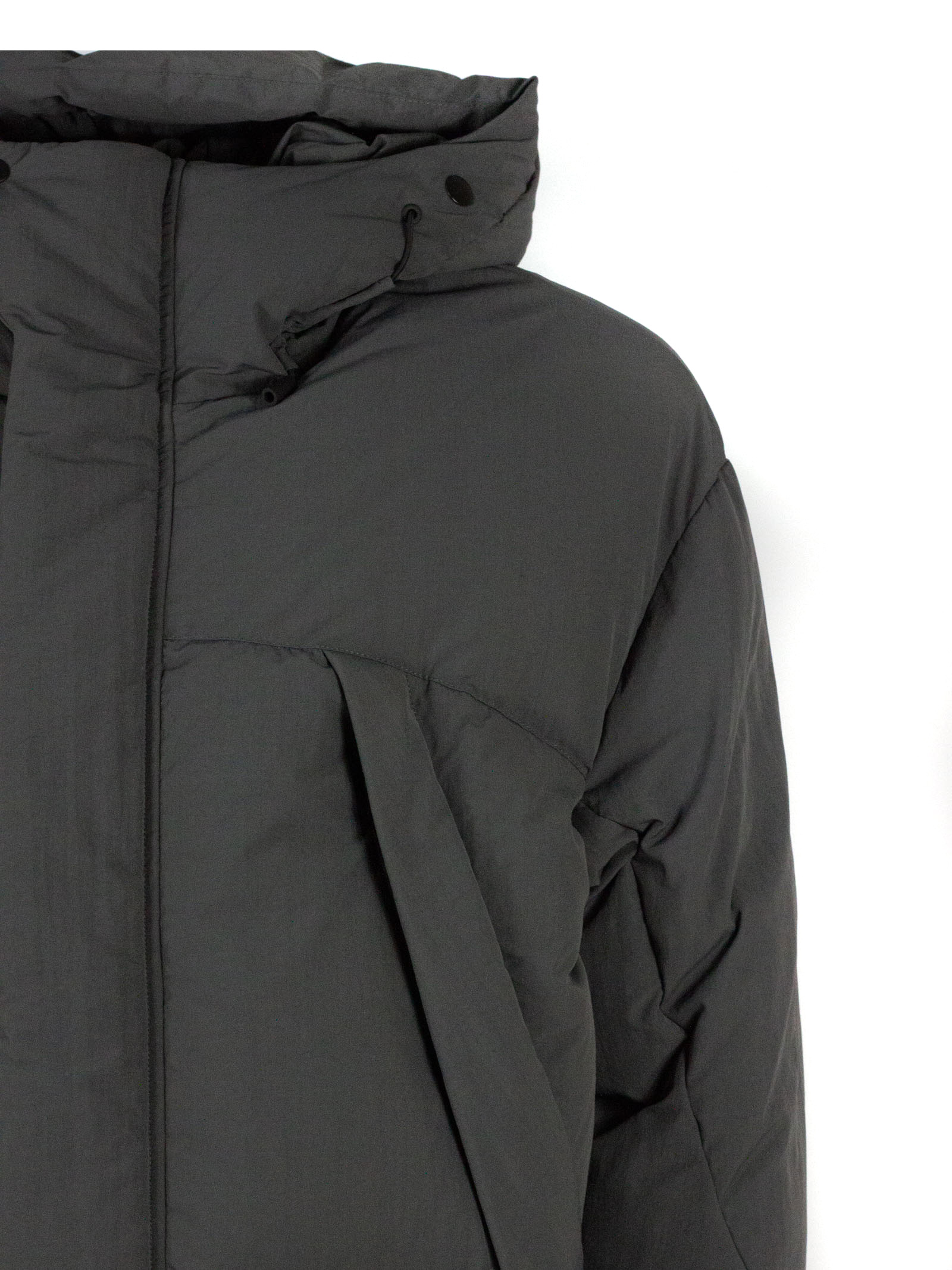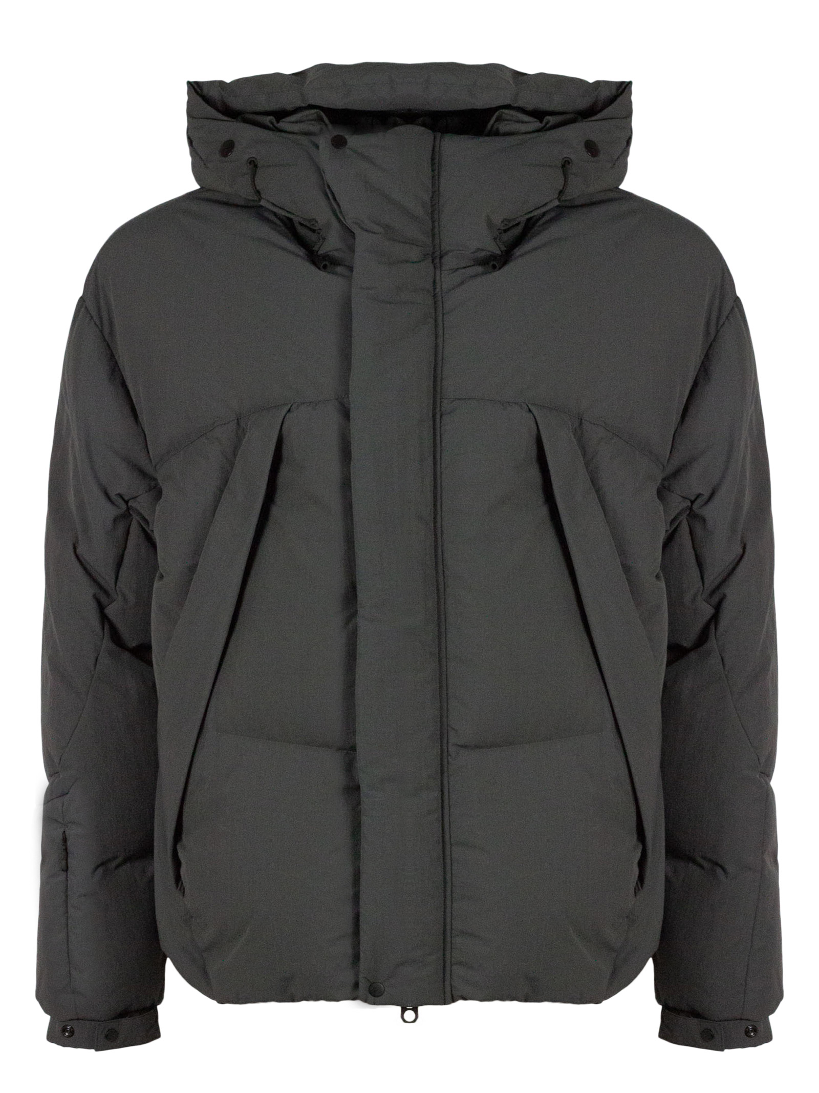 Dark grey technical fabric jacket with padded design, drawstring hood, pleats at the front, button details, long sleeves, back pocket with zip, concealed front fastening