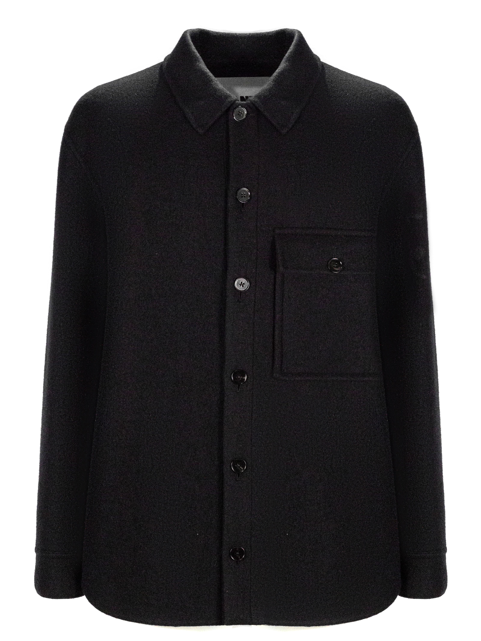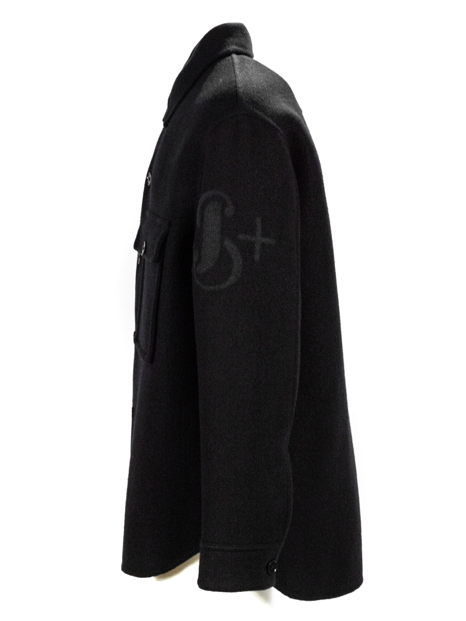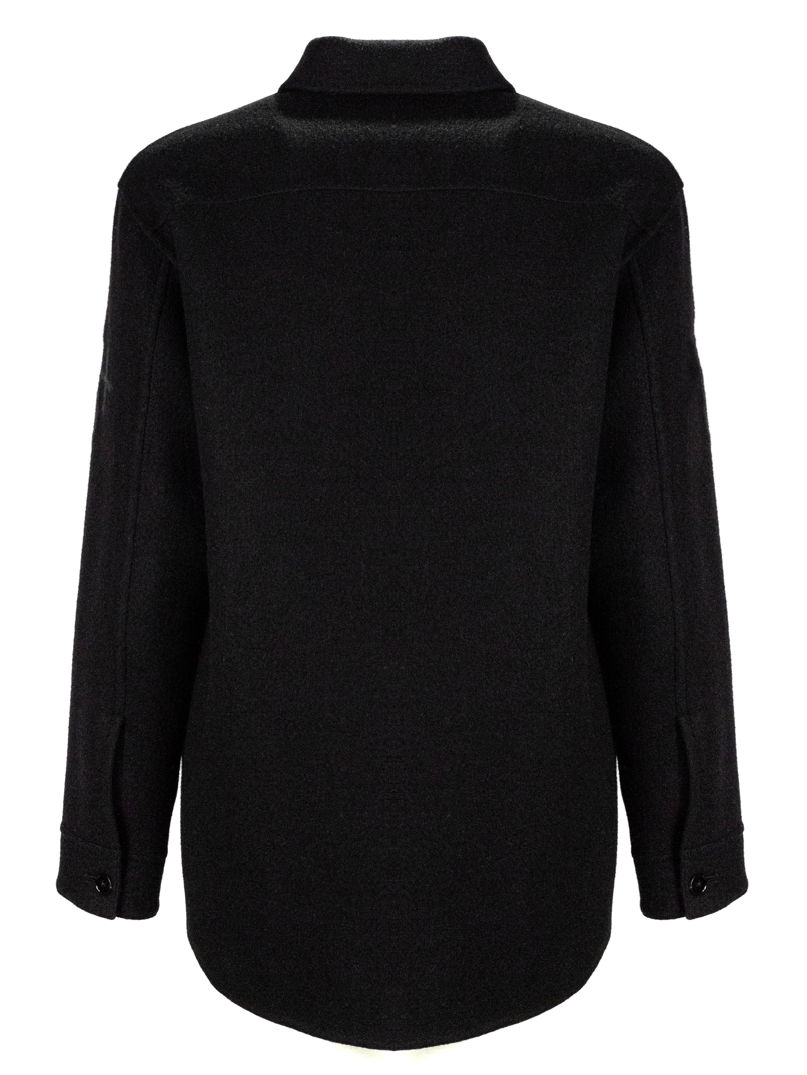 Black virgin wool coat with viscose lining, classic collar, logo detail on the sleeve, chest pocket with flap and button, front button closure