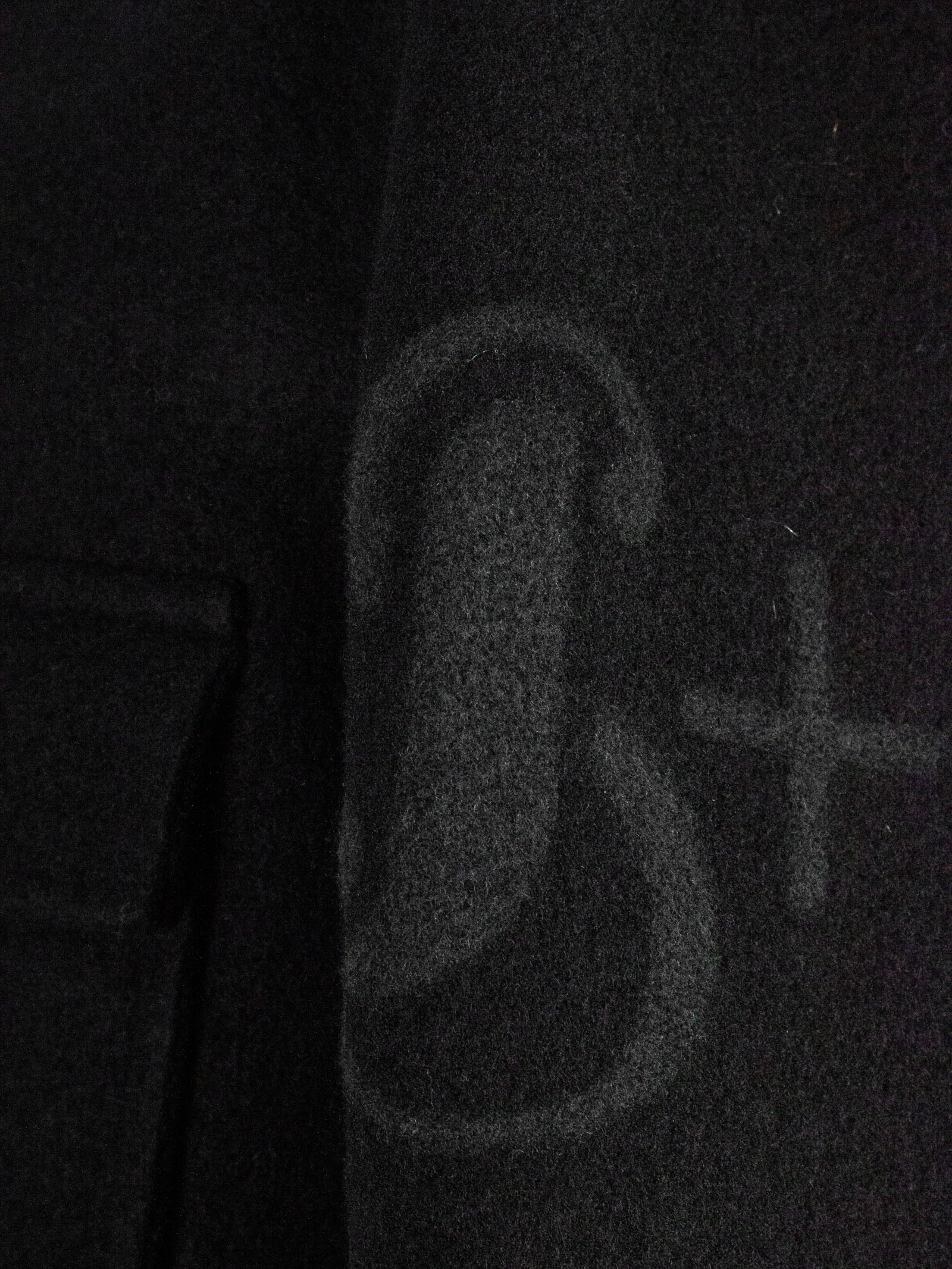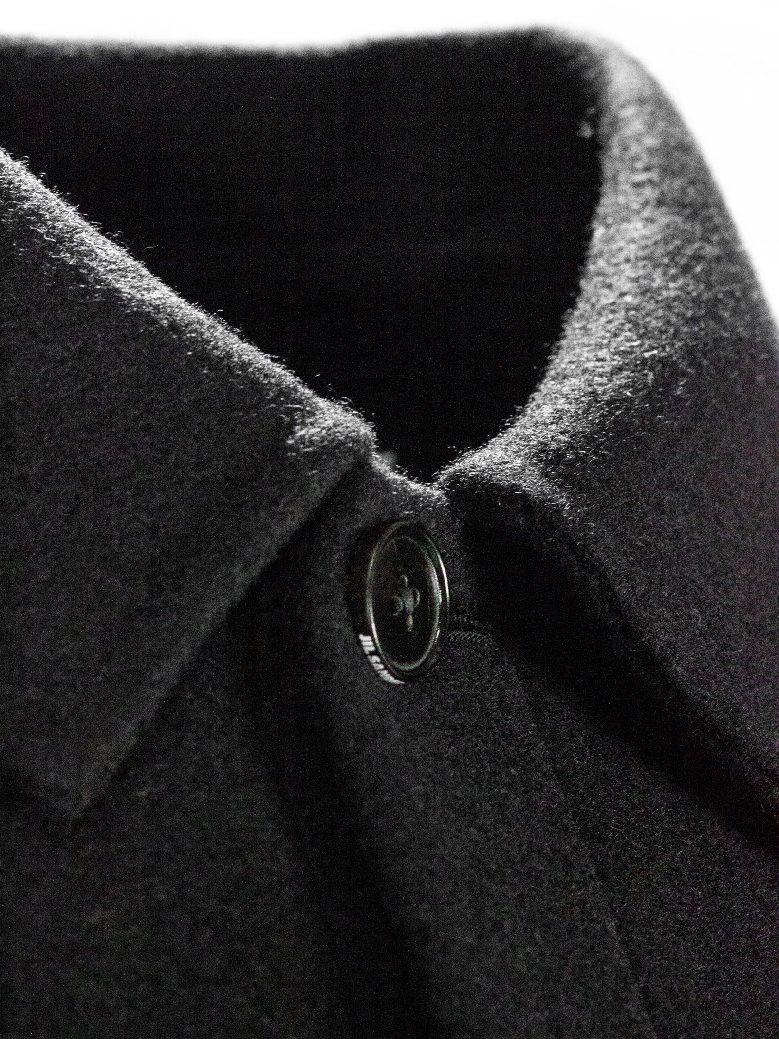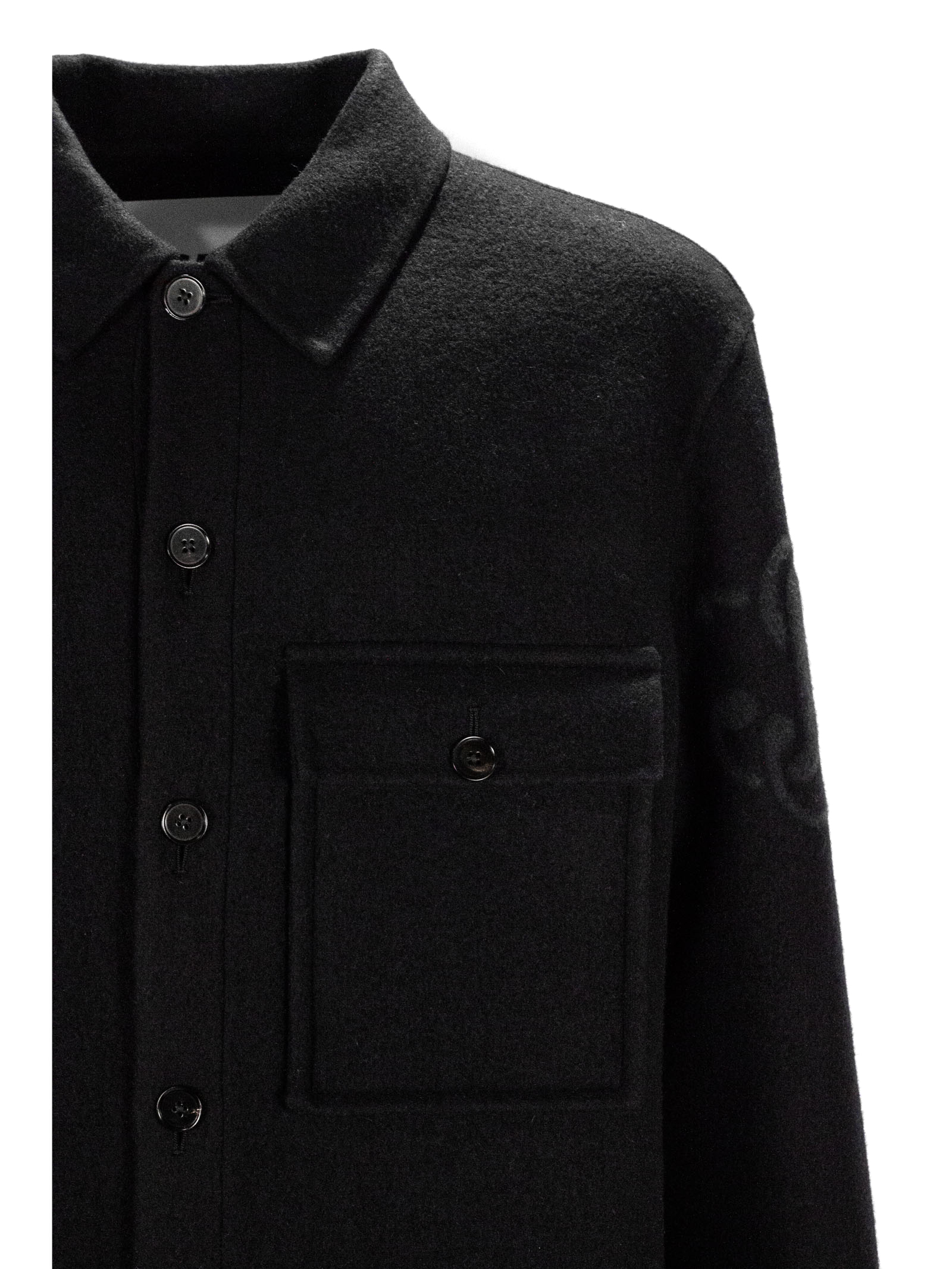 Black virgin wool coat with viscose lining, classic collar, logo detail on the sleeve, chest pocket with flap and button, front button closure