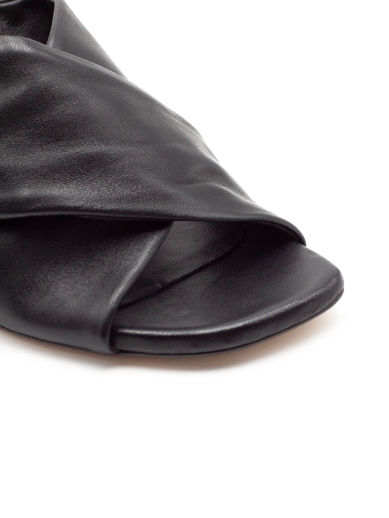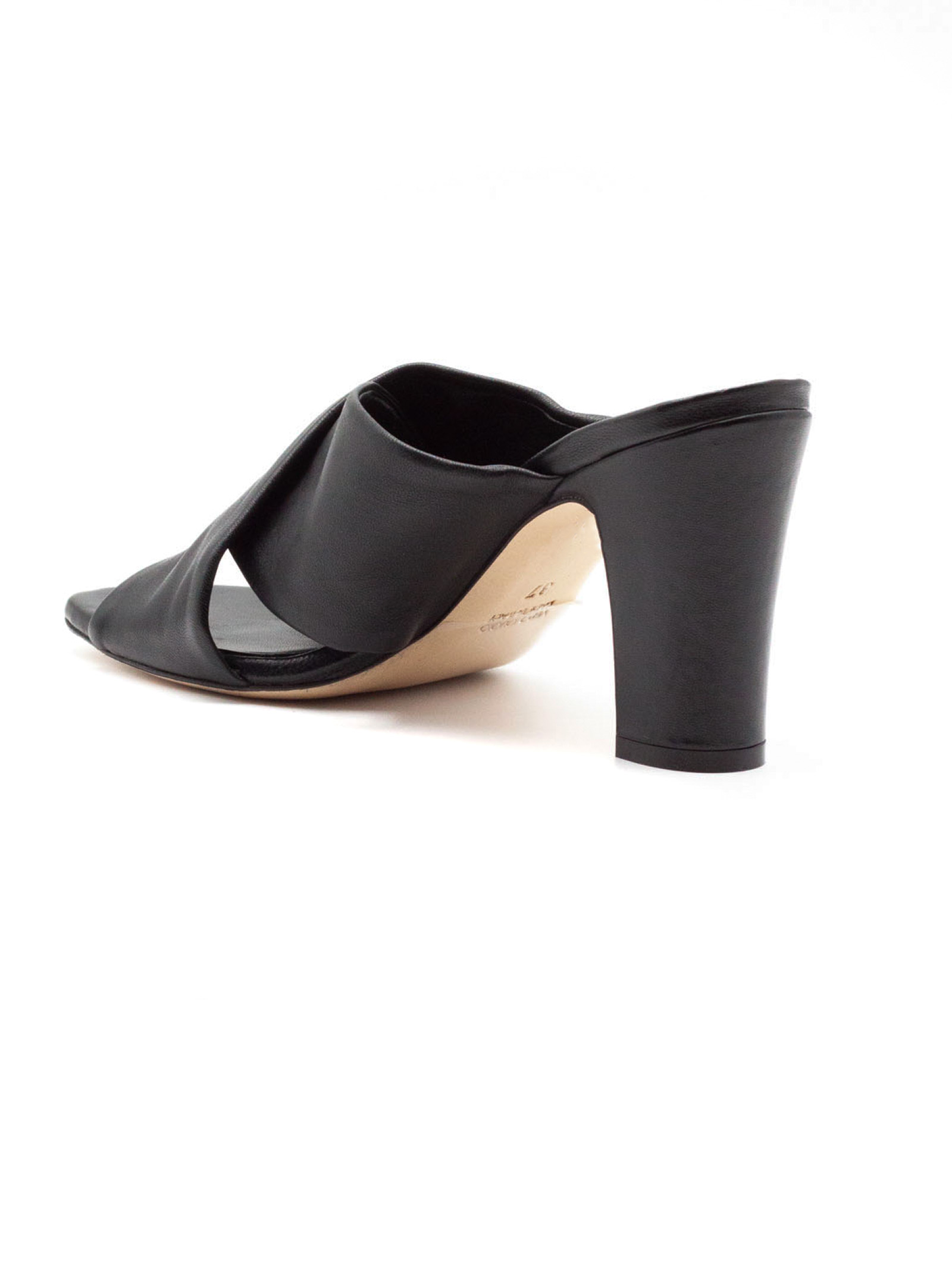 Black leather open-toe sandal with crisscross straps, leather sole with logo, 9 cm heel