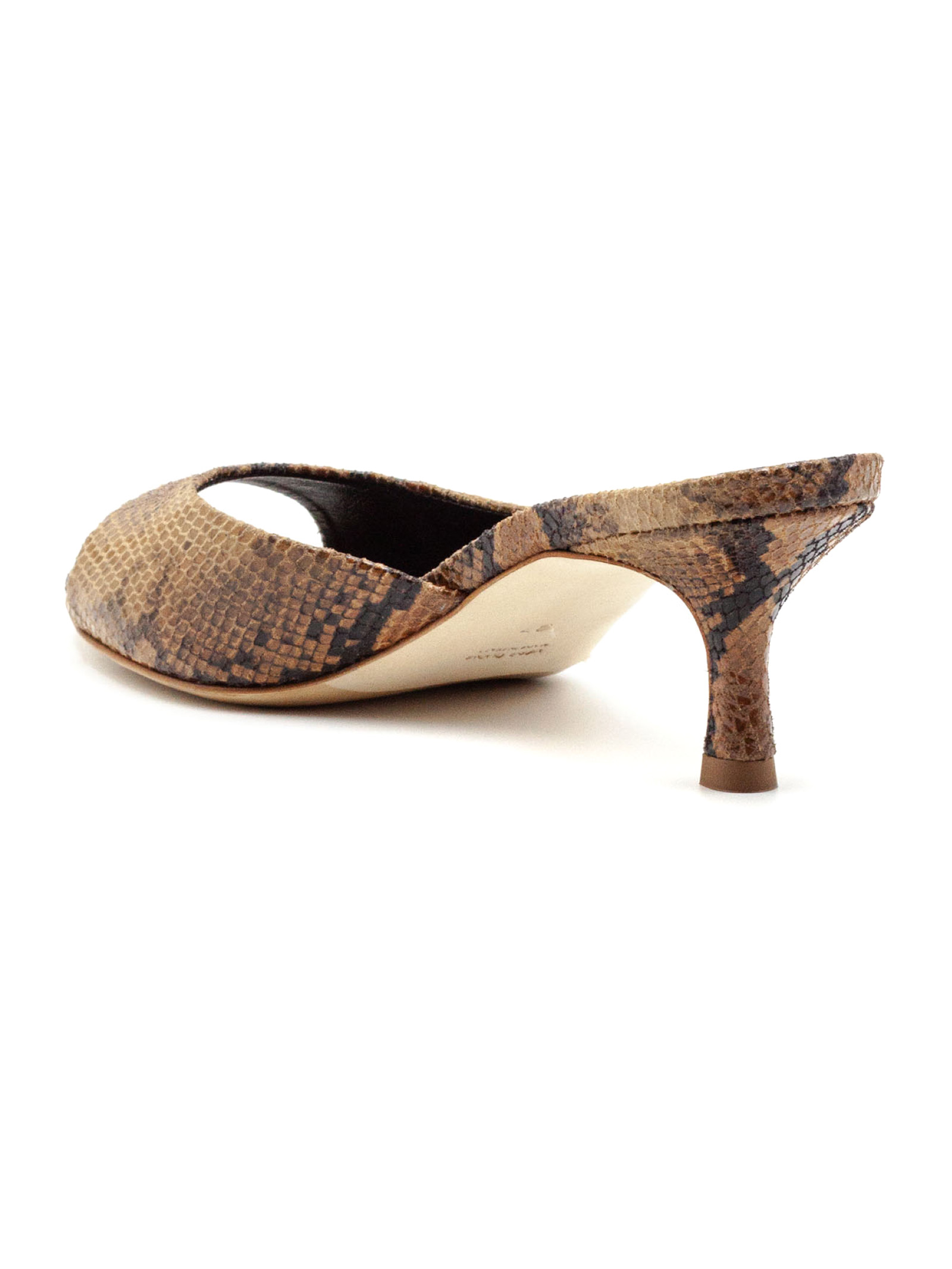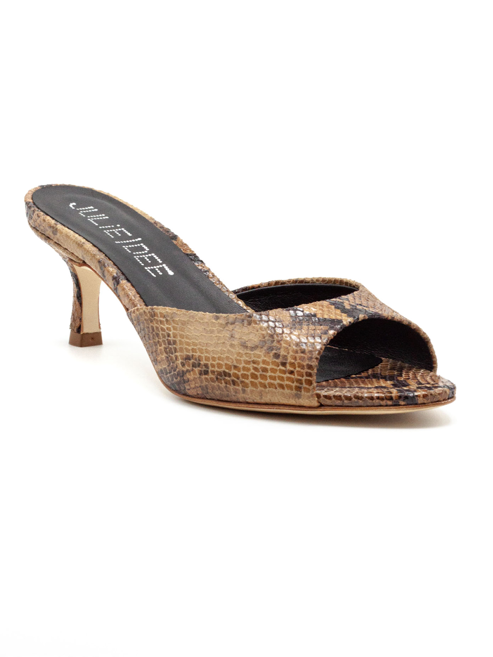 Python-print leather mule in shades of brown, with an open toe and a minimalist design, featuring a medium-height contoured heel, 4 cm in height