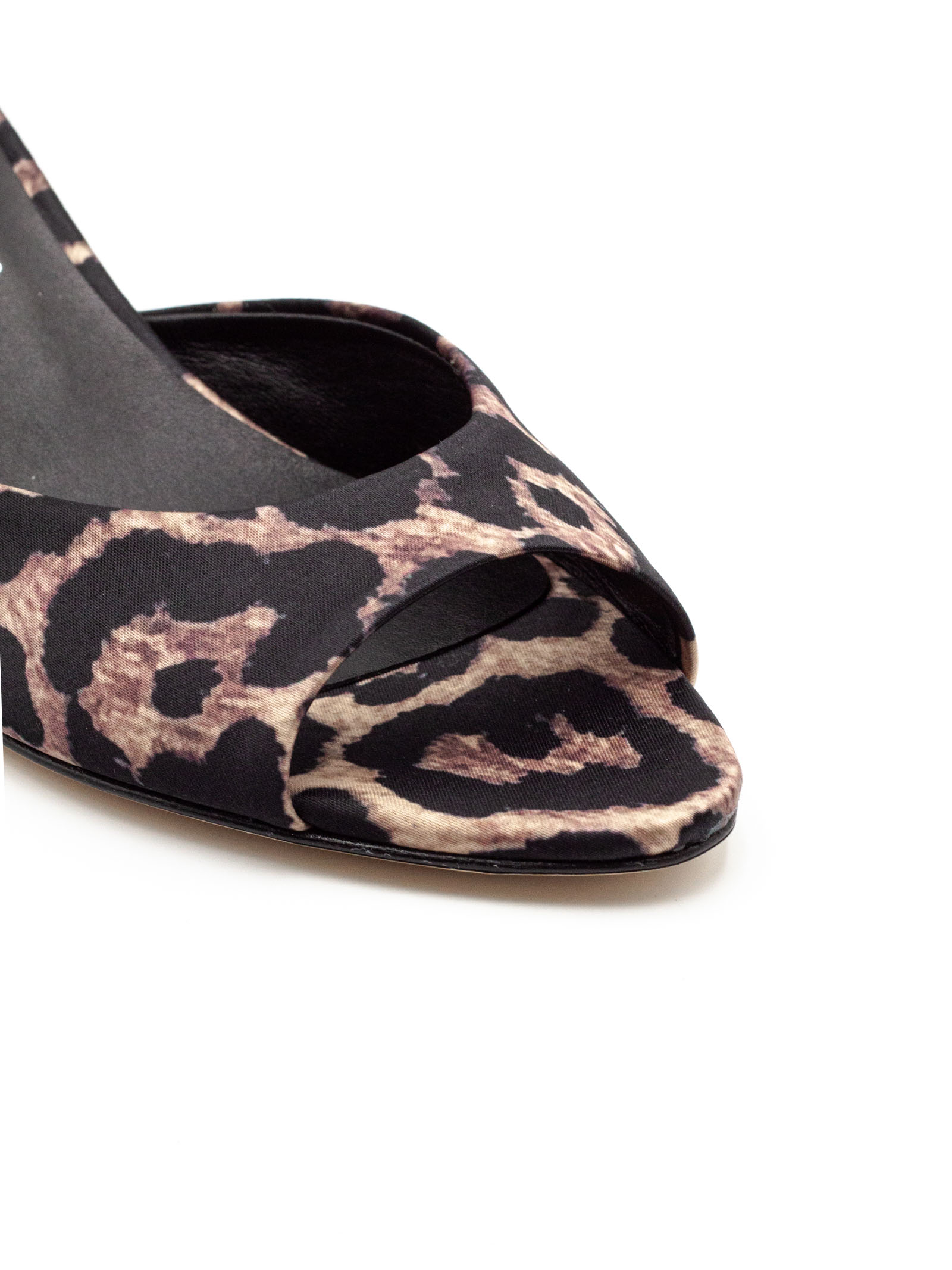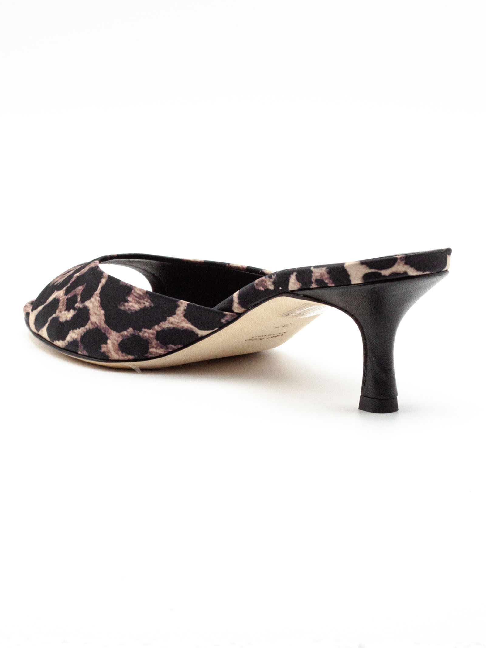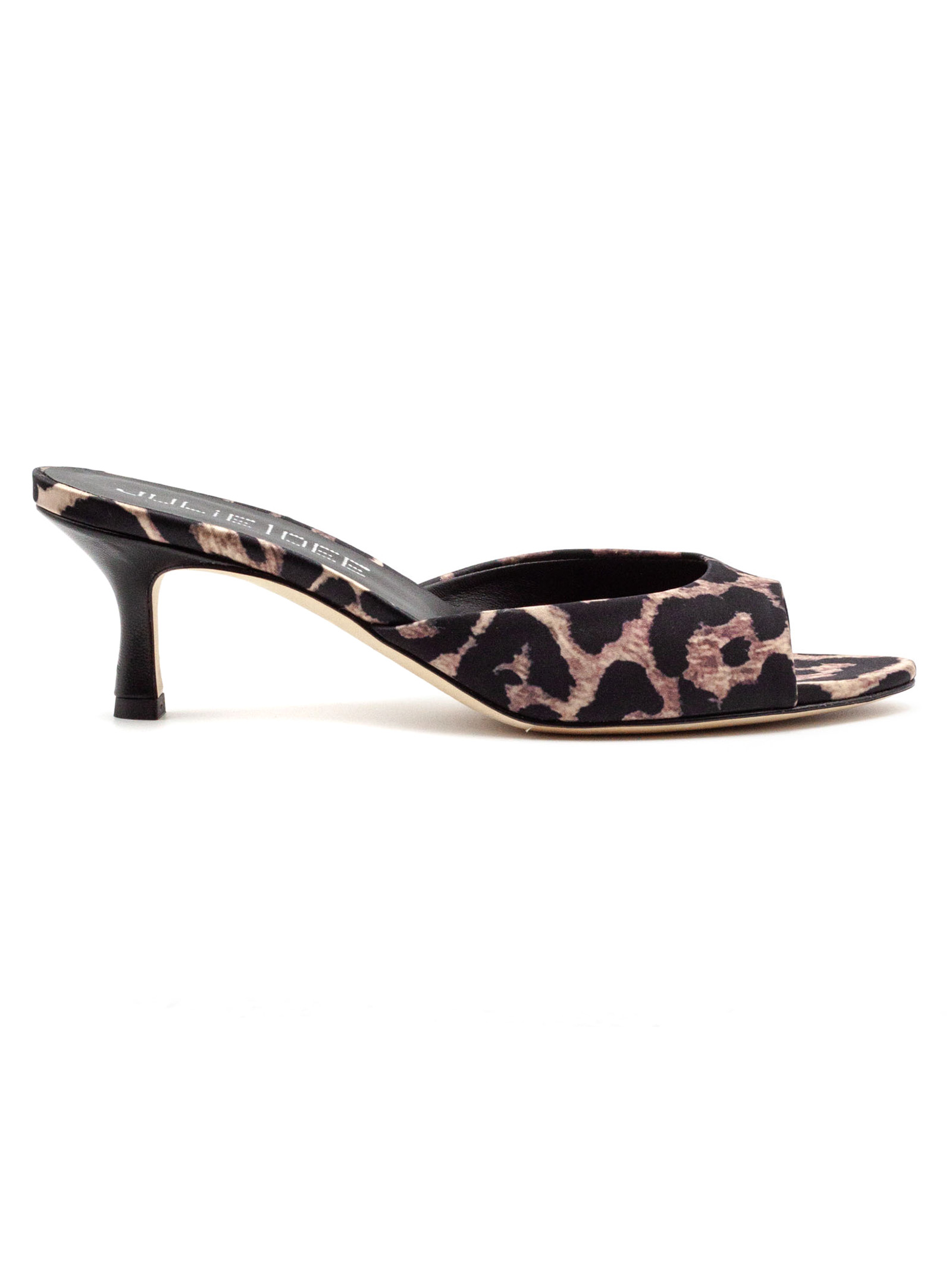 Leopard-print satin mule sandal with an open toe and a minimalist design, featuring a contoured mid-height heel (4 cm)