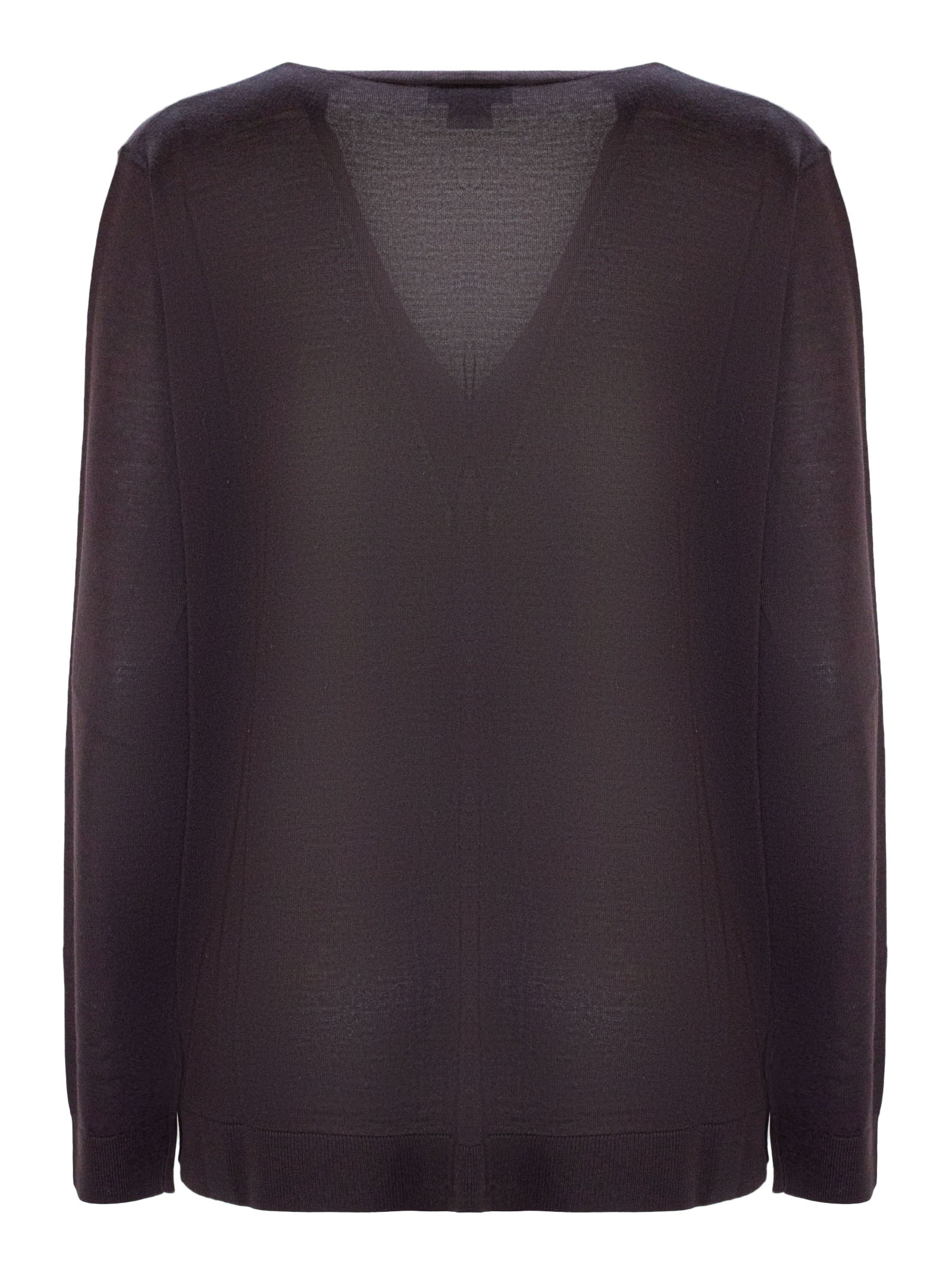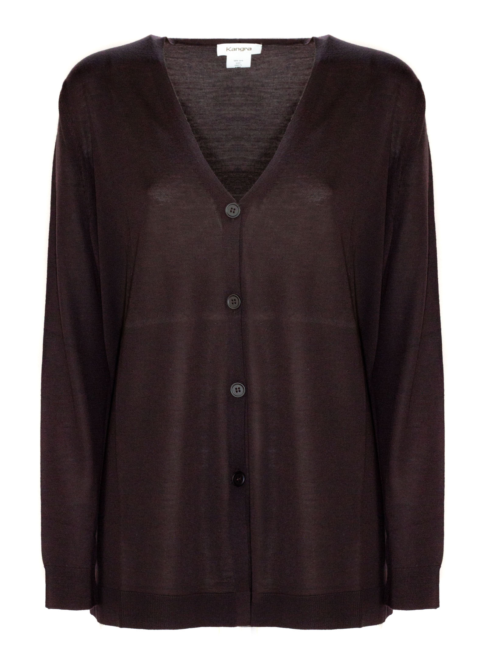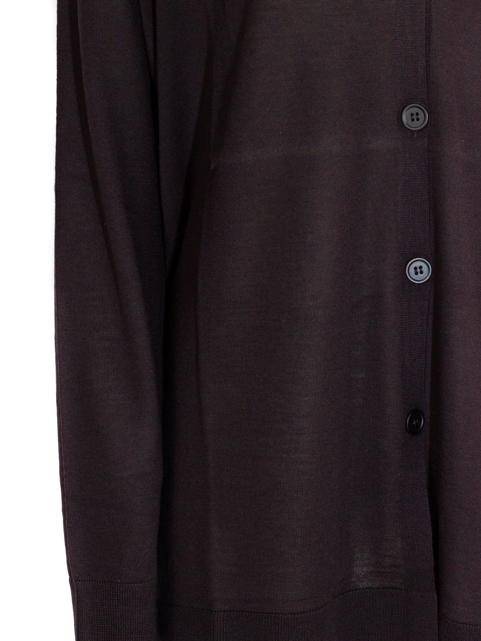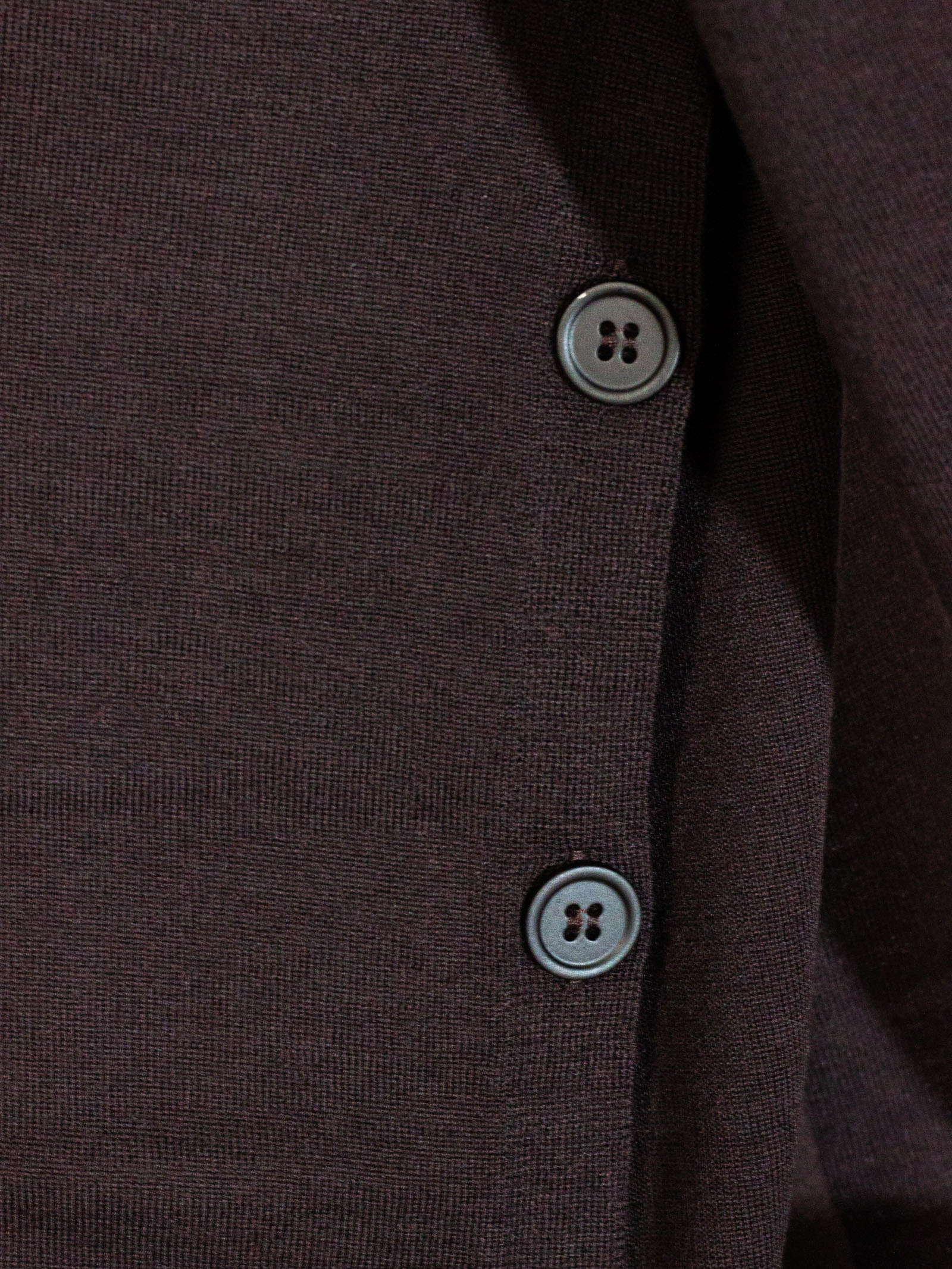 Brown wool cardigan with front button fastening, deep V-neck, side slits with buttons, ribbed trim