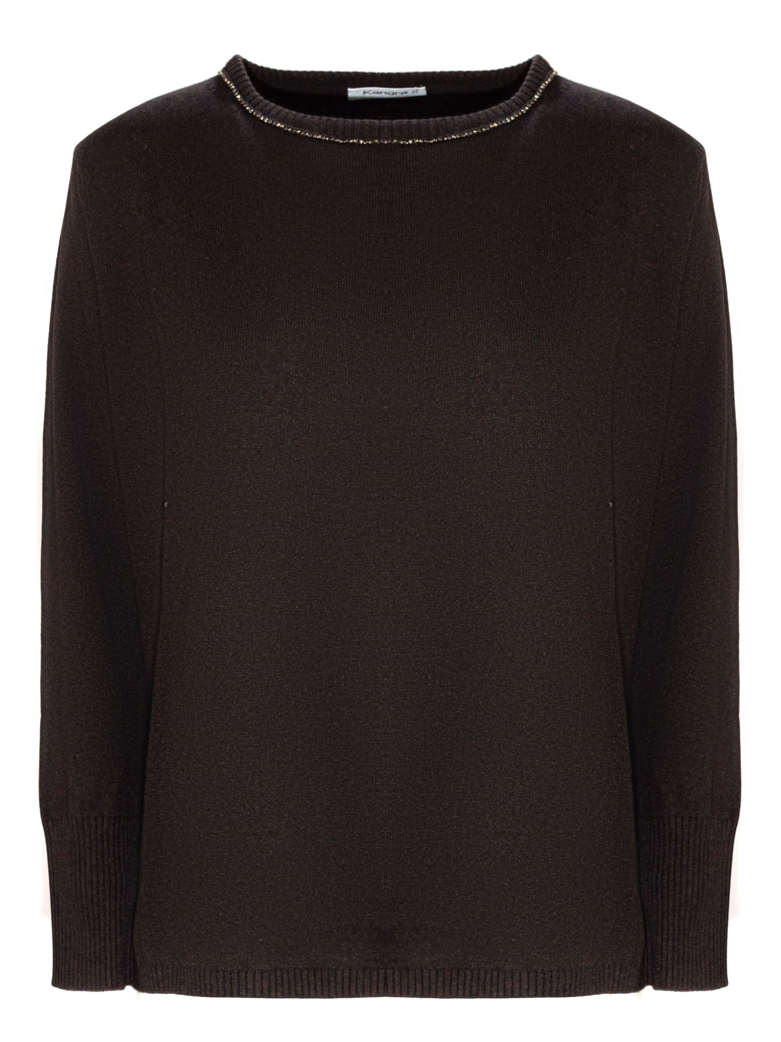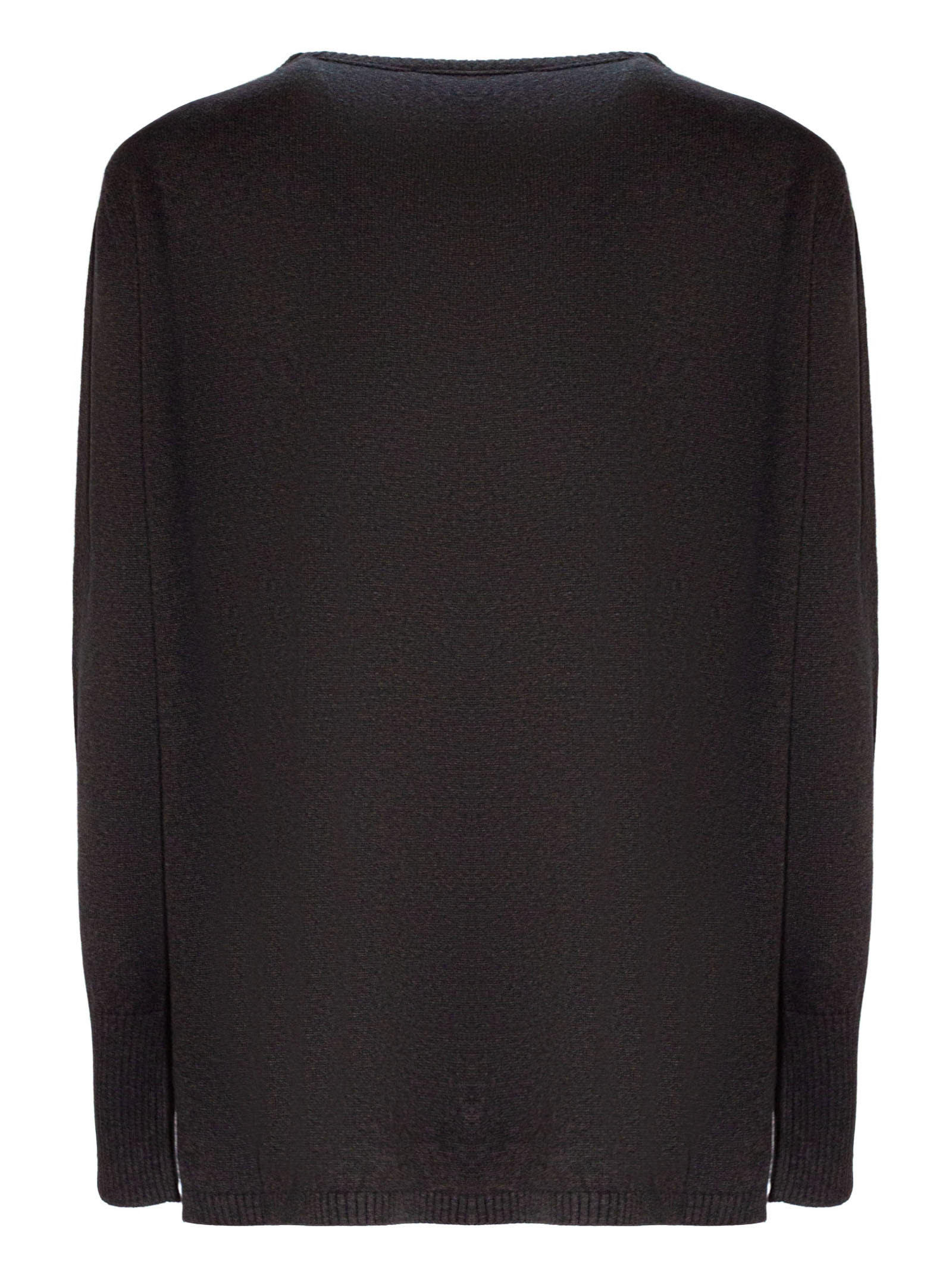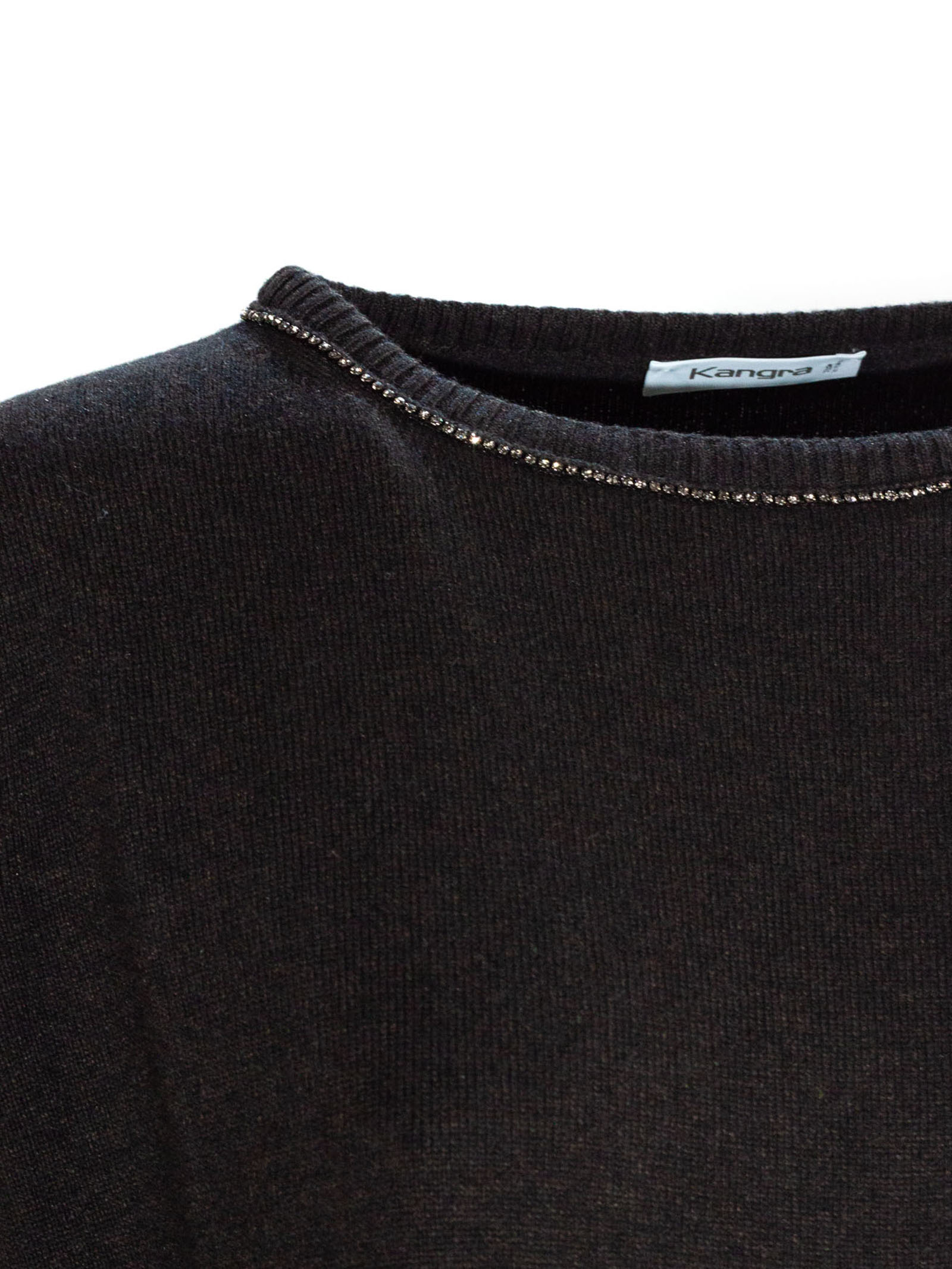 Fine gauge 12 stockinette sweater with side slits, featuring a clean, essential line. The boat neckline is embellished with refined trimmings and decorative stonesa luminous detail that adds a sophisticated, feminine touch, perfect for enhancing even the most minimal outfits