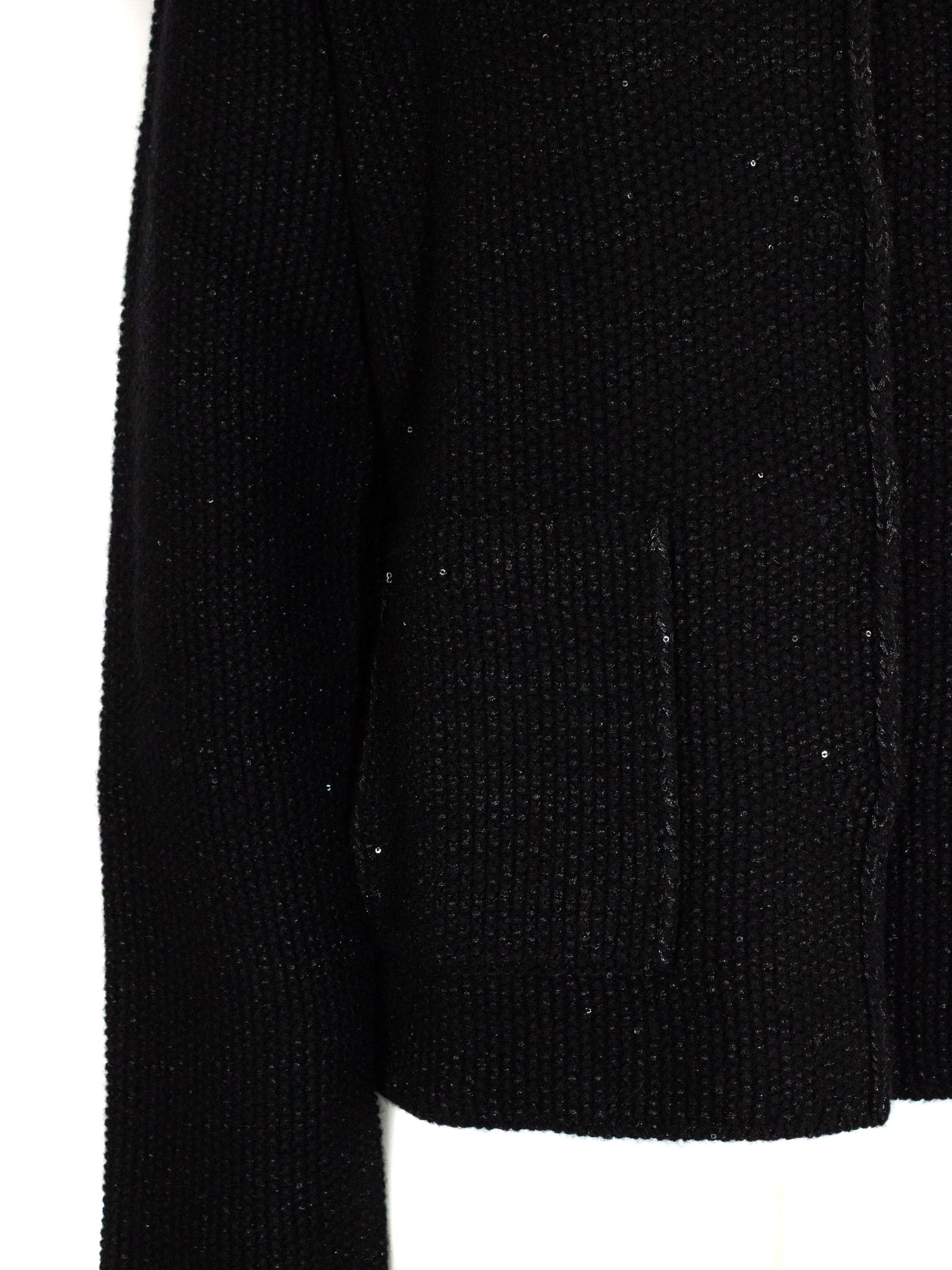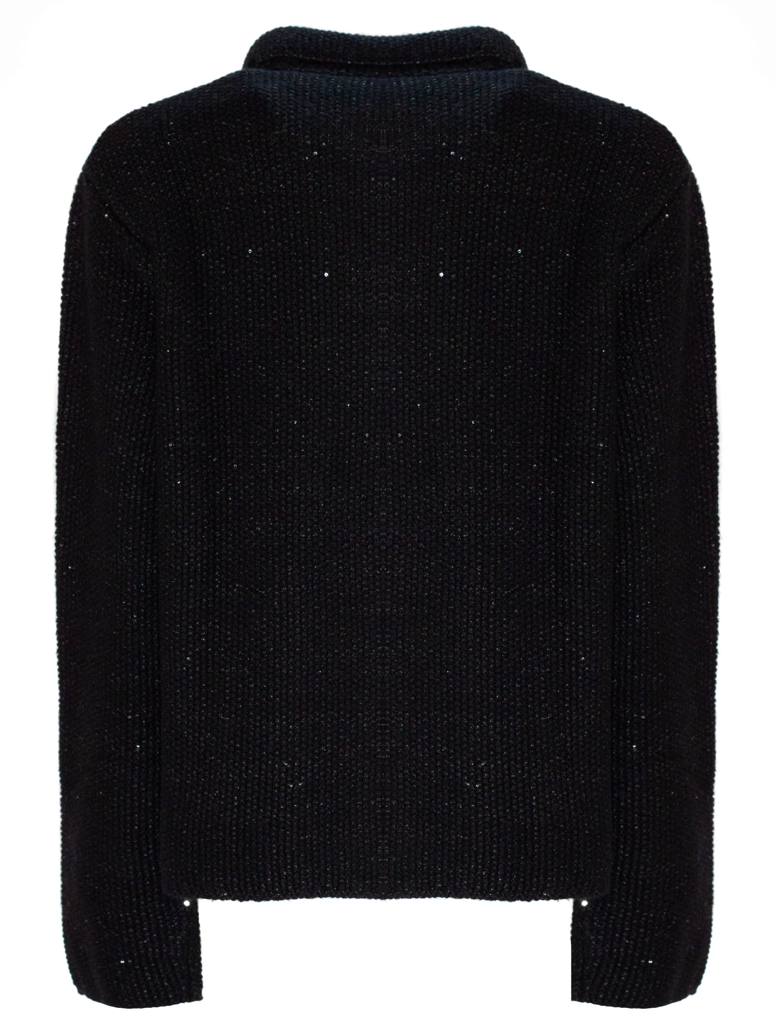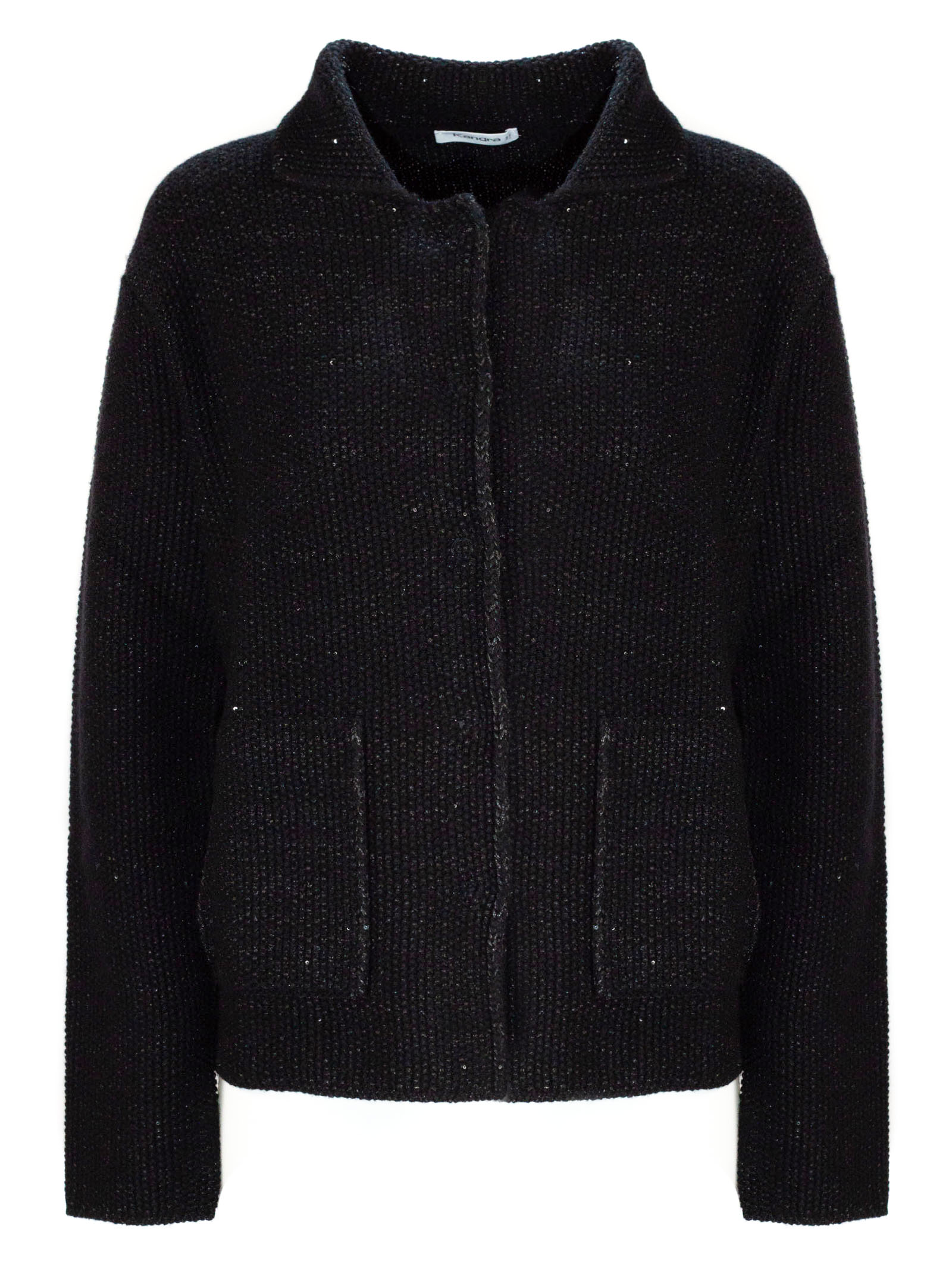 Shirt-collar jacket in seed stitch, fine gauge 5, crafted from warm wool yarn enriched with micro-sequins that give the garment a subtle, elegant shine. Featuring side-entry pockets and tone-on-tone snap button closure