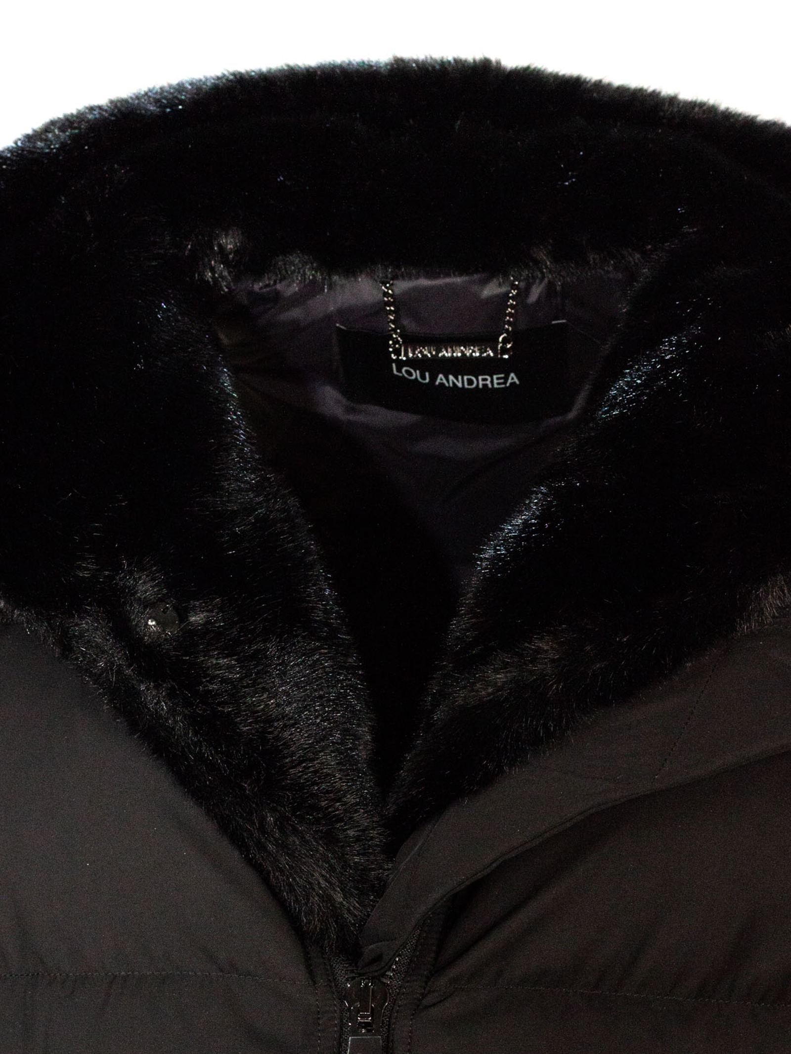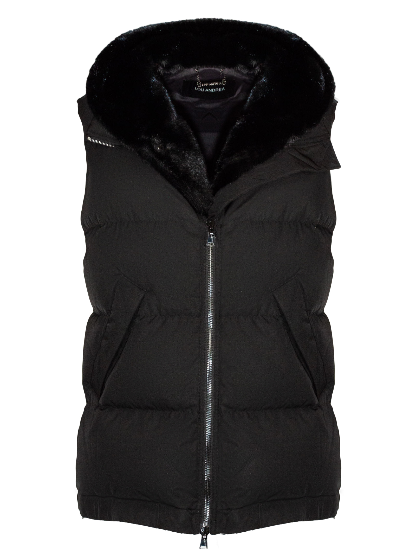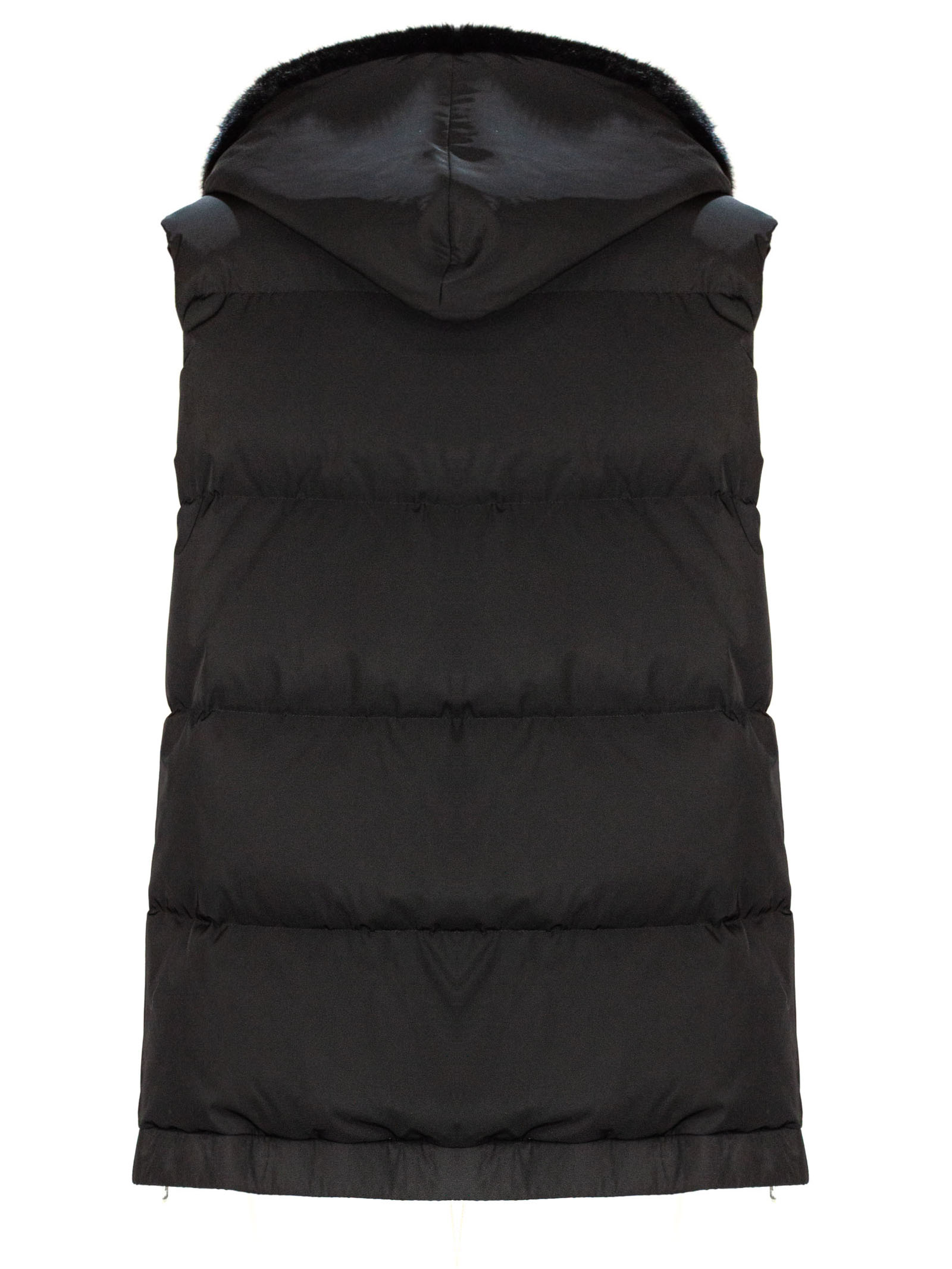 Black nylon sleeveless jacket with goose down lining, faux fur hood, side pockets, double-slider zip fastening