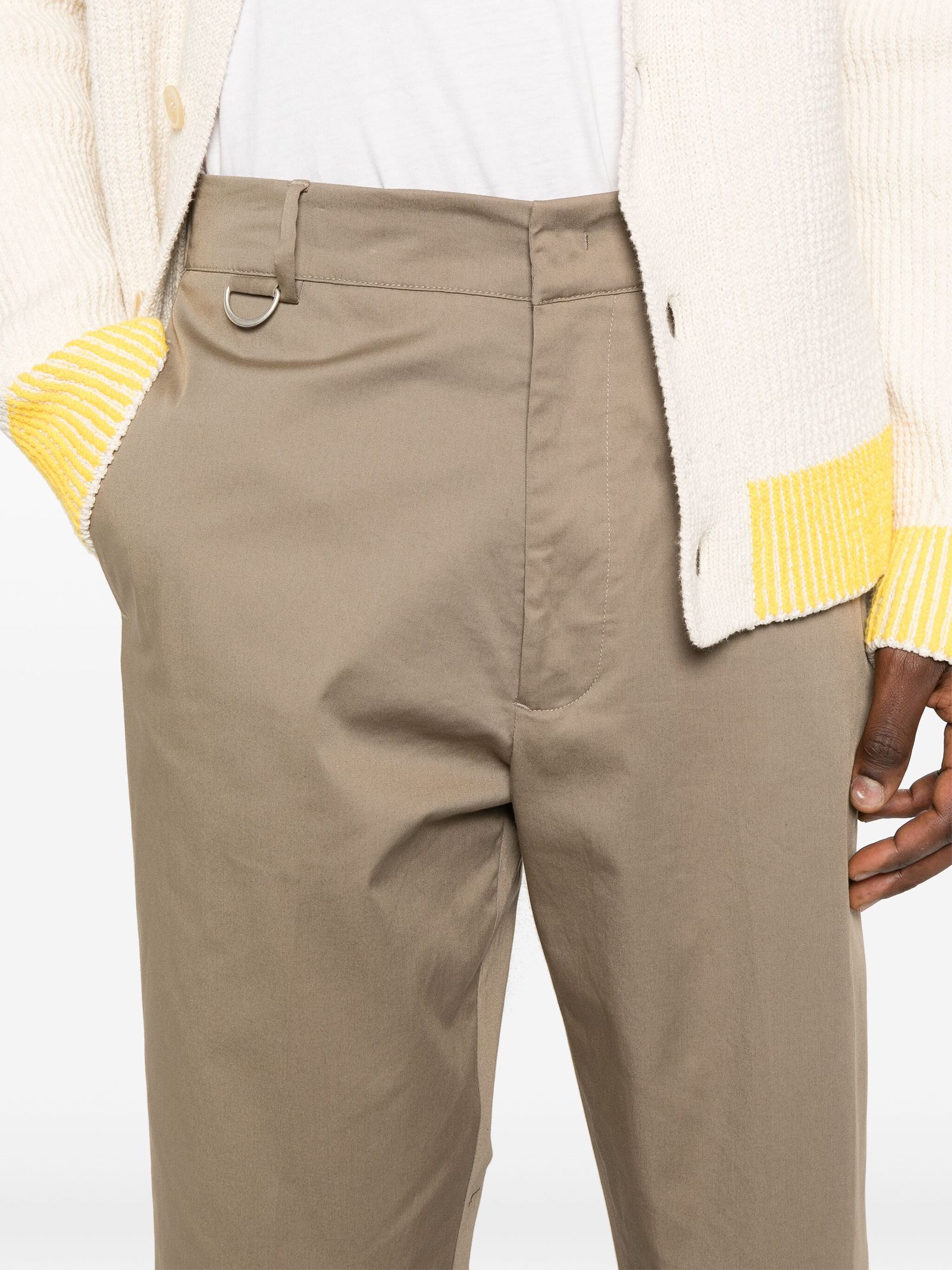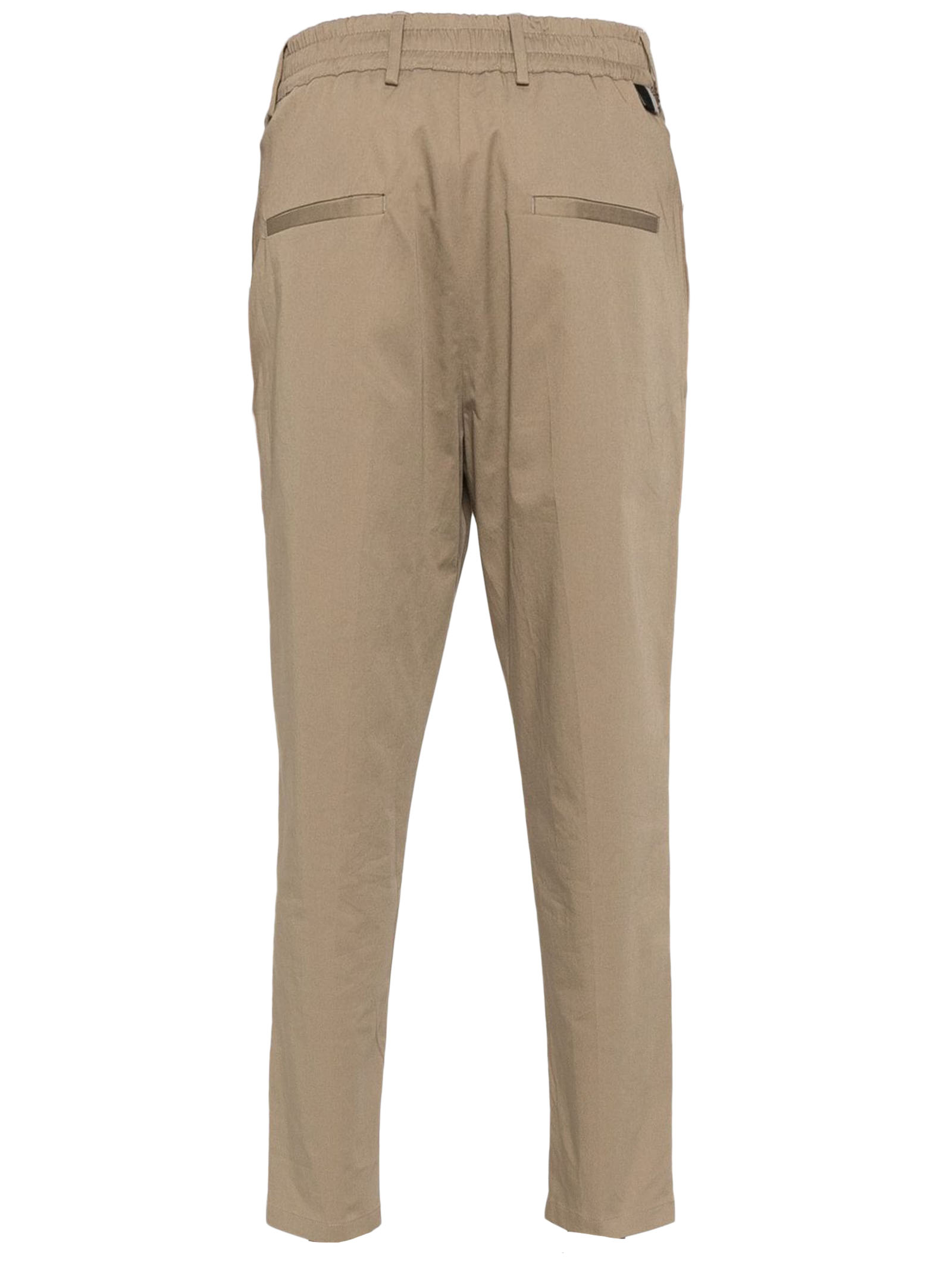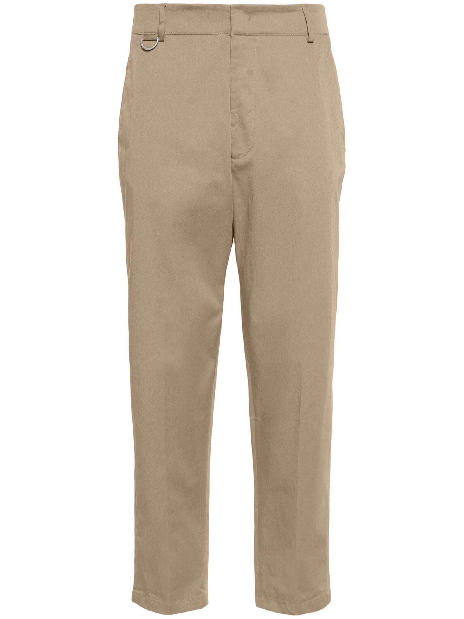 Beige cotton blend trousers, stretch-design, twill weave, pleat detailing, pressed crease, belt loops, two diagonal pockets to the sides, two rear flap pockets, turn-up cuffs, concealed front button, hook and zip fastening
