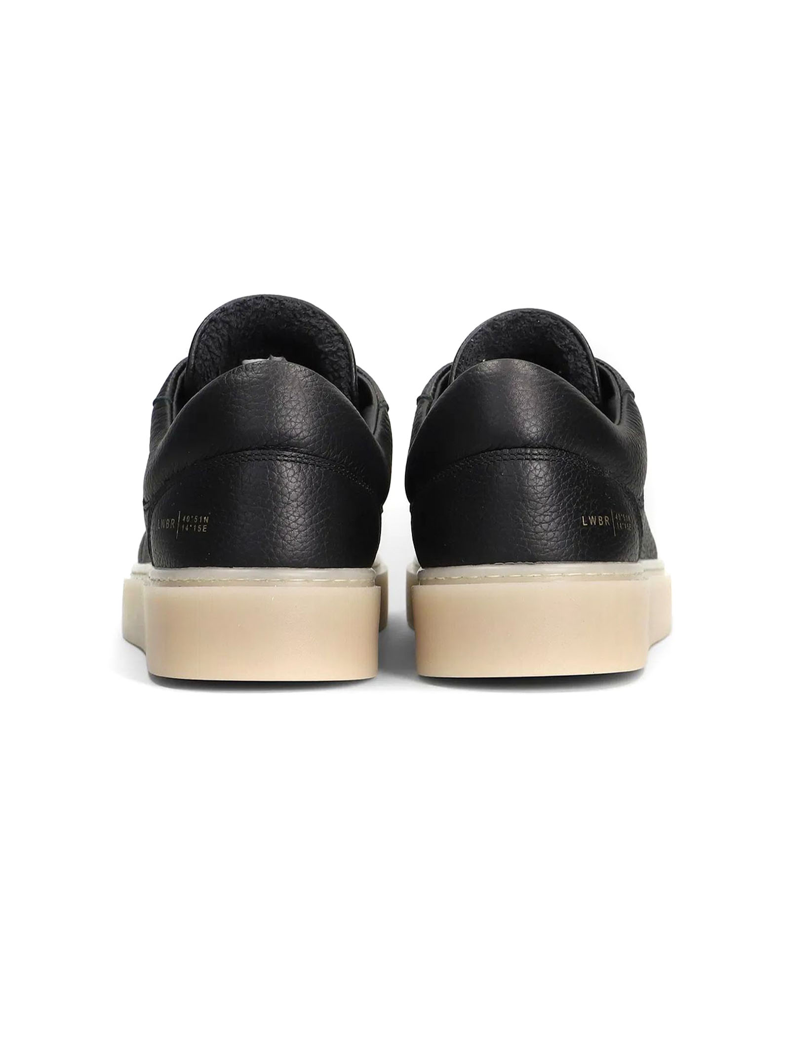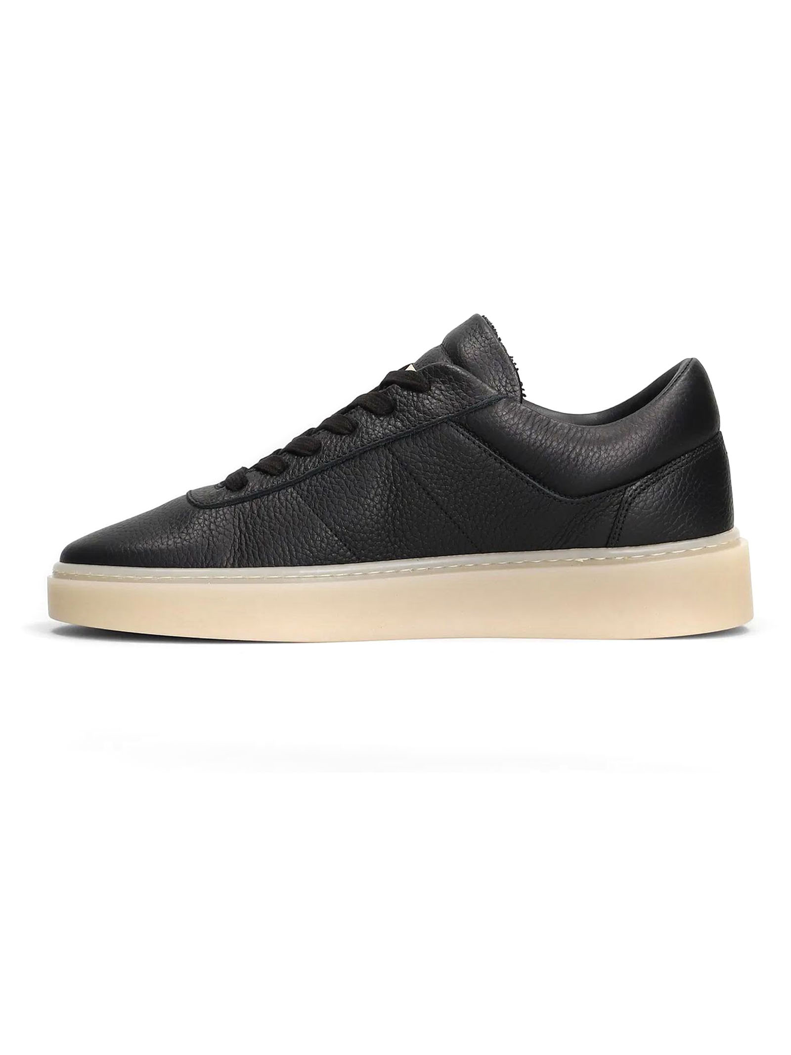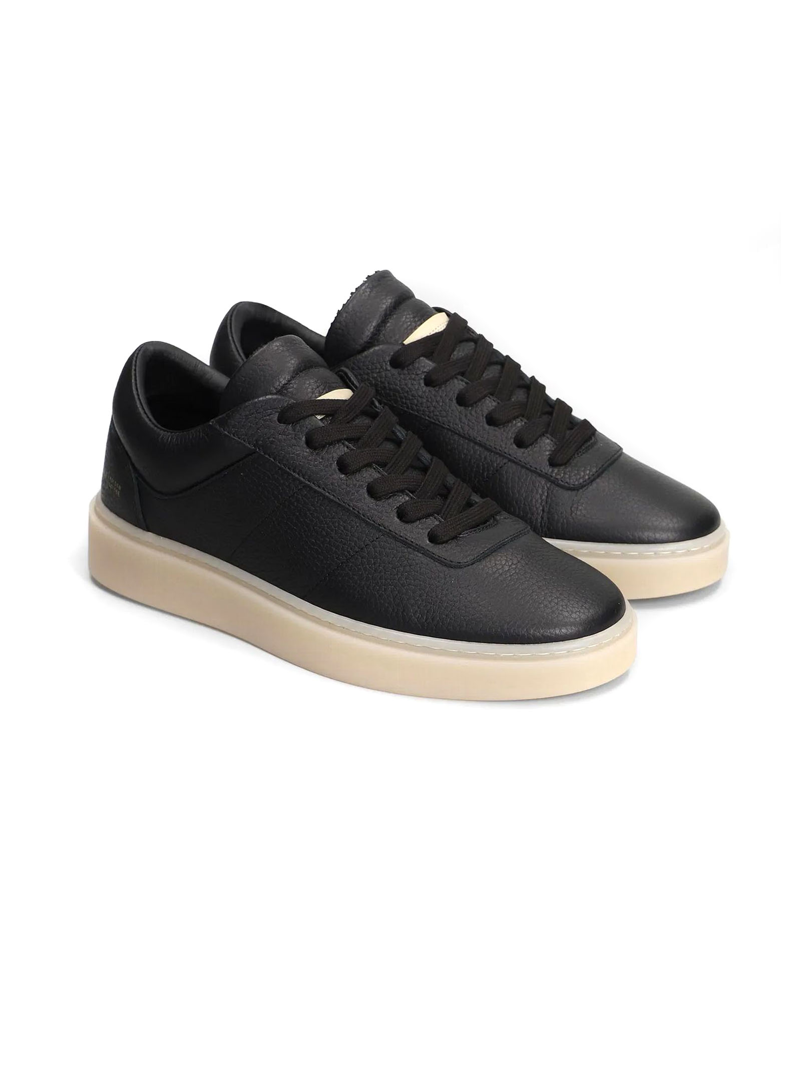 Black leather sneakers with lace-up fastening, round toe, flat rubber sole