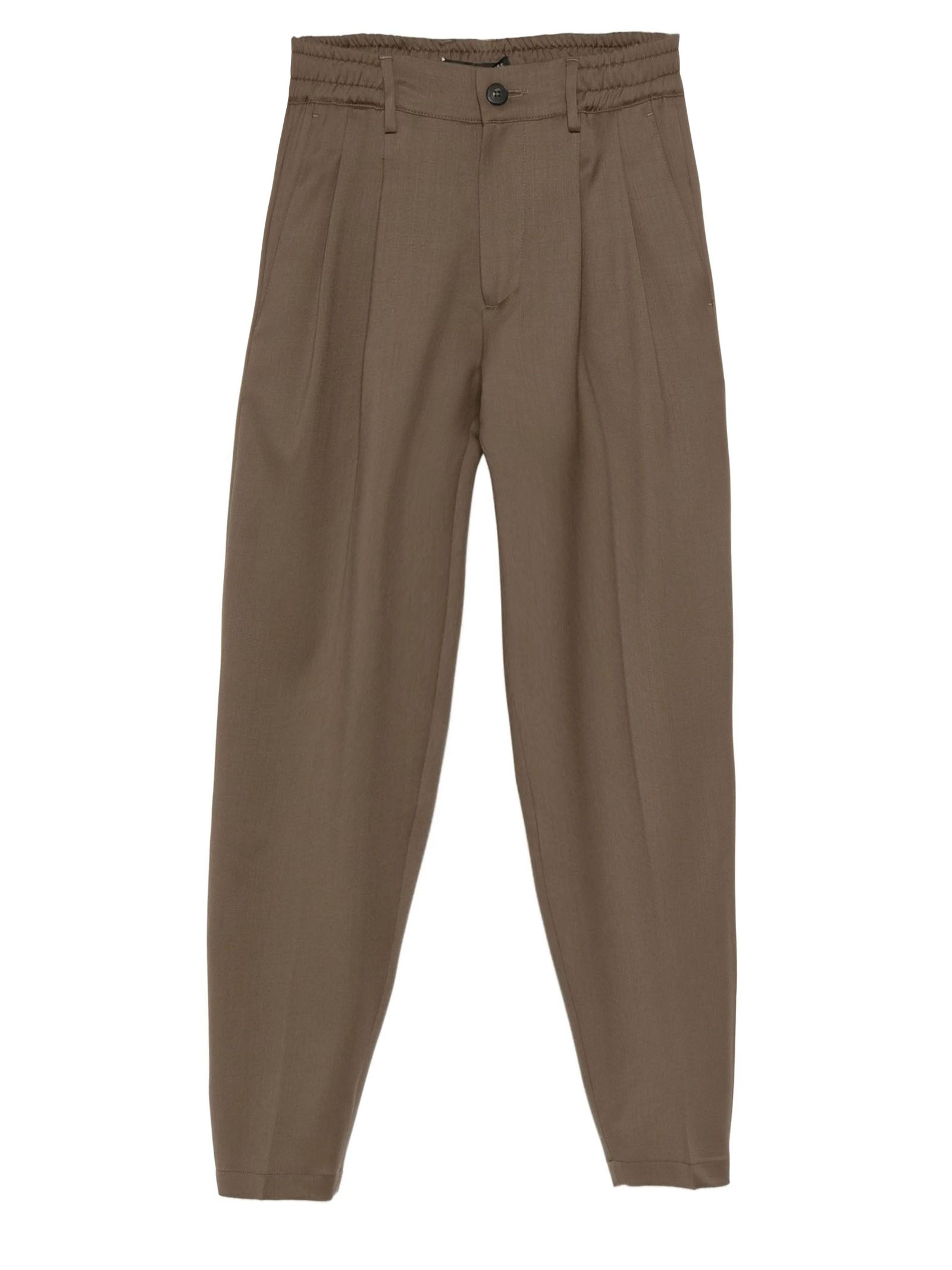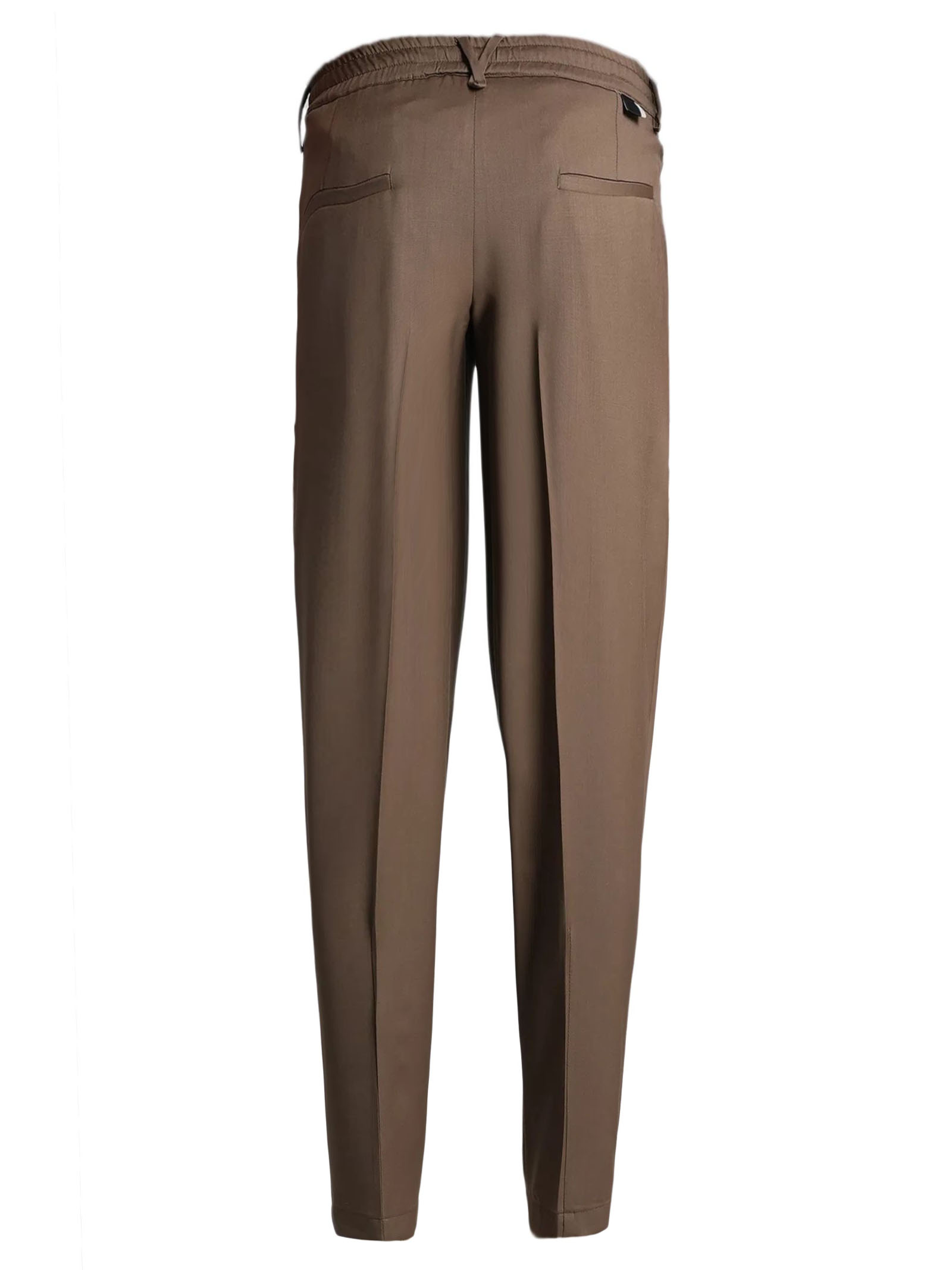 Camel brown wool blend trousers, pleated front, elasticated waistband, button fly, cropped length