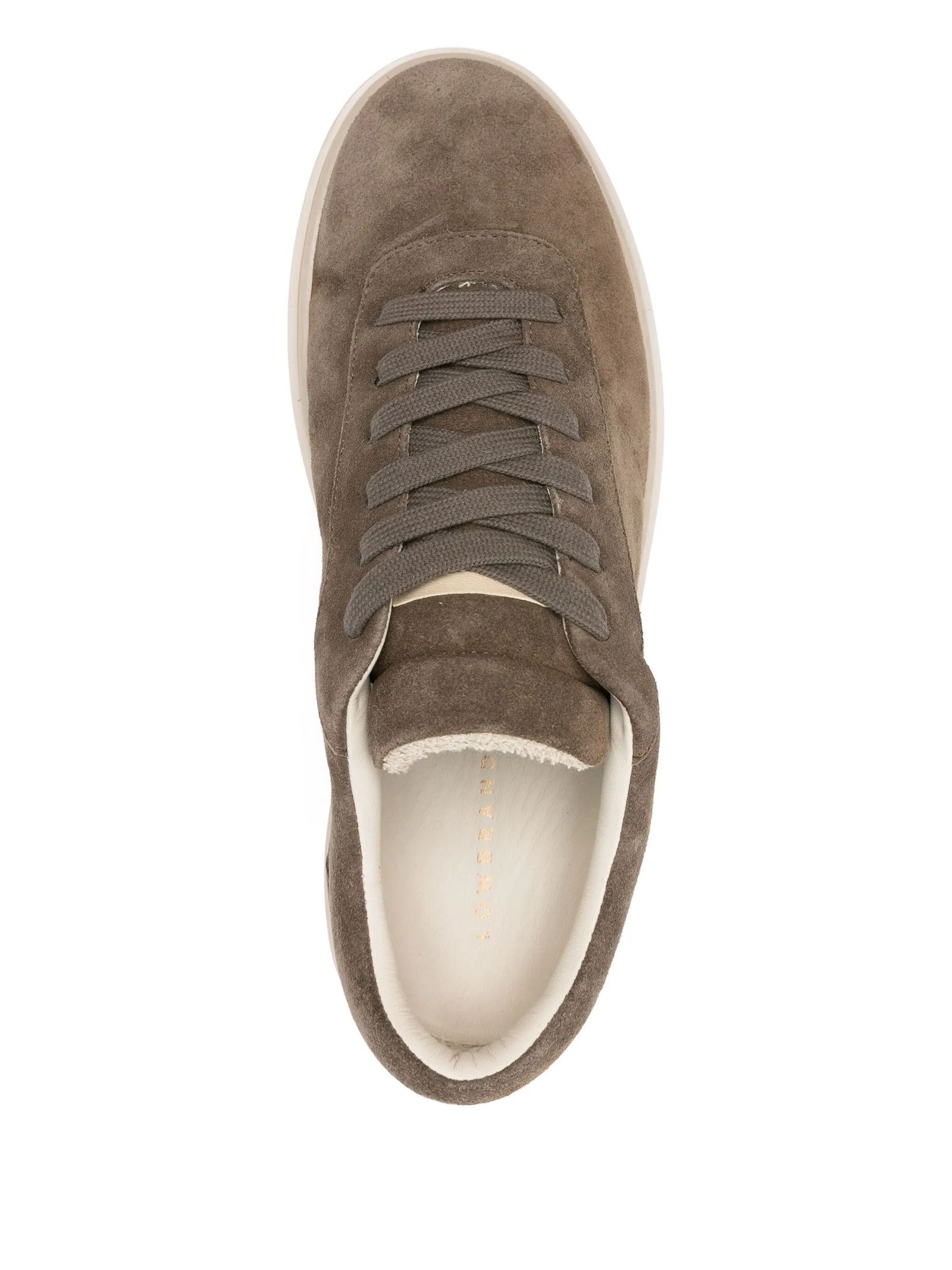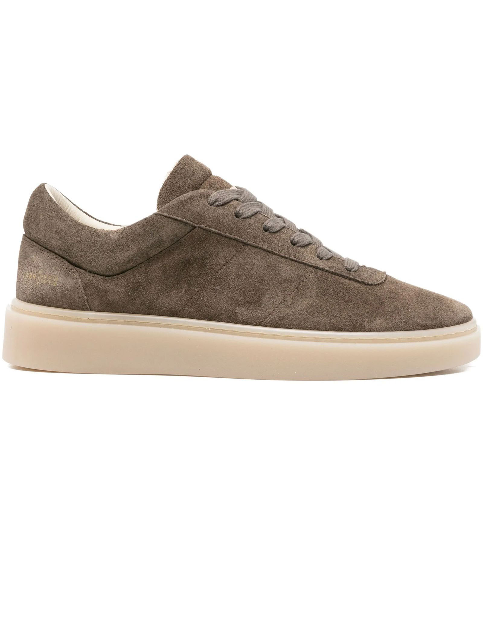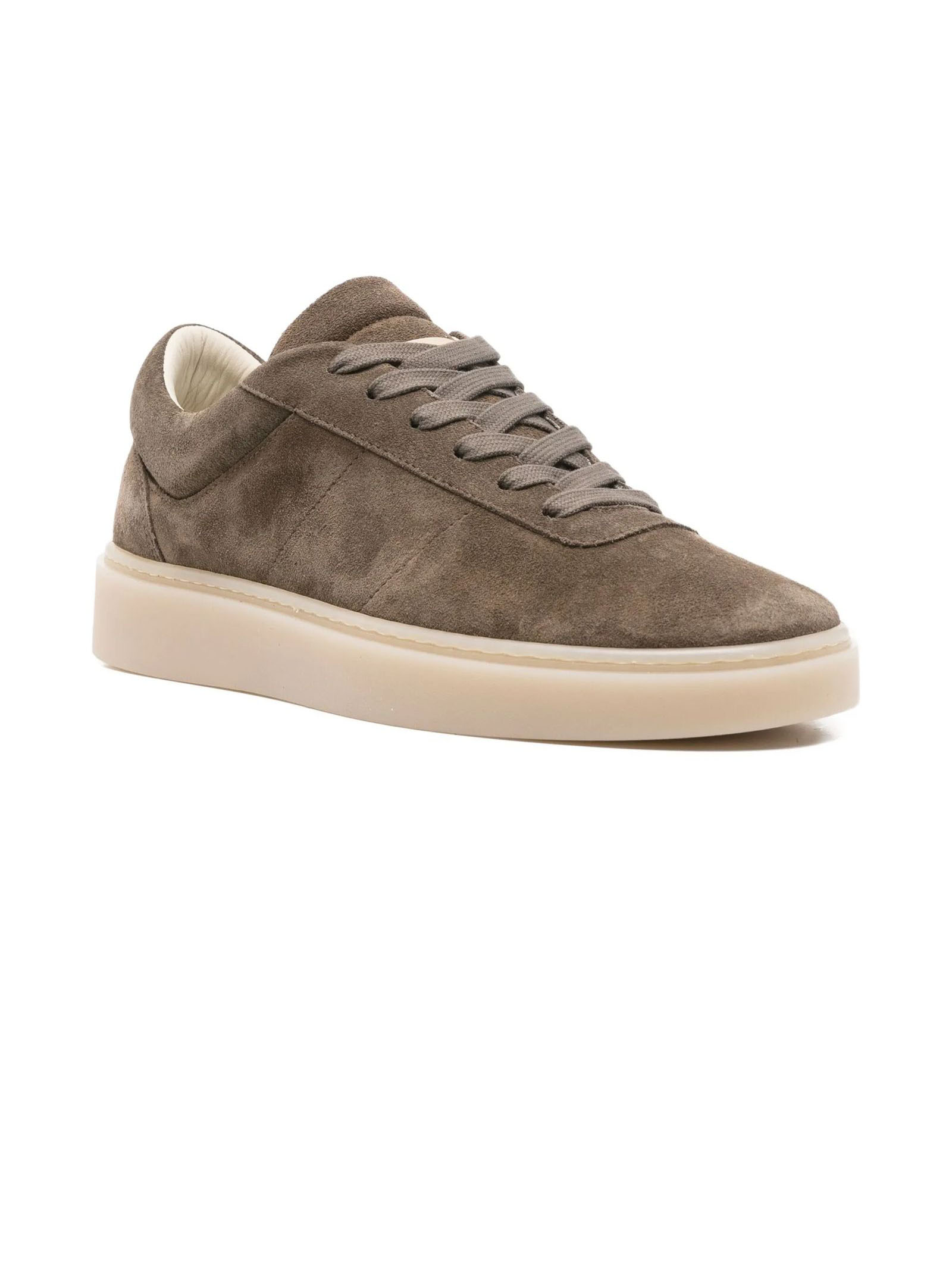 Light brown suede lace-up sneakers, lace-up fastening, round toe, flat rubber sole