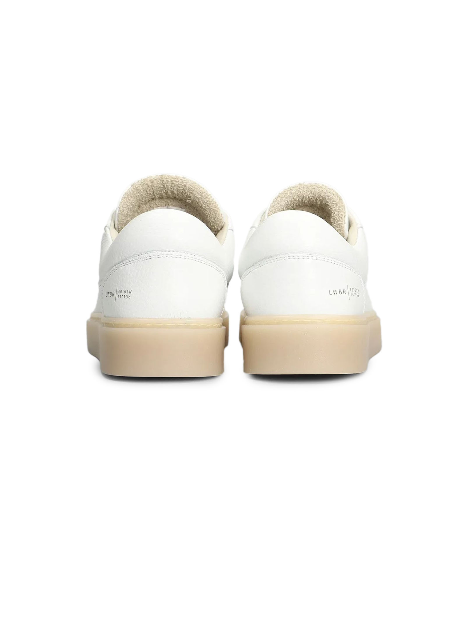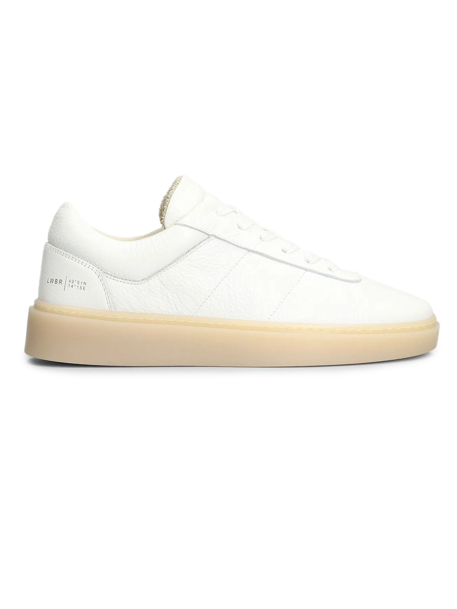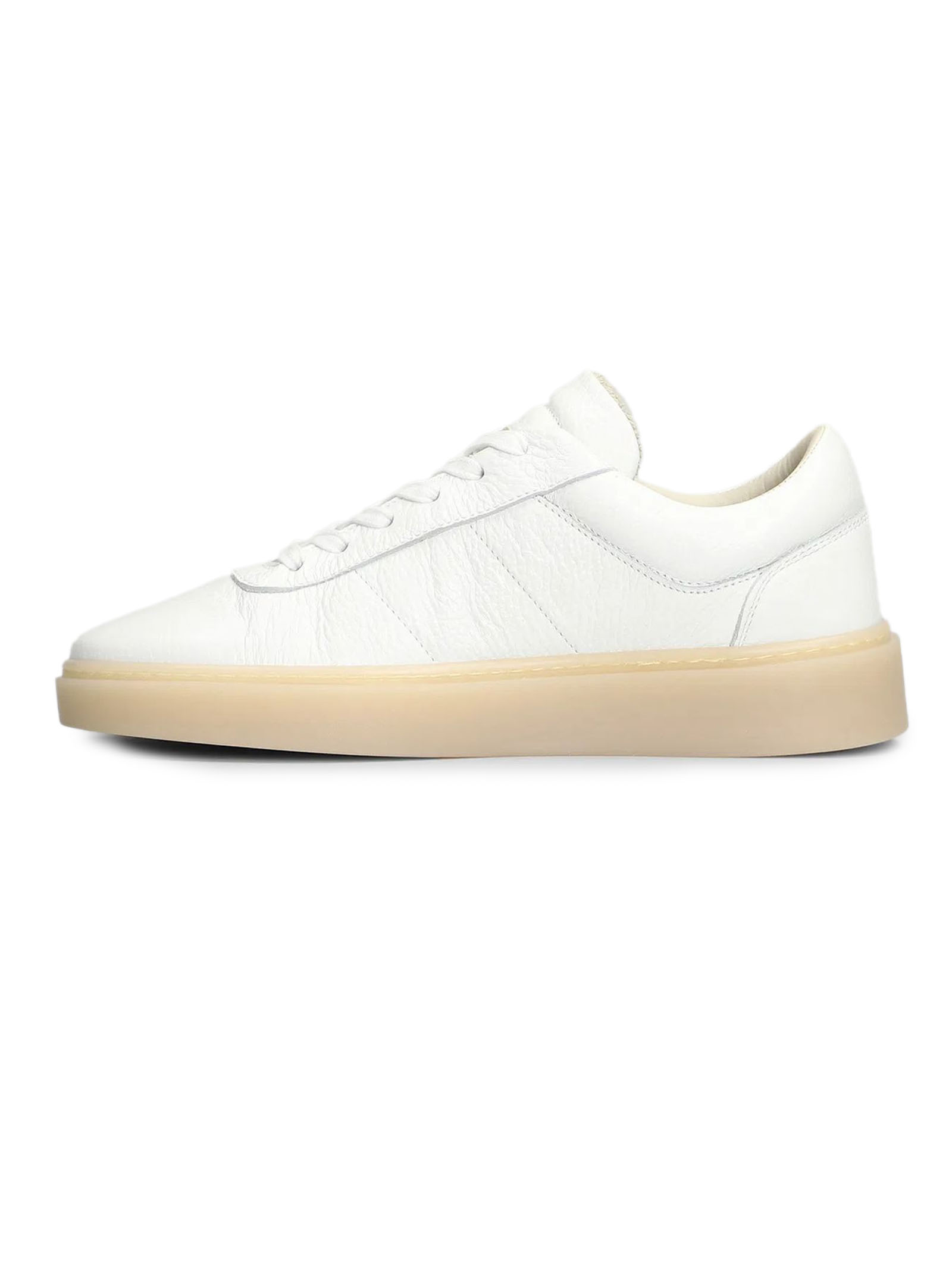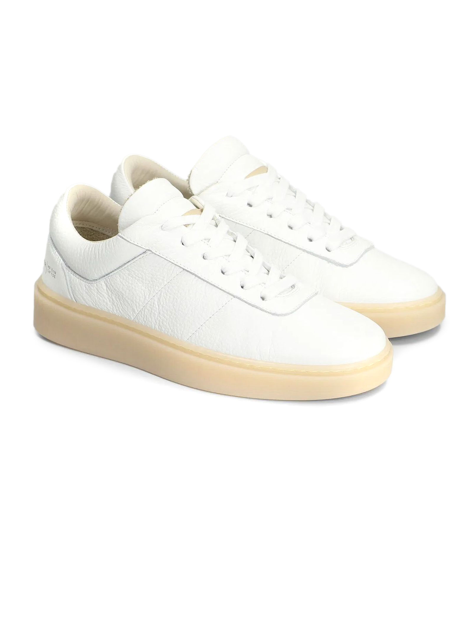 White leather sneakers with lace-up fastening, round toe, flat rubber sole