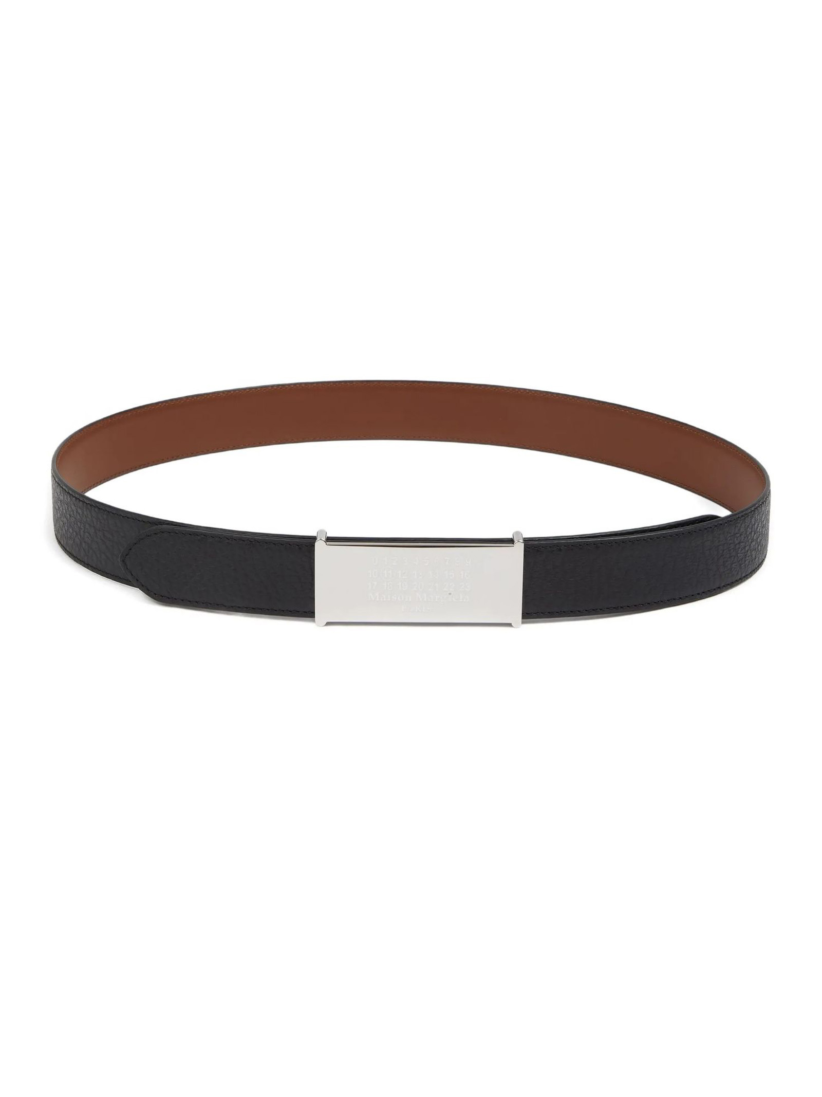 Black leather belt, silver-tone plaque buckle, logo engraving, adjustable fit