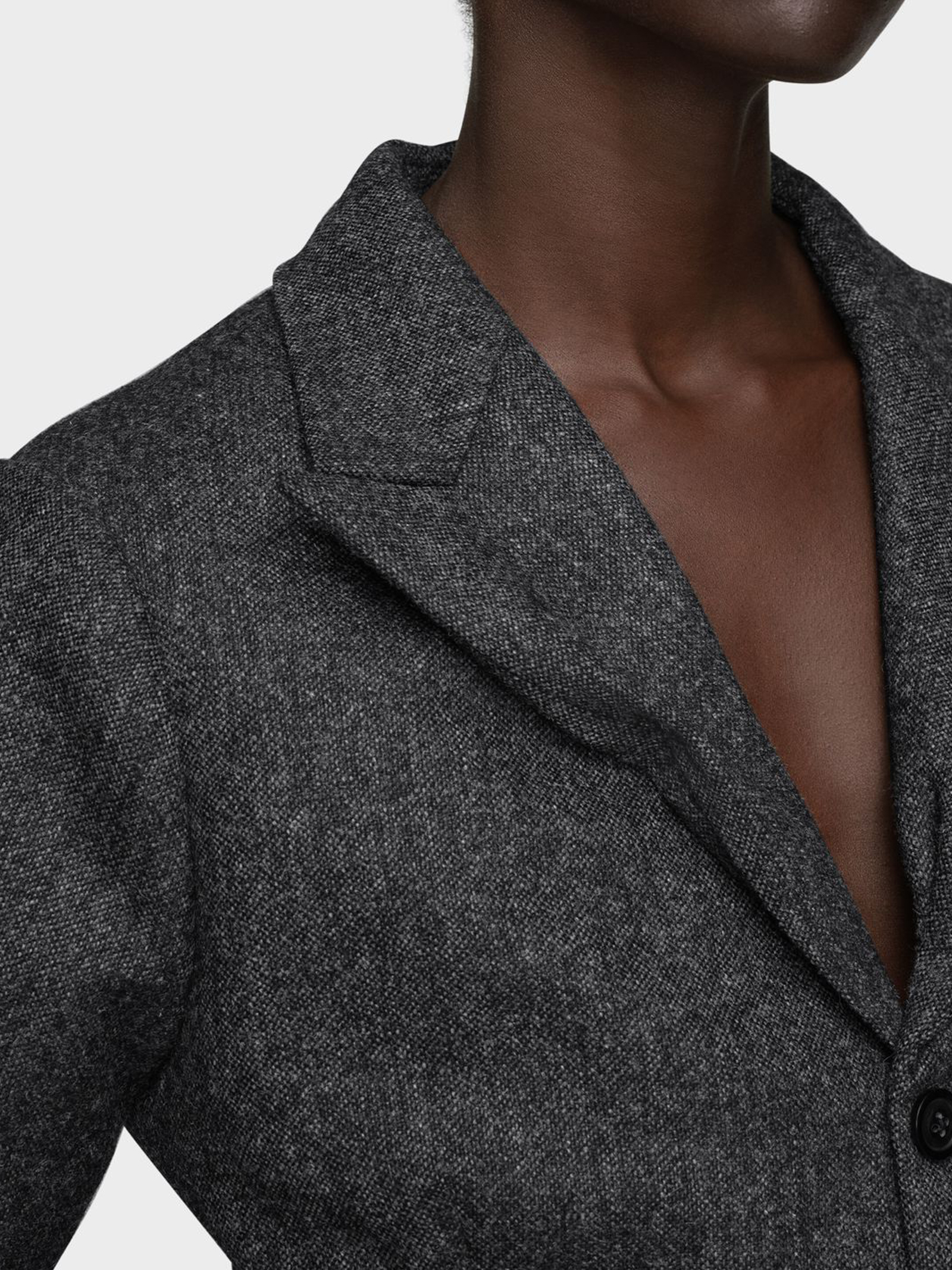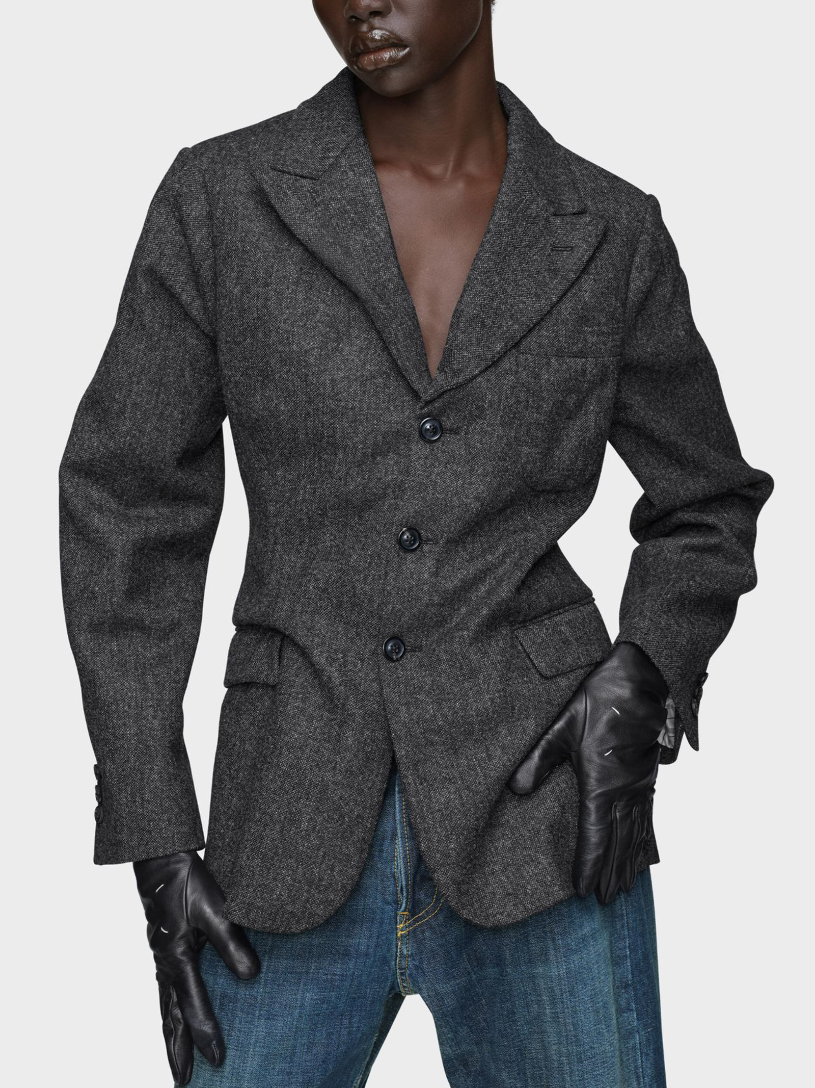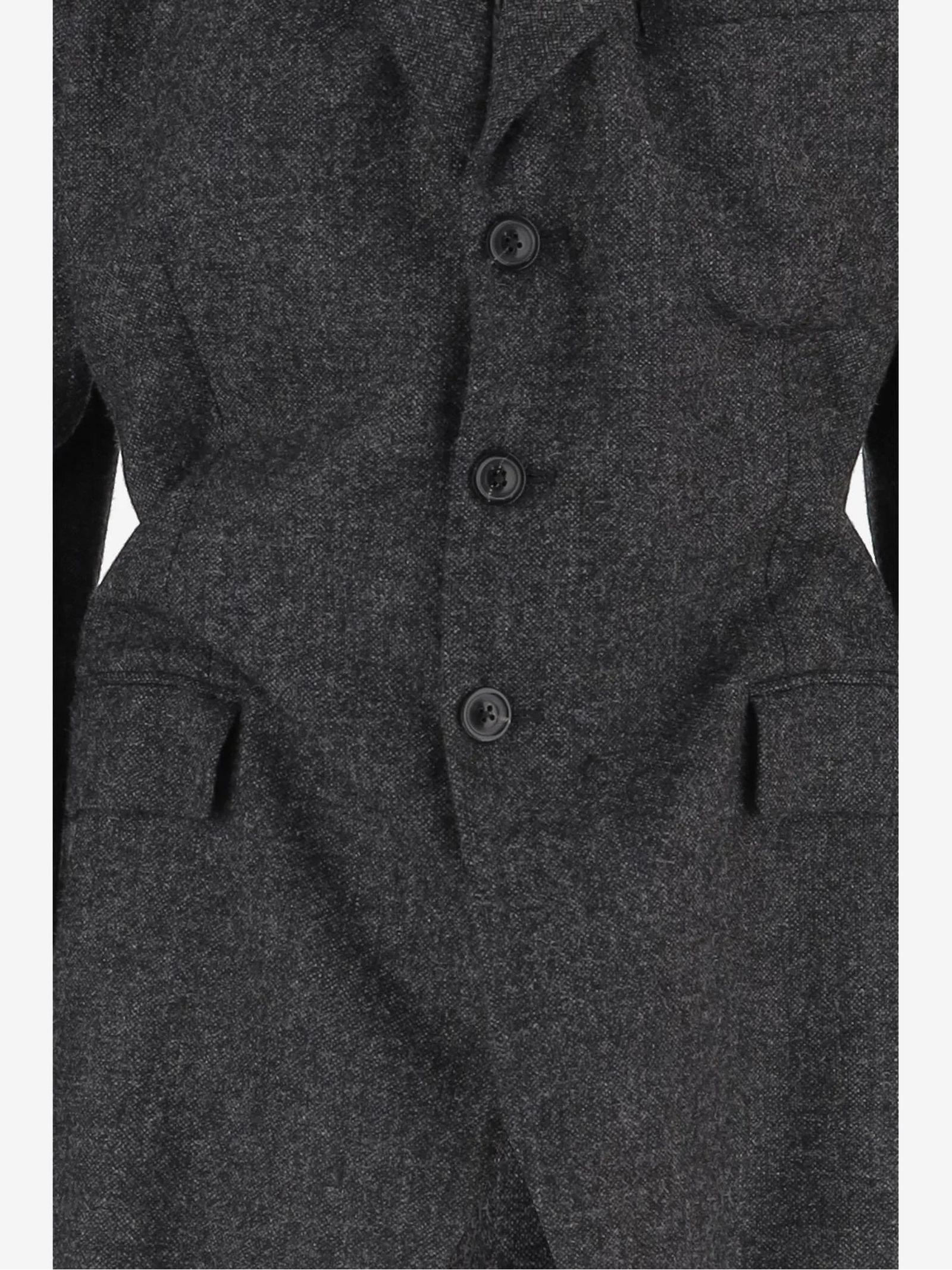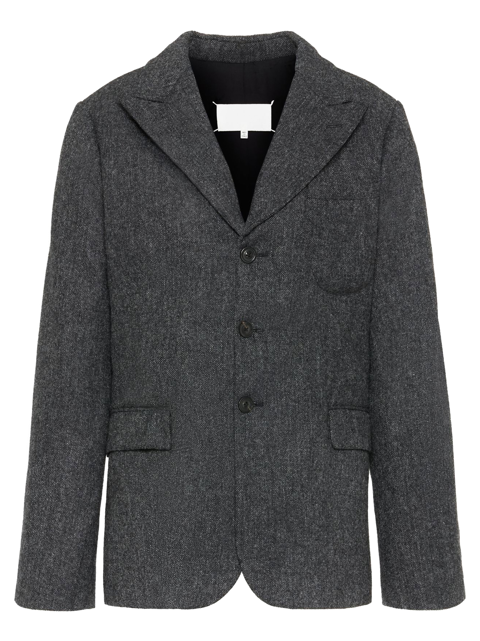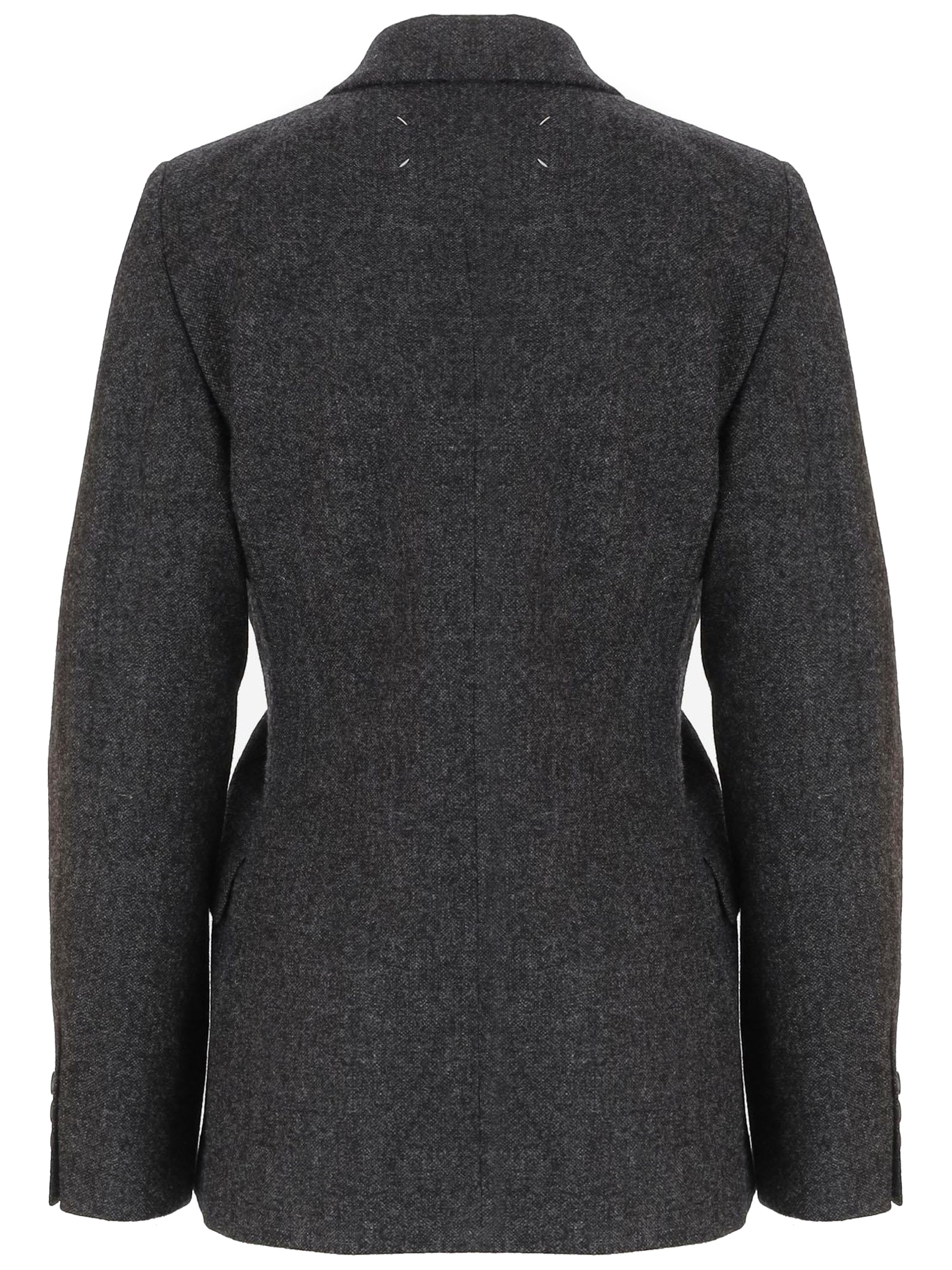 Jacket made of grey wool using the Maison's Gestural Cutting technique, Peak lapel, Subtly distorted details, Long sleeves, Front button closure, One chest pocket, Two side pockets, Four stitches stand out on the back, Four stitches on the back