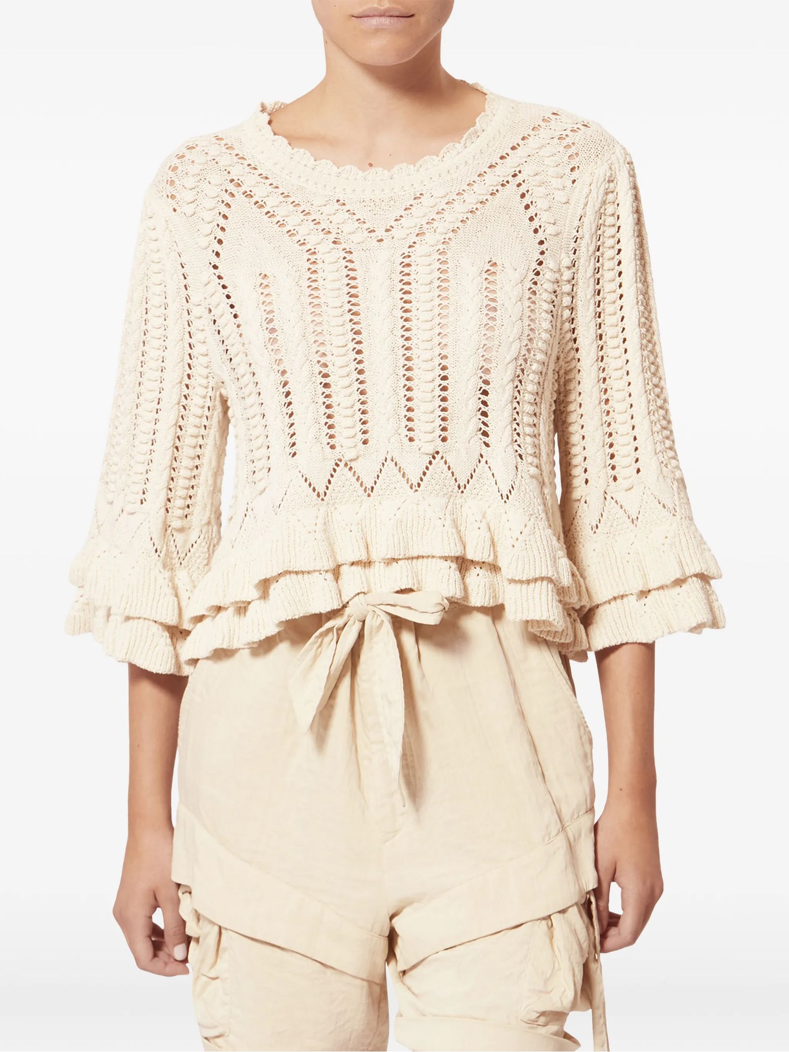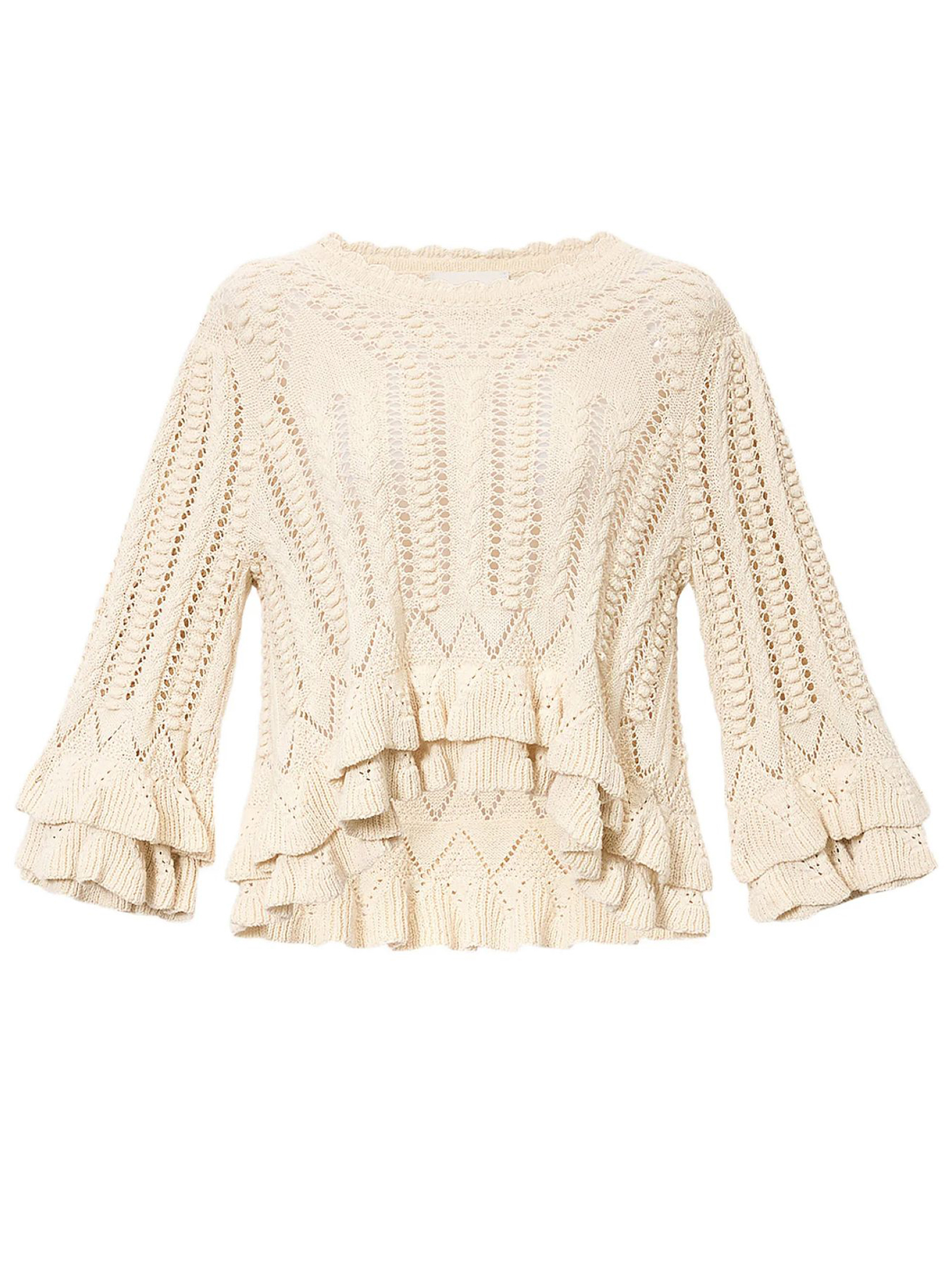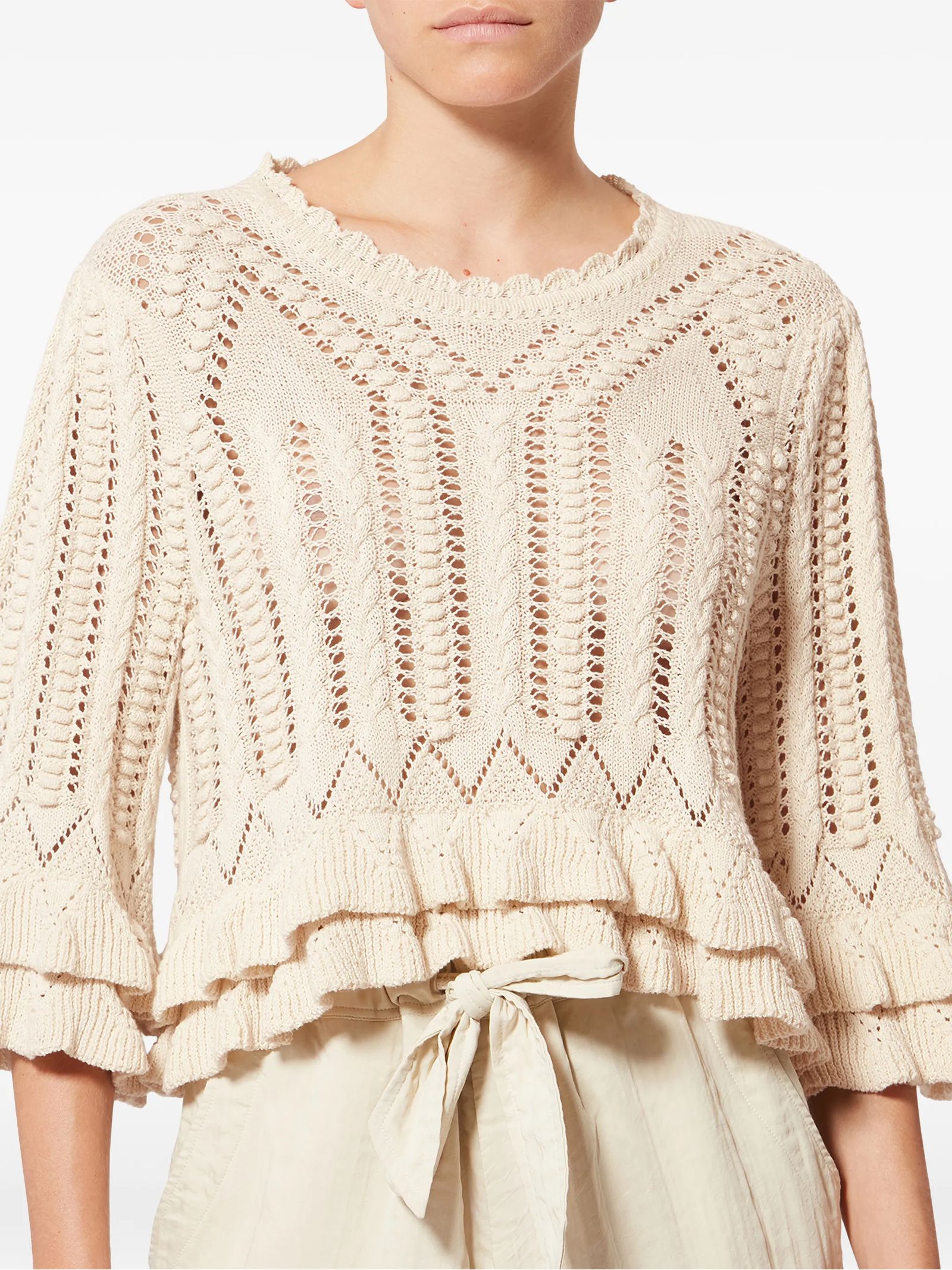 Frilly cotton knit sweater, Wide round neckline, 3/4 sleeves, Openwork detailing, Frilly cuffs and hem, Flared cut