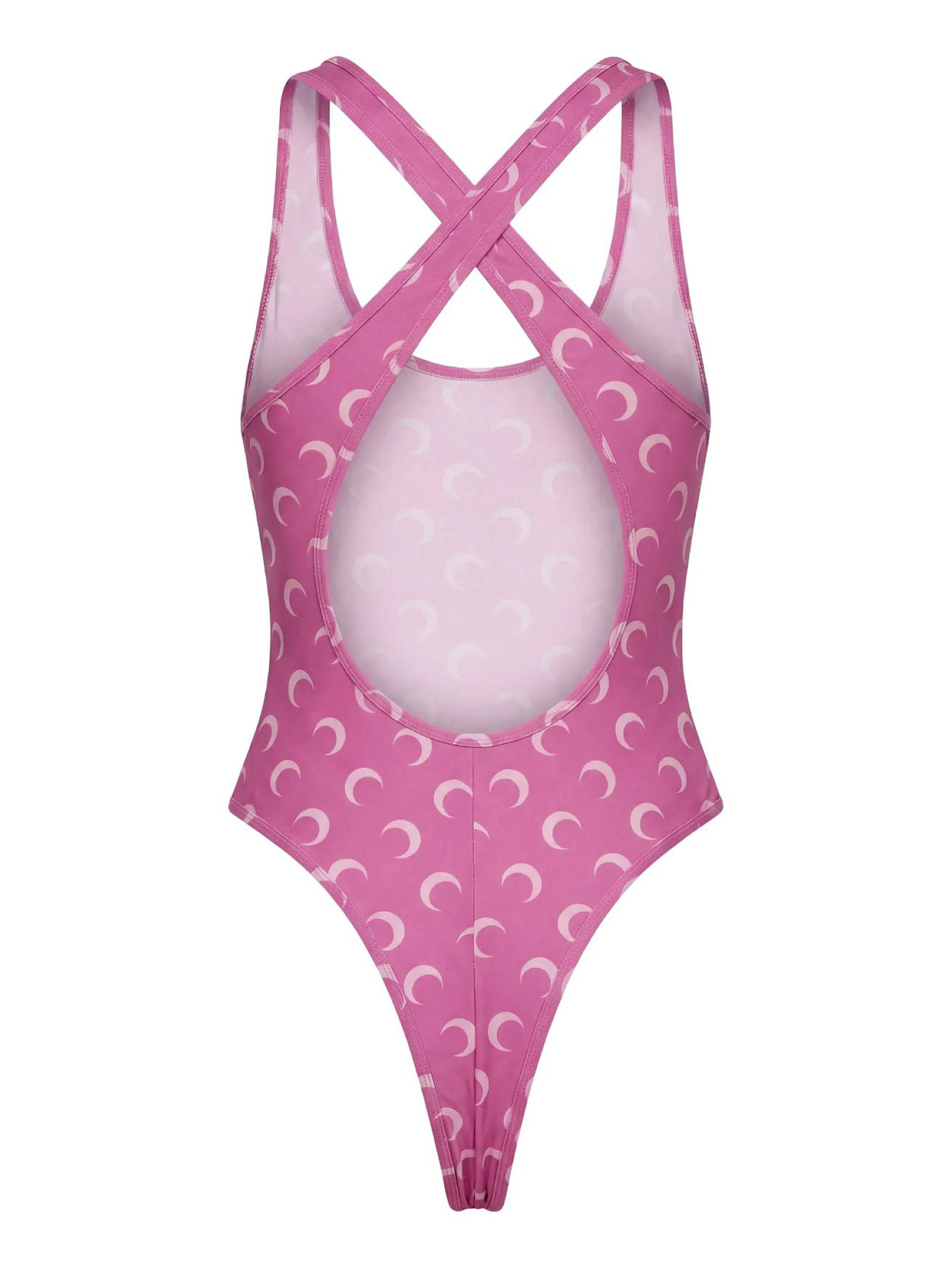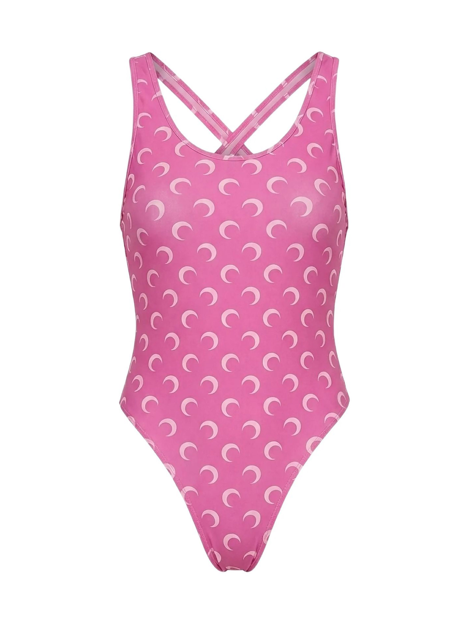 Second skin moon printed jersey one piece swimsuit with bralette design, High leg cut, Criss cross back, All over Moon print, Scoop neck, Stretch fabric