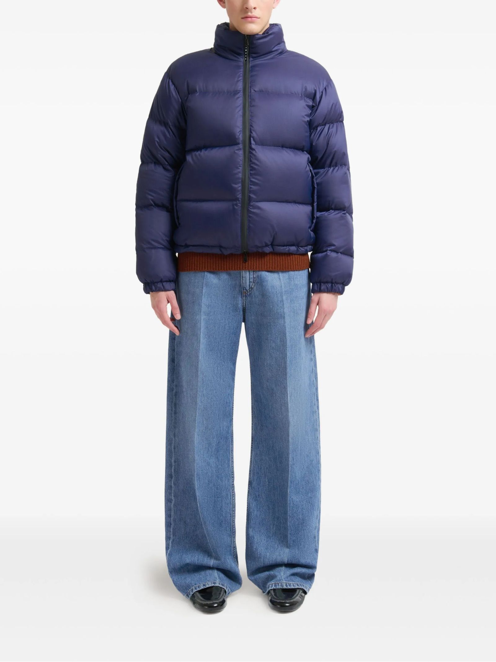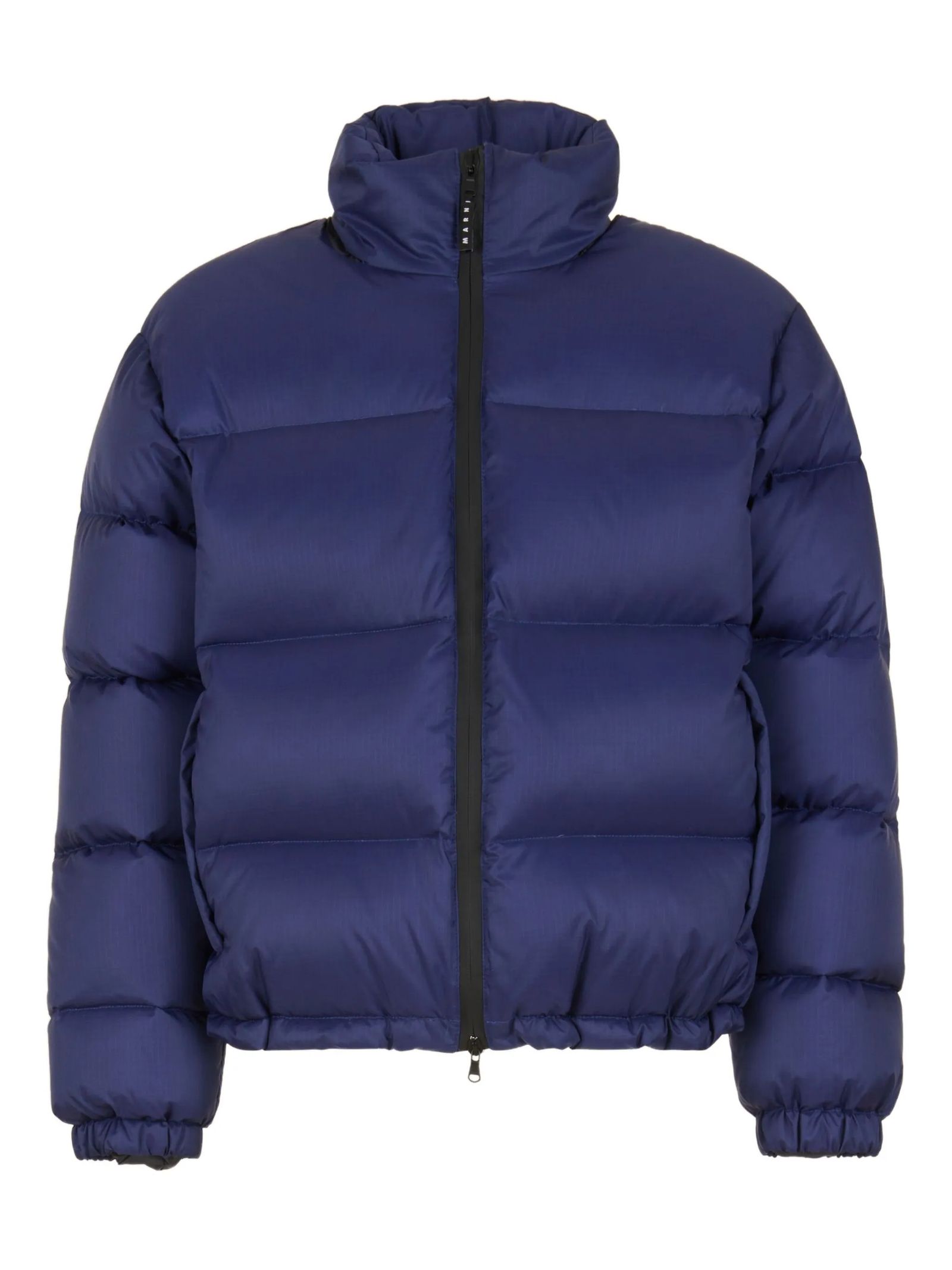 Quilted jacket made from ripstop nylon and padded with duck down. Regular fit with removable hood, zip fastening and drawstring hem. Two zip welt pockets. Contrast fabric back with Marni embroidery logo. Tag with Marni Mountain logo