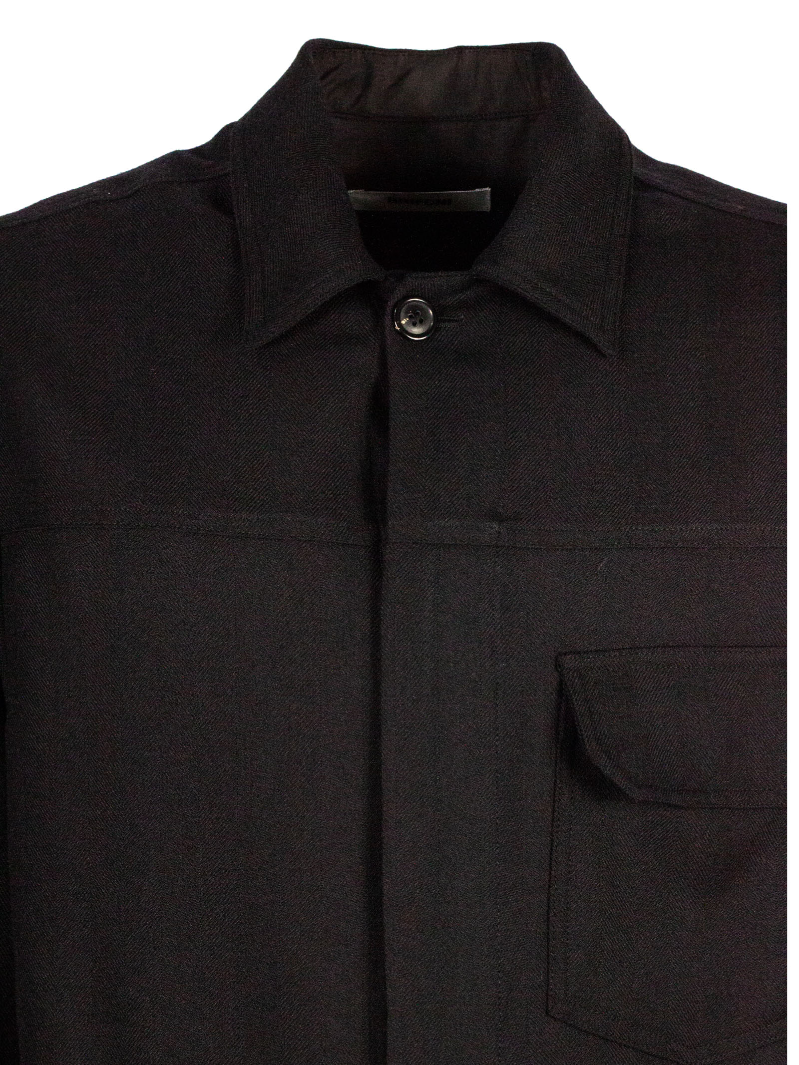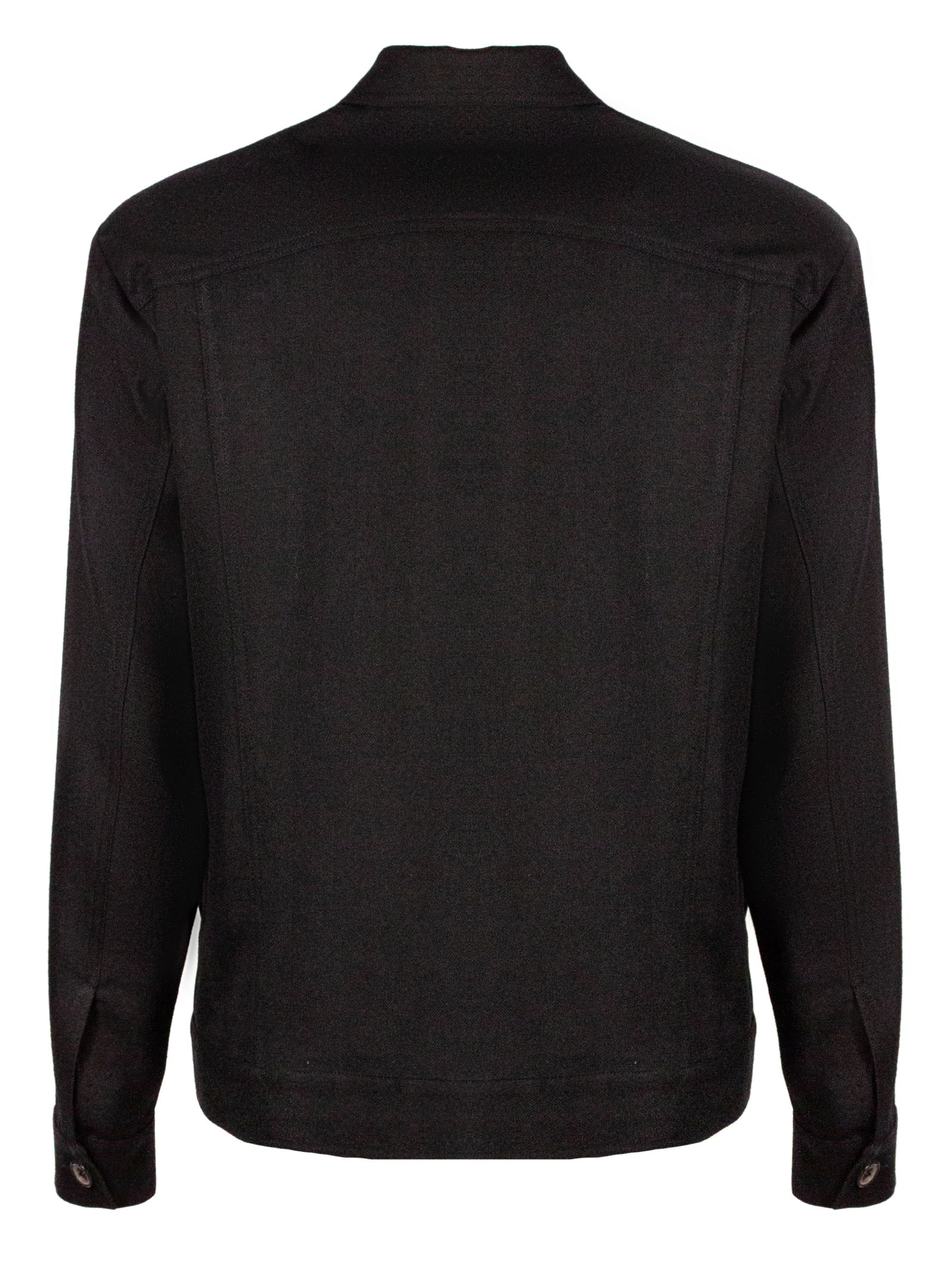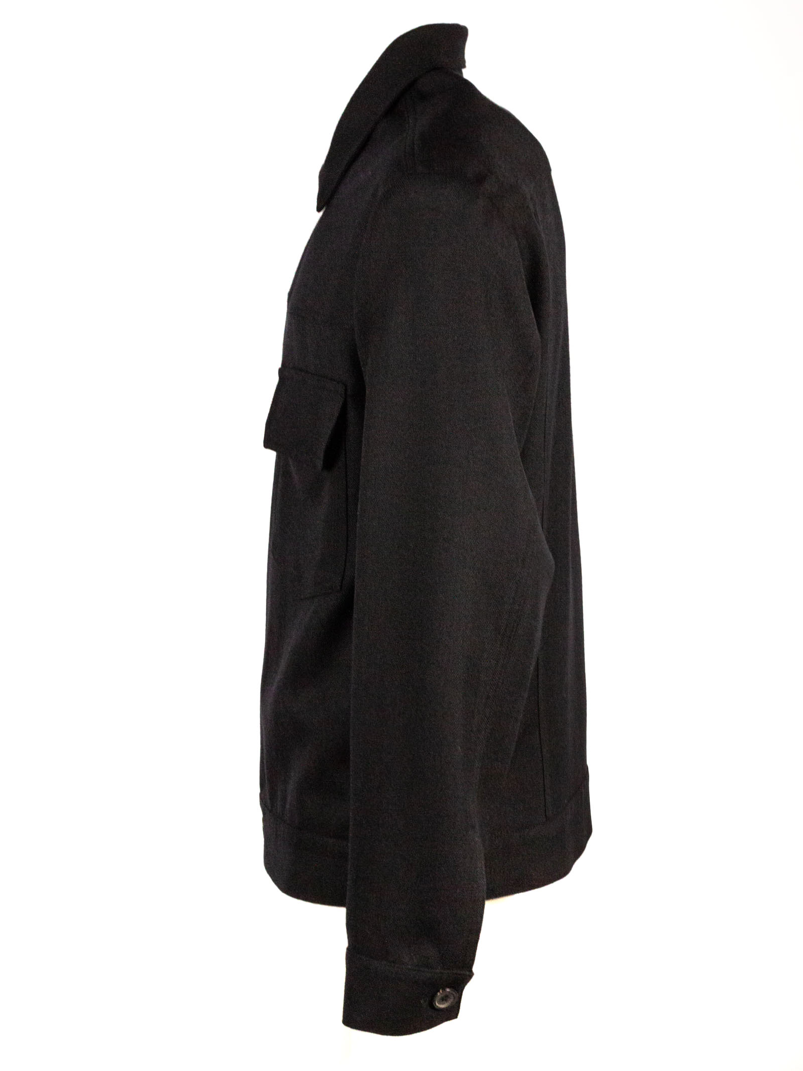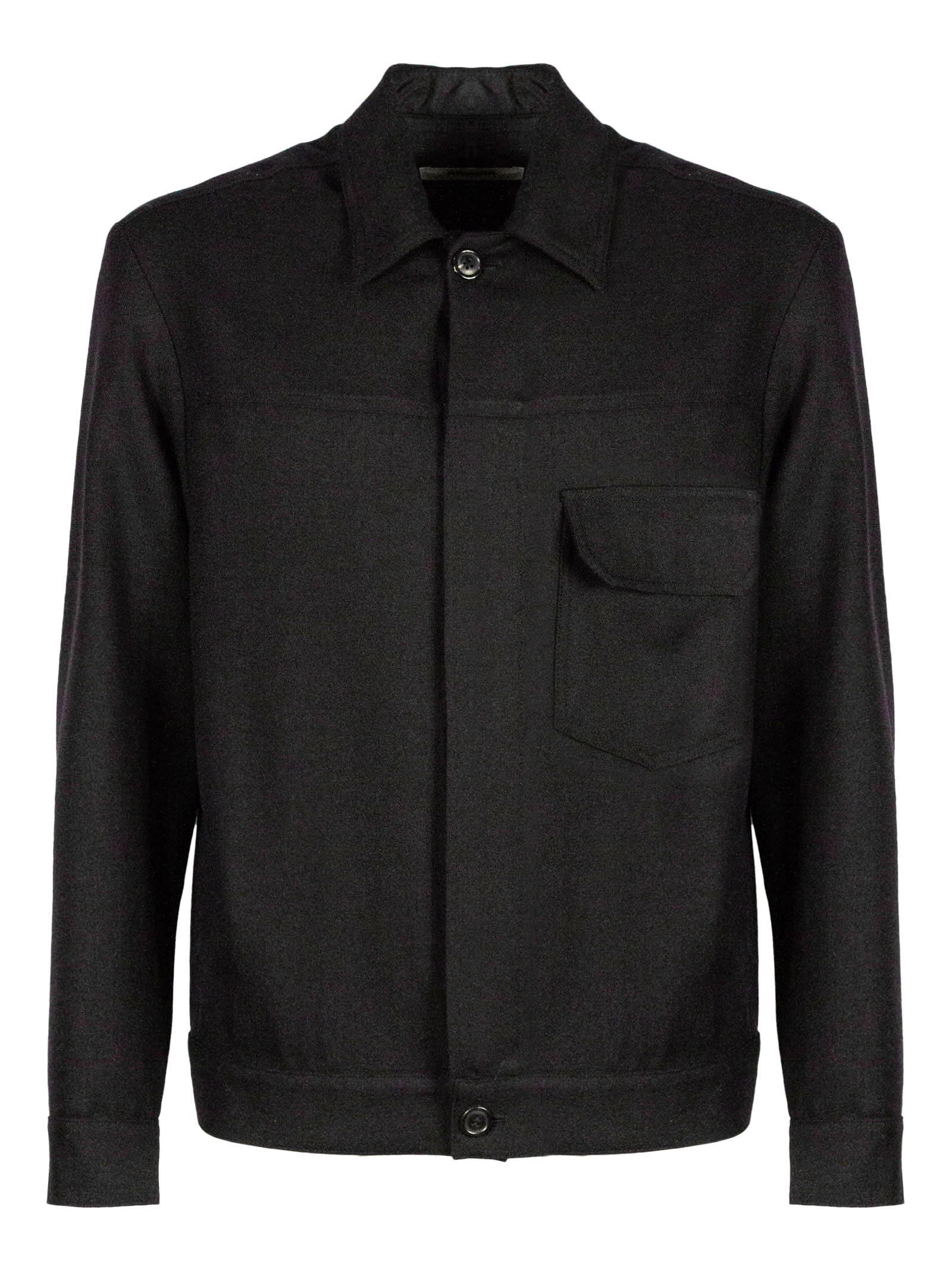 Black virgin wool jacket with concealed front fastening, half zip with button, classic collar, chest pocket, long sleeves, viscose lining. 100% Virgin wool, Lining: Viscose 100%