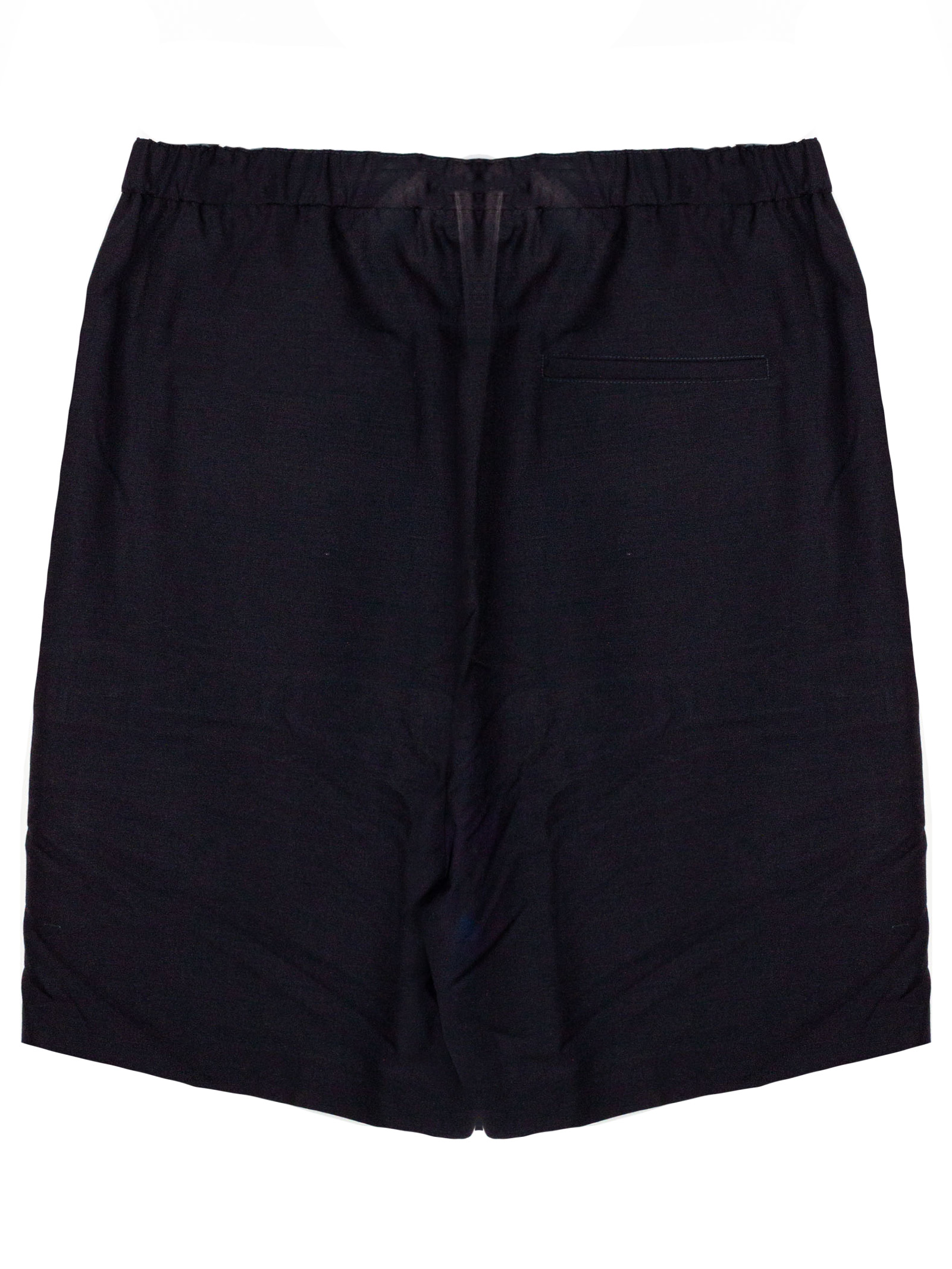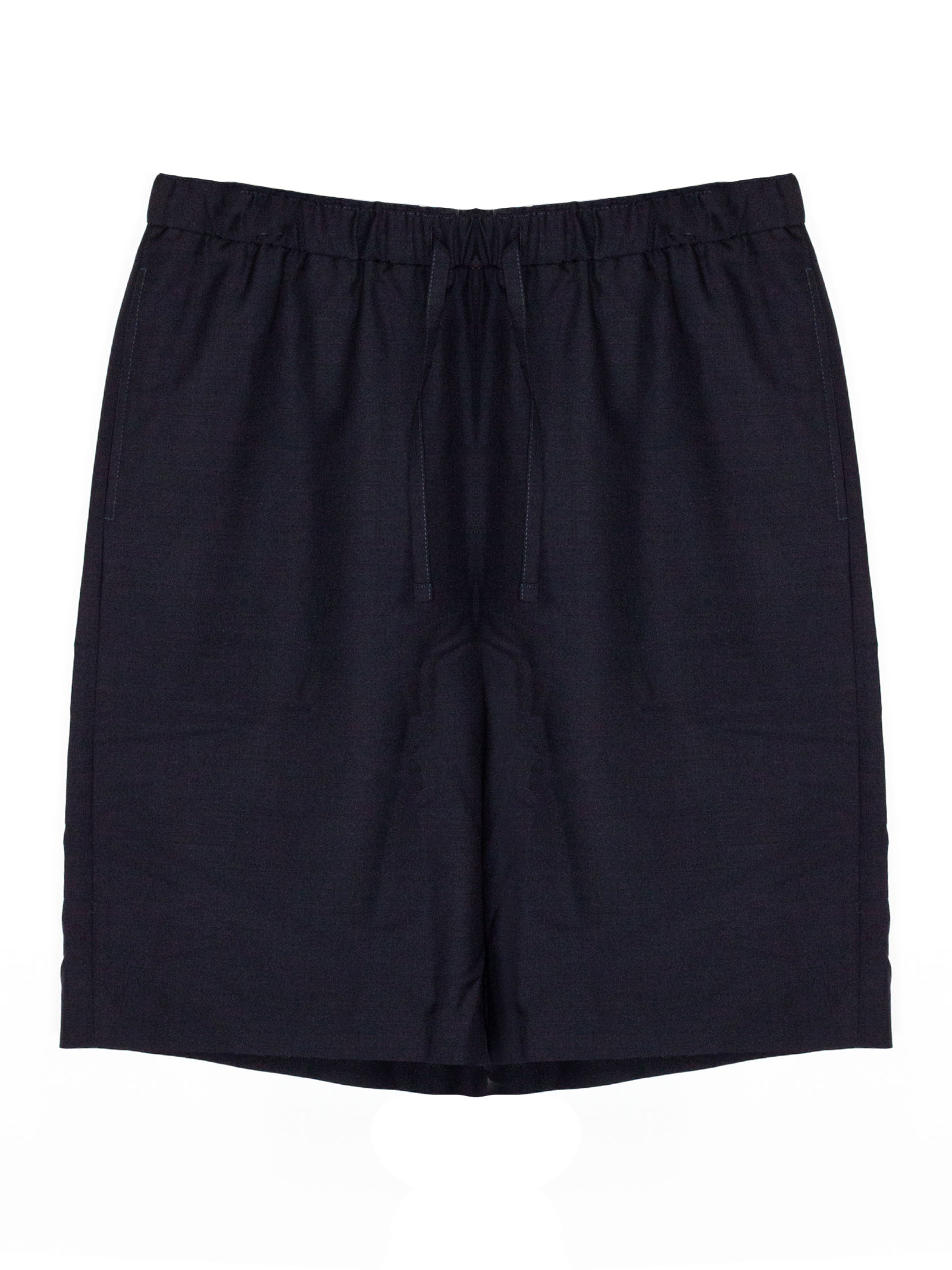 Blue virgin wool Bermuda shorts with an elasticated waist, drawstring, side pockets, a back pocket and a cotton lining
