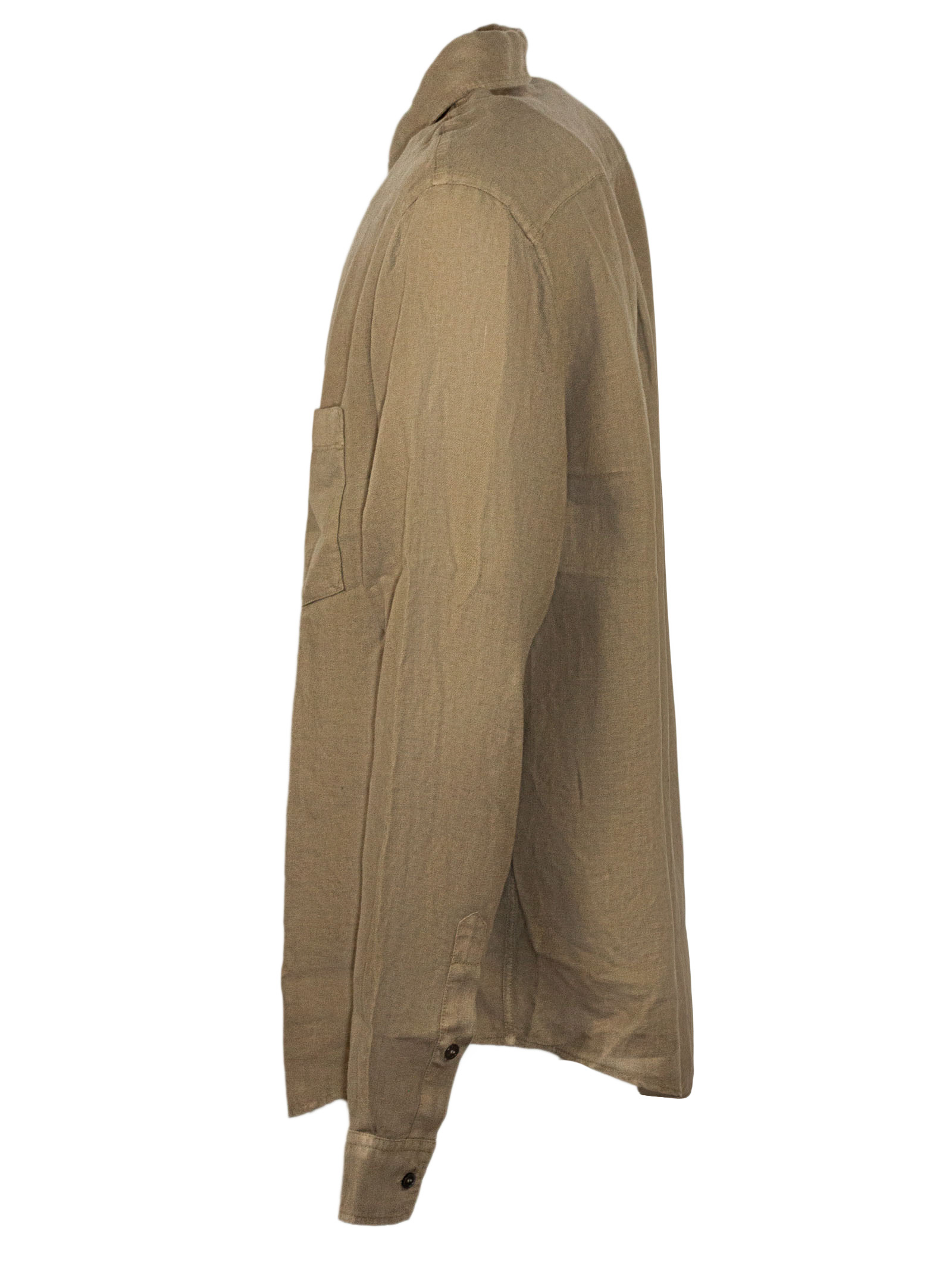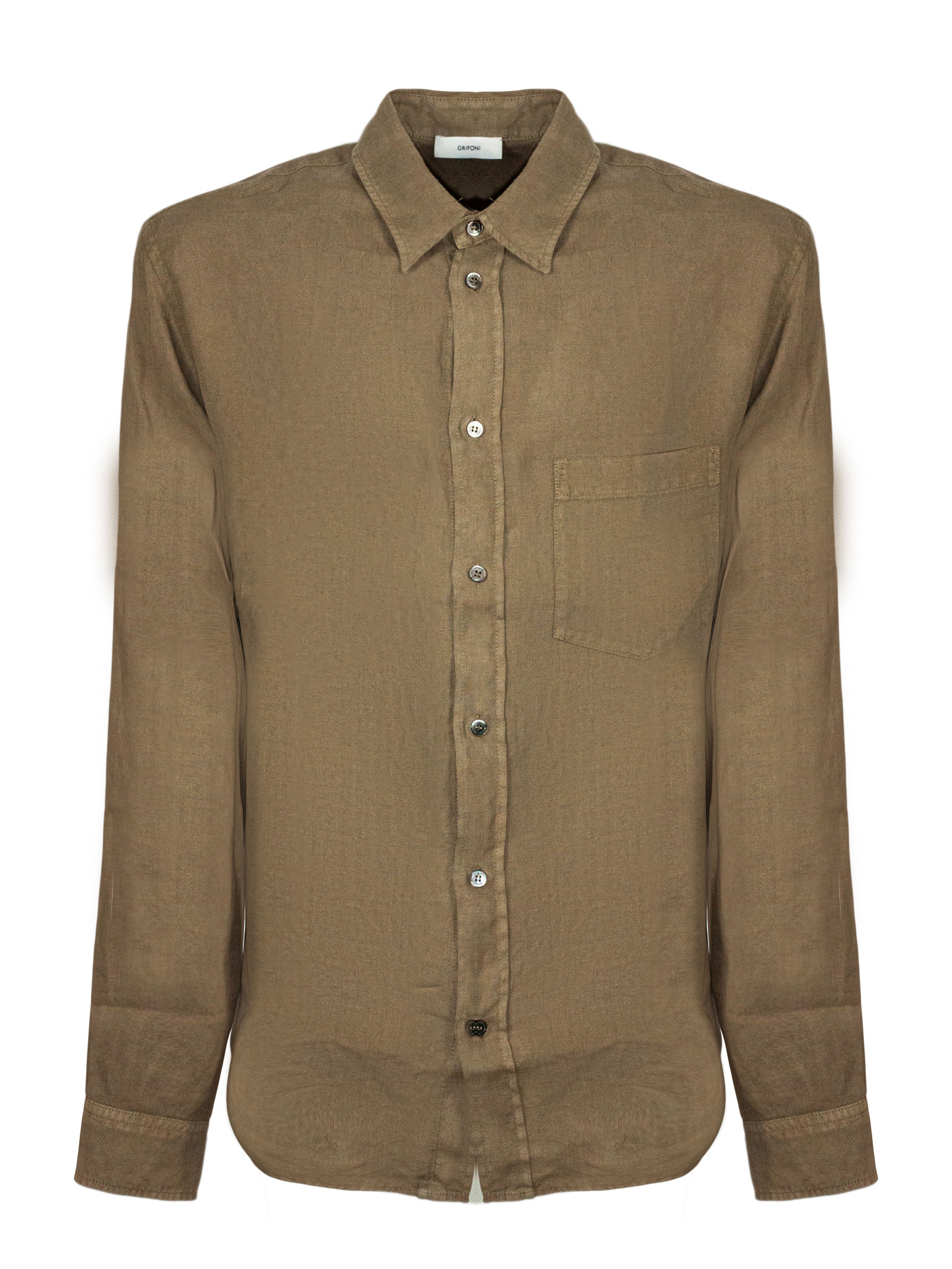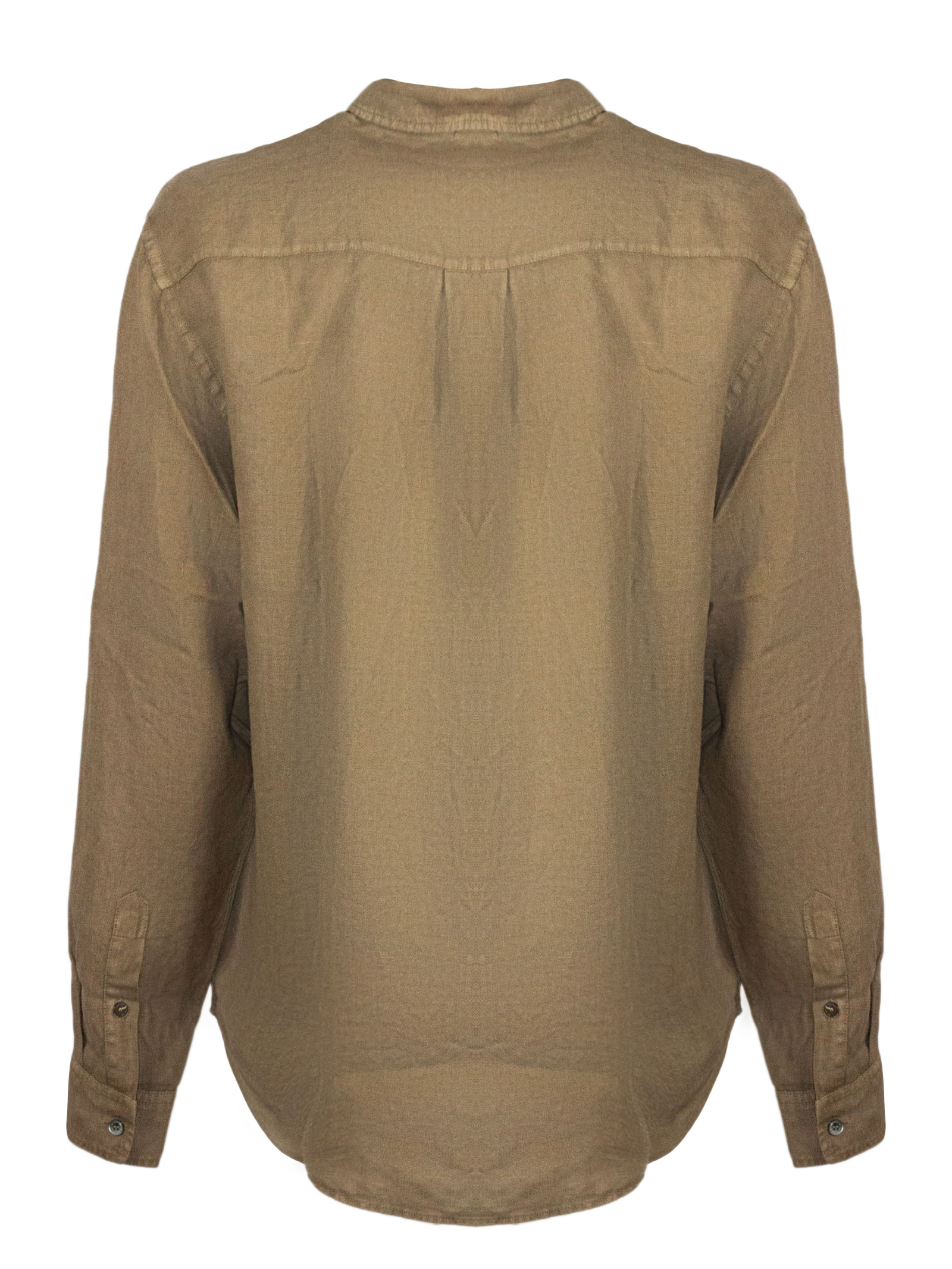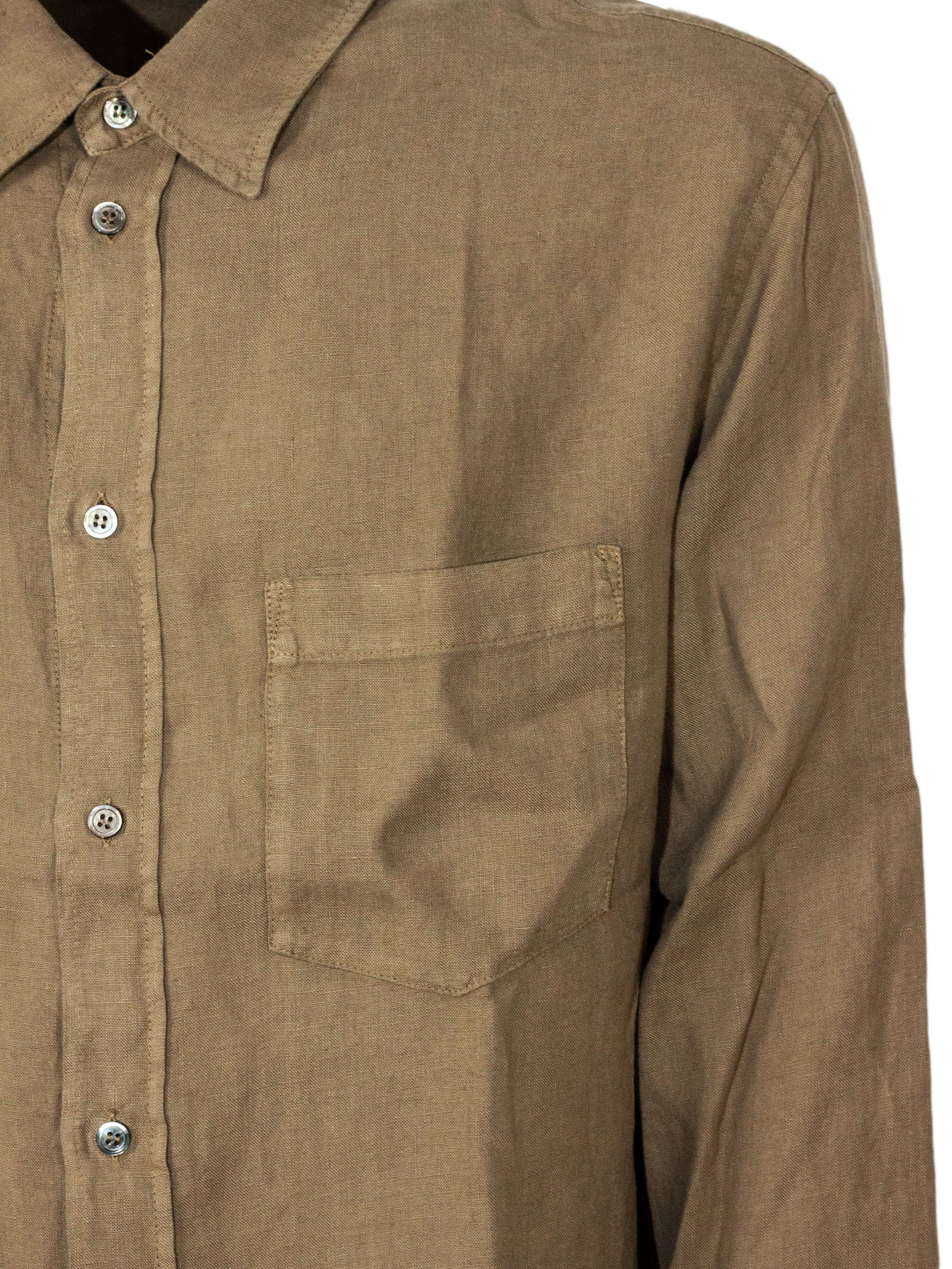 Brown linen shirt with short sleeves, a classic collar and a button-up front