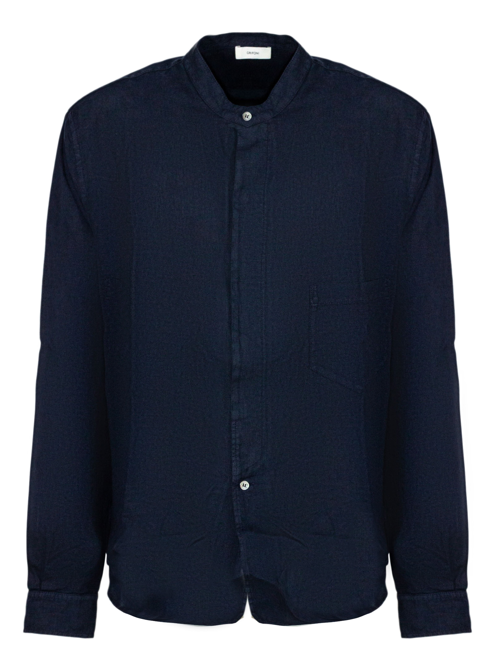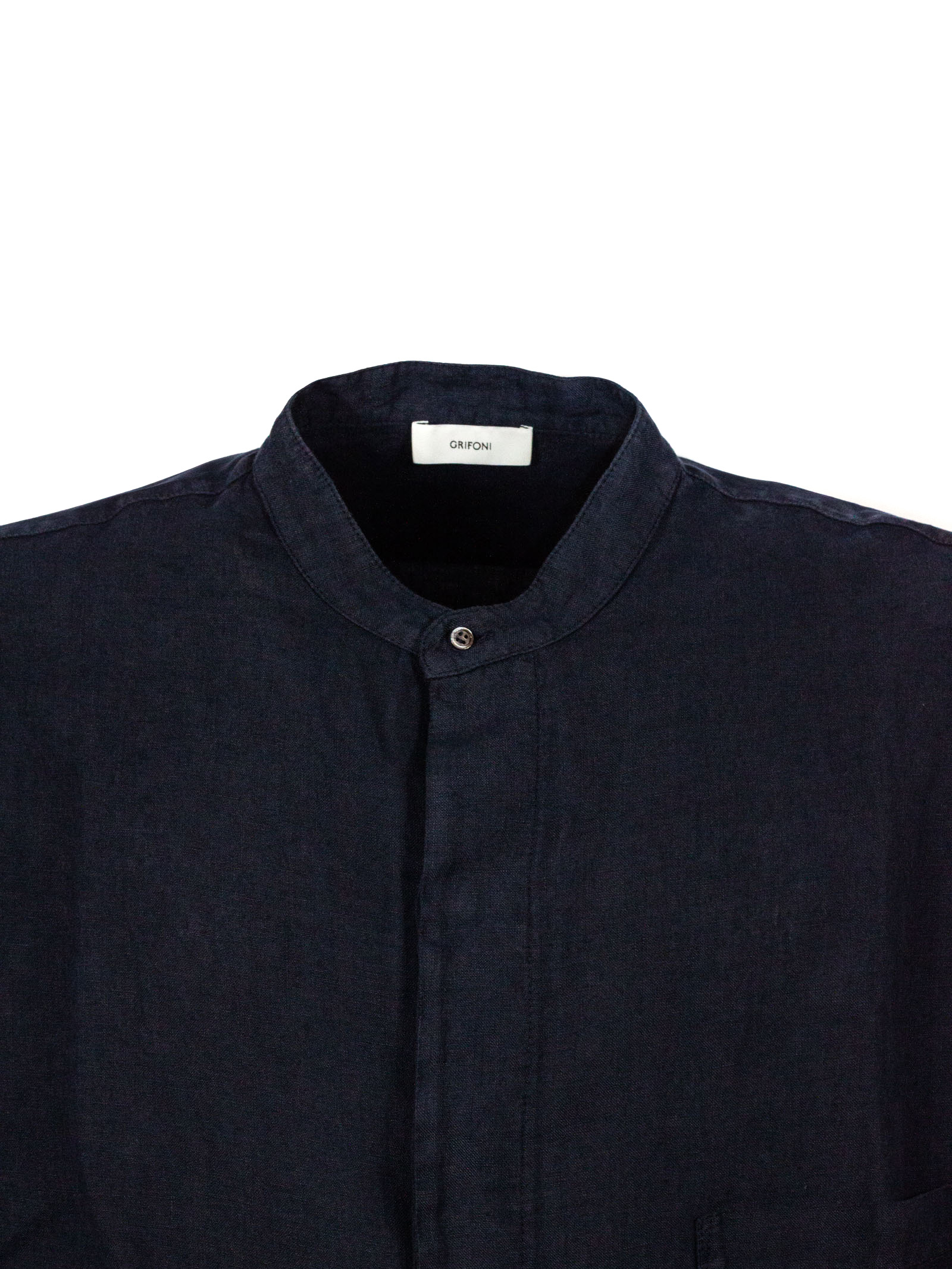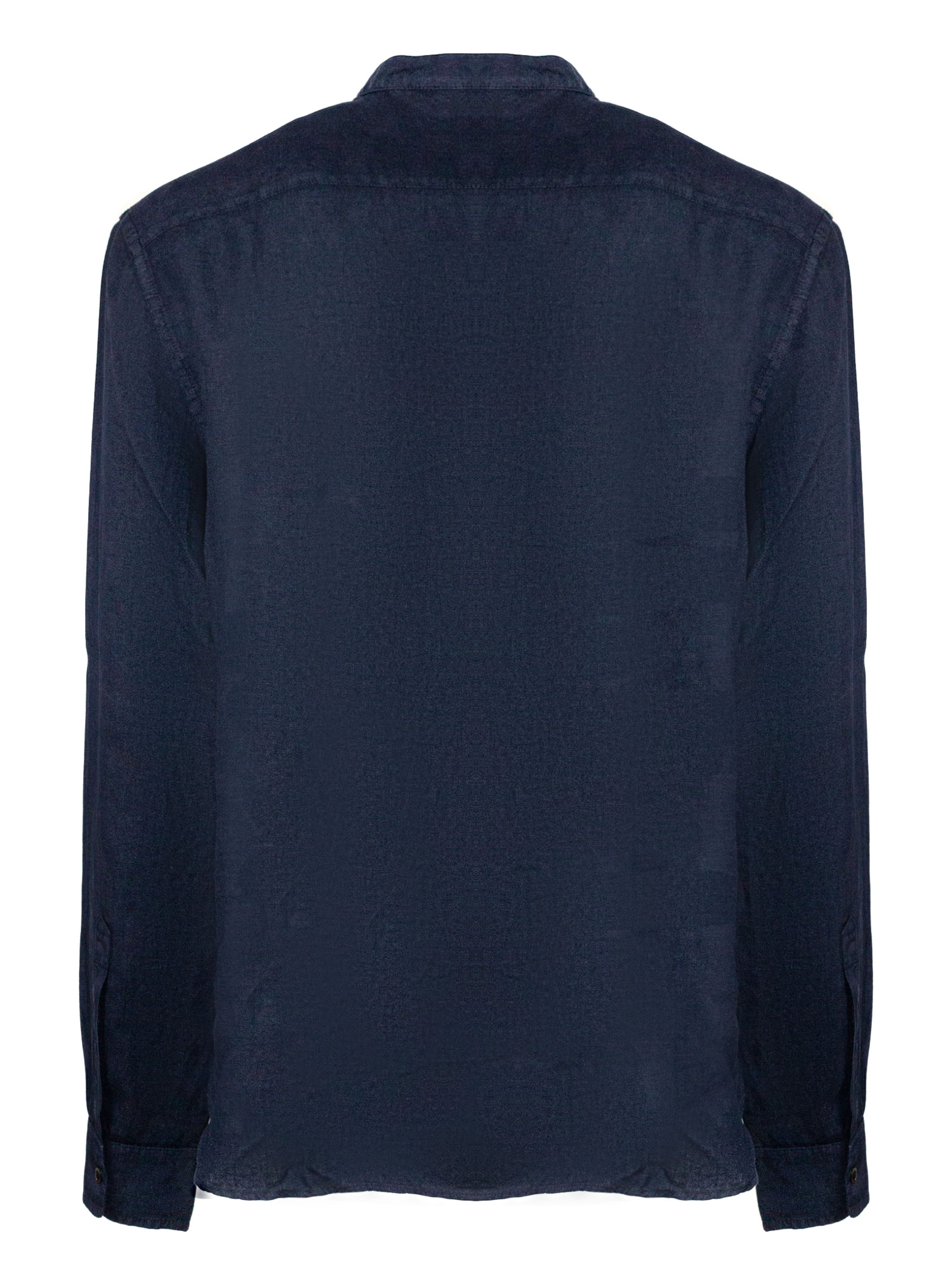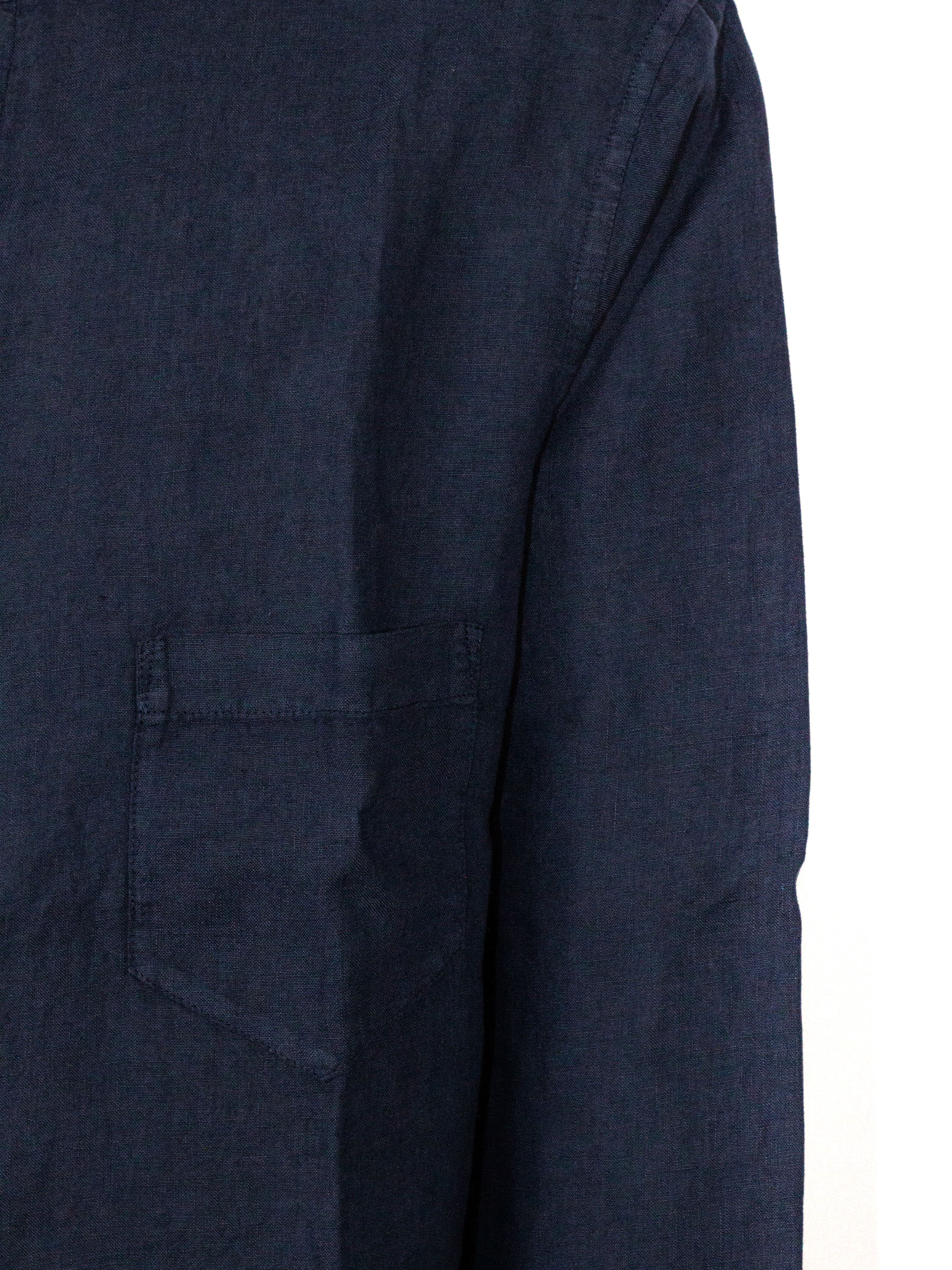 Dark blue linen shirt with long sleeves, a classic collar, a concealed button fastening at the front, and a chest pocket