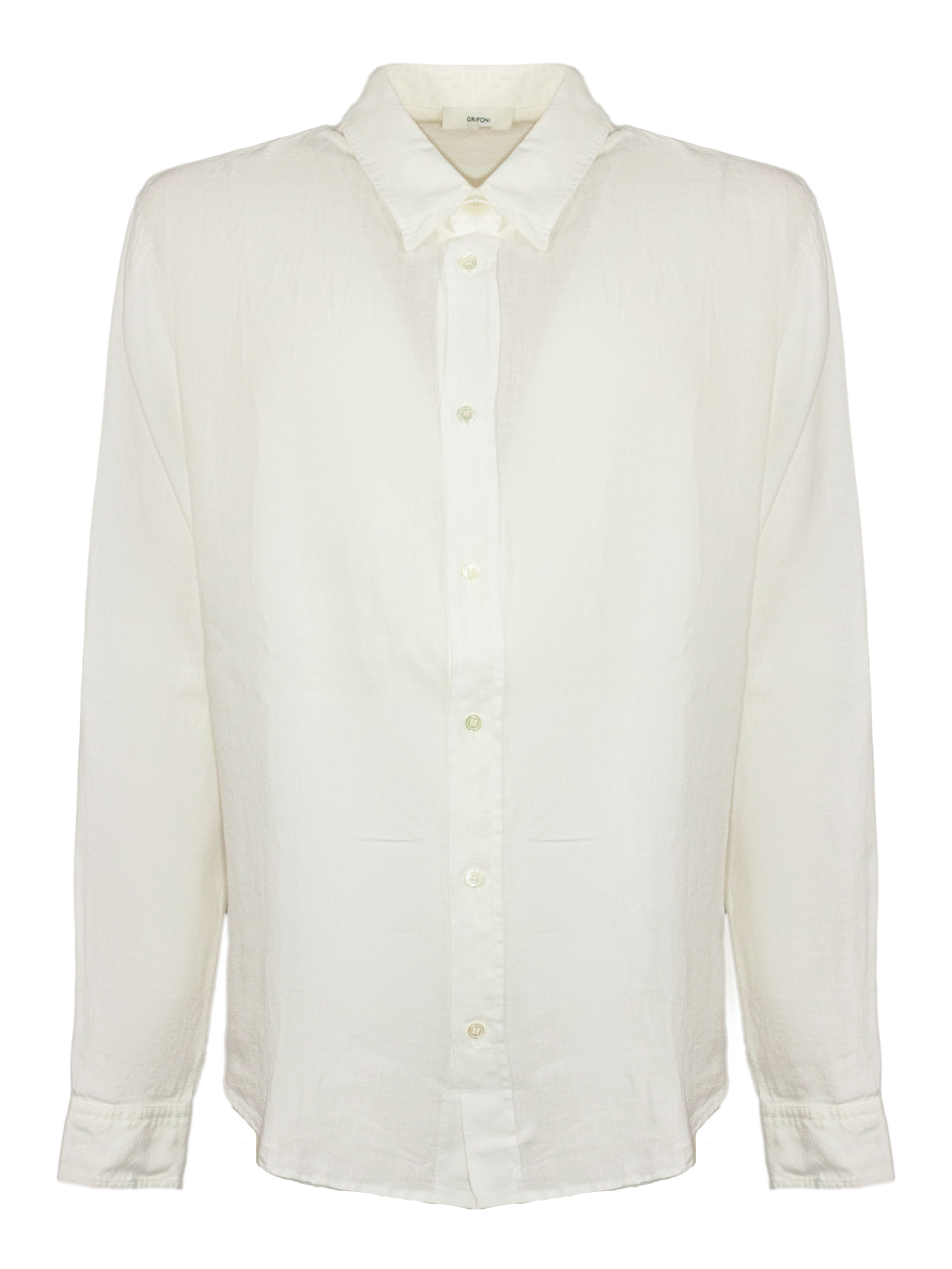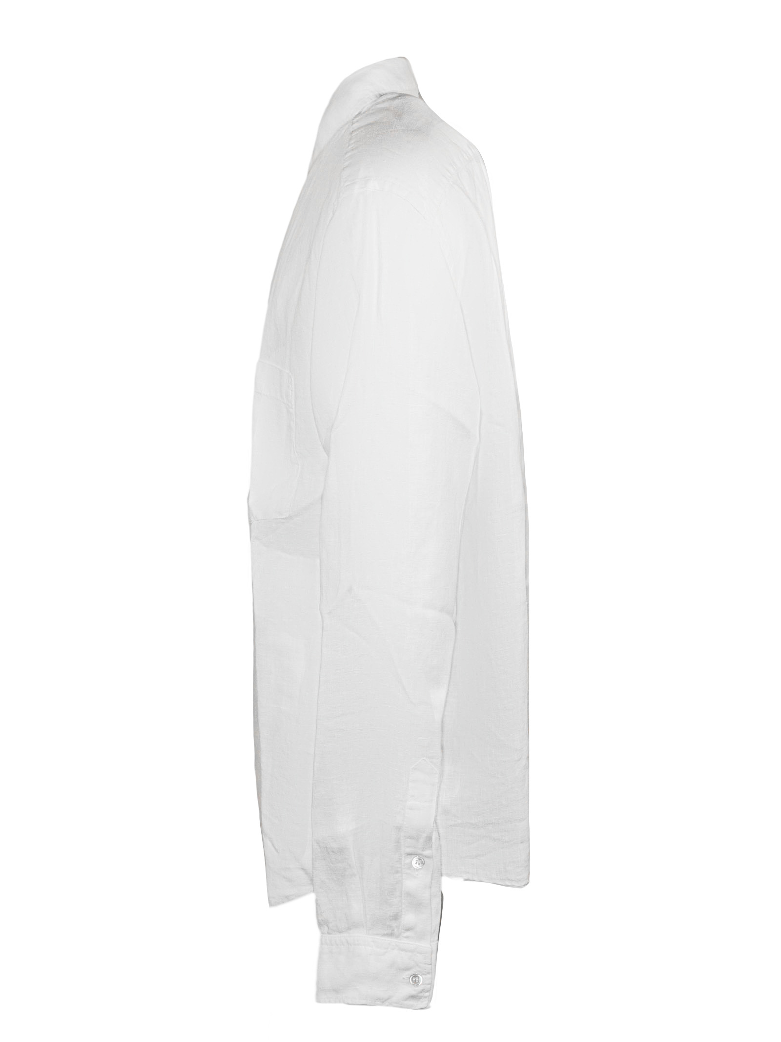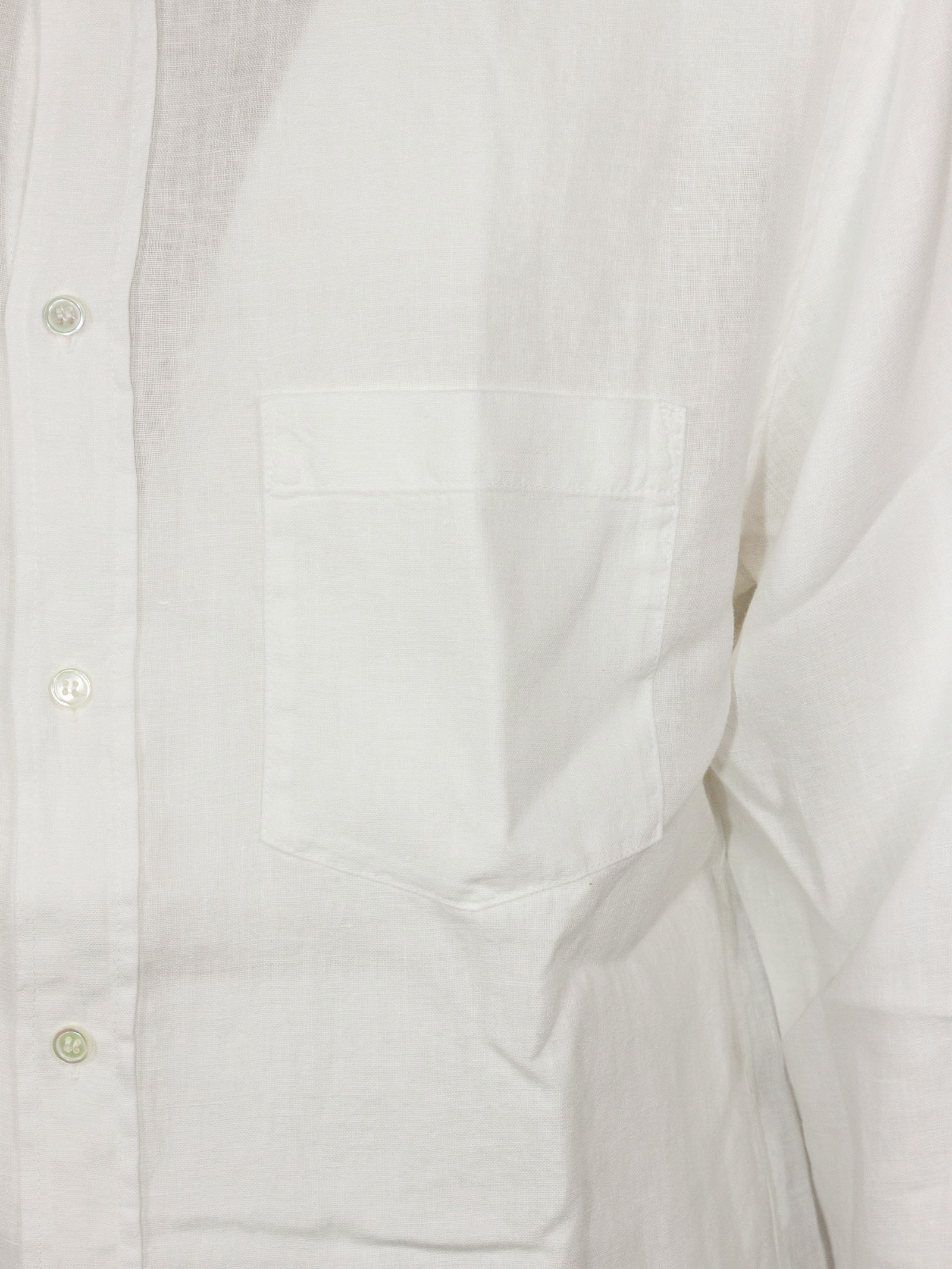 White linen shirt with short sleeves, a classic collar and a button-up front