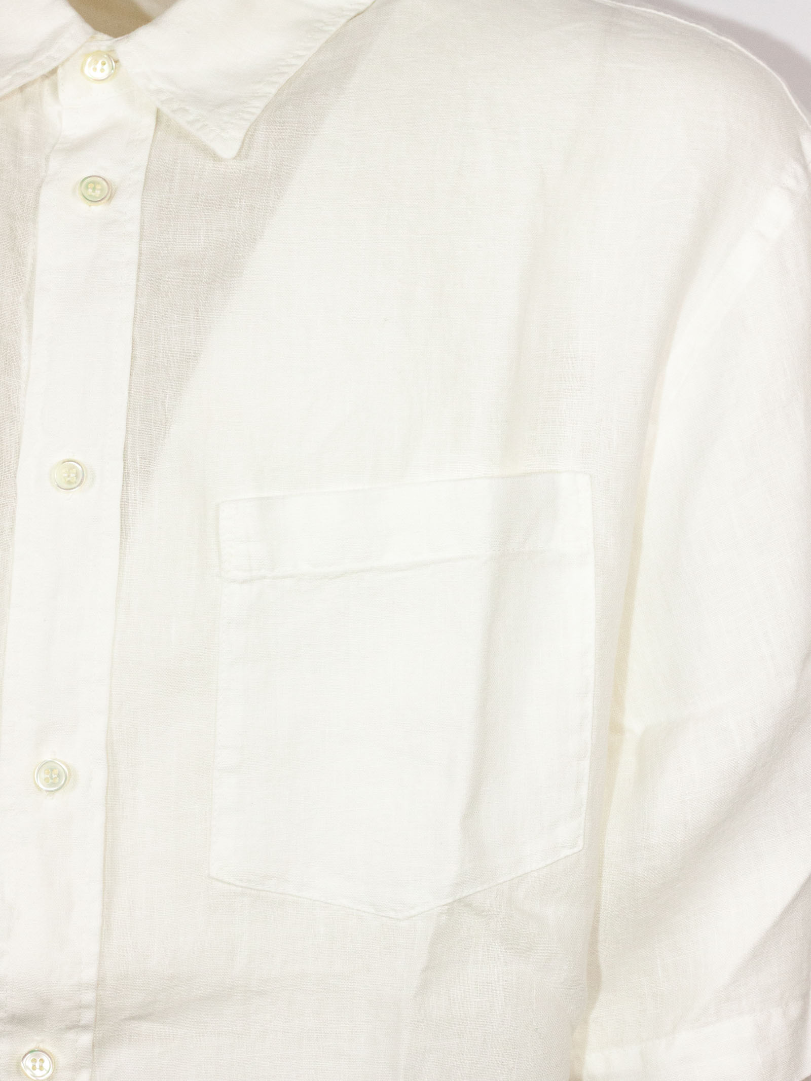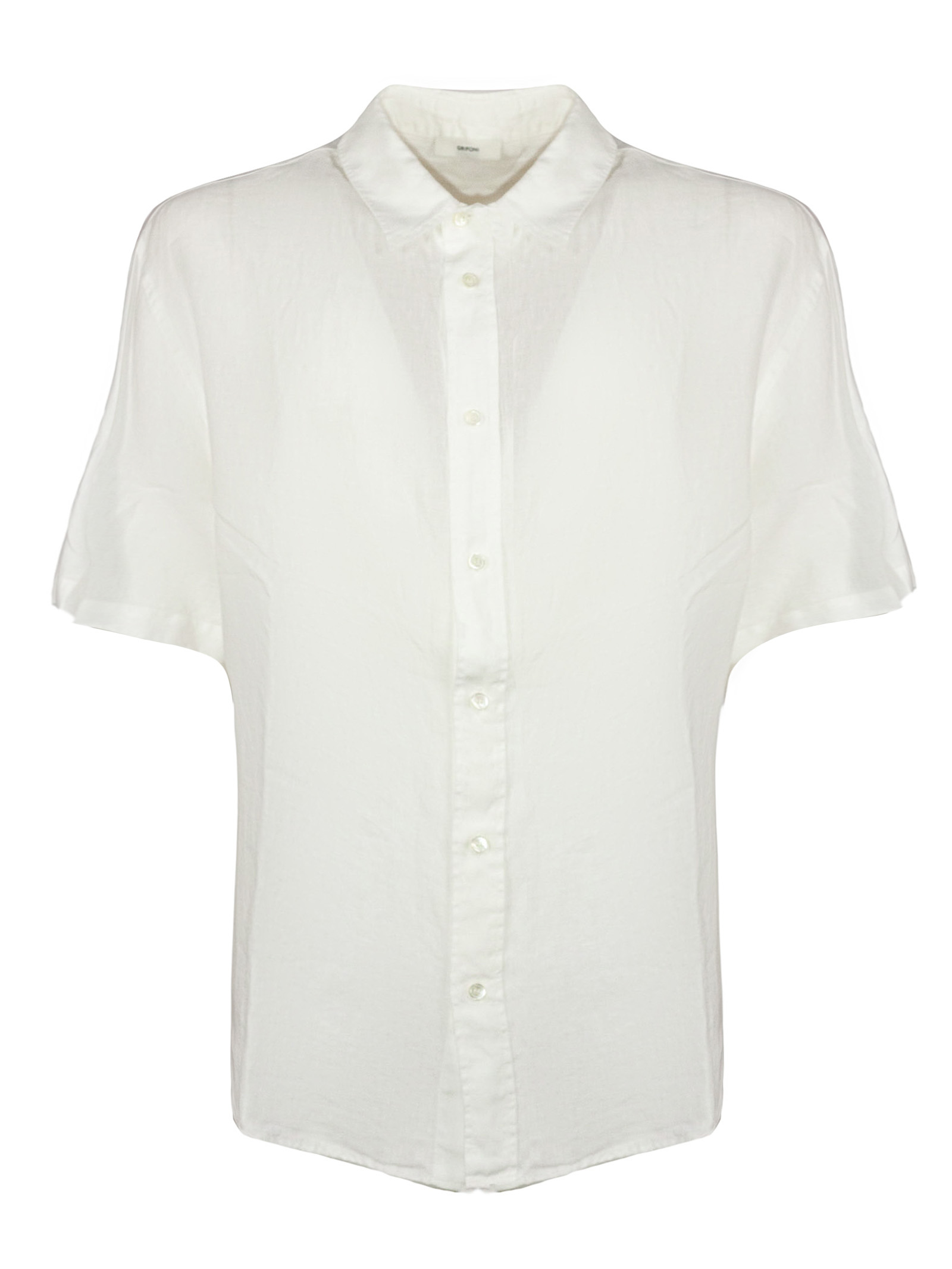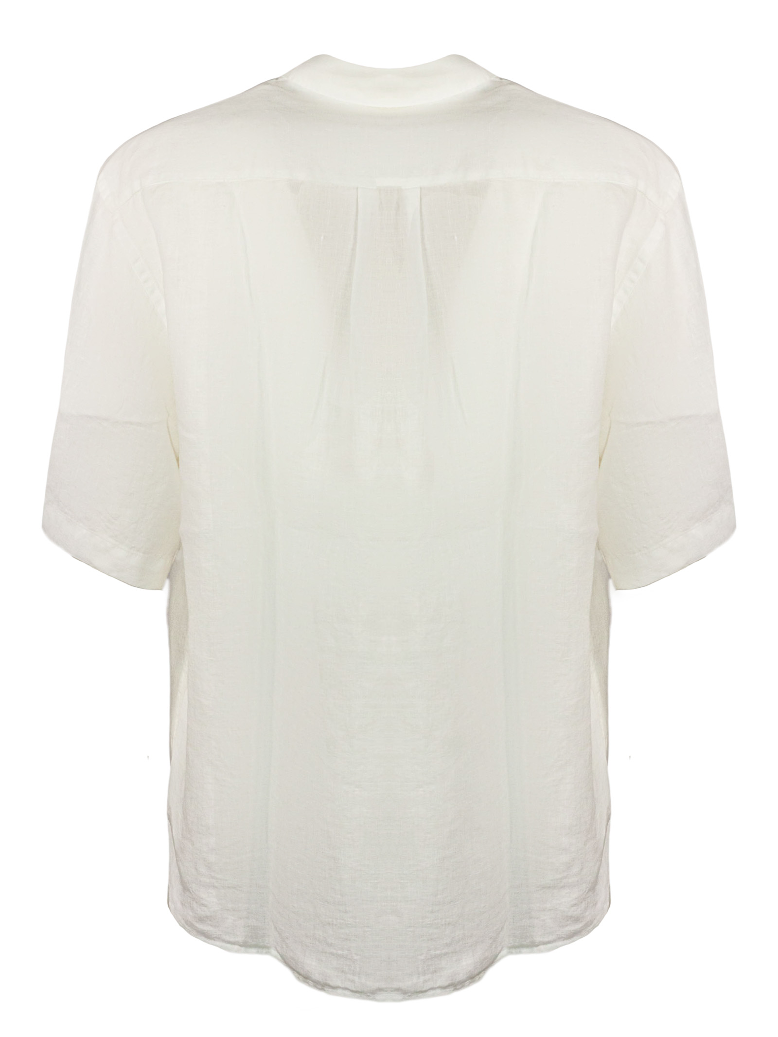 White linen shirt with short sleeves, a classic collar and a button-up front