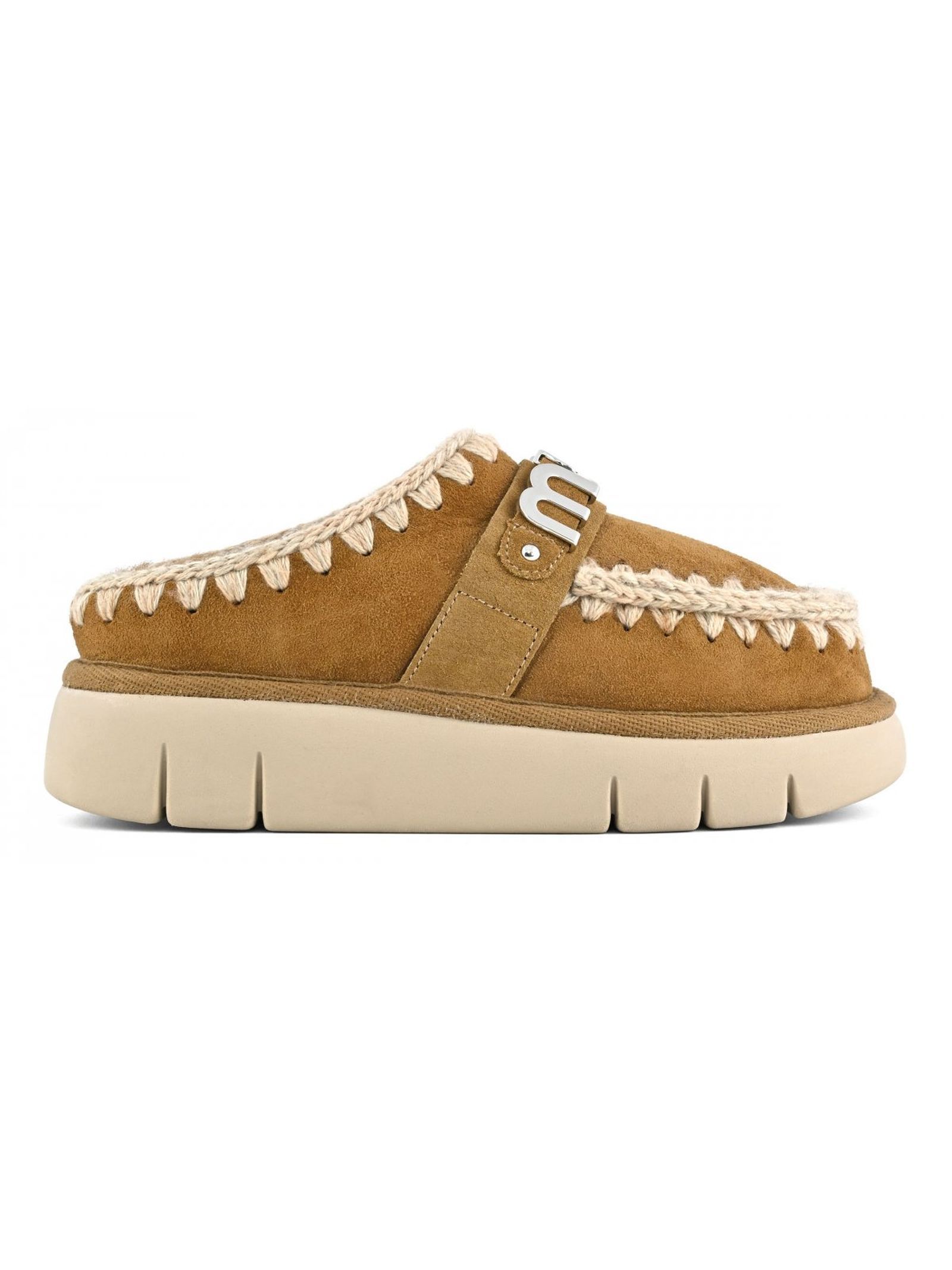 Brown double-face sheepskin bounce clog with metal logo, mou trademark hand-crochet wool stitching, padded leather insole and lightweight EVA rubber sole