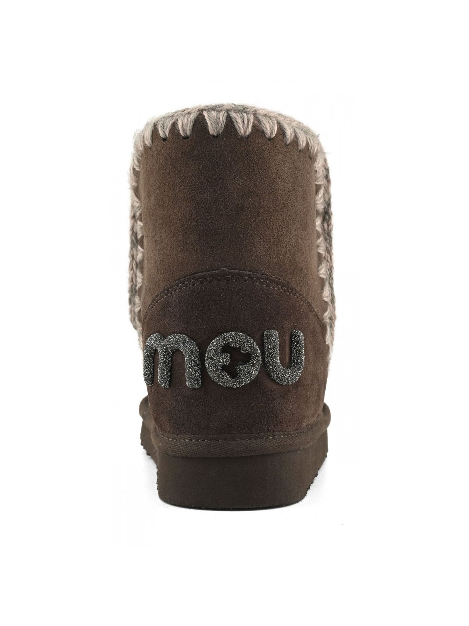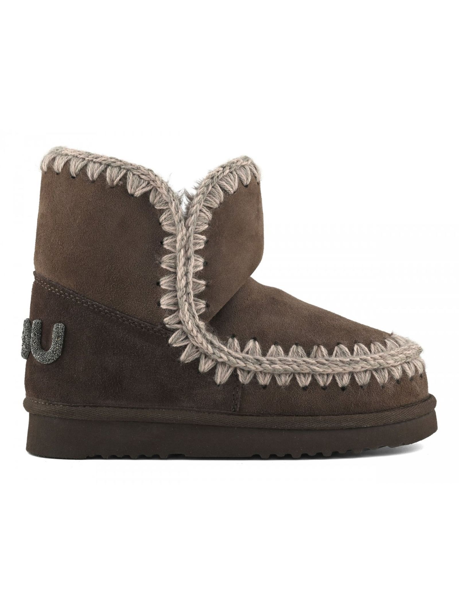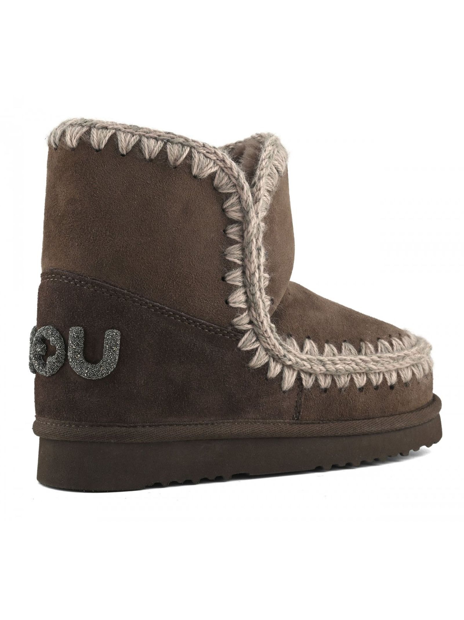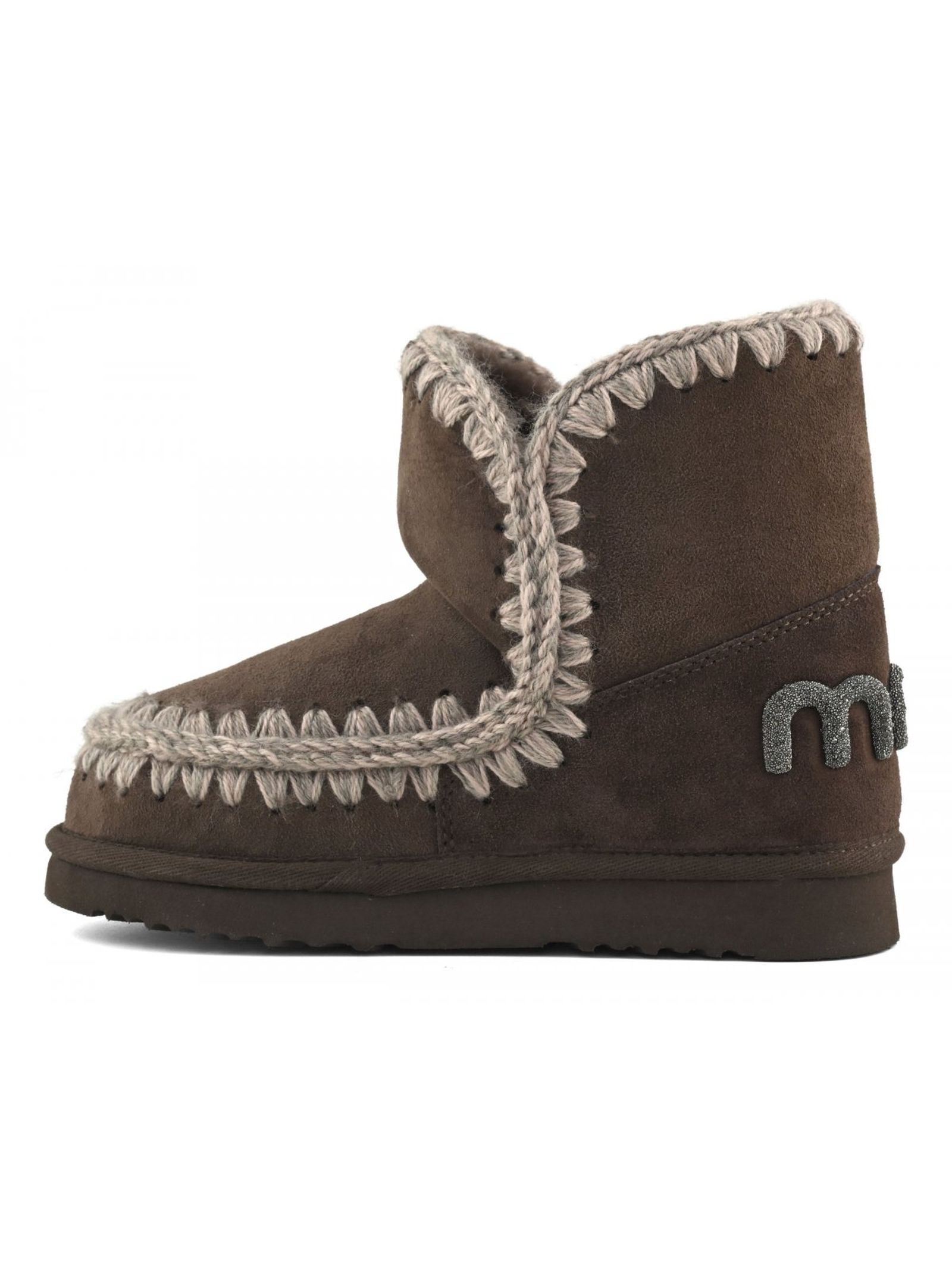 Brown double-face sheepskin Eskimo 18 with glitter logo, crocheted wool seams, a supportive heel counter and EVA & rubber outdoor sole. Height 18cm. Regular fit.