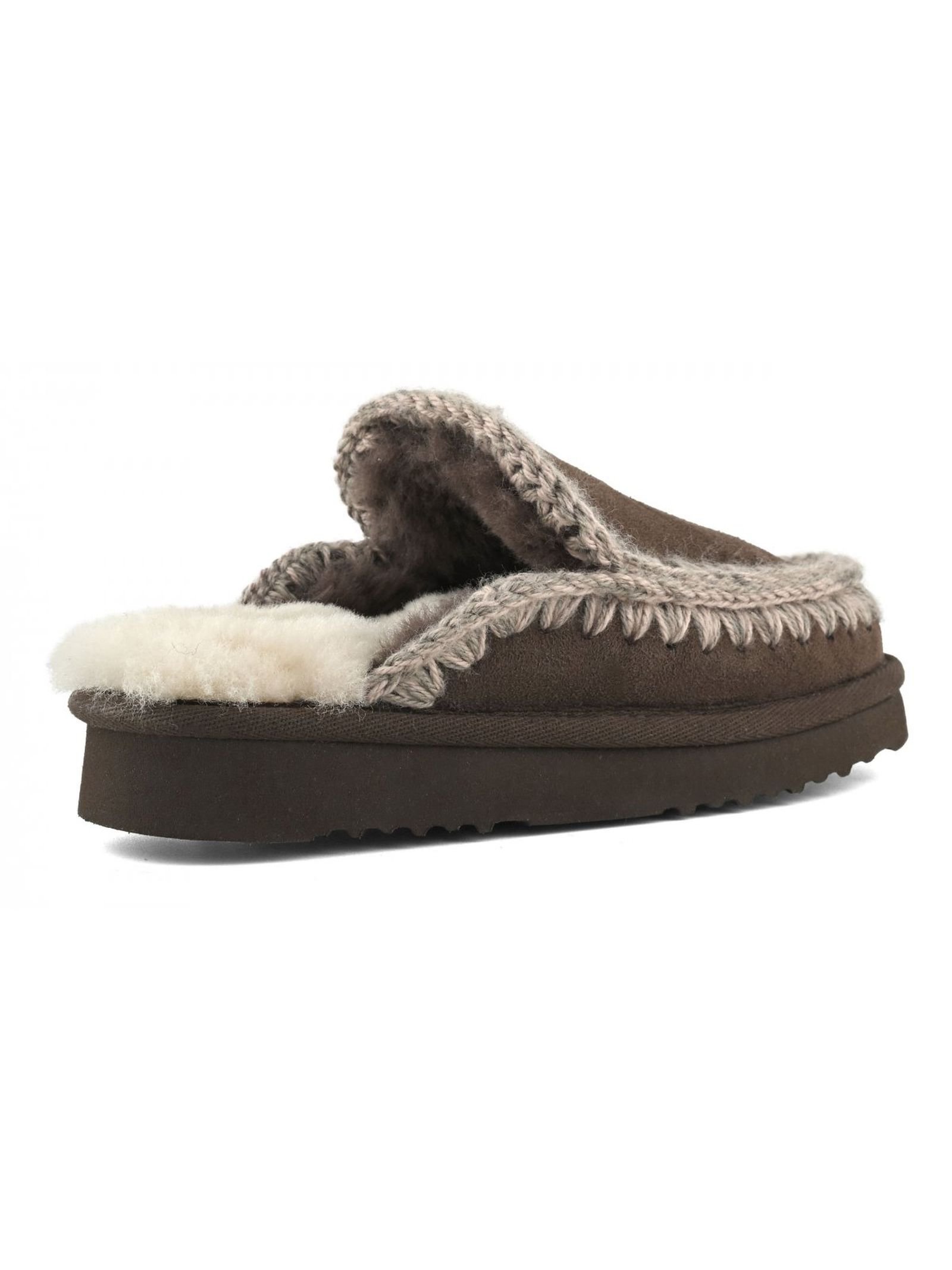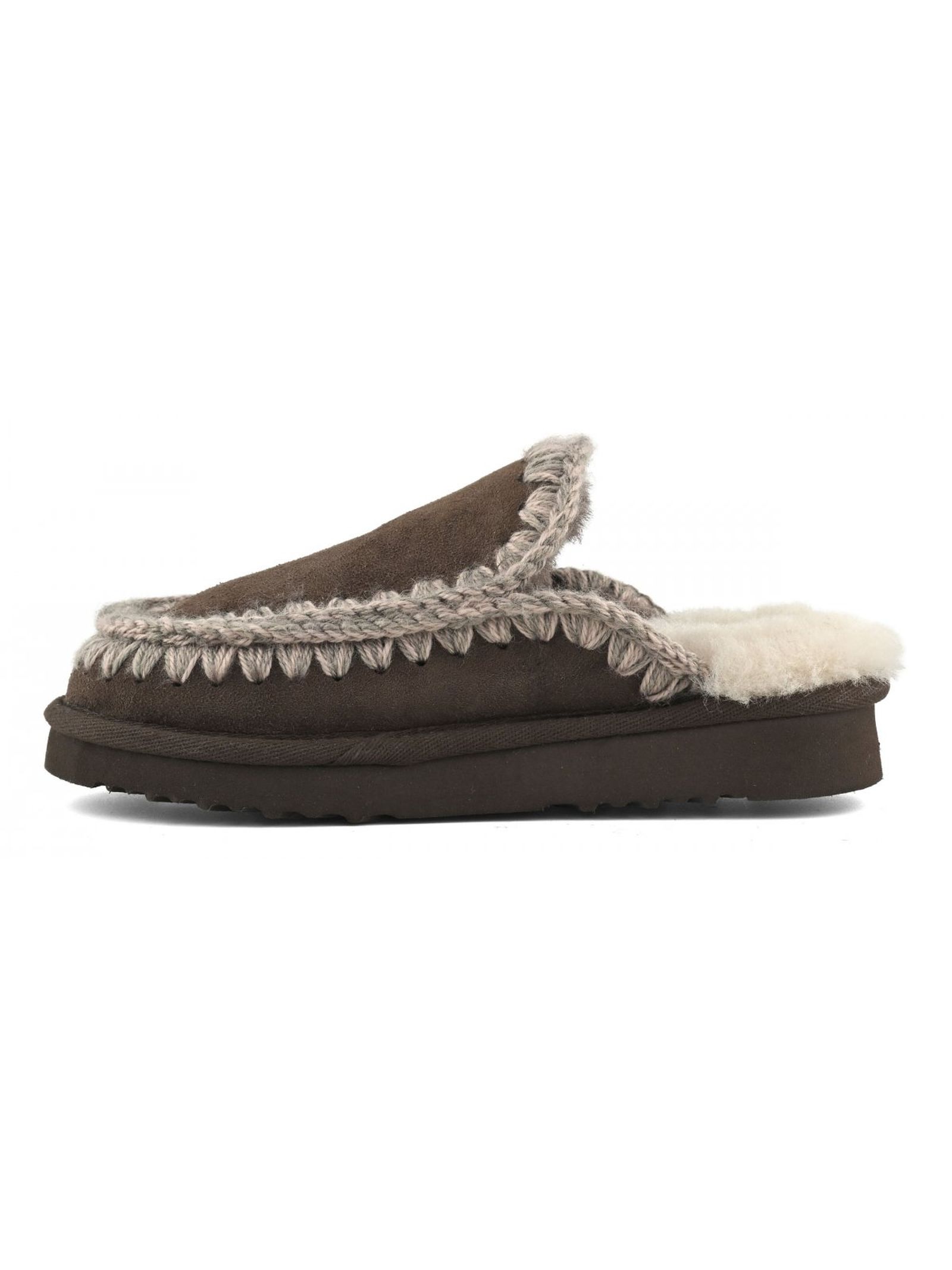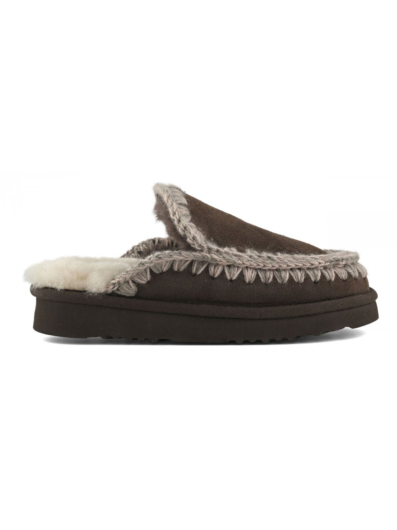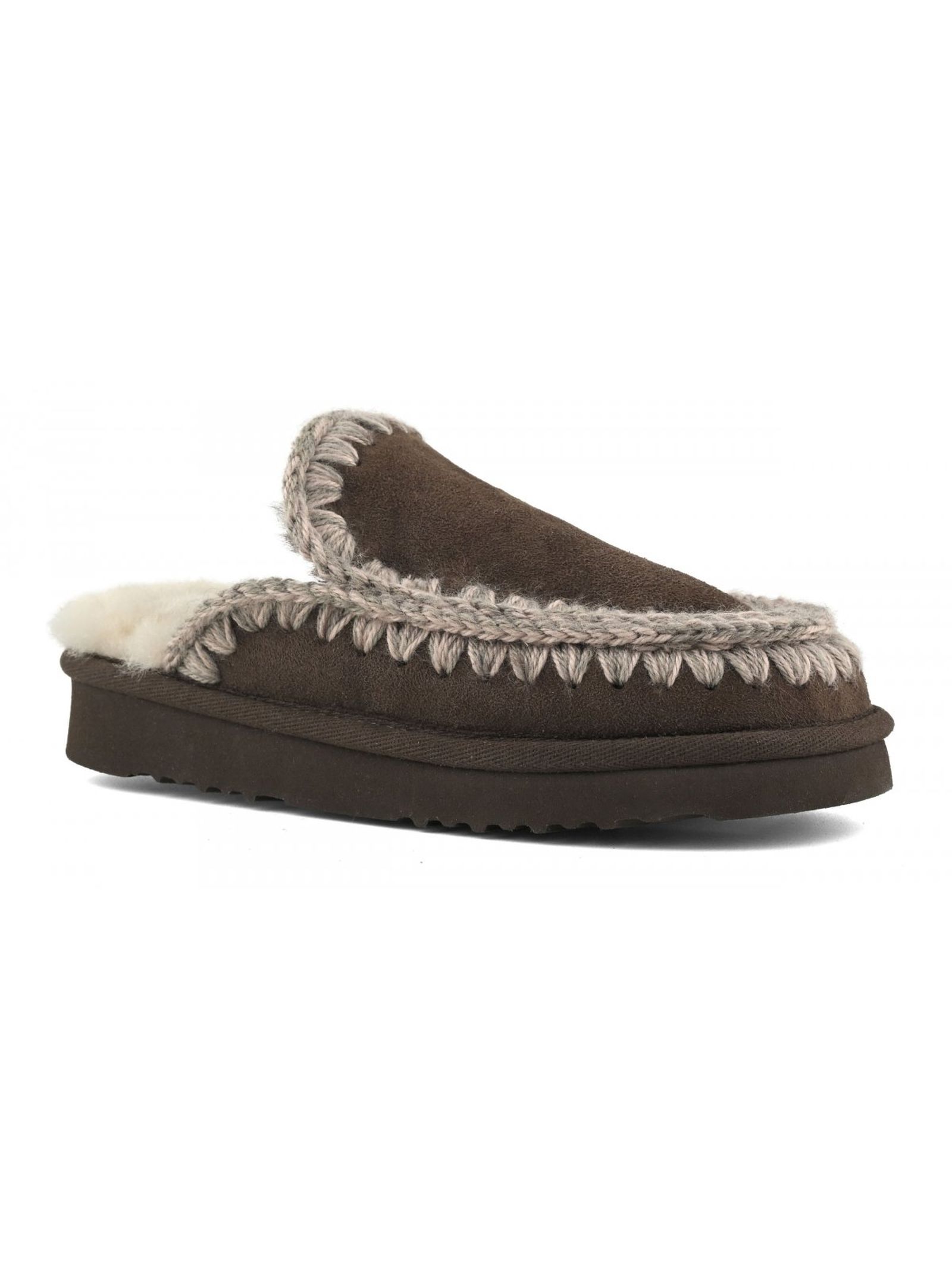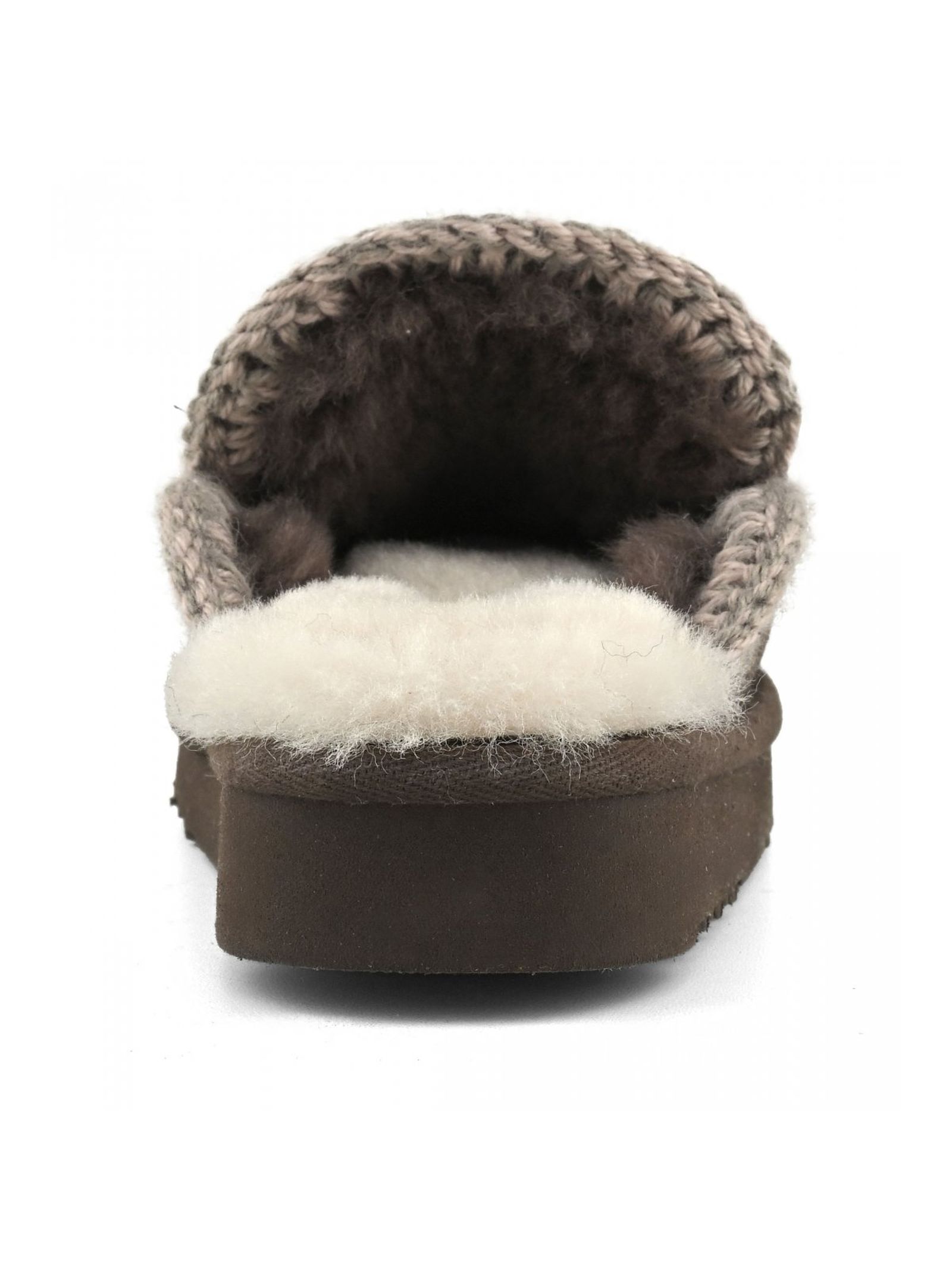 Brown Eskimo slipper in double-face sheepskin, hand-crochet wool stitching, EVA & rubber outsole