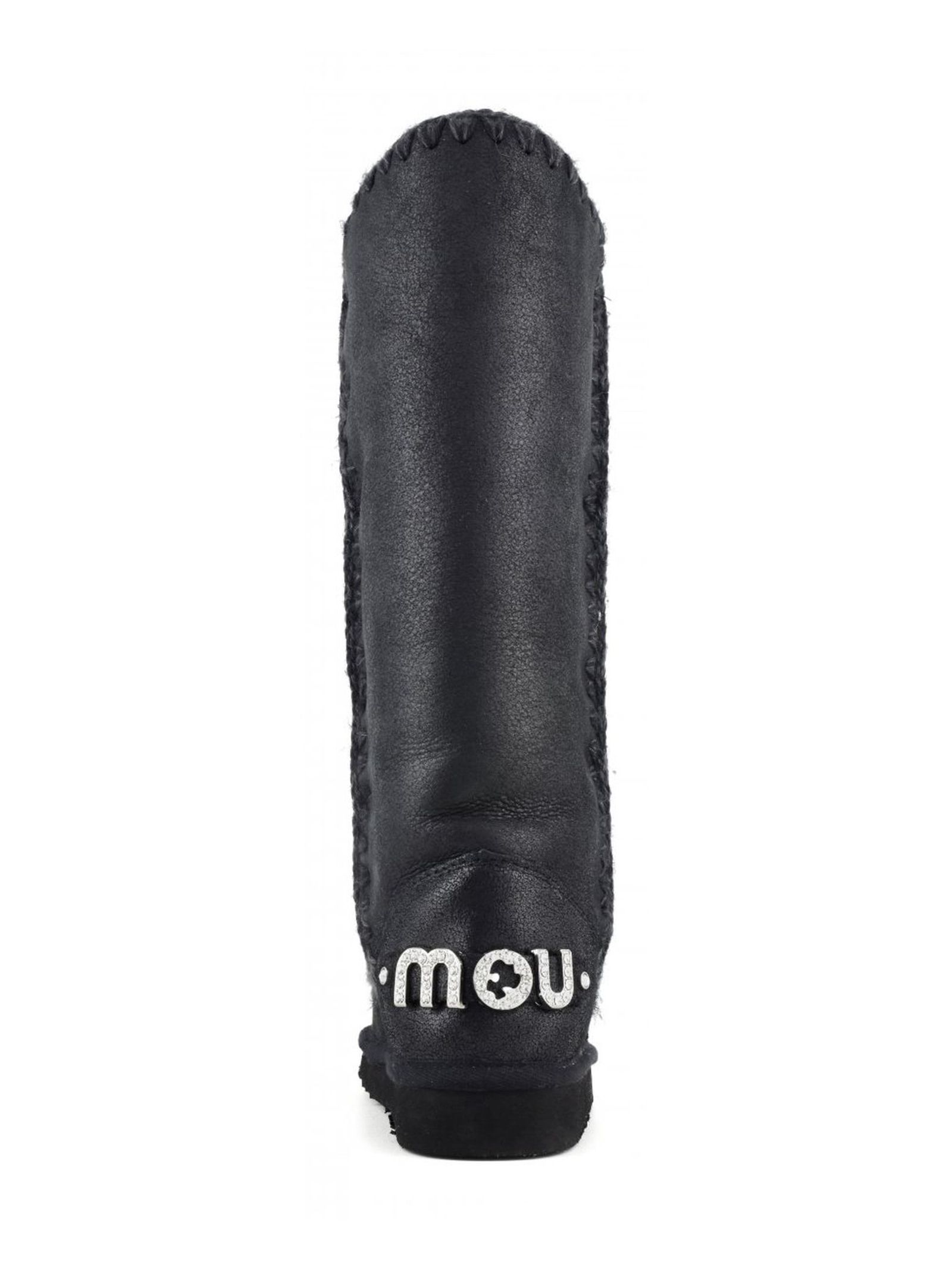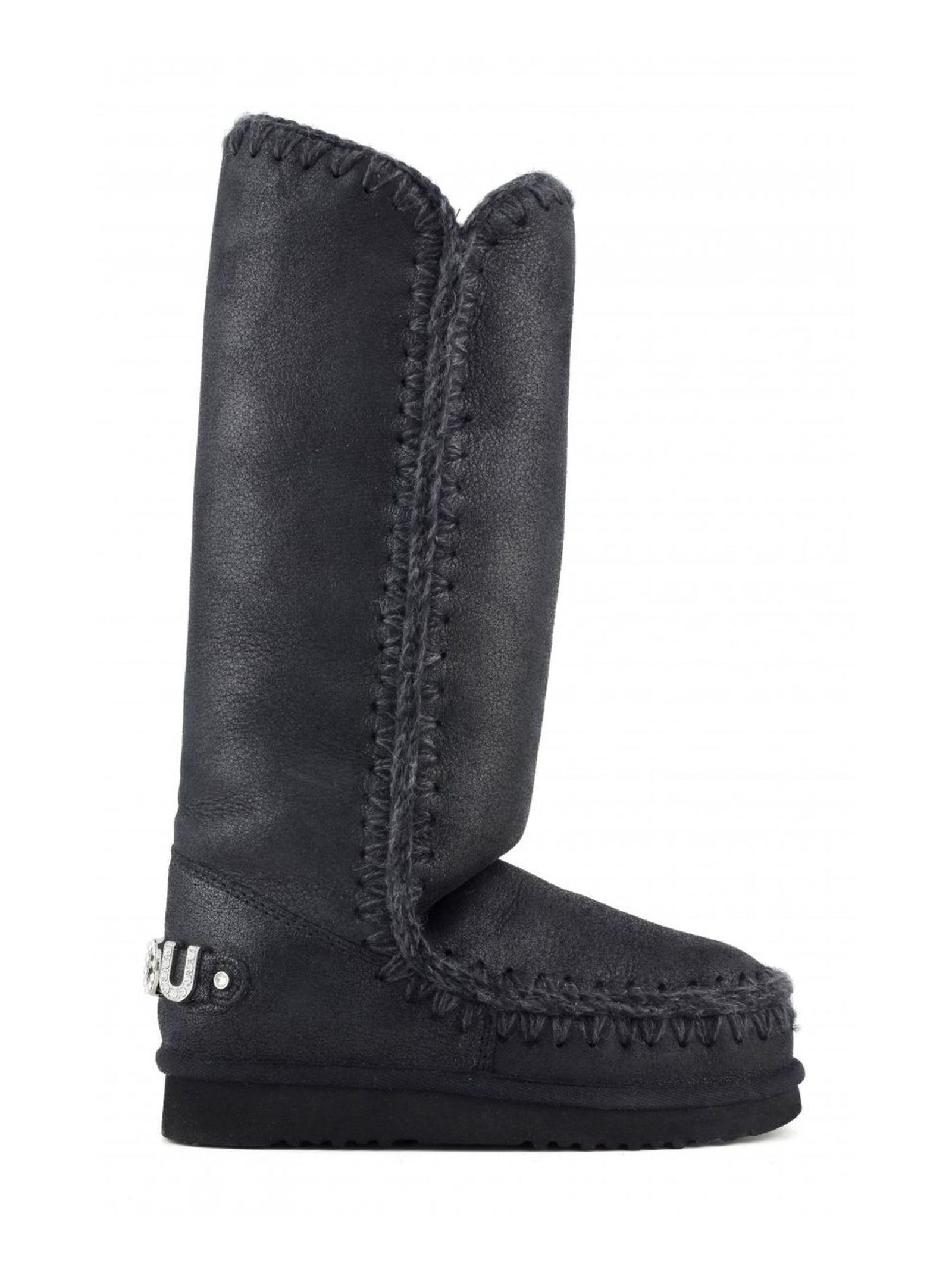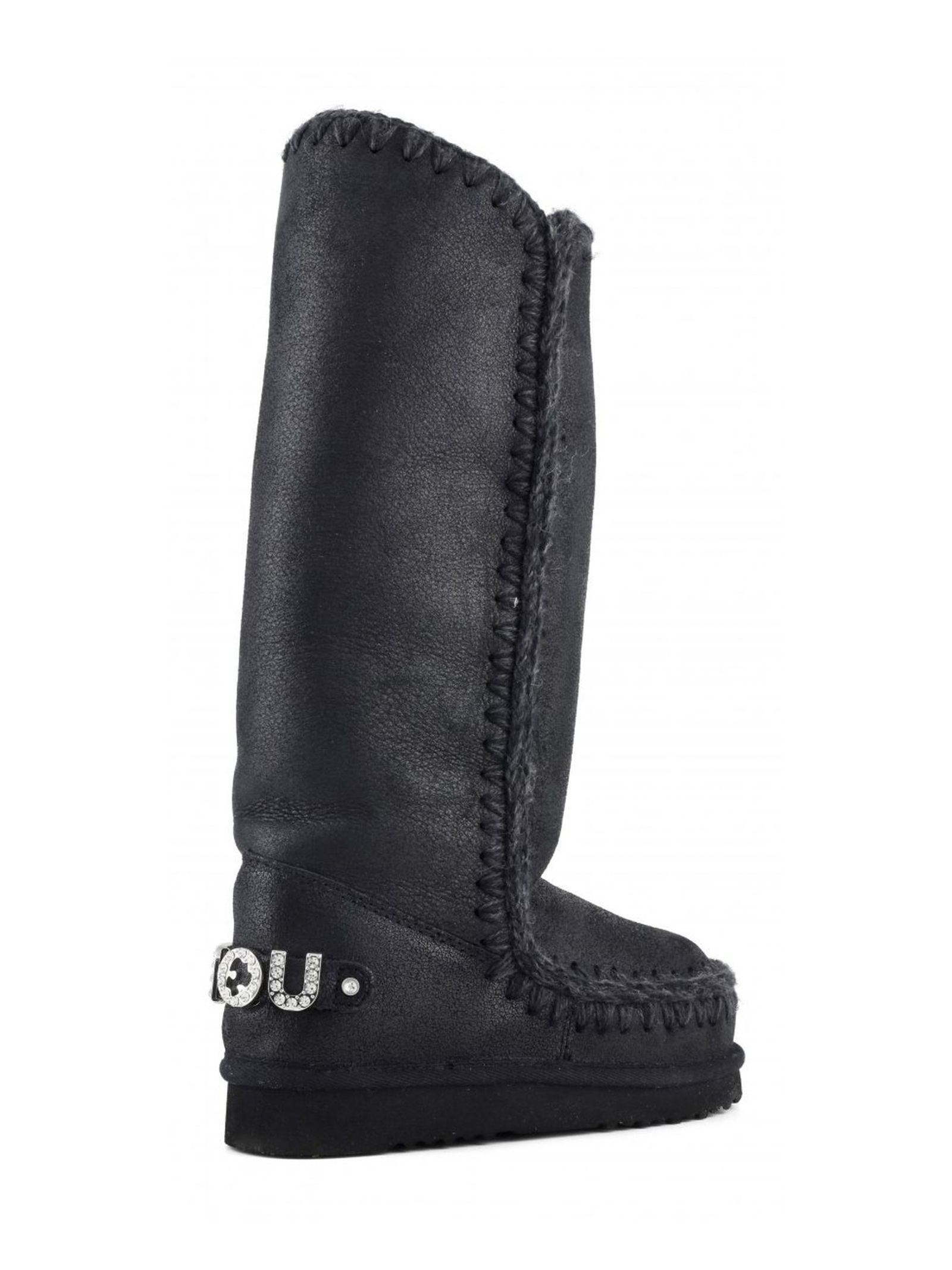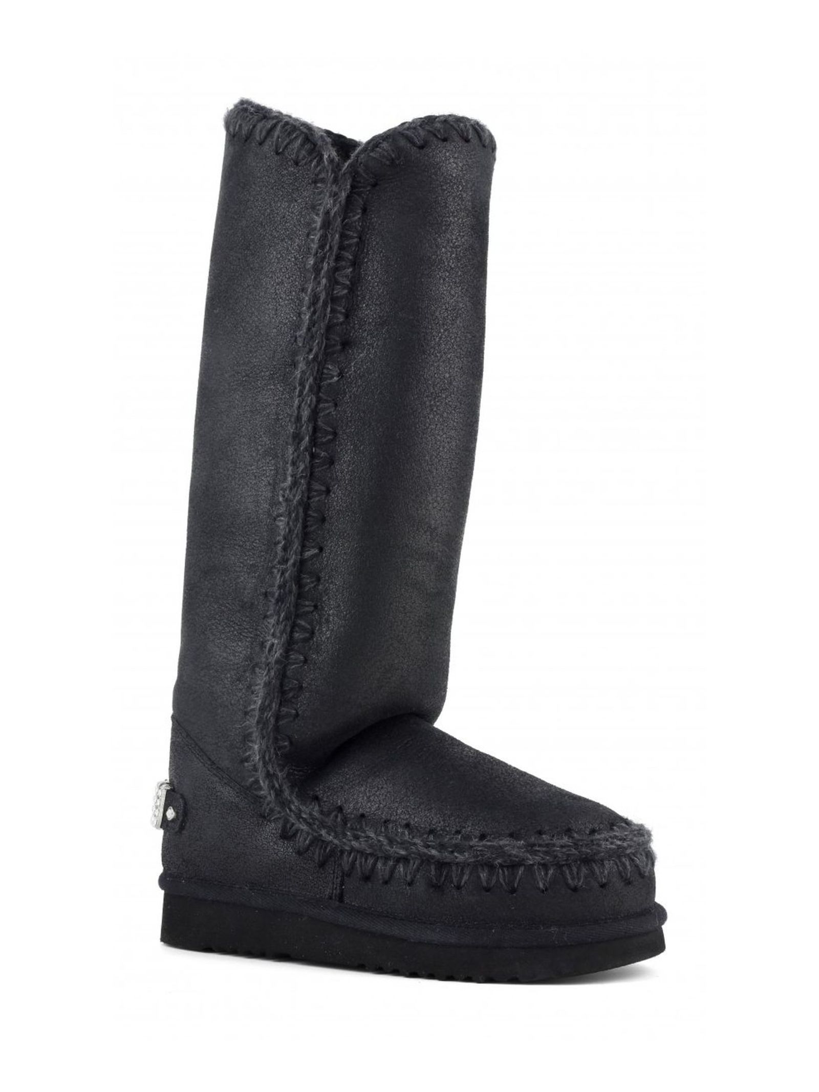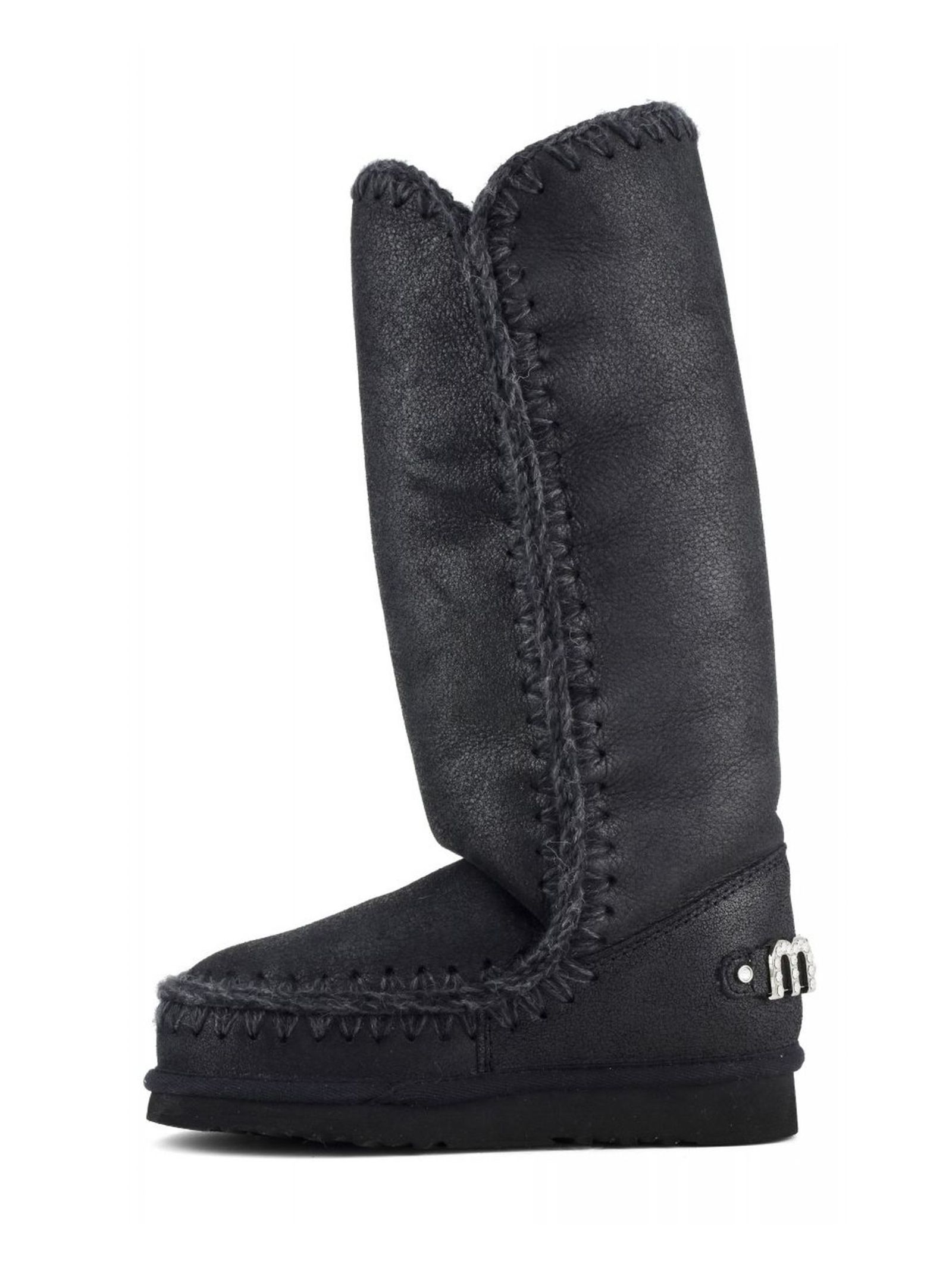 Cracked black double-face sheepskin Eskimo 40 with glitter logo, crocheted wool seams, a supportive heel counter and EVA & rubber outdoor sole. Height 40cm. Regular fit.