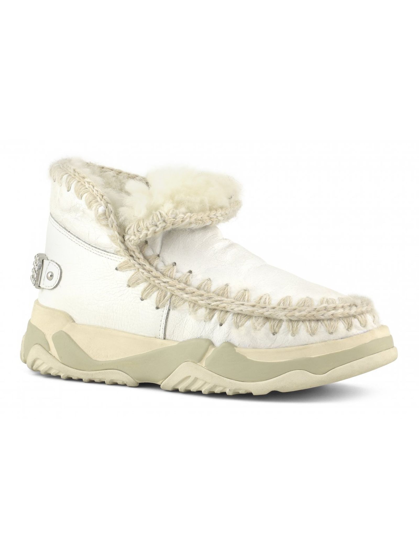 Eskimo trainer with rhinestone logo detail, white double-face sheepskin with mou trademark wool stitch embellishment, supportive heel-counter and lightweight EVA & rubber sole, height 14.5cm.