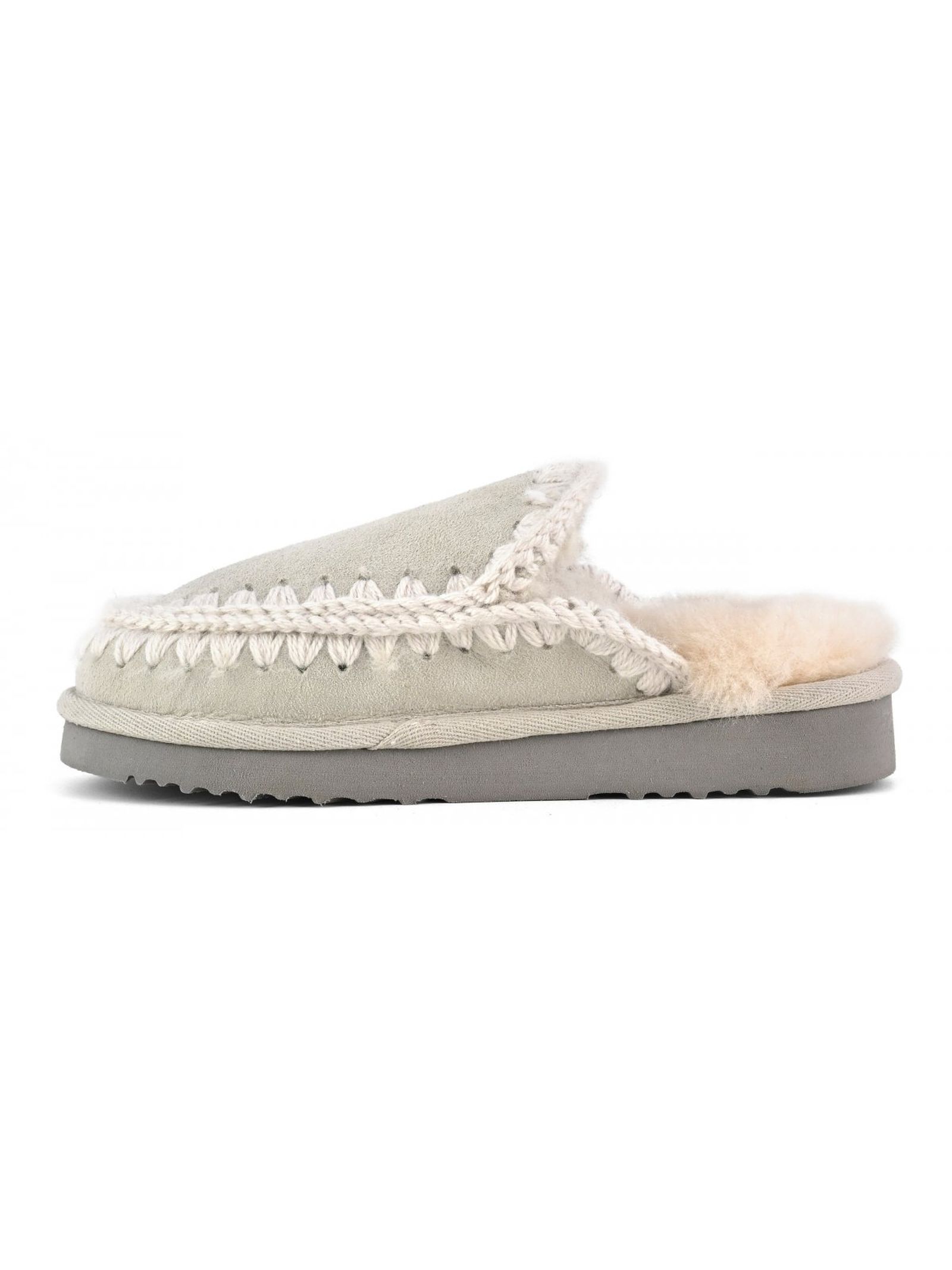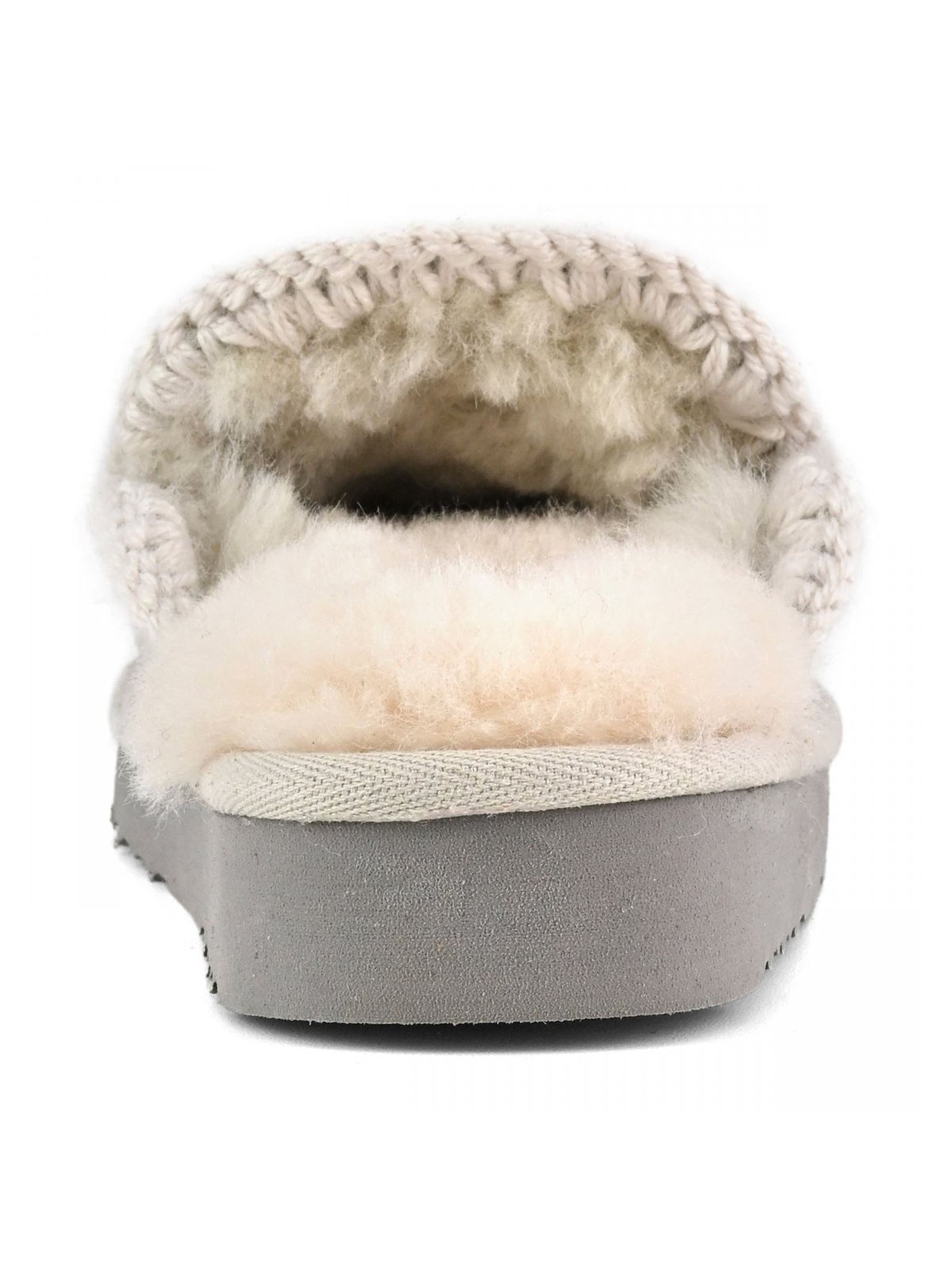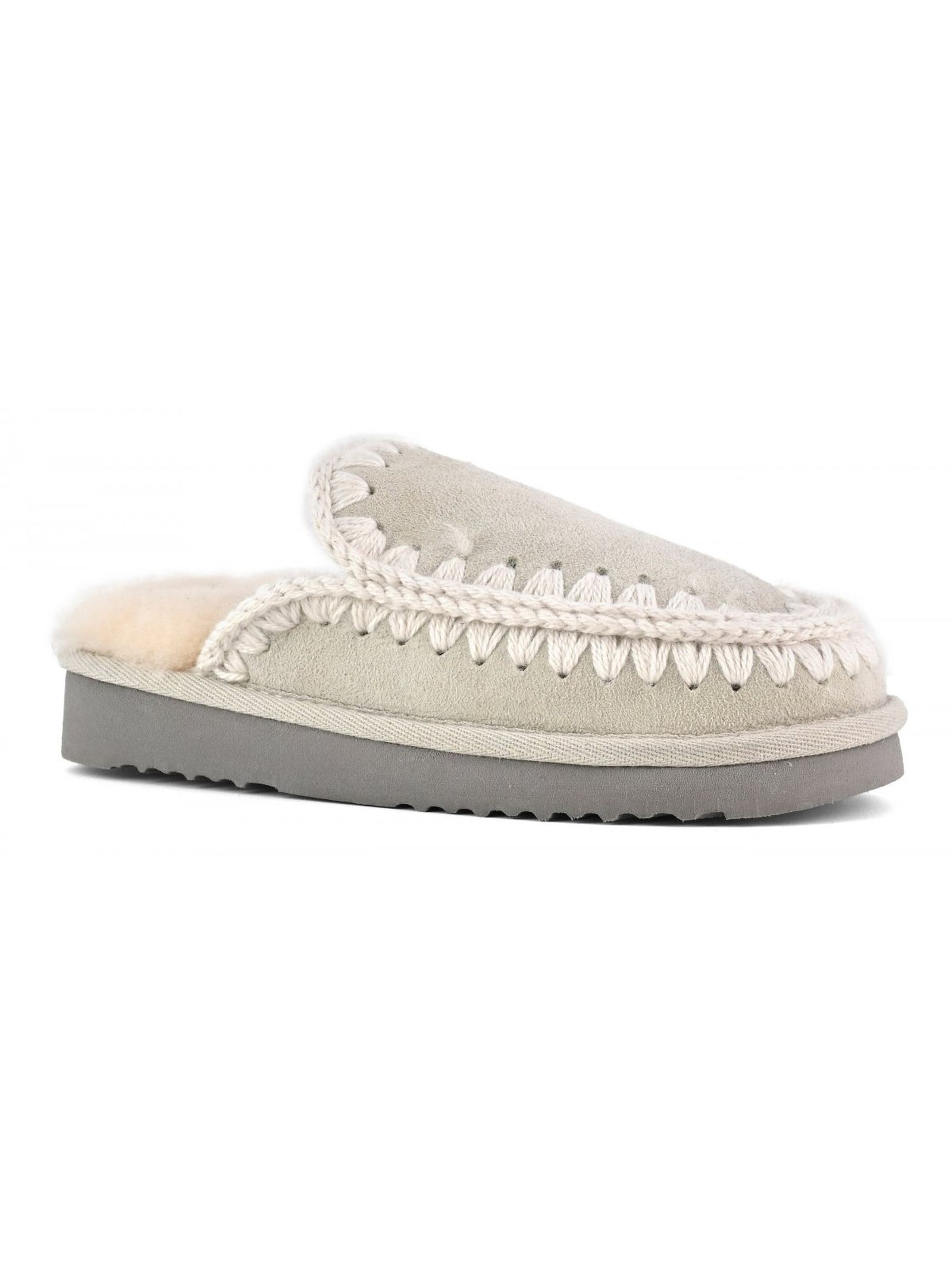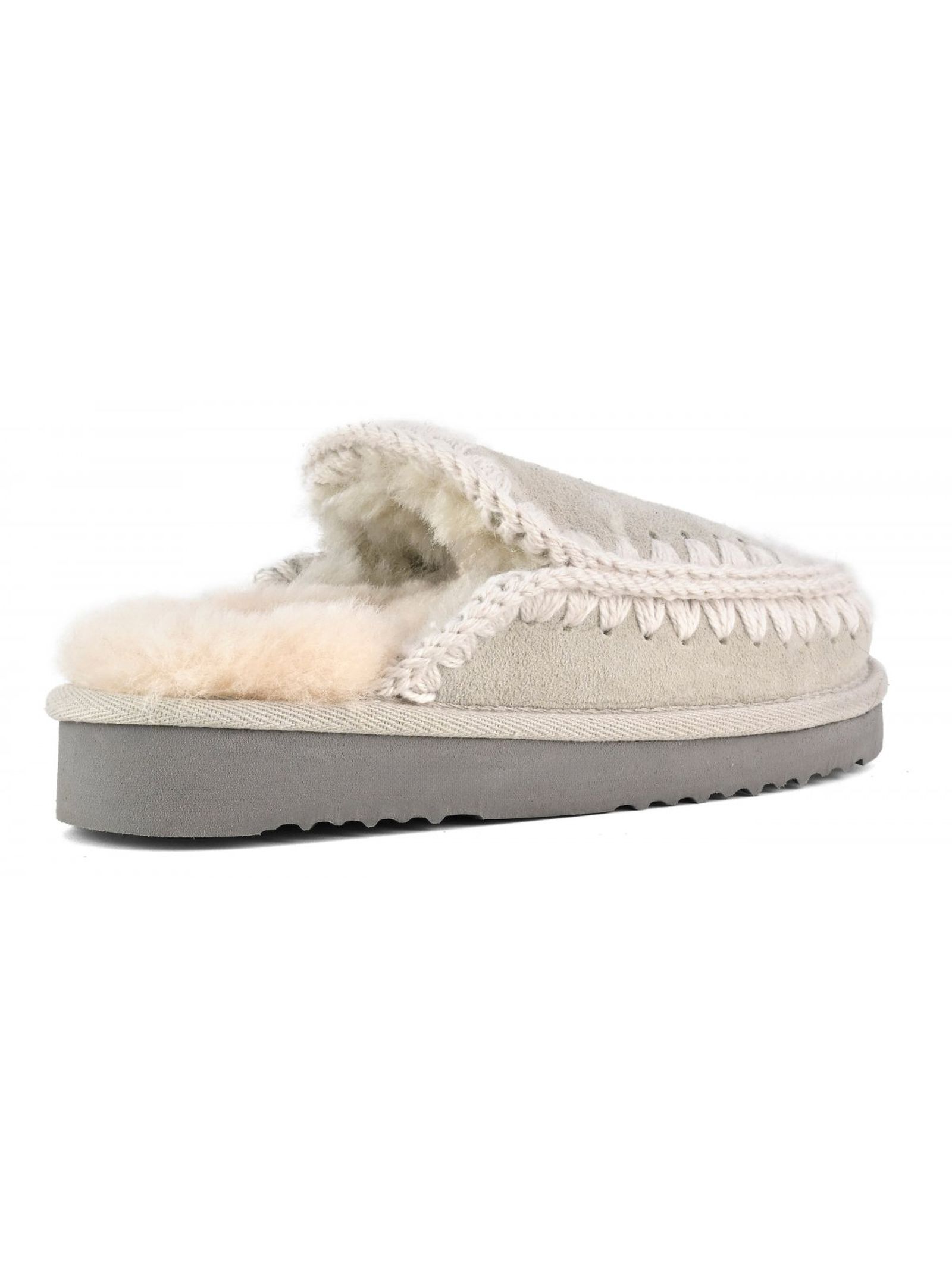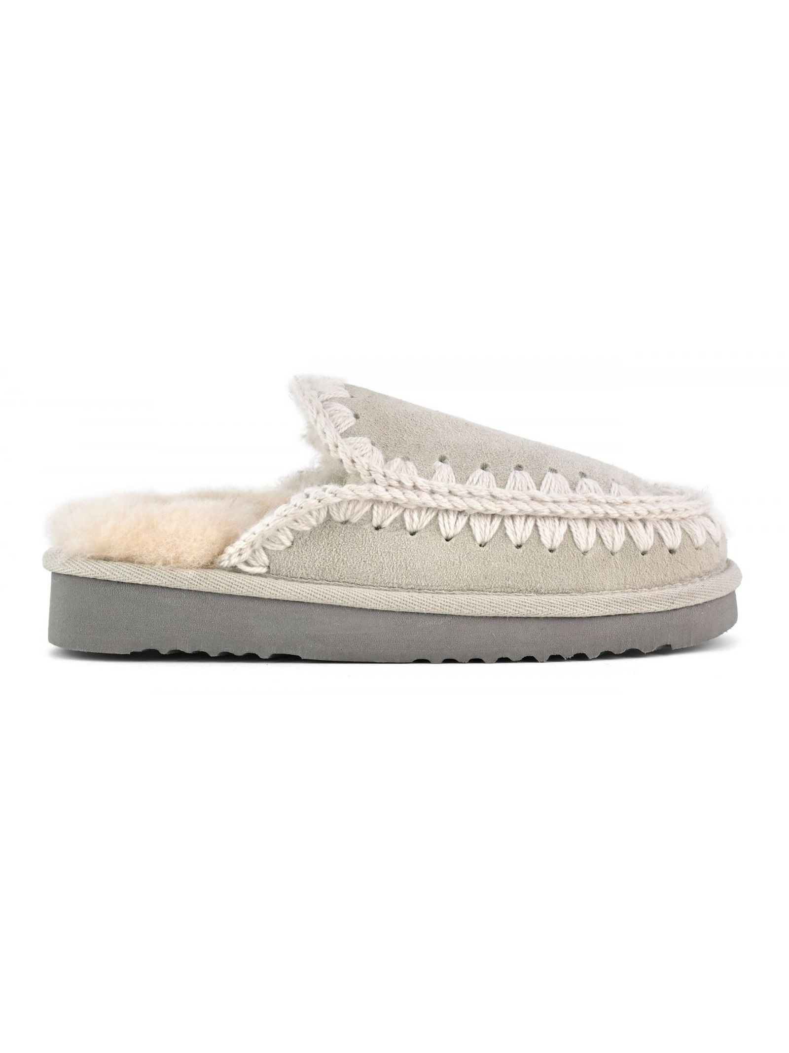 Grey Eskimo slipper in double-face sheepskin, hand-crochet wool stitching, EVA & rubber outsole