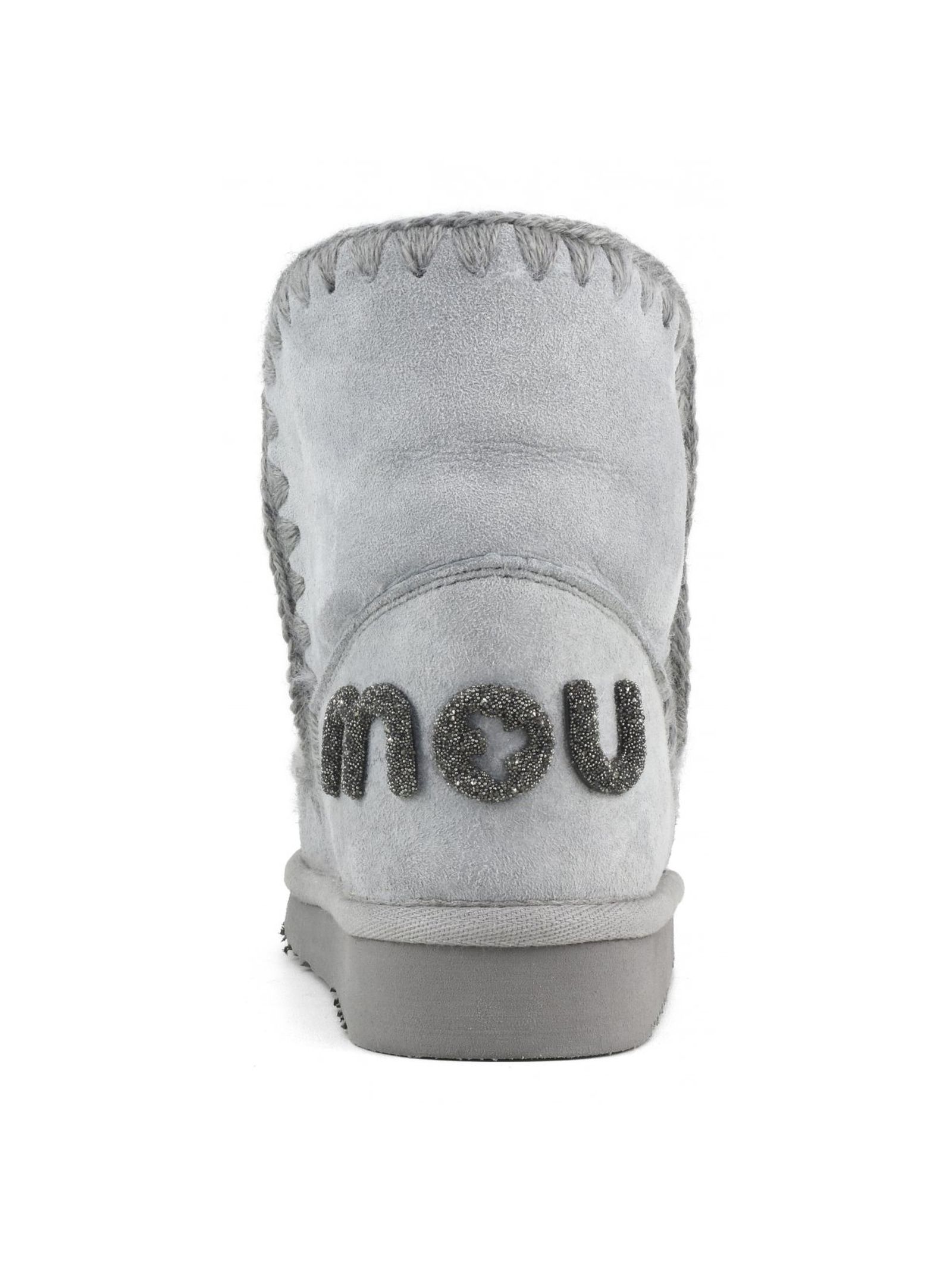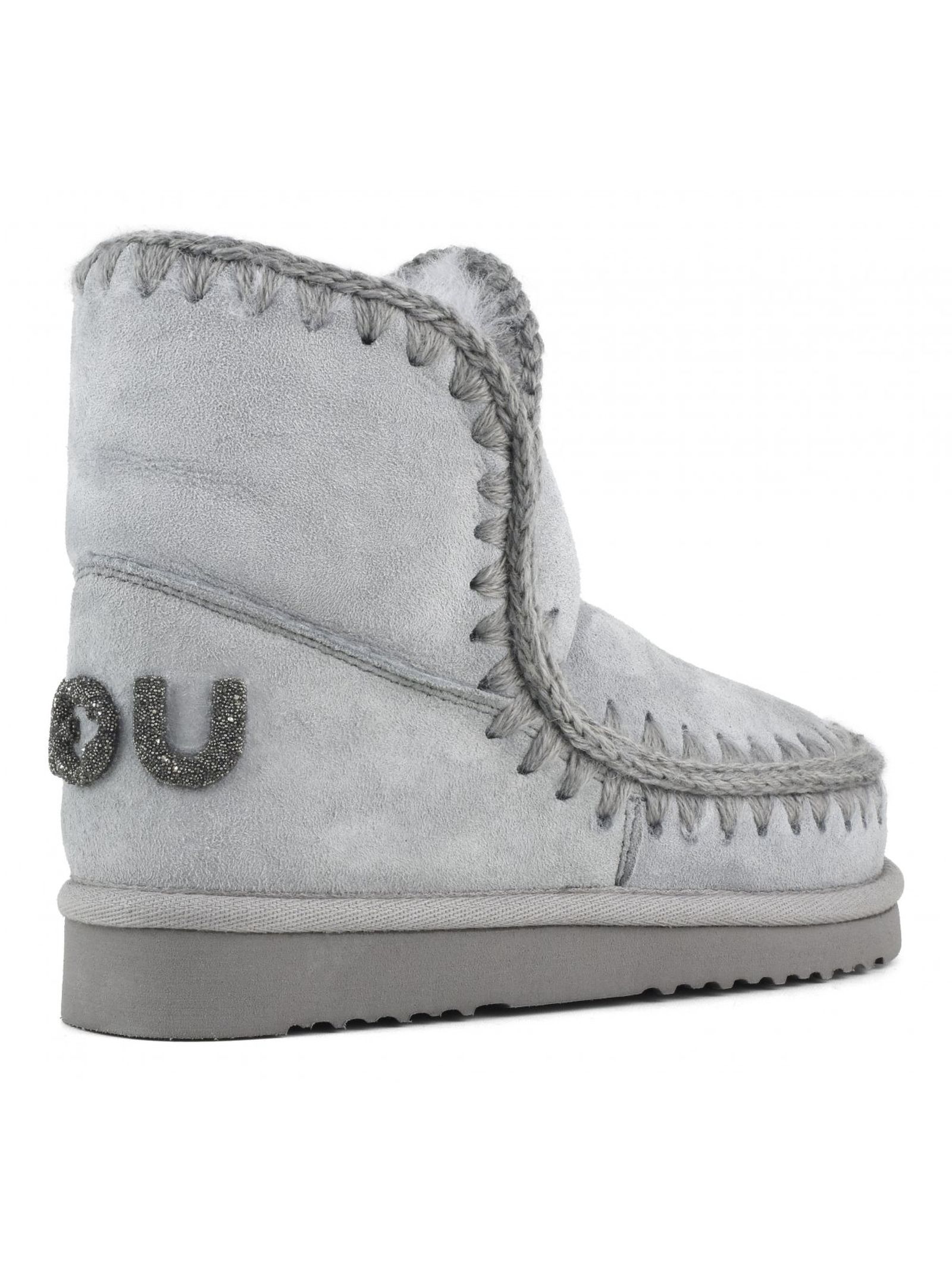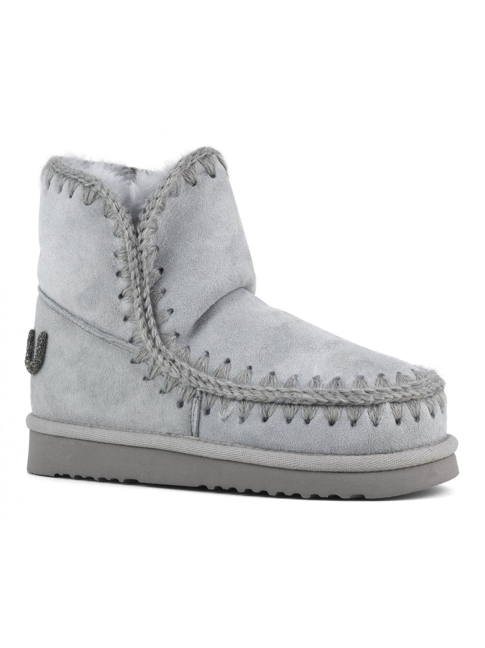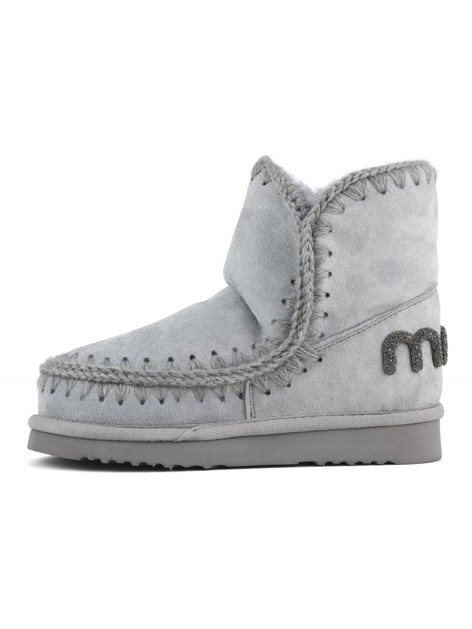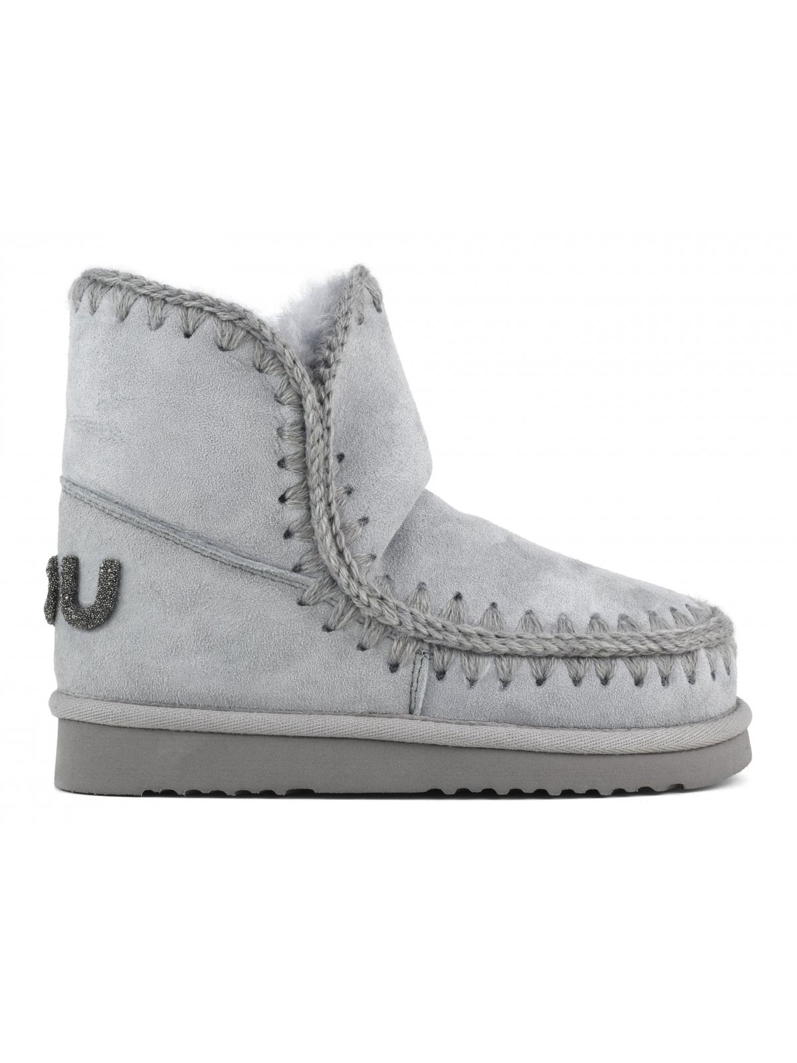 Light grey double-face sheepskin Eskimo 18 with glitter logo, crocheted wool seams, a supportive heel counter and EVA & rubber outdoor sole. Height 18cm. Regular fit.
