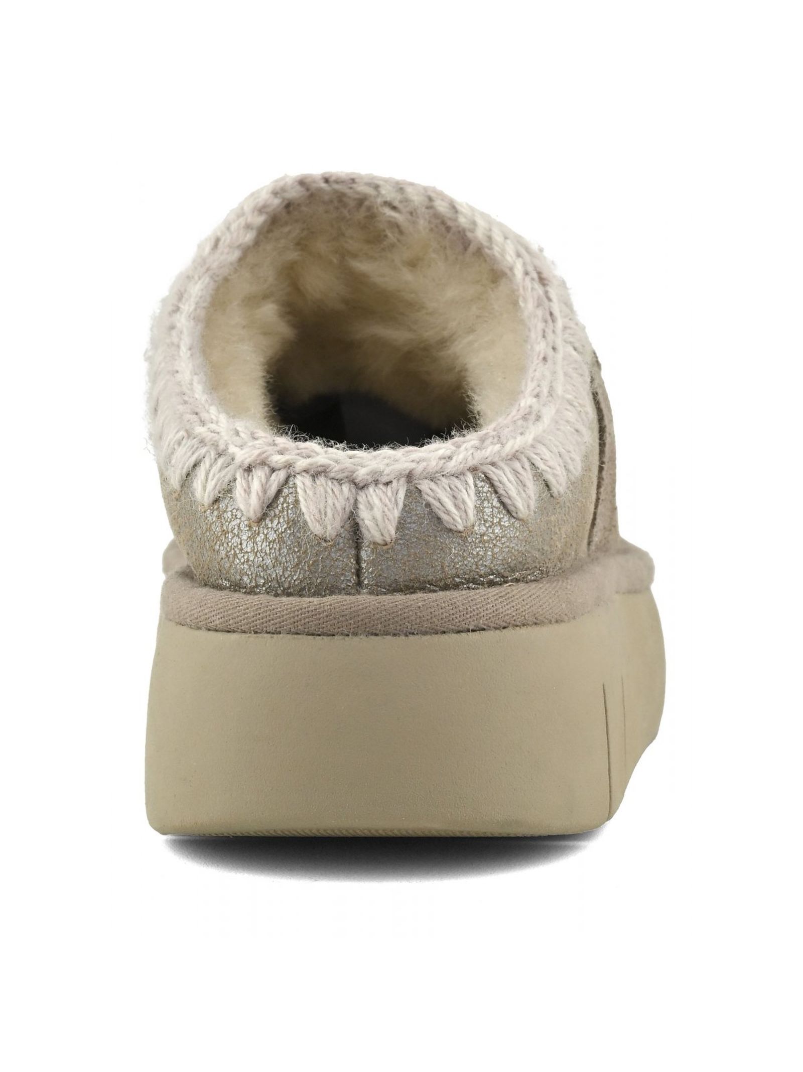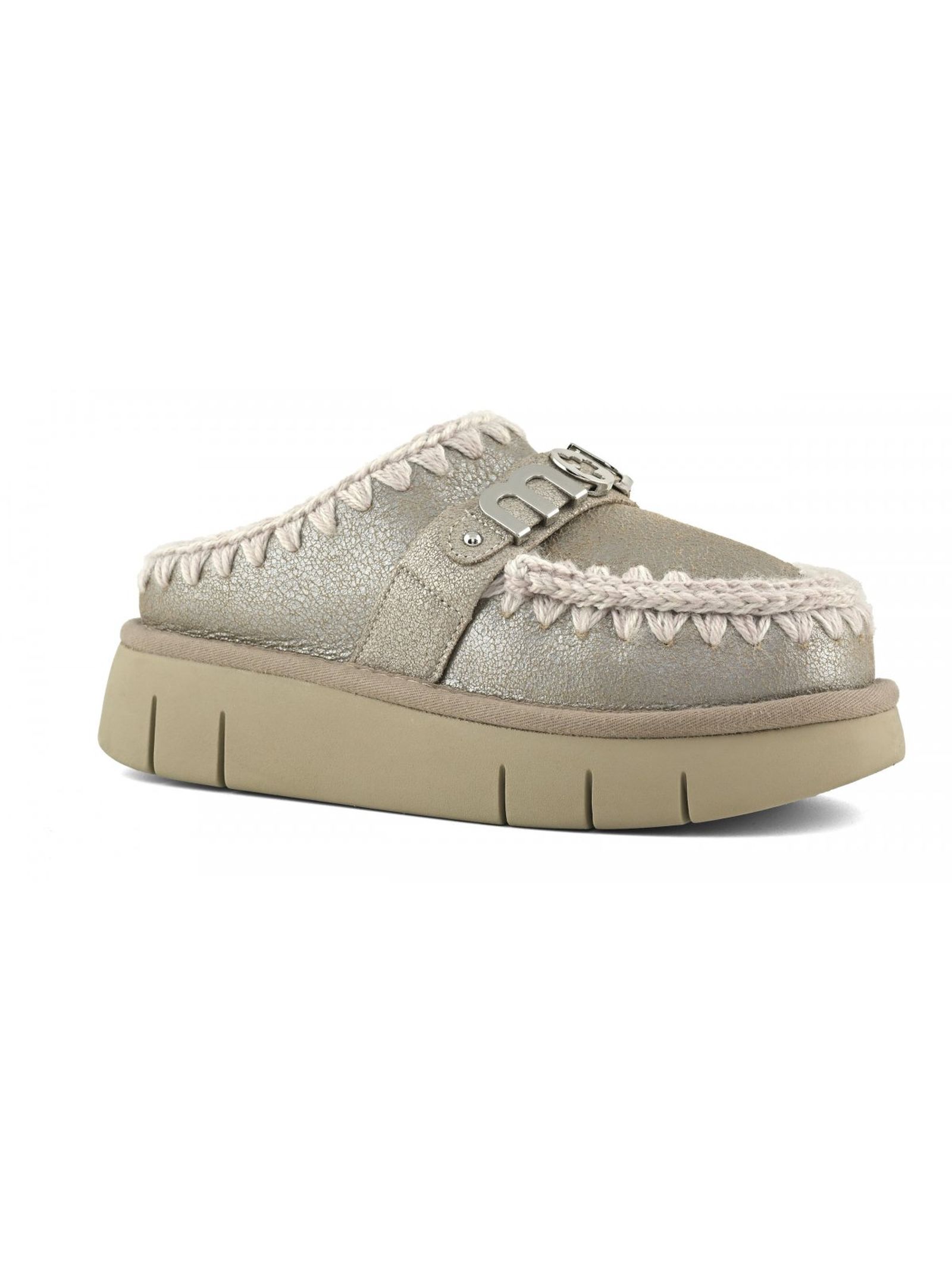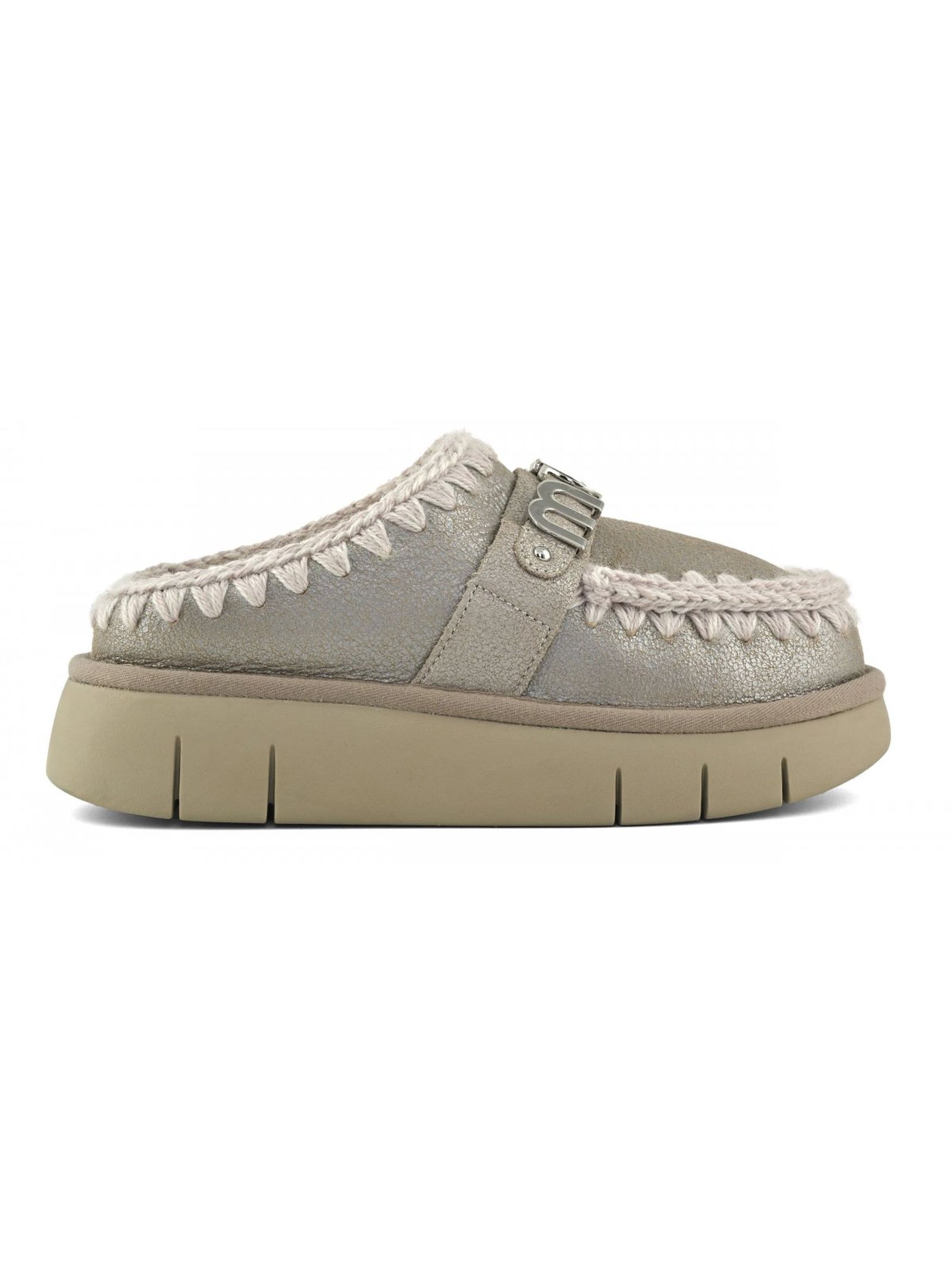 Stone Metalic double-face sheepskin bounce clog with metal logo, mou trademark hand-crochet wool stitching, padded leather insole and lightweight EVA rubber sole