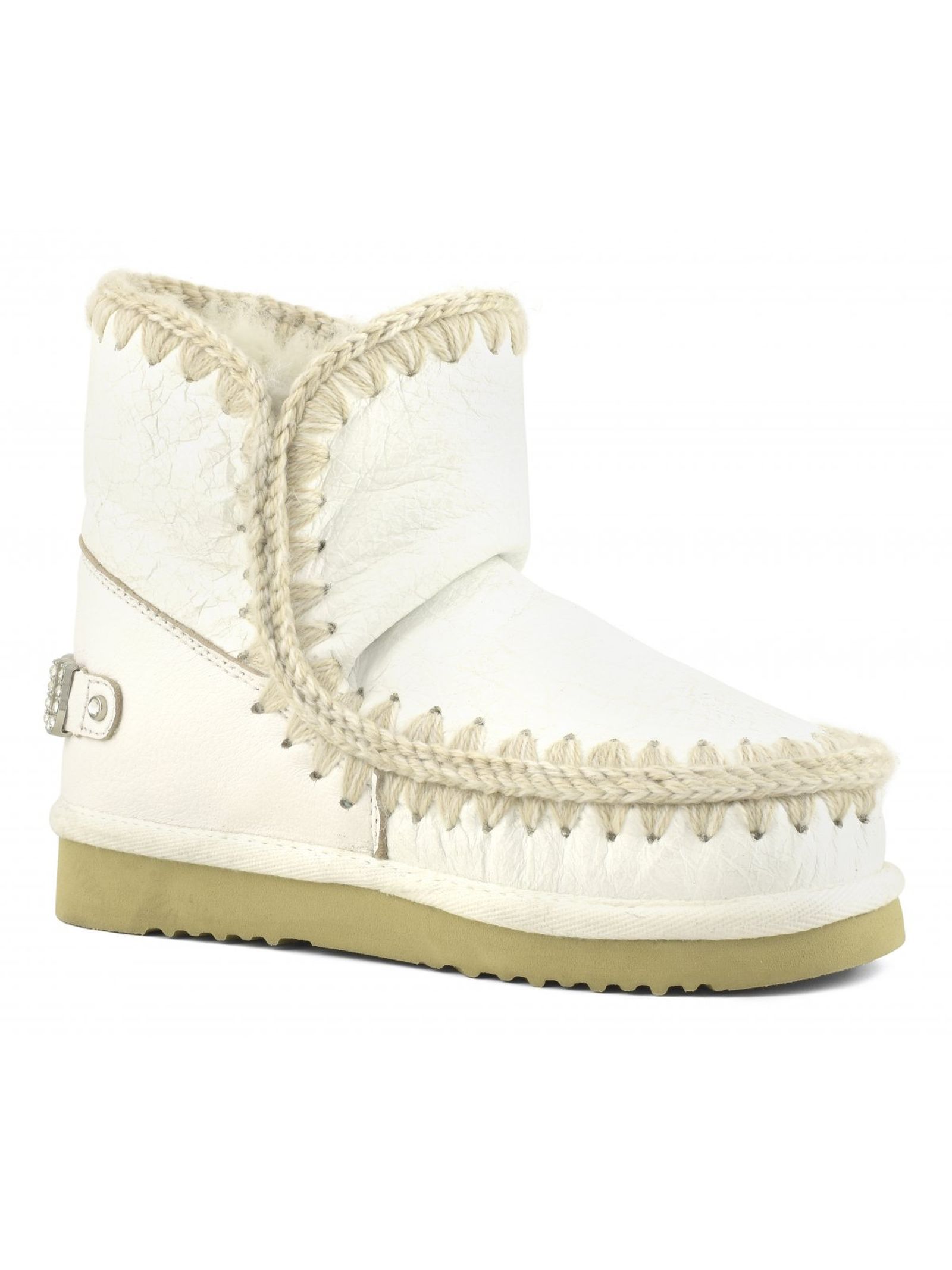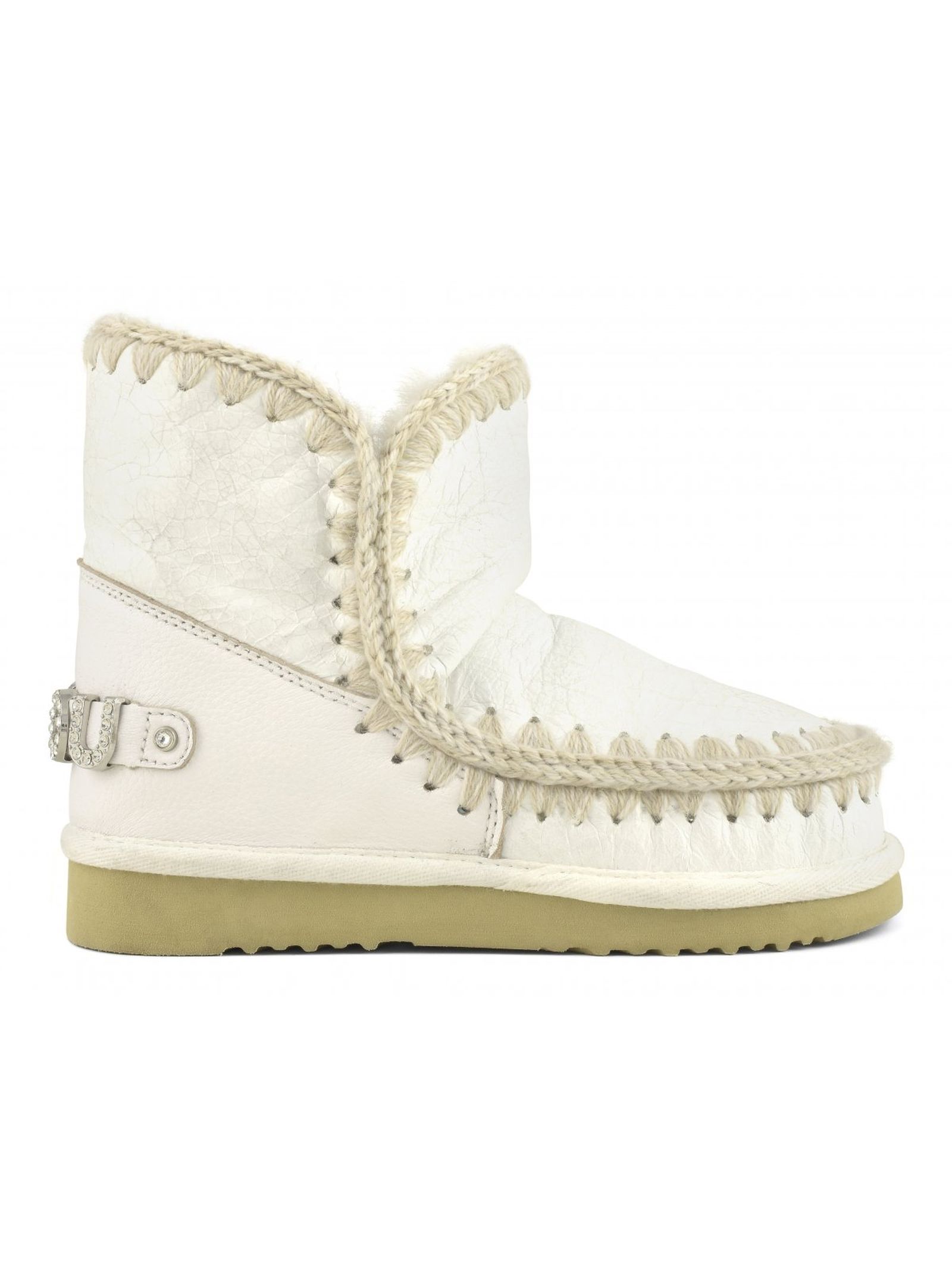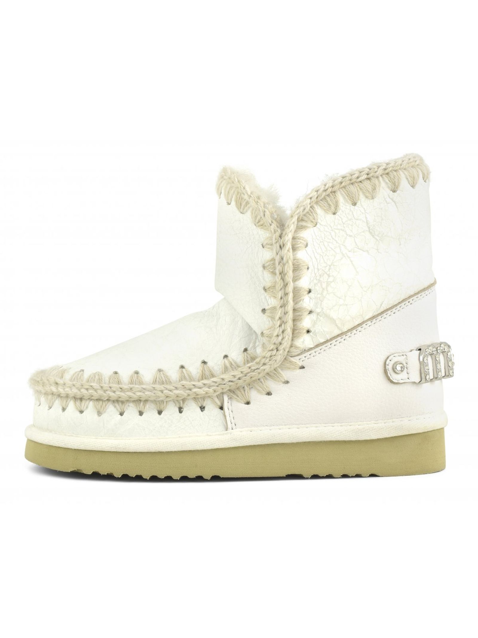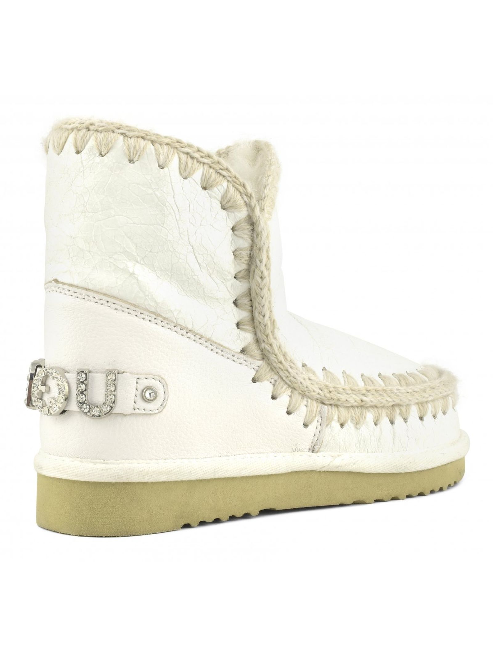 White double-face sheepskin Eskimo 18 with rhinestone logo, crocheted wool seams, a supportive heel counter and EVA & rubber outdoor sole. Height 18cm. Regular fit.