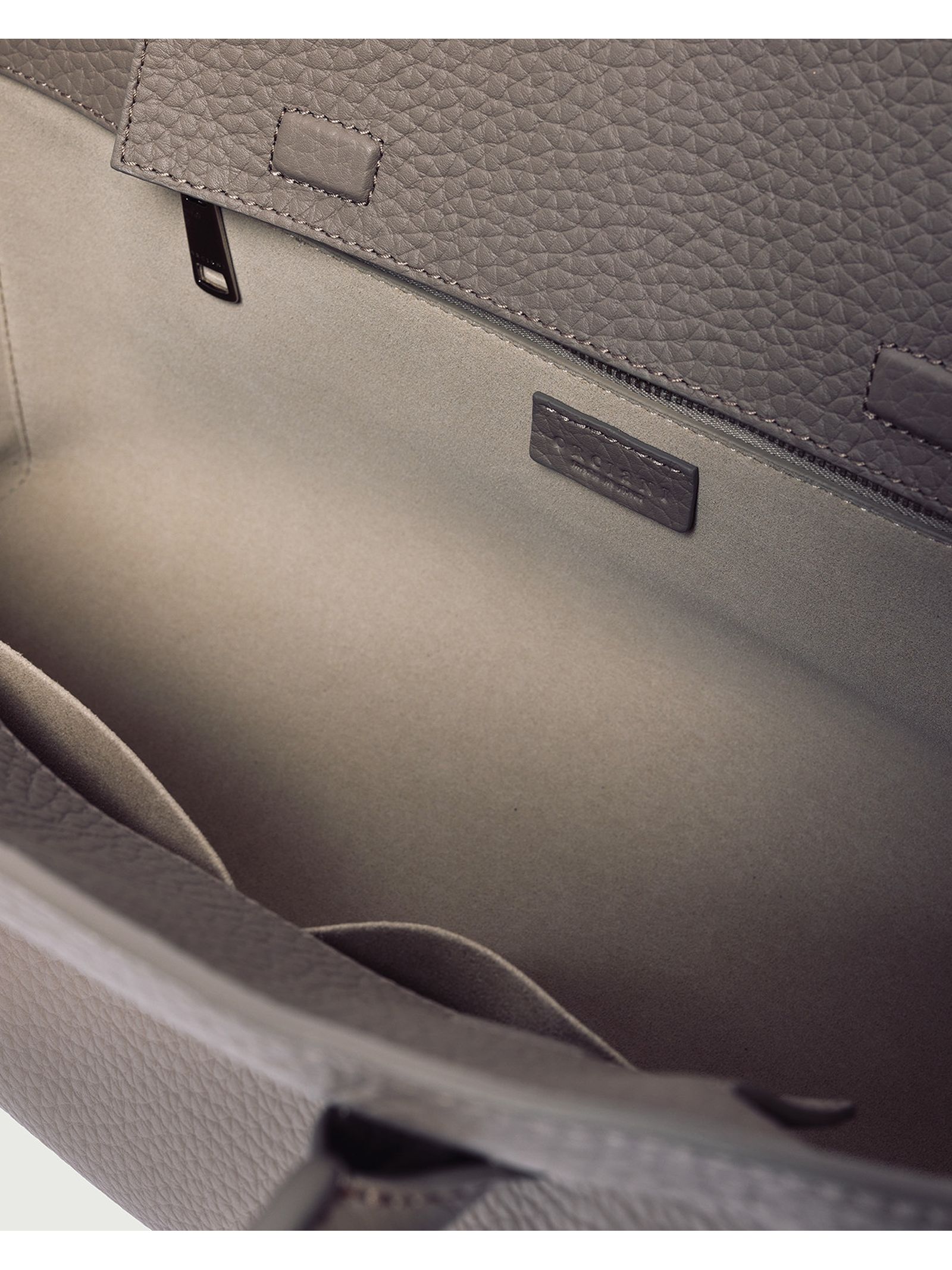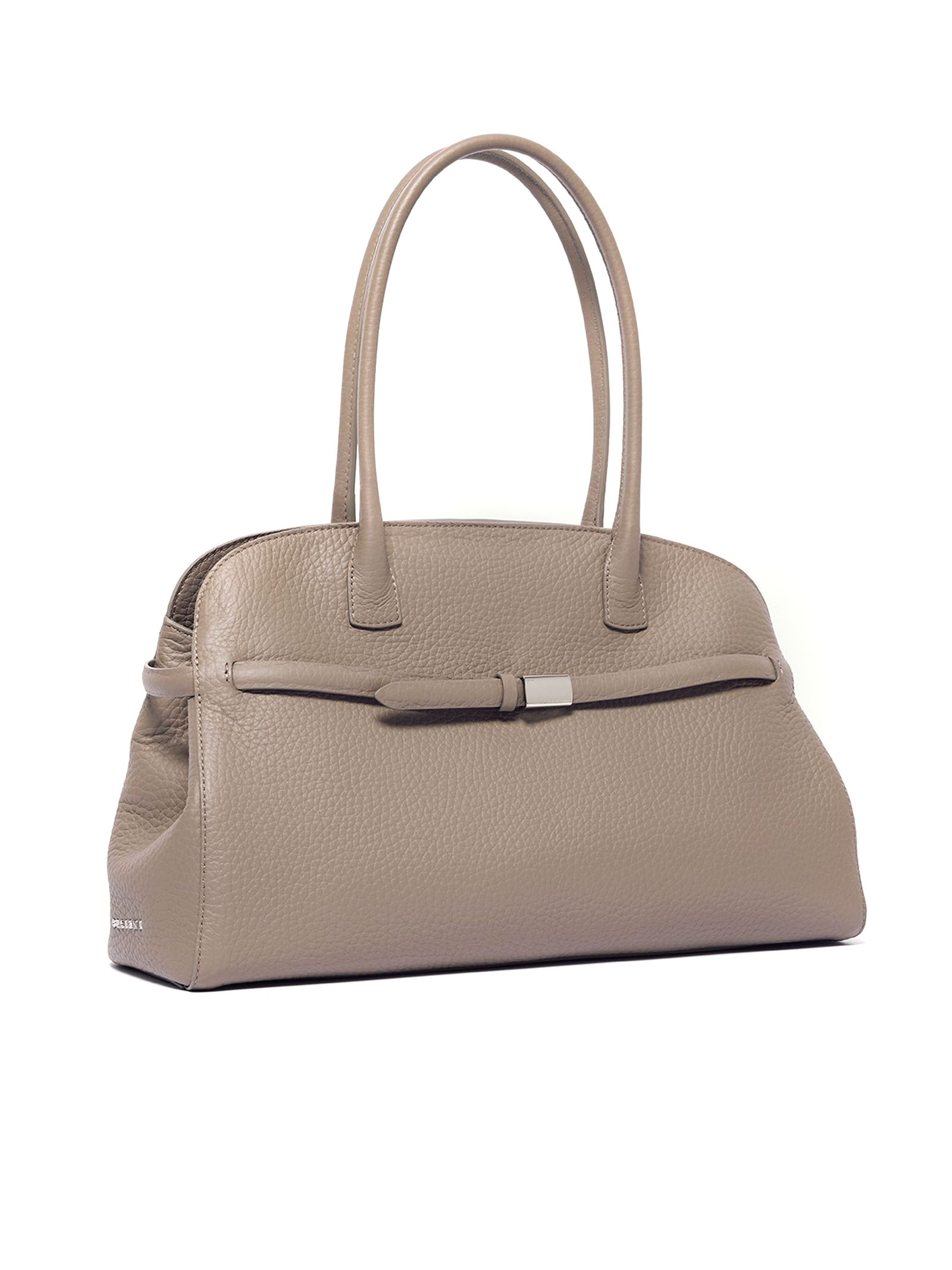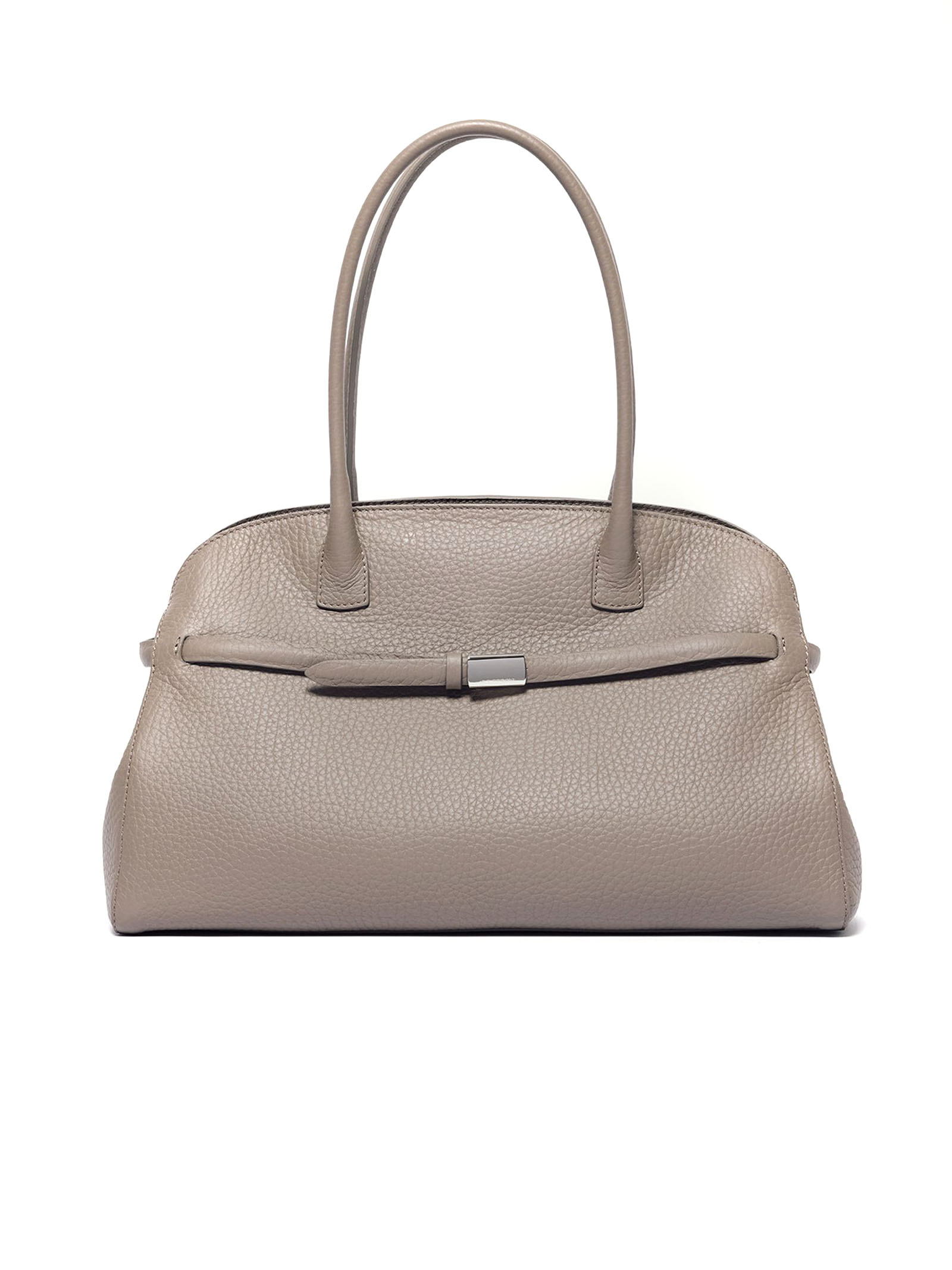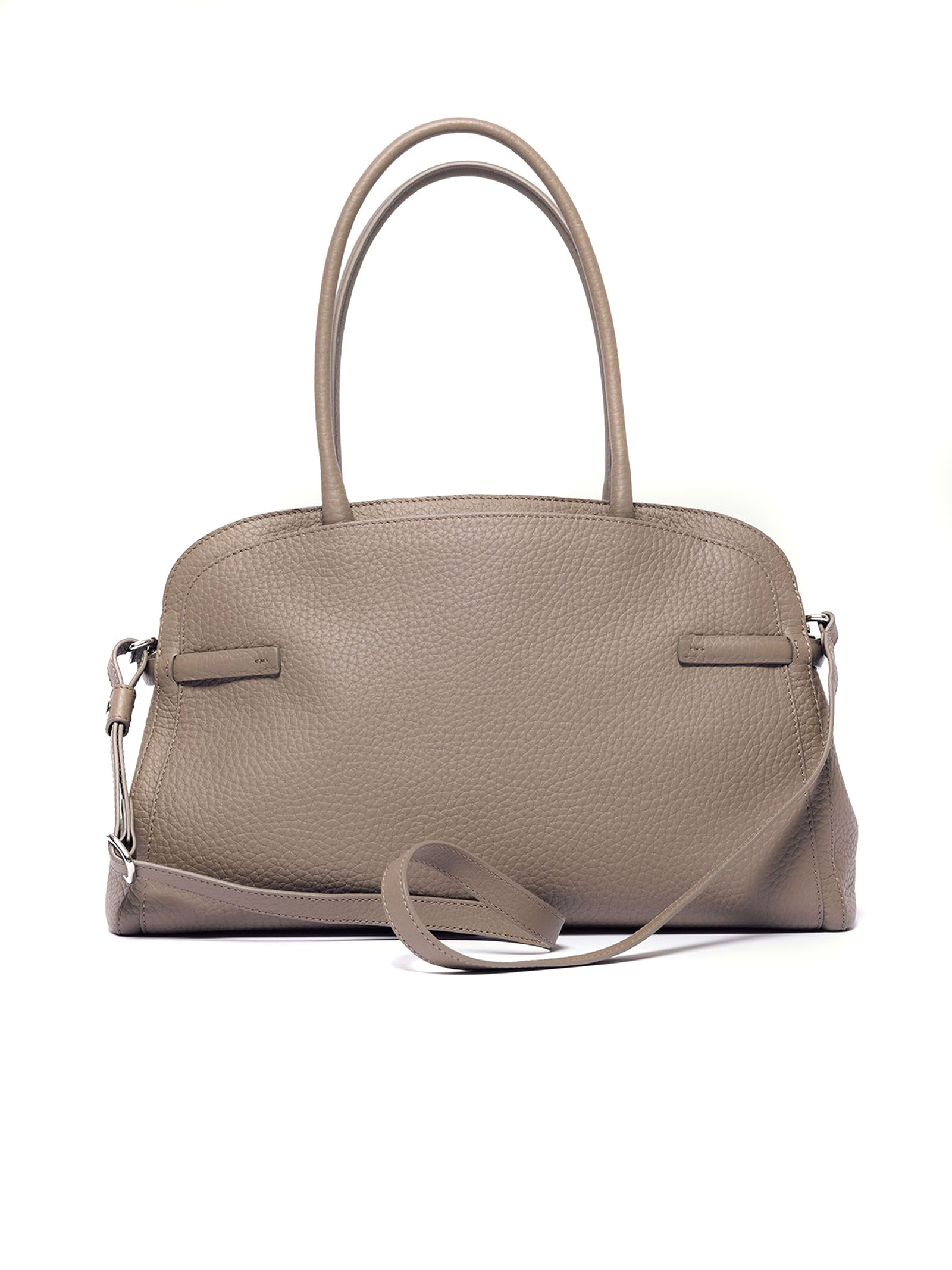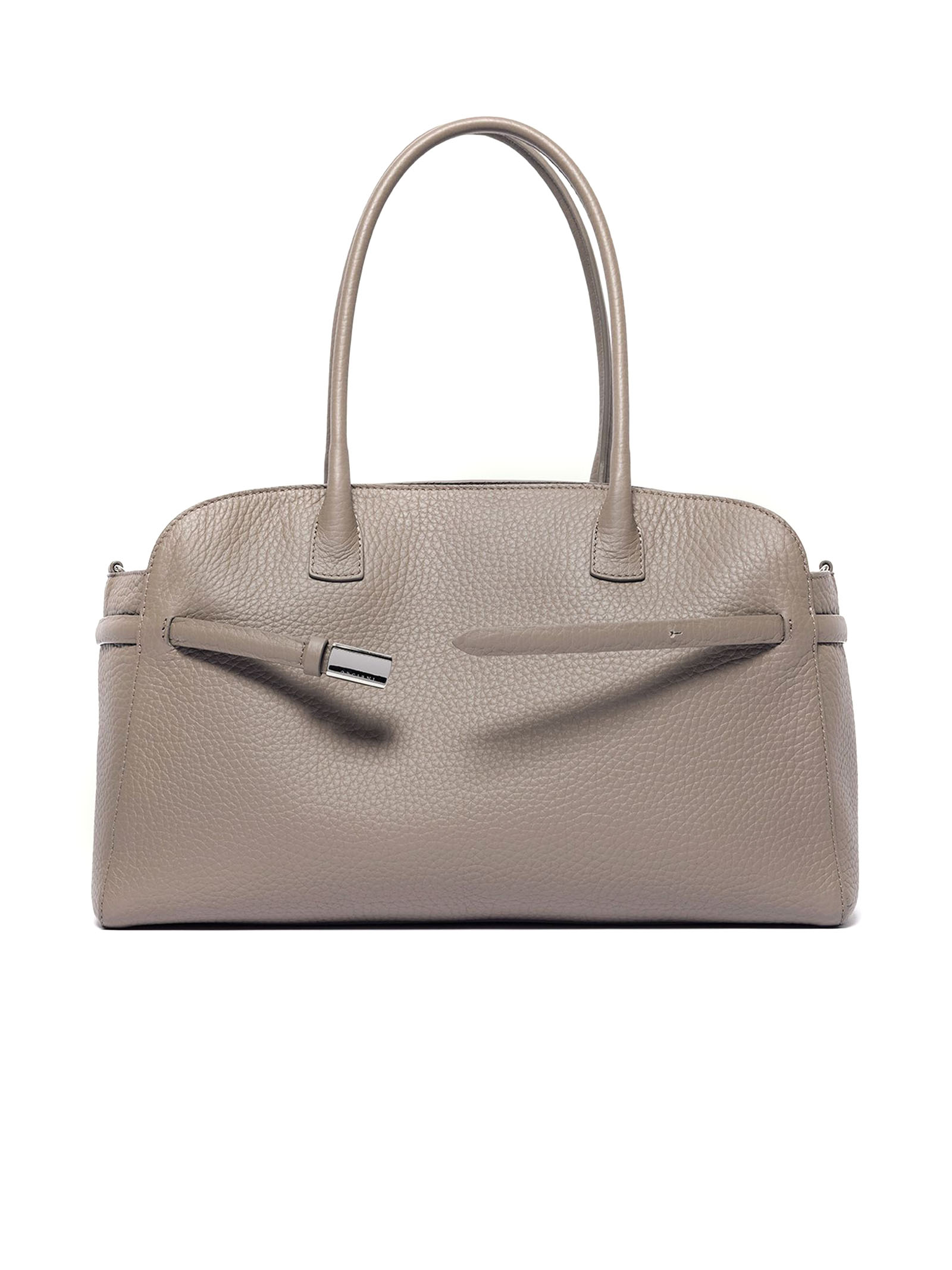 Aura Soft Large taupe grained leather shoulder bag, Dimensions: Width: 41 cm, Height: 26 cm, Depth: 14 cm, Pockets: 1 external; 3 internal, one of which is zippered, closure: magnetic buttons, features: double top handle, additional adjustable shoulder strap, details: palladium finish hardware