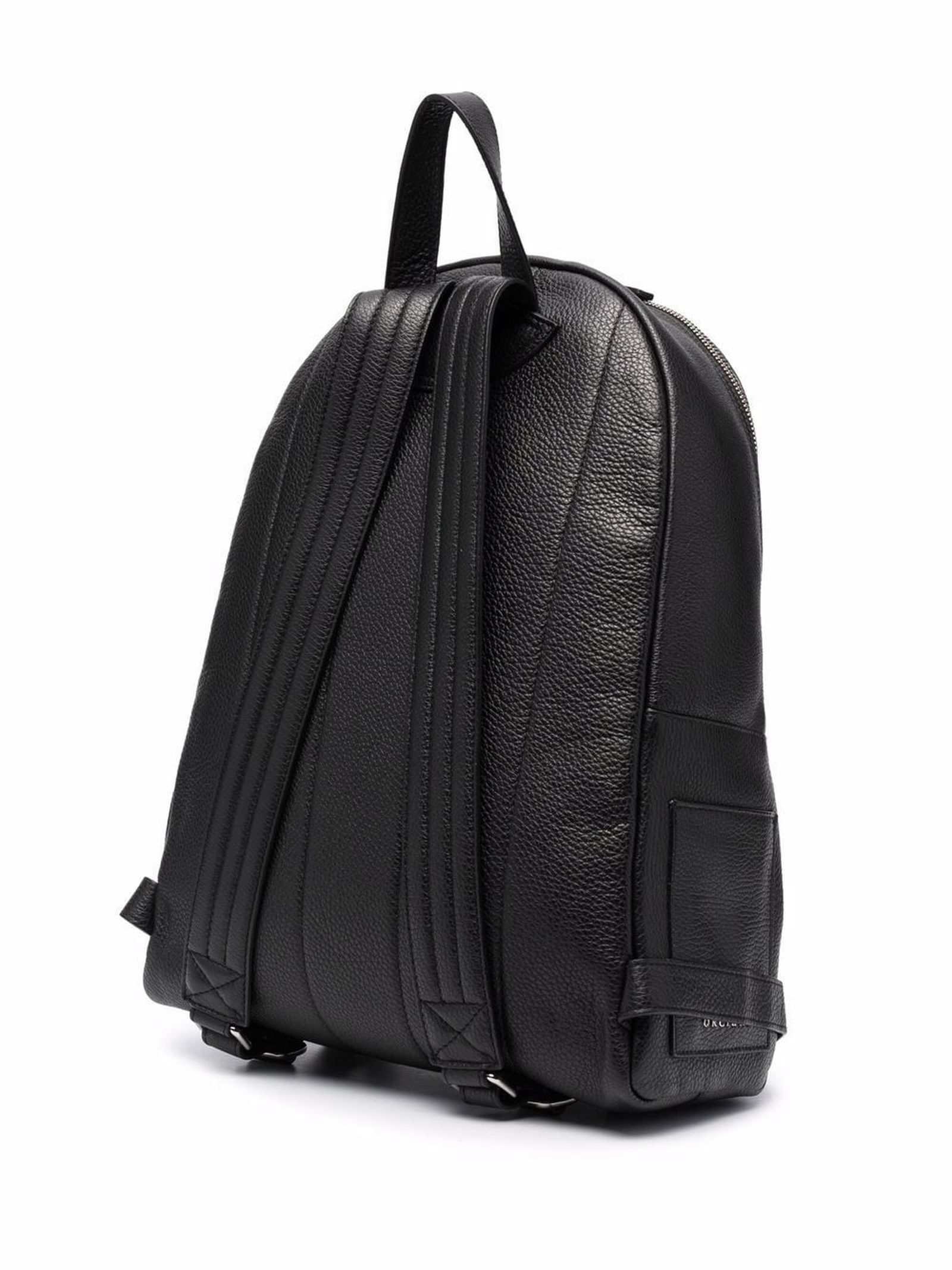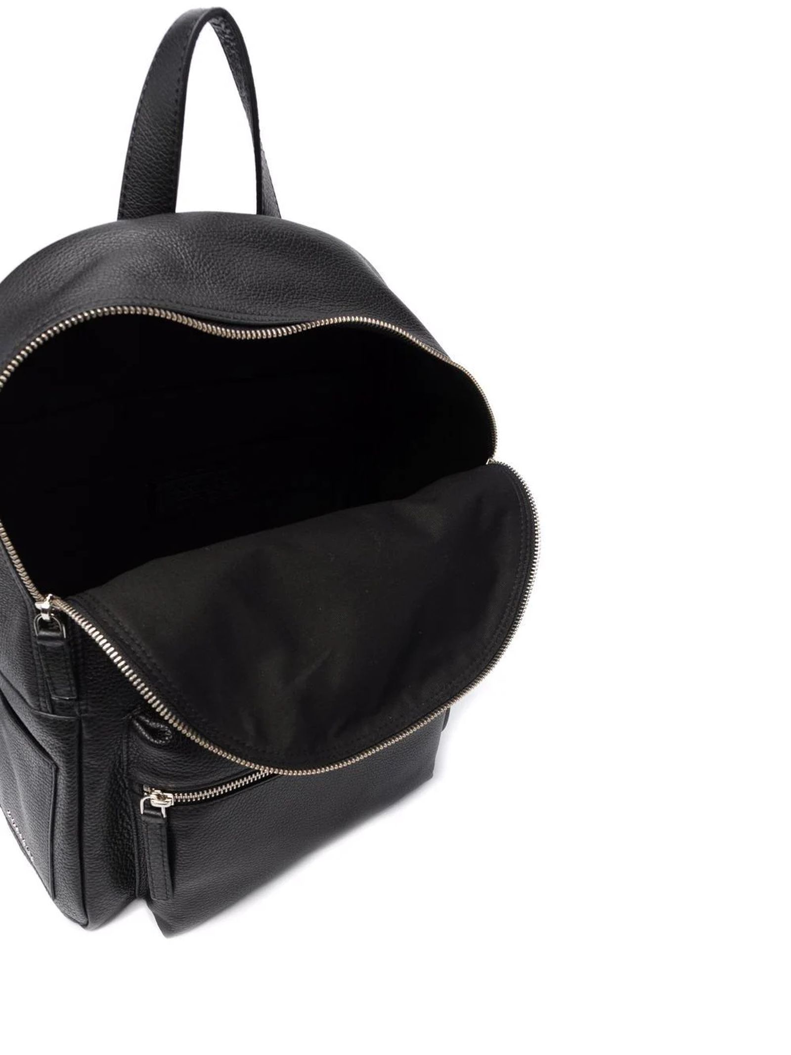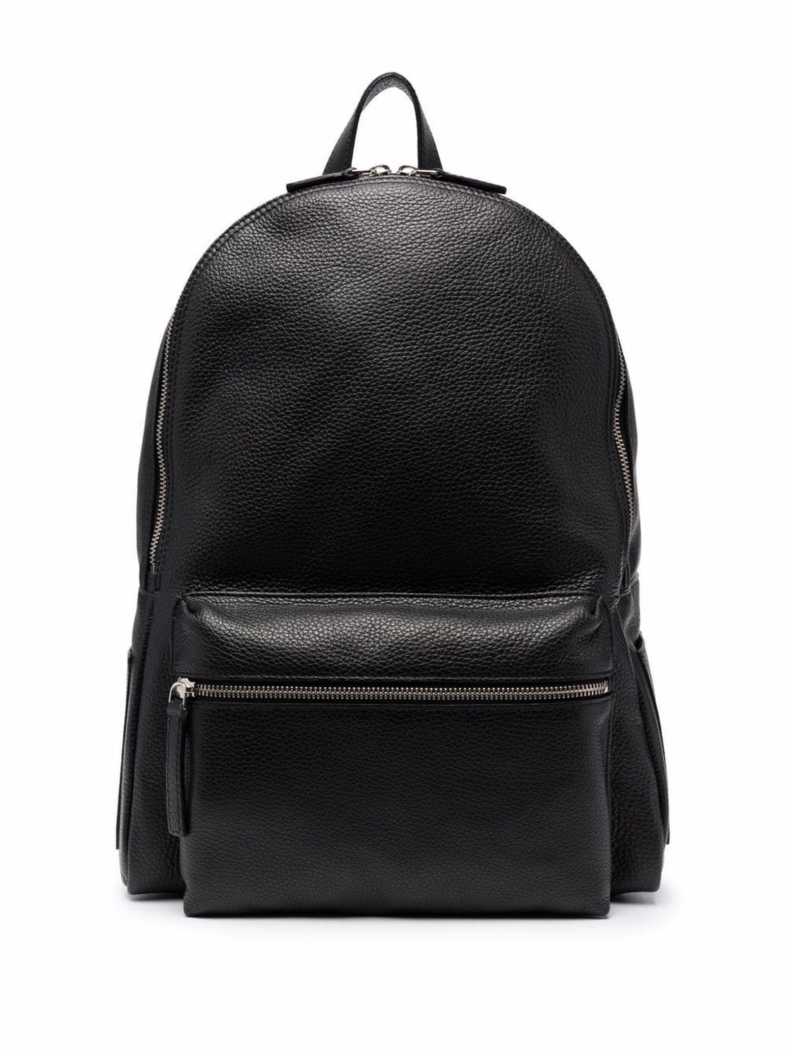 Black calf leather Micron backpack, grained texture, silver-tone logo lettering, internal logo patch, all-around zip fastening, two padded adjustable shoulder straps, loop handle, front zip-fastening pouch pocket, two side patch pockets, main compartment and multiple internal slip pockets, width: 33 cm, height: 40 cm, depth: 14 cm, Calf Leather 100%