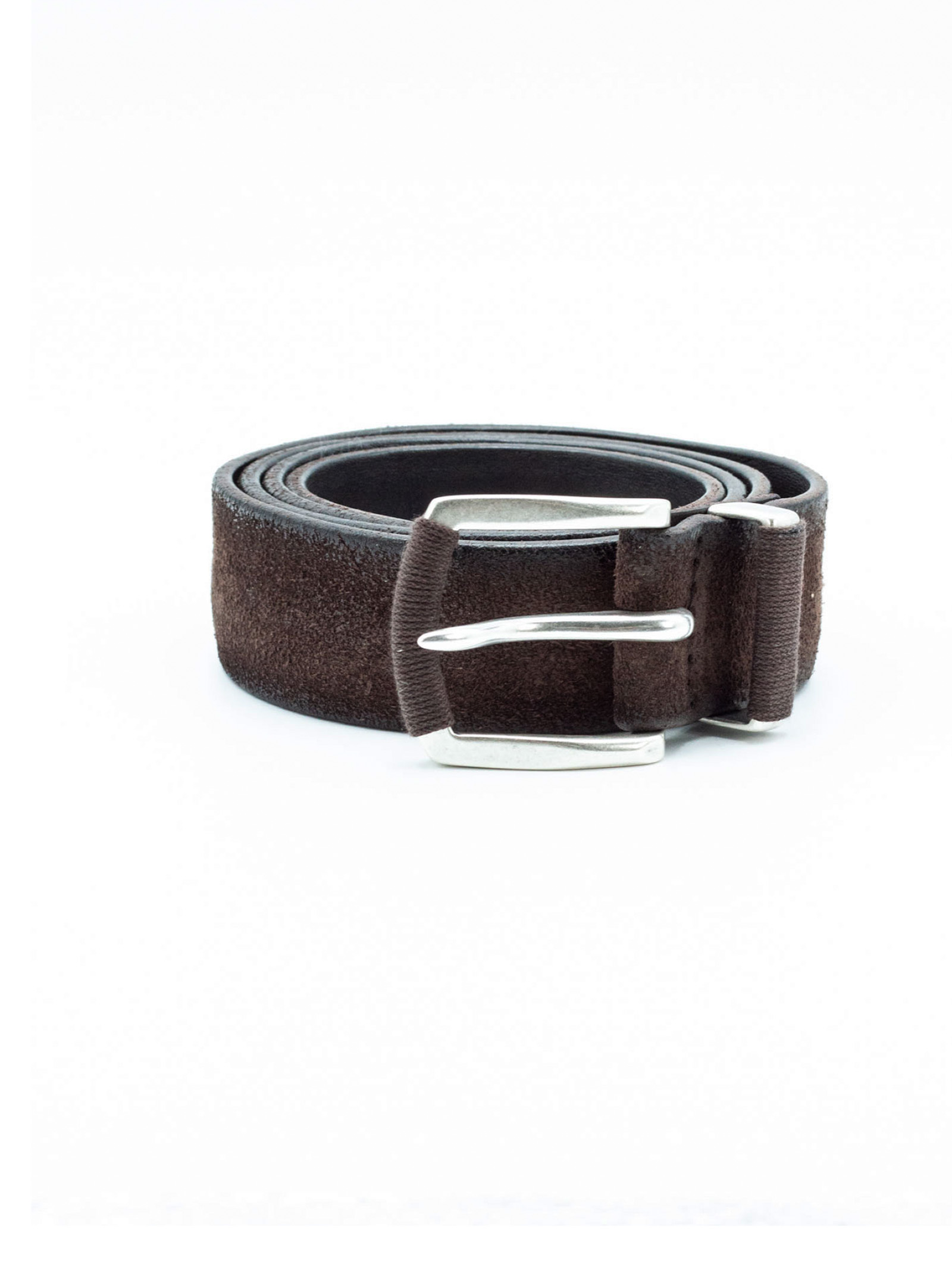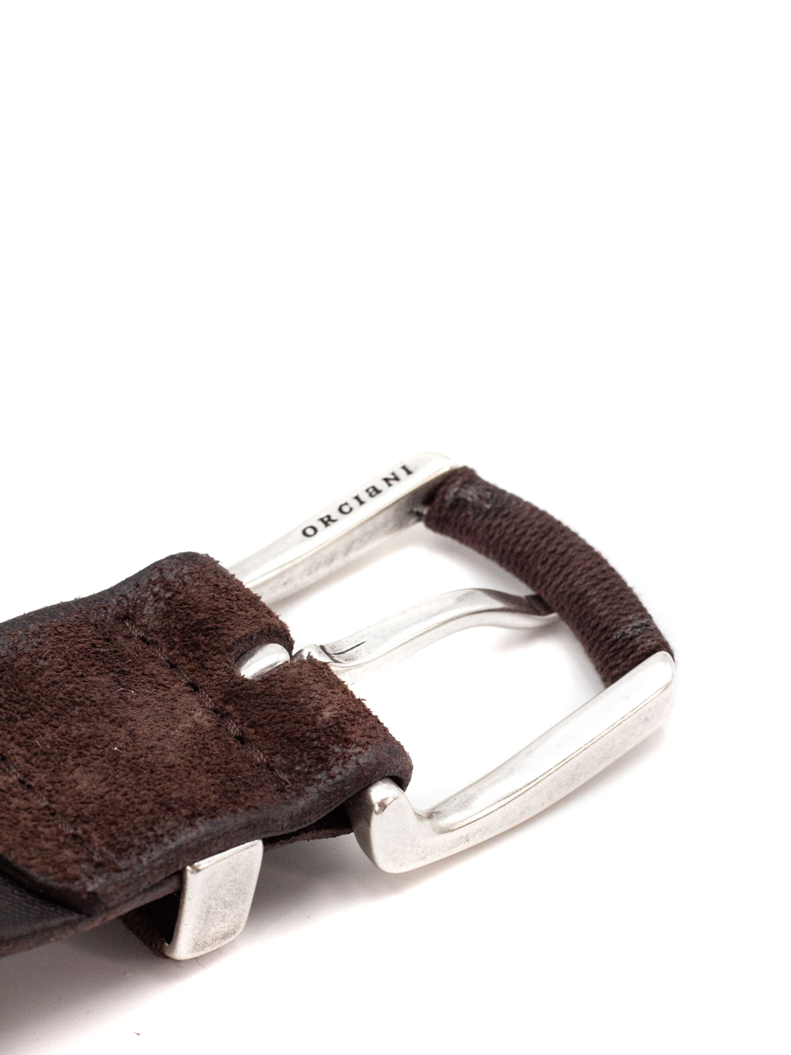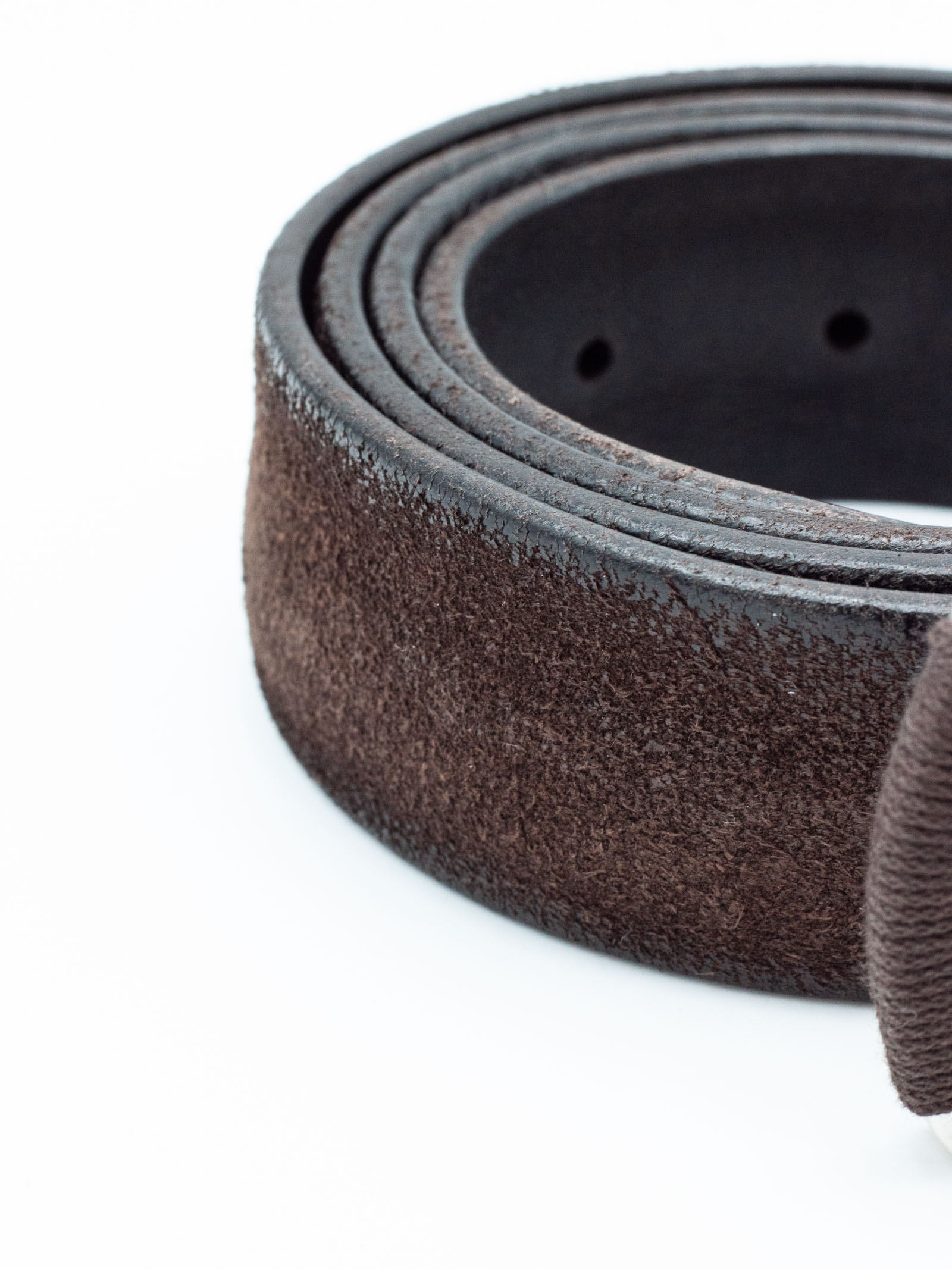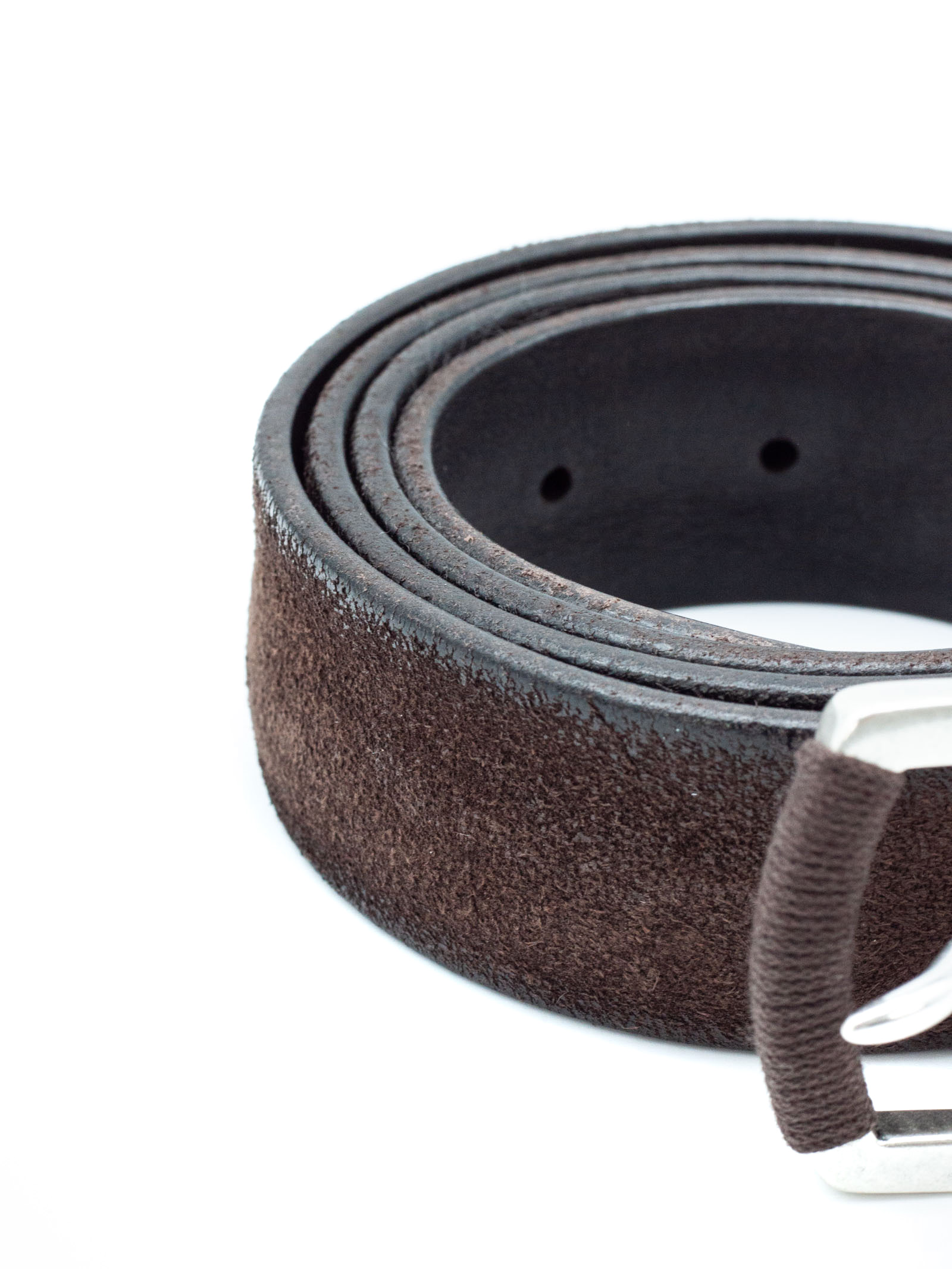 Soft brown suede belt with silver-coloured metal buckle, height 3 cm