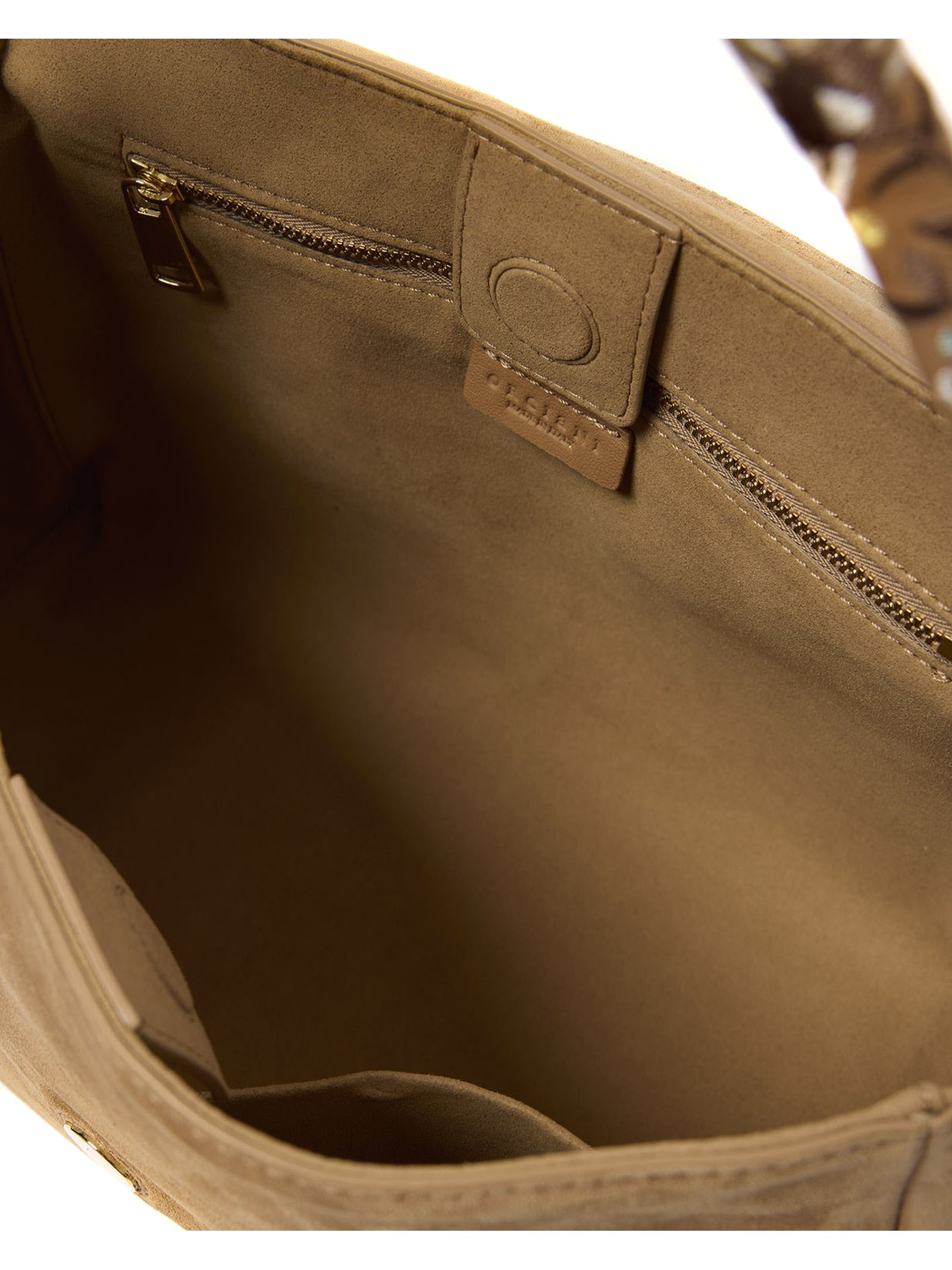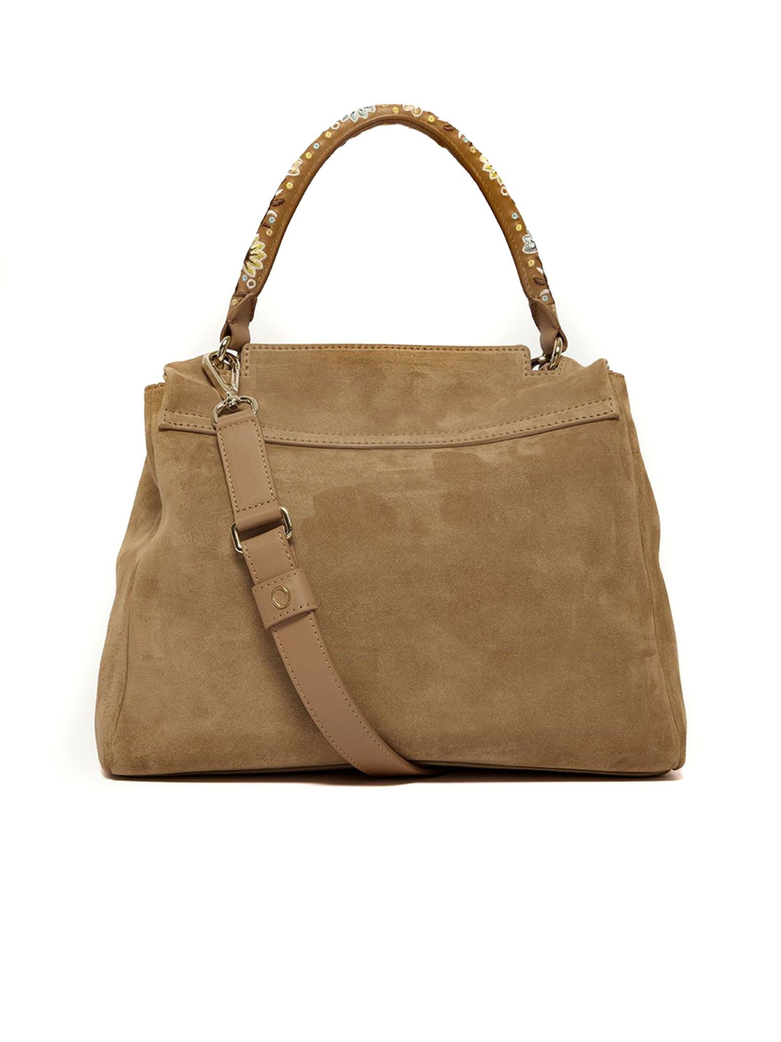 Sveva Peach Flowers Midi suede leather shoulder bag, Pockets: 3 interior, one with zip, Closure: flap with internal magnetic button, Features: hidden open pocket on the upper part of the flap / adjustable removable strap, Material: suede leather / embroidered smooth calf leather handle, Details: pale gold finish hardware, Dimensions: Width: 32 cm / Height: 24 cm / Depth: 15 cm