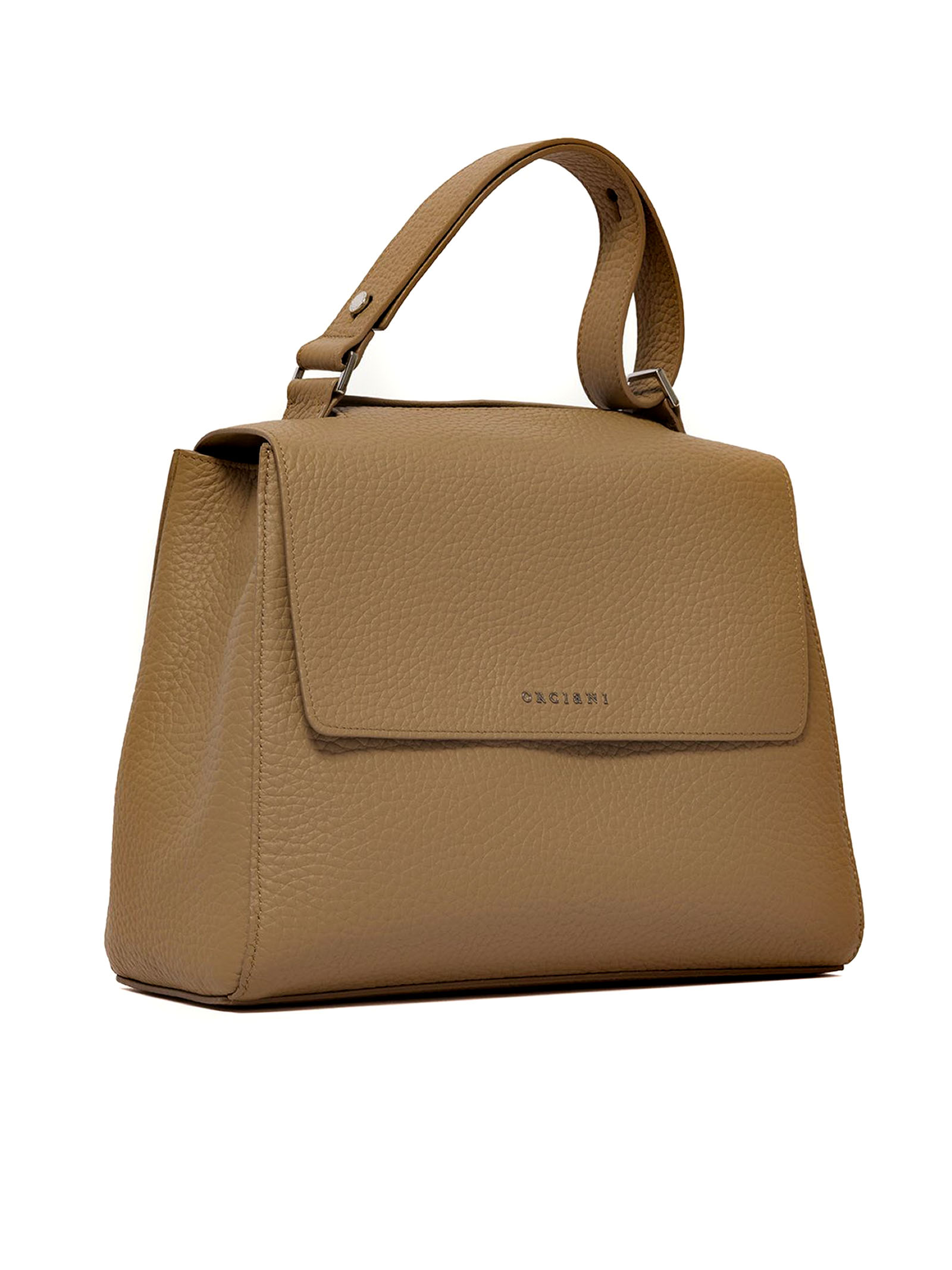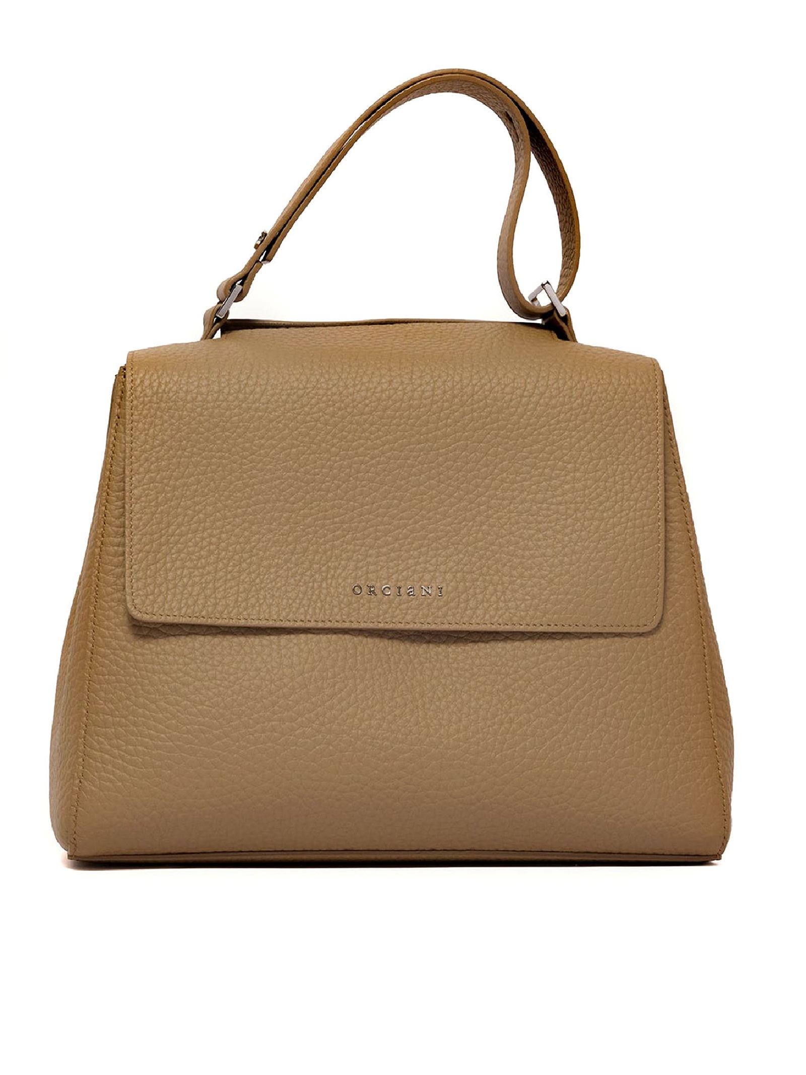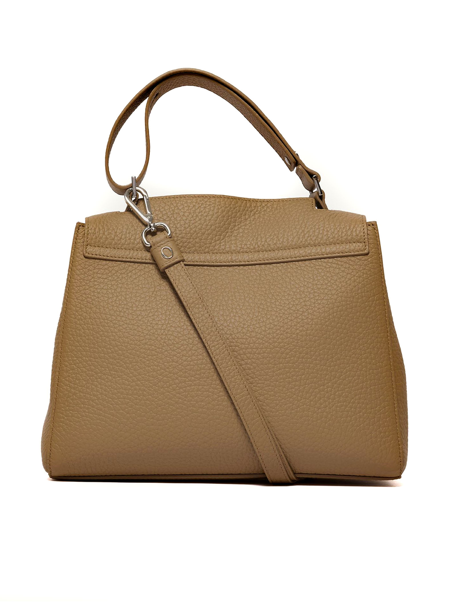 Sveva Soft Medium brown leather shoulder bag, 3 interior pockets, one of which is zippered, closure flap with magnetic button, extendable handle and removable shoulder strap, palladium finish, width: 32 cm, height: 24 cm, depth: 15 cm