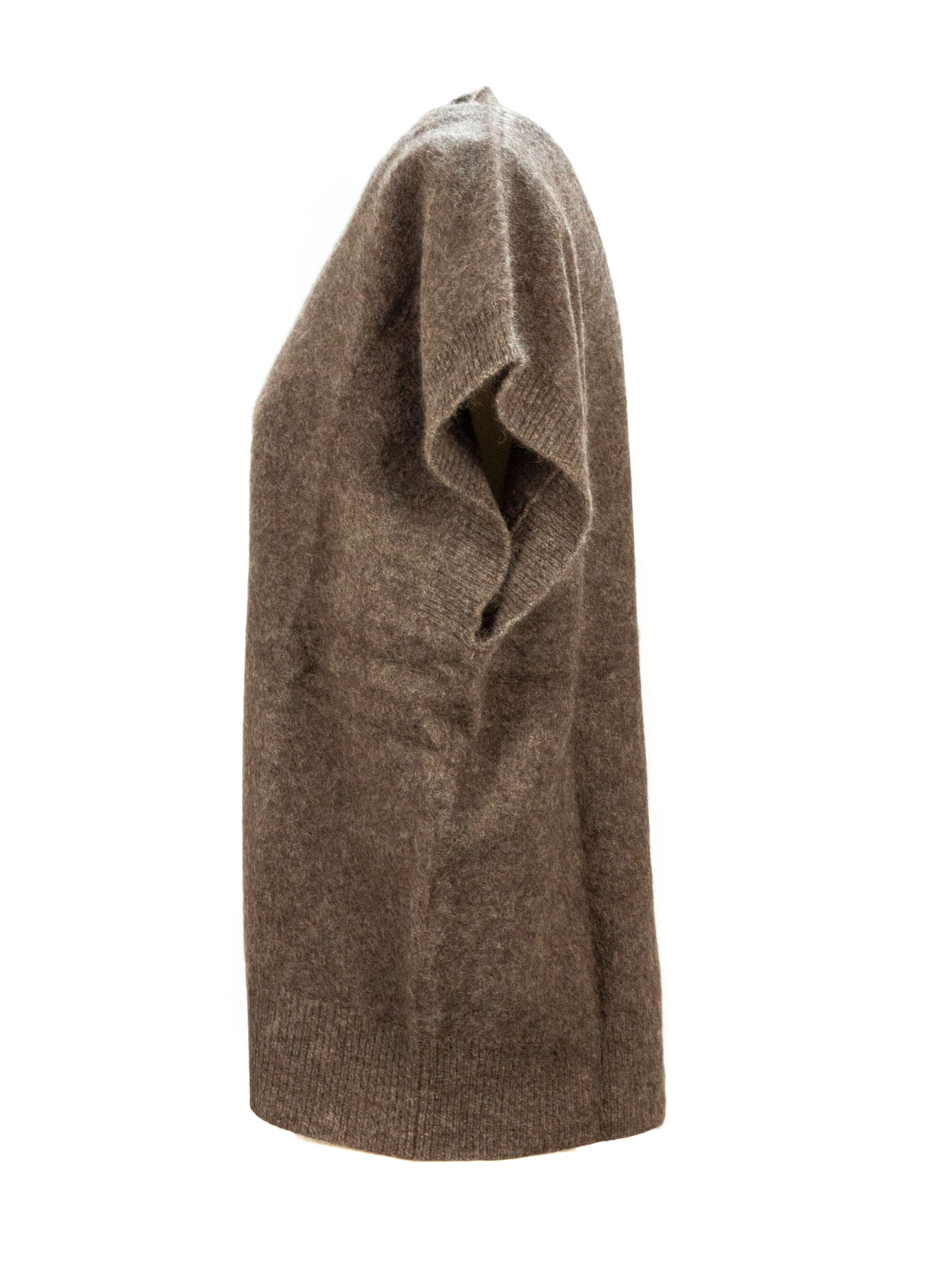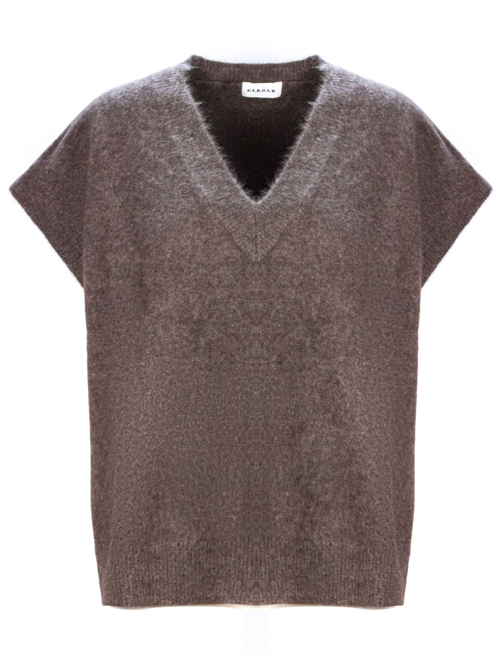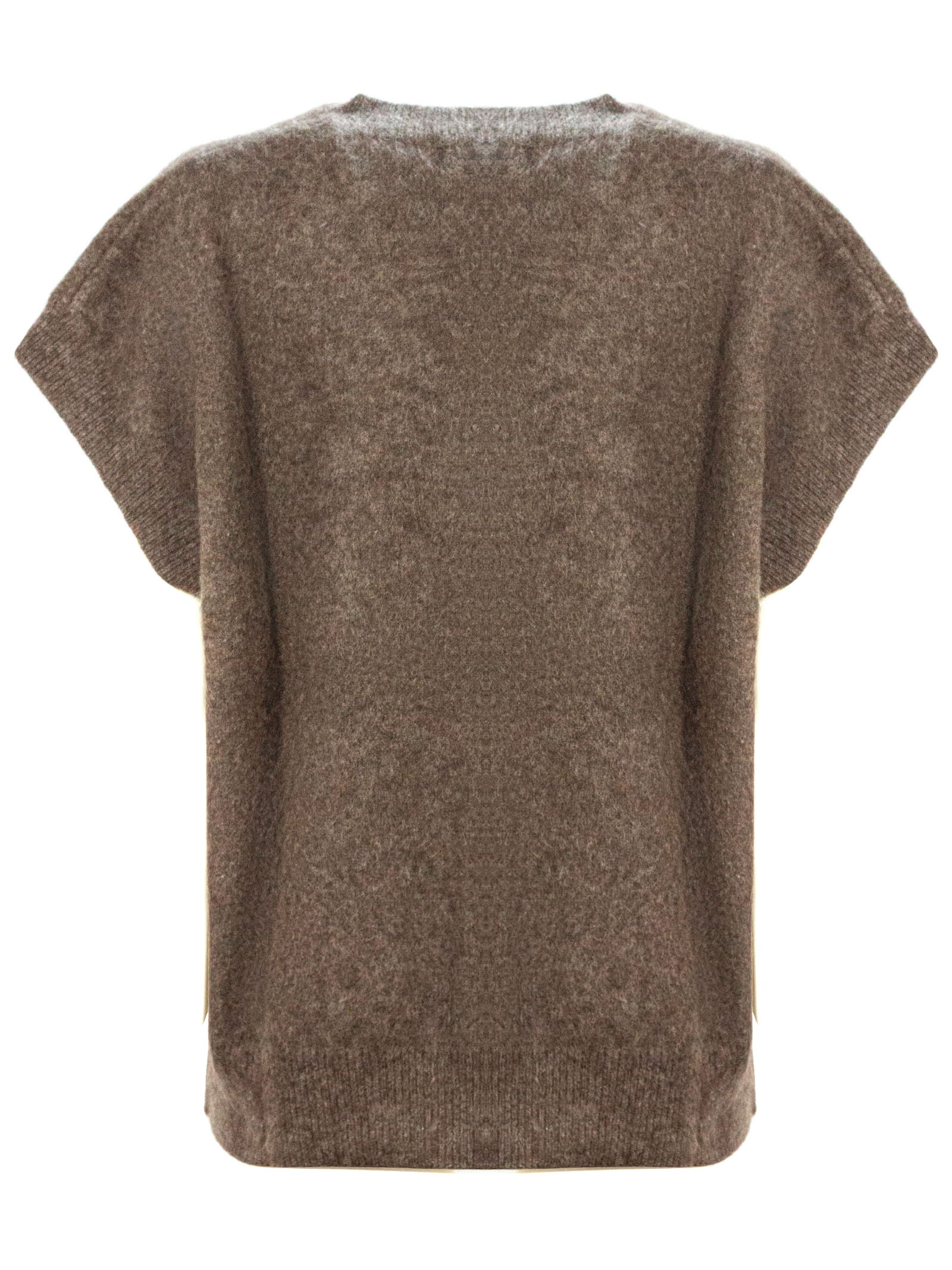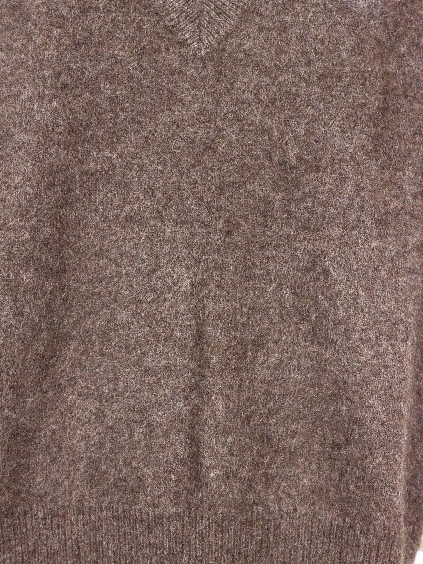 Brown horsehair sleeveless sweater with V-neck and ribbed trim