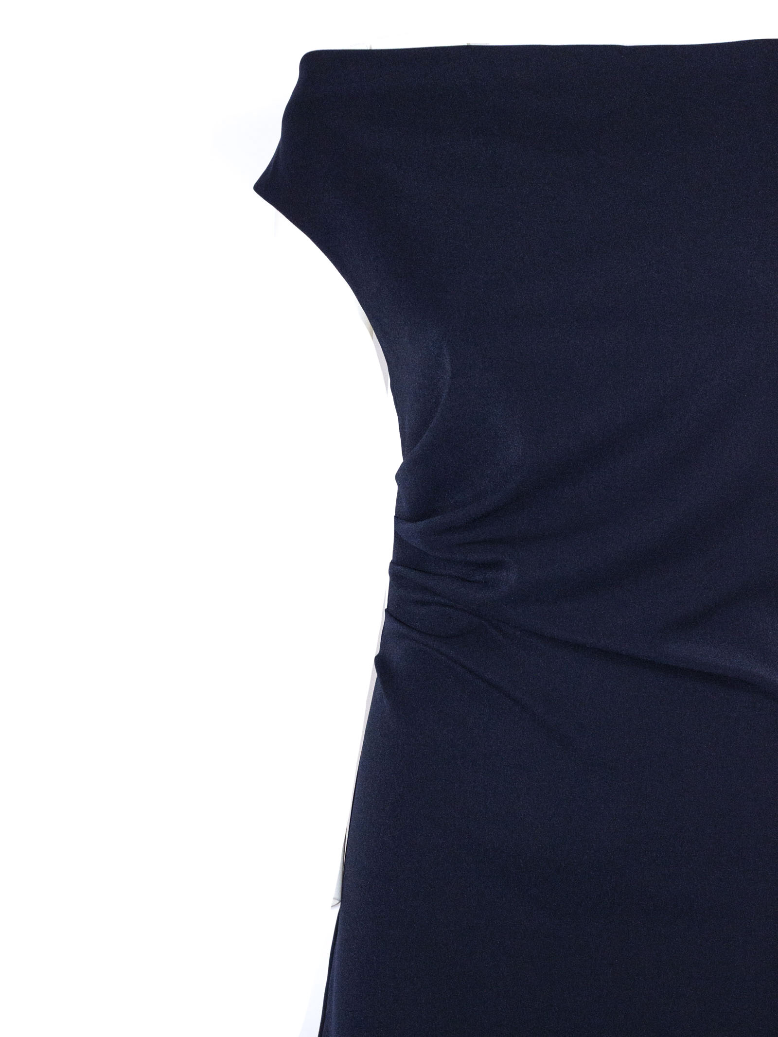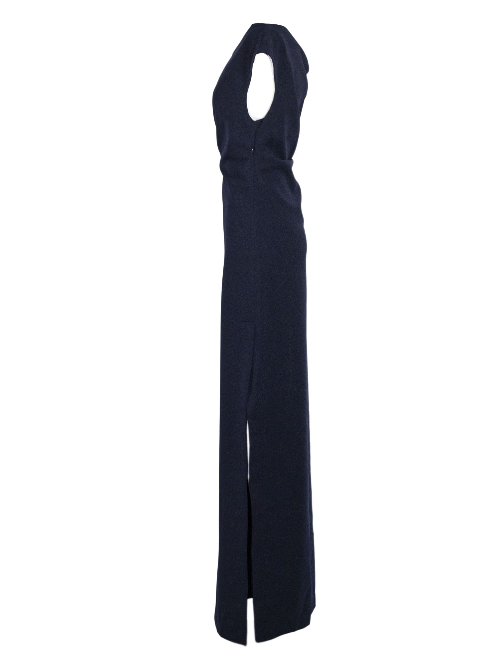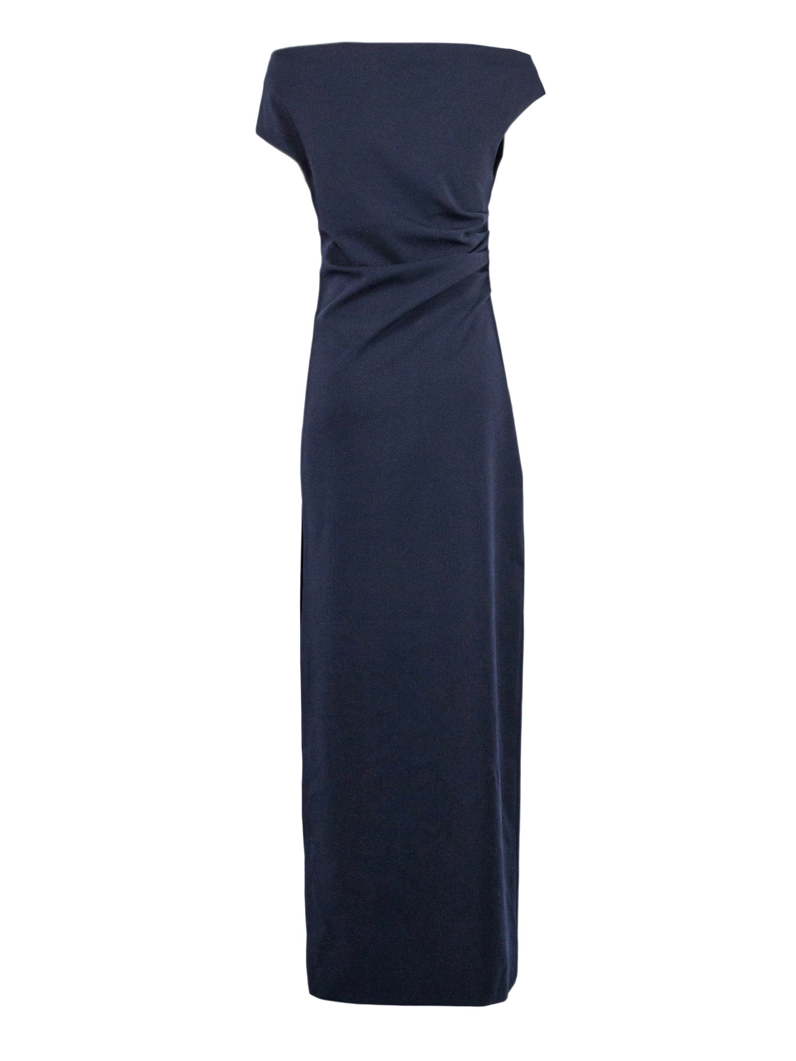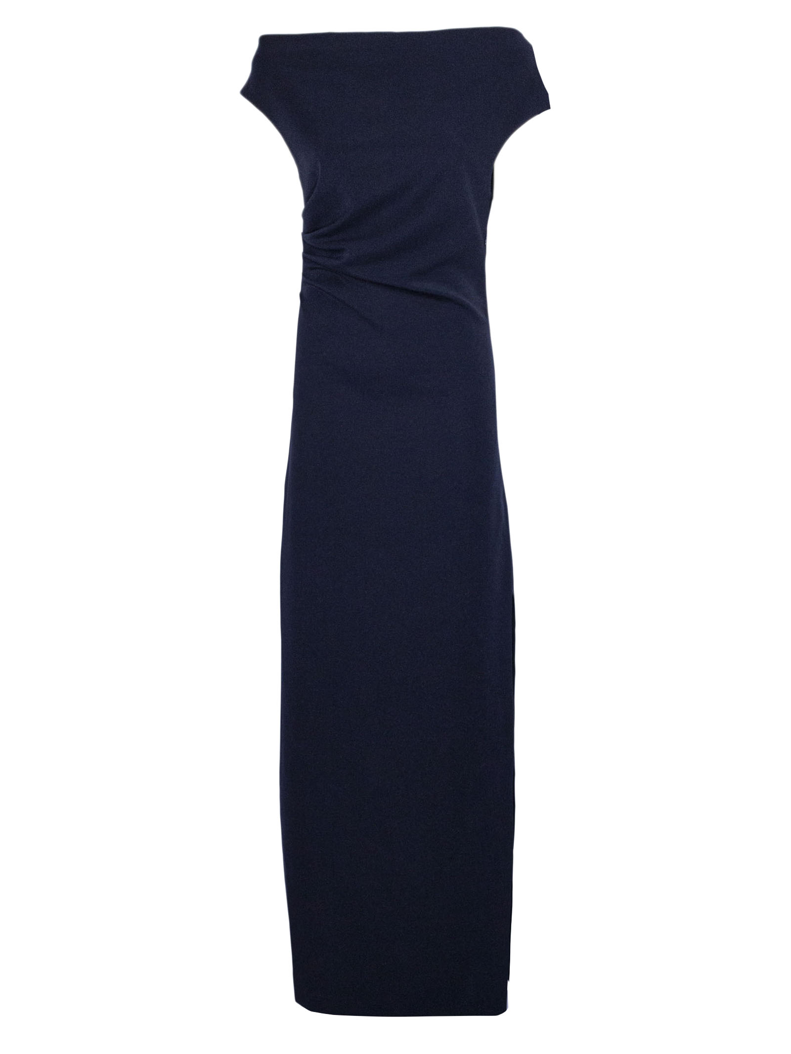Dark blue stretch maxi dress with wide neckline, bare shoulders and delicate side draping, straight and flowing line accompanying the figure to maxi length