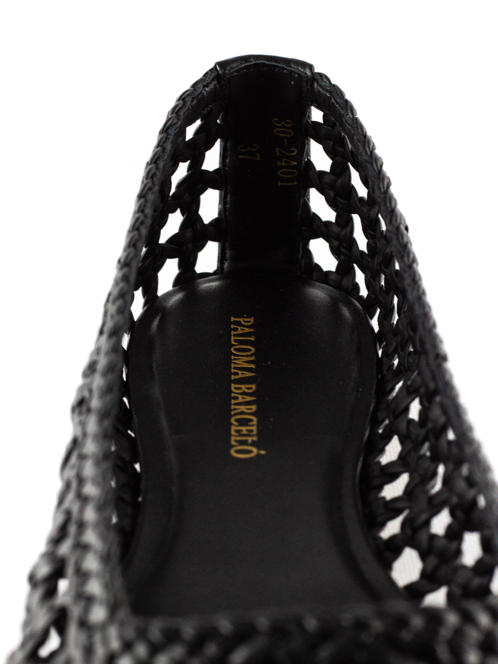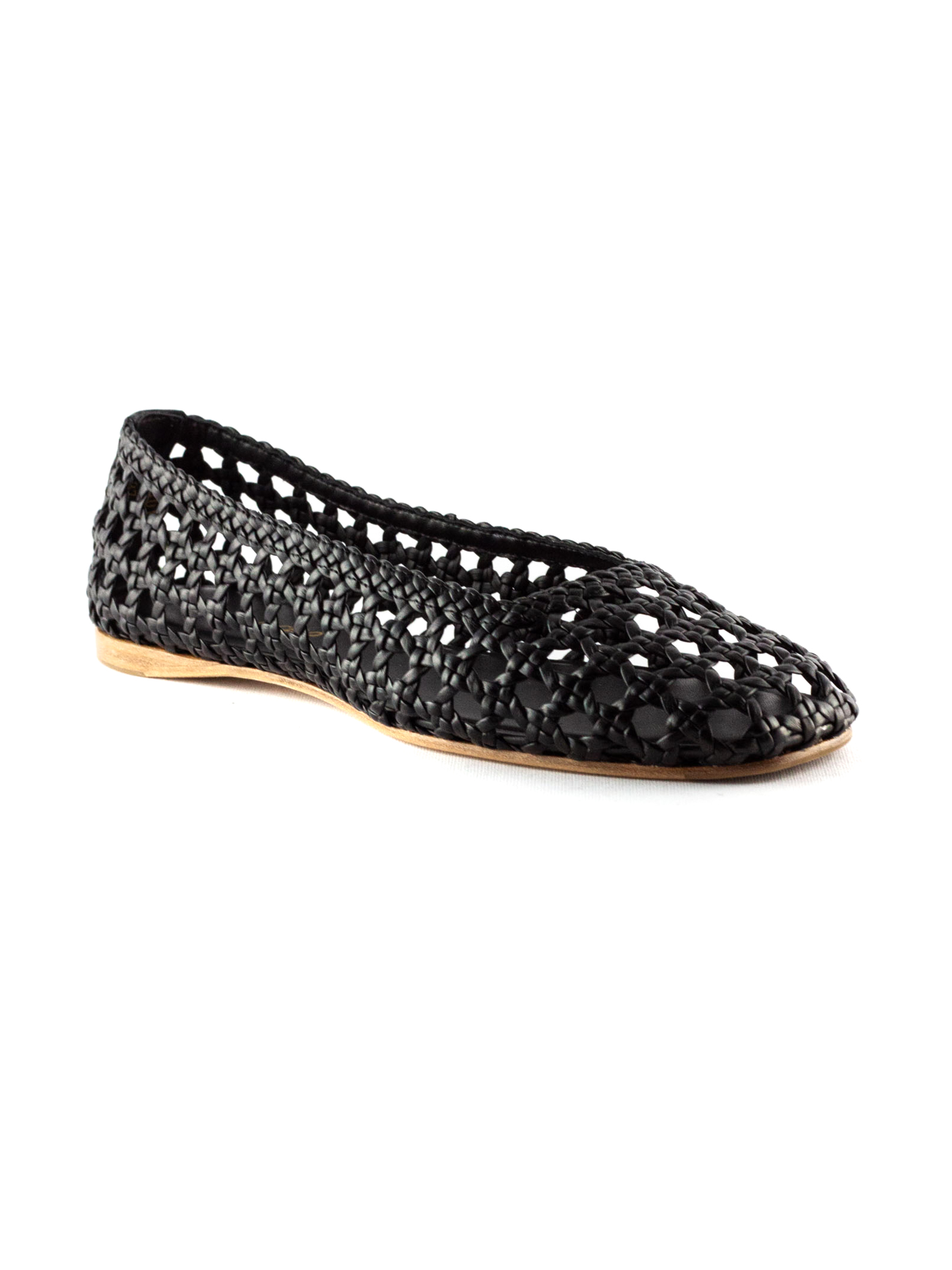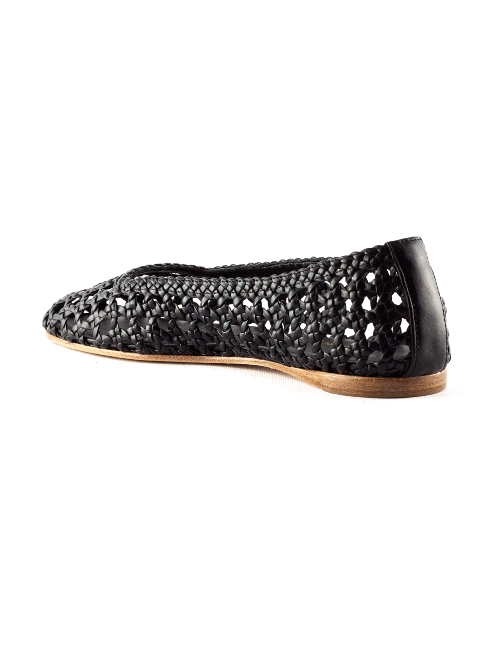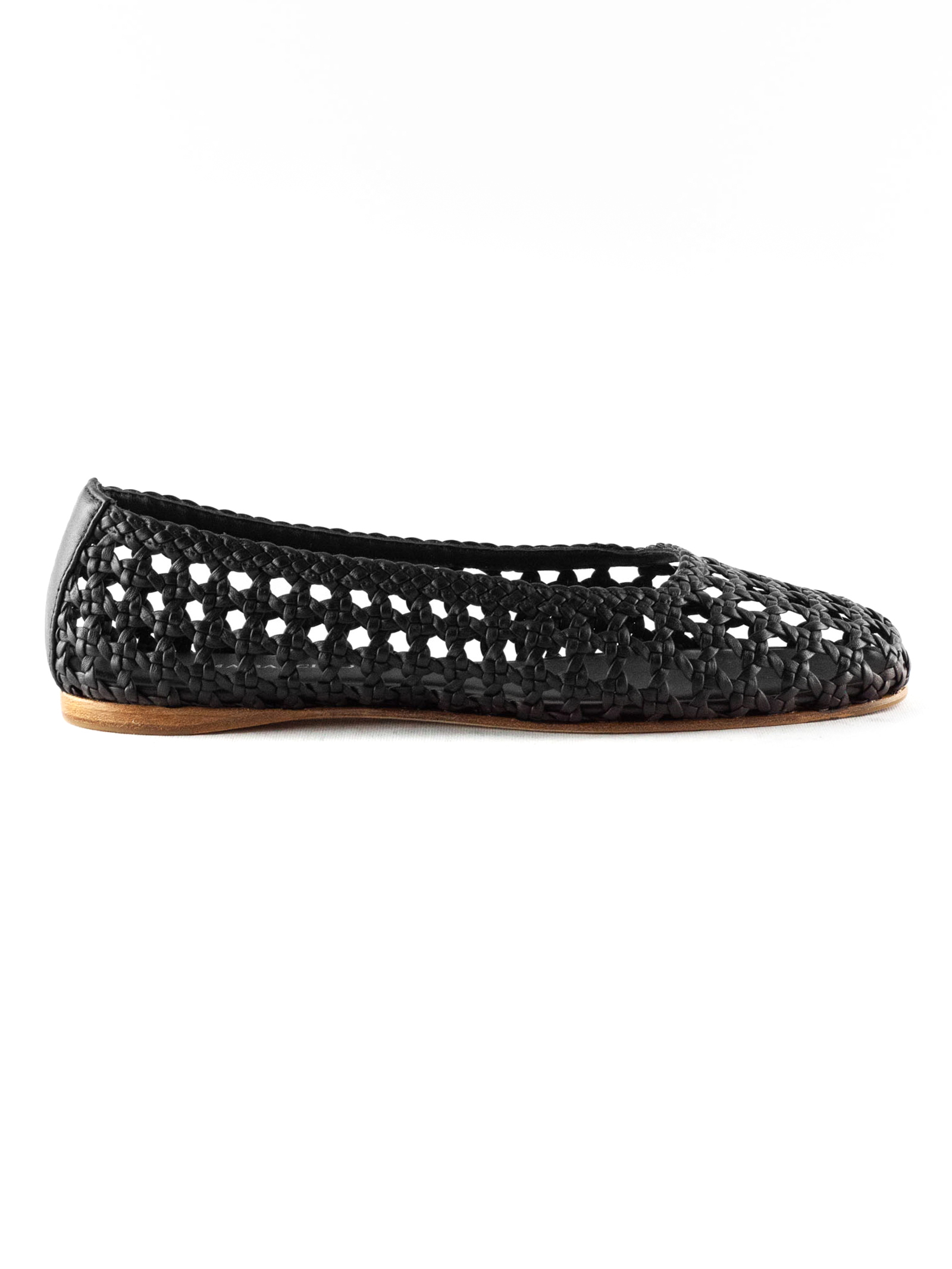 Black woven leather ballerina flats with round toe, leather sole with logo, leather bottom